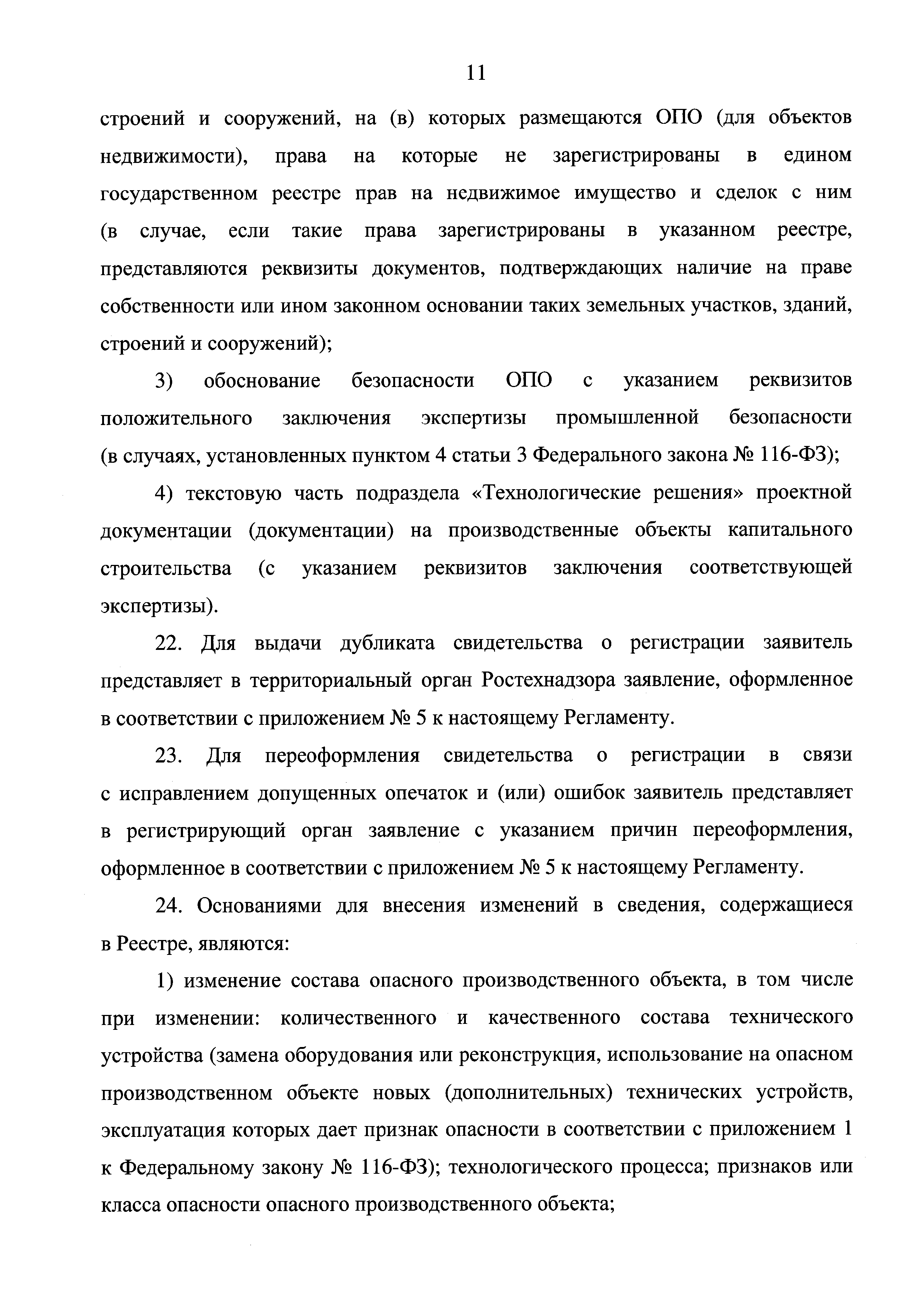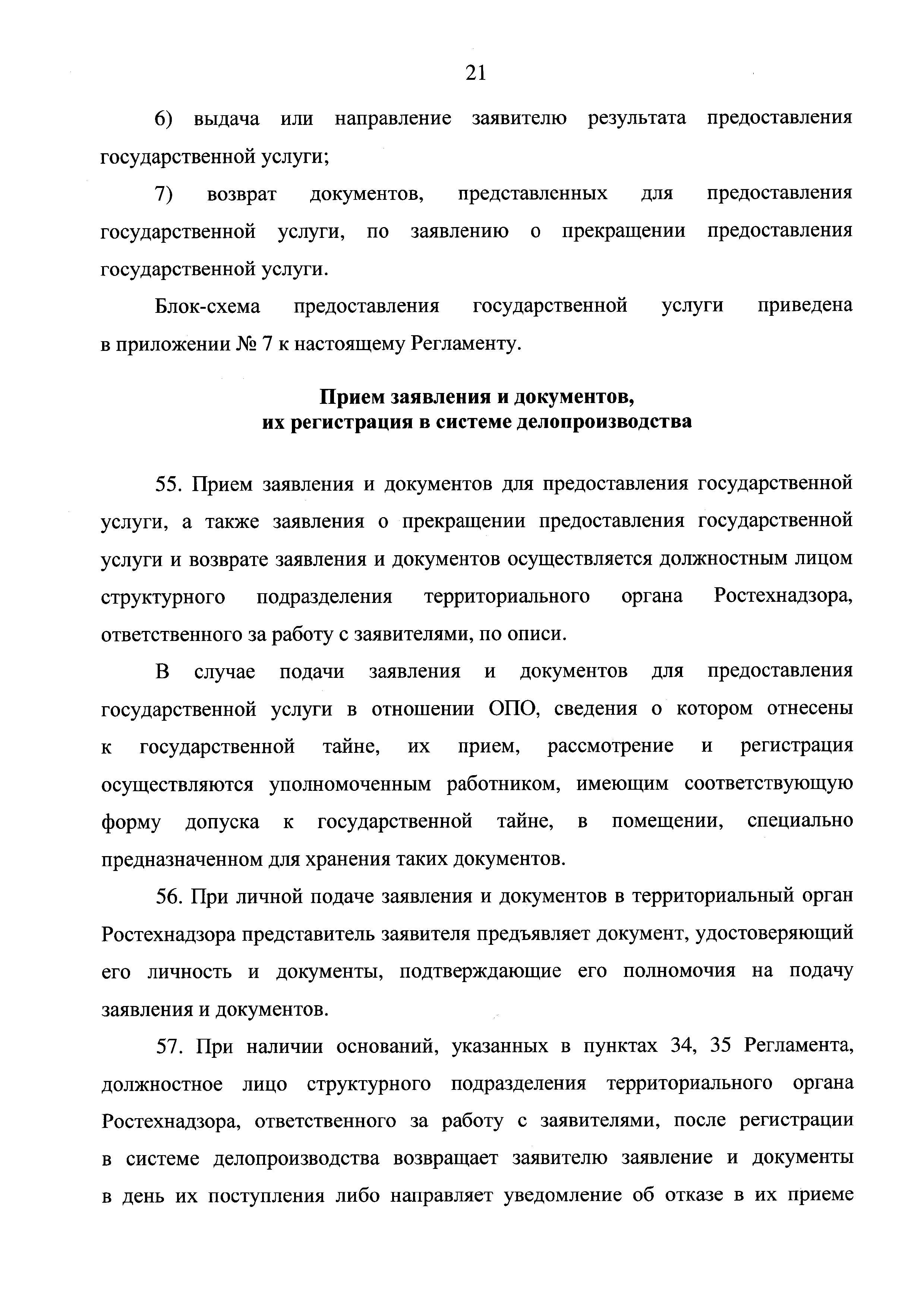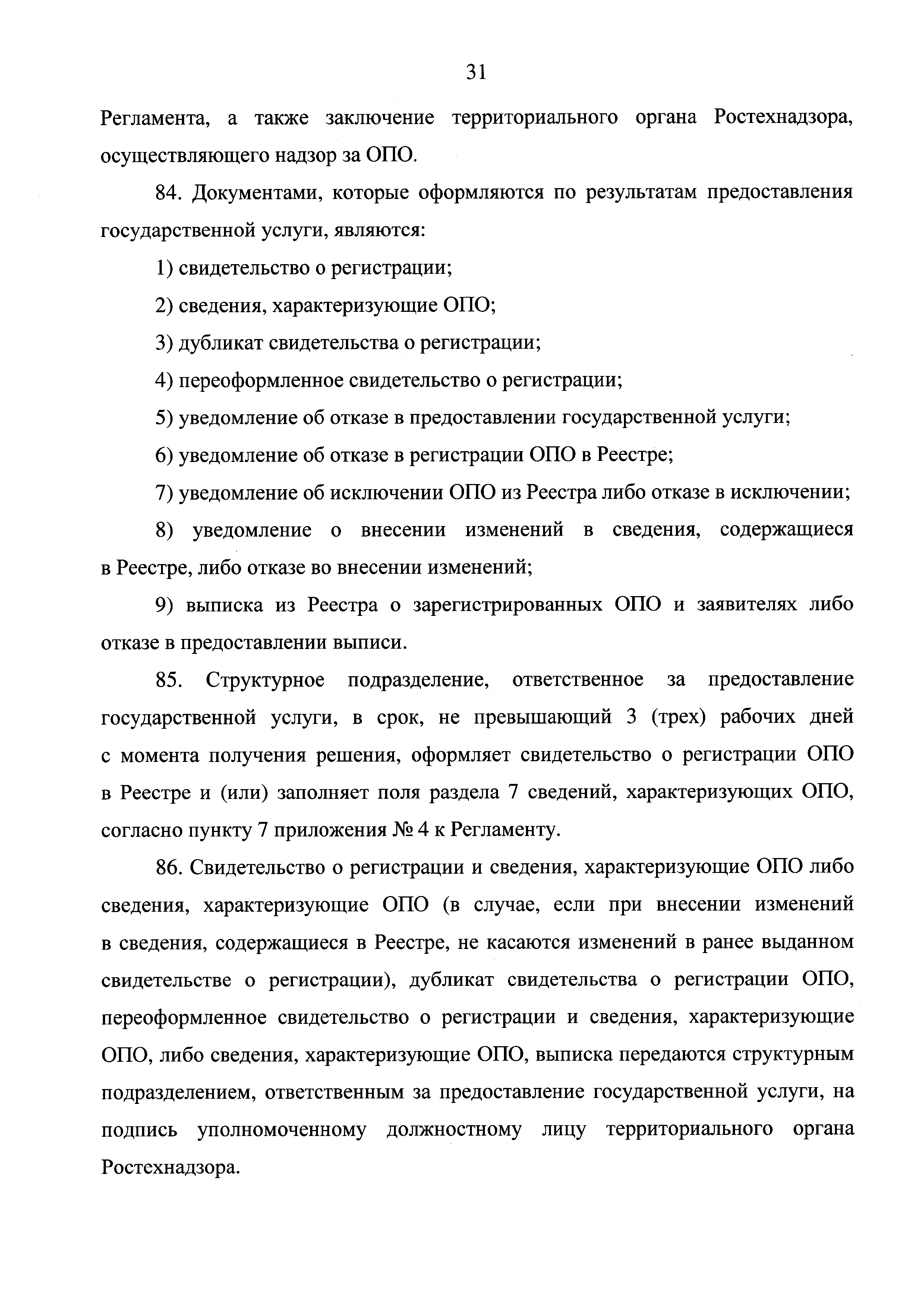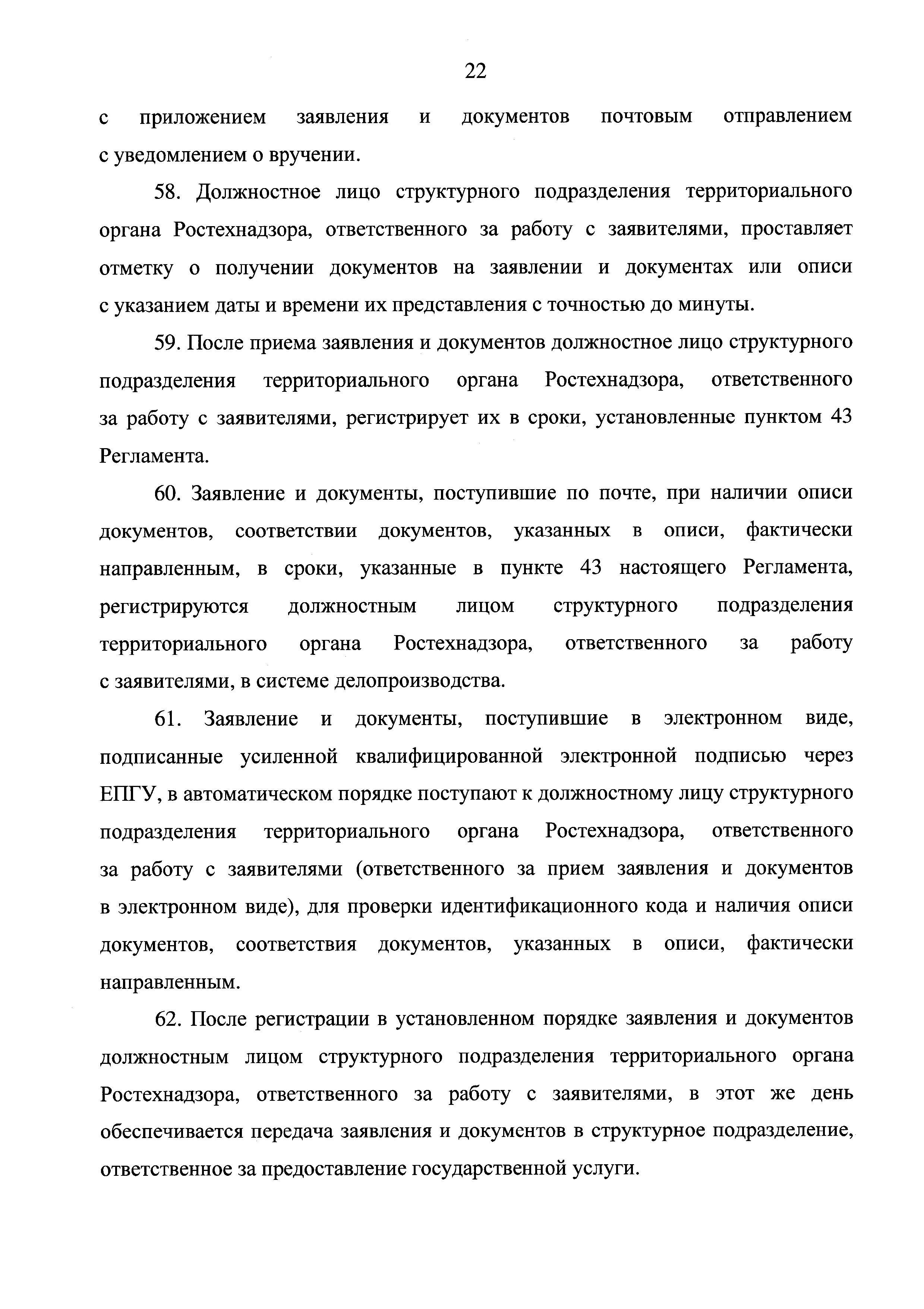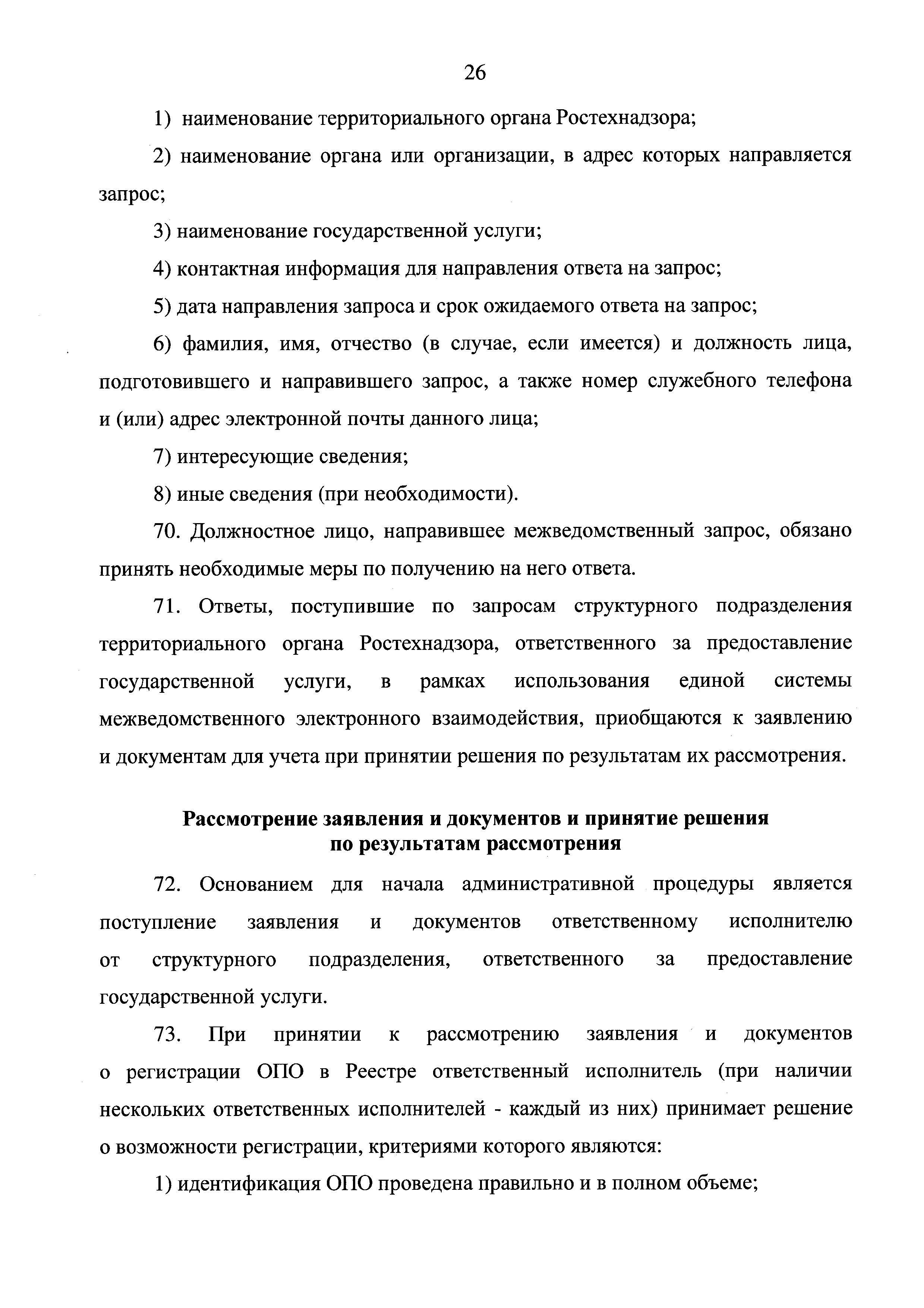 | Оглавление: | I. Общие положения II. Стандарт предоставления государственной услуги III. Состав, последовательность и сроки выполнения административных процедур (действий), требования к порядку их выполнения, в том числе особенности выполнения административных процедур (действий) в электронной форме IV. Формы контроля за исполнением настоящего Регламента V. Досудебный (внесудебный) порядок обжалования решений и действий (бездействия) Ростехнадзора, а также его должностных лиц Приложение № 1. Сведения о местах нахождения, контактных телефонах, адресах официальных сайтов, электронной почты территориальных органов Ростехнадзора Приложение № 2. Опись документов Приложение № 3. Заявление Приложение № 4. Сведения, характеризующие ОПО Приложение № 5. Заявление о переоформлении (выдаче дубликата) свидетельства о регистрации в государственном реестре опасных производственных объектов Приложение № 6. Заявление о предоставлении информации о зарегистрированных в Реестре ОПО в форме выписки Приложение № 7. Блок-схема предоставления государственной услуги |