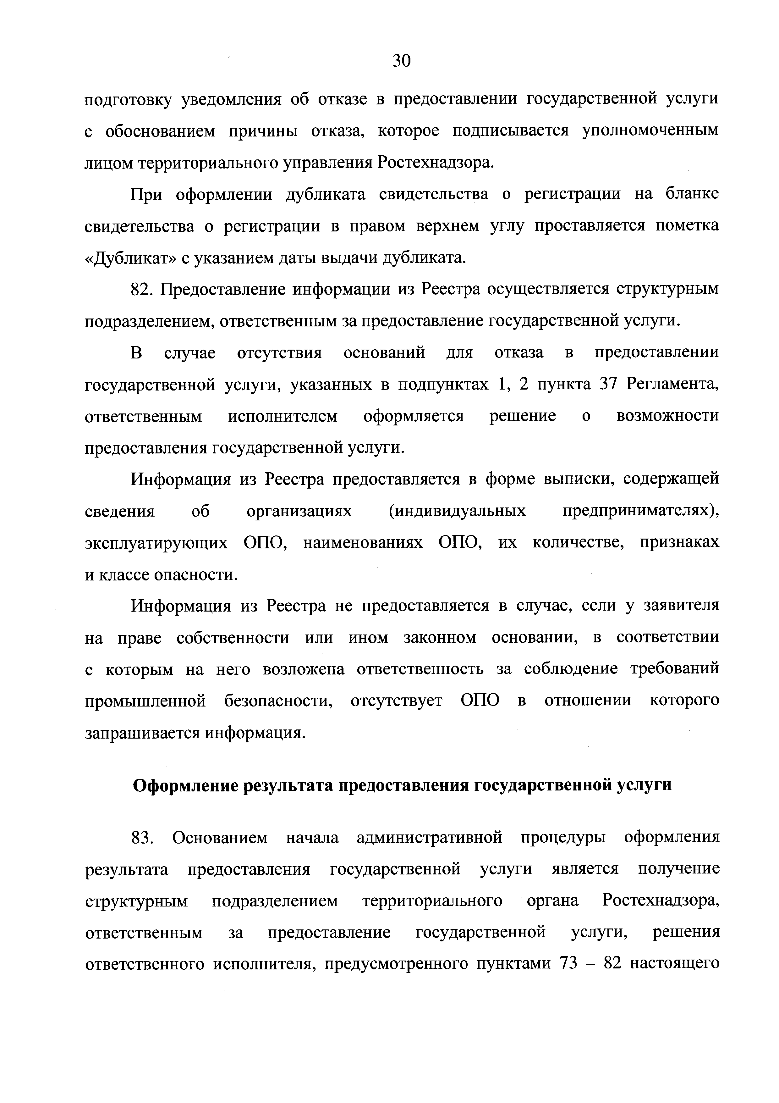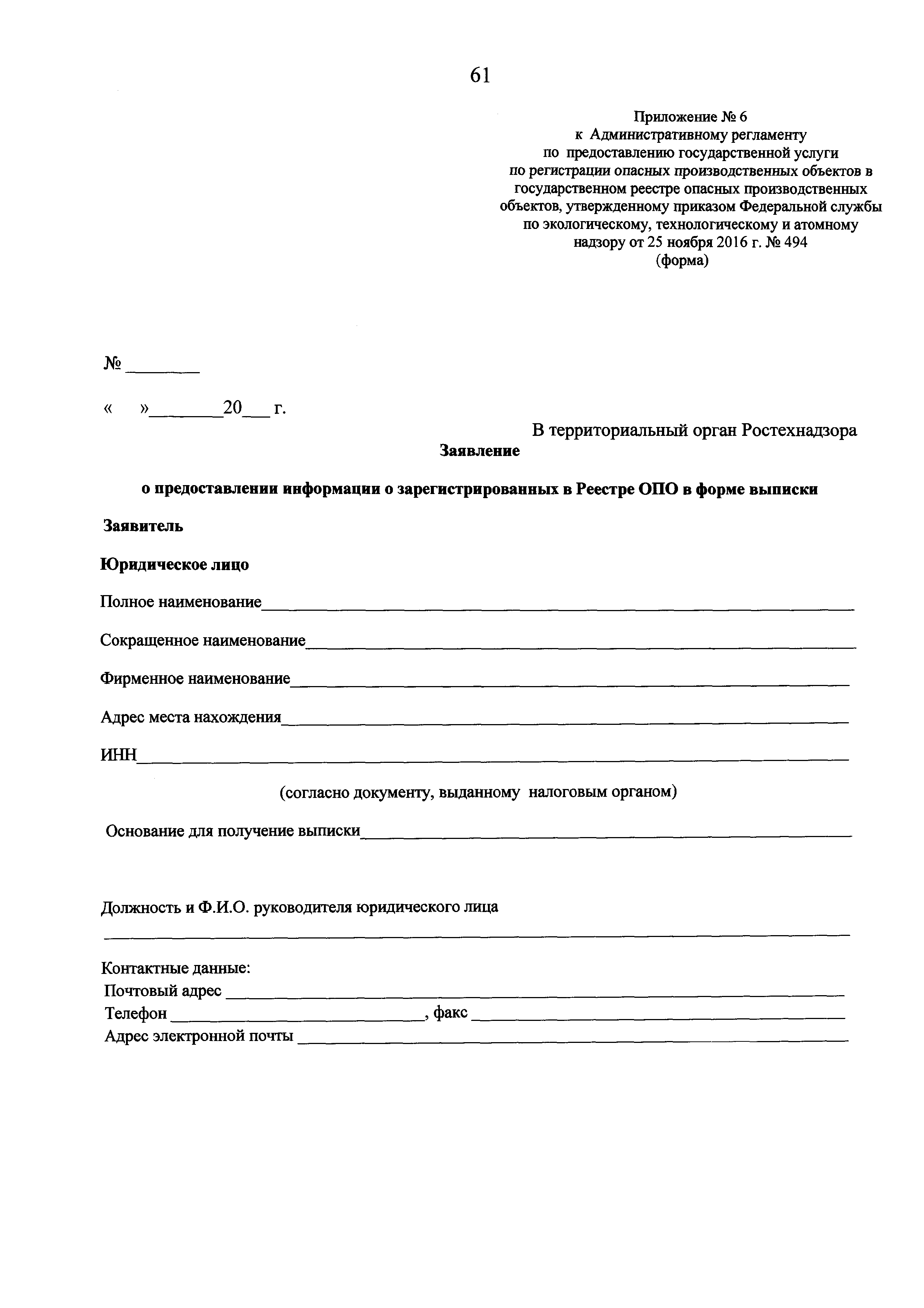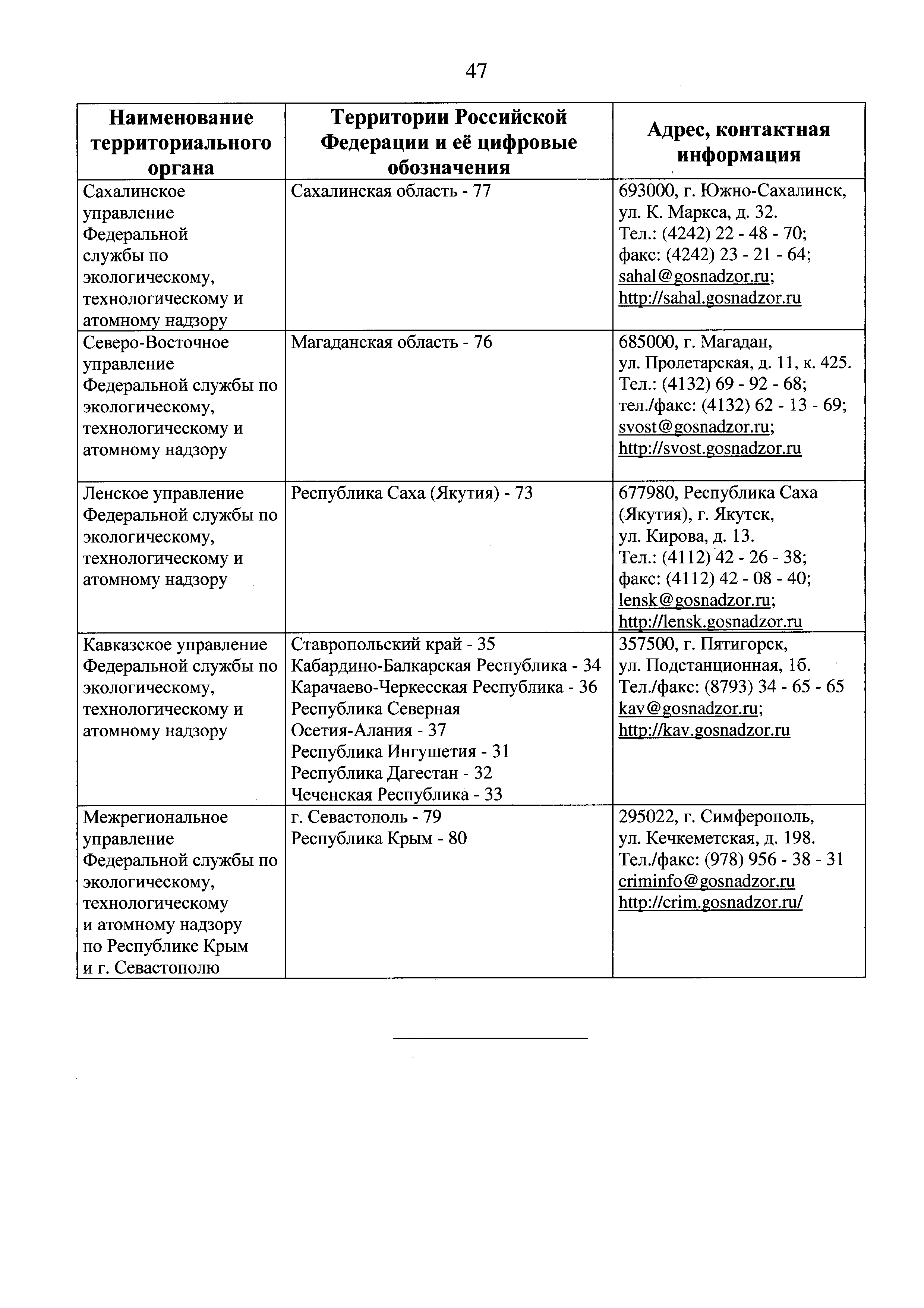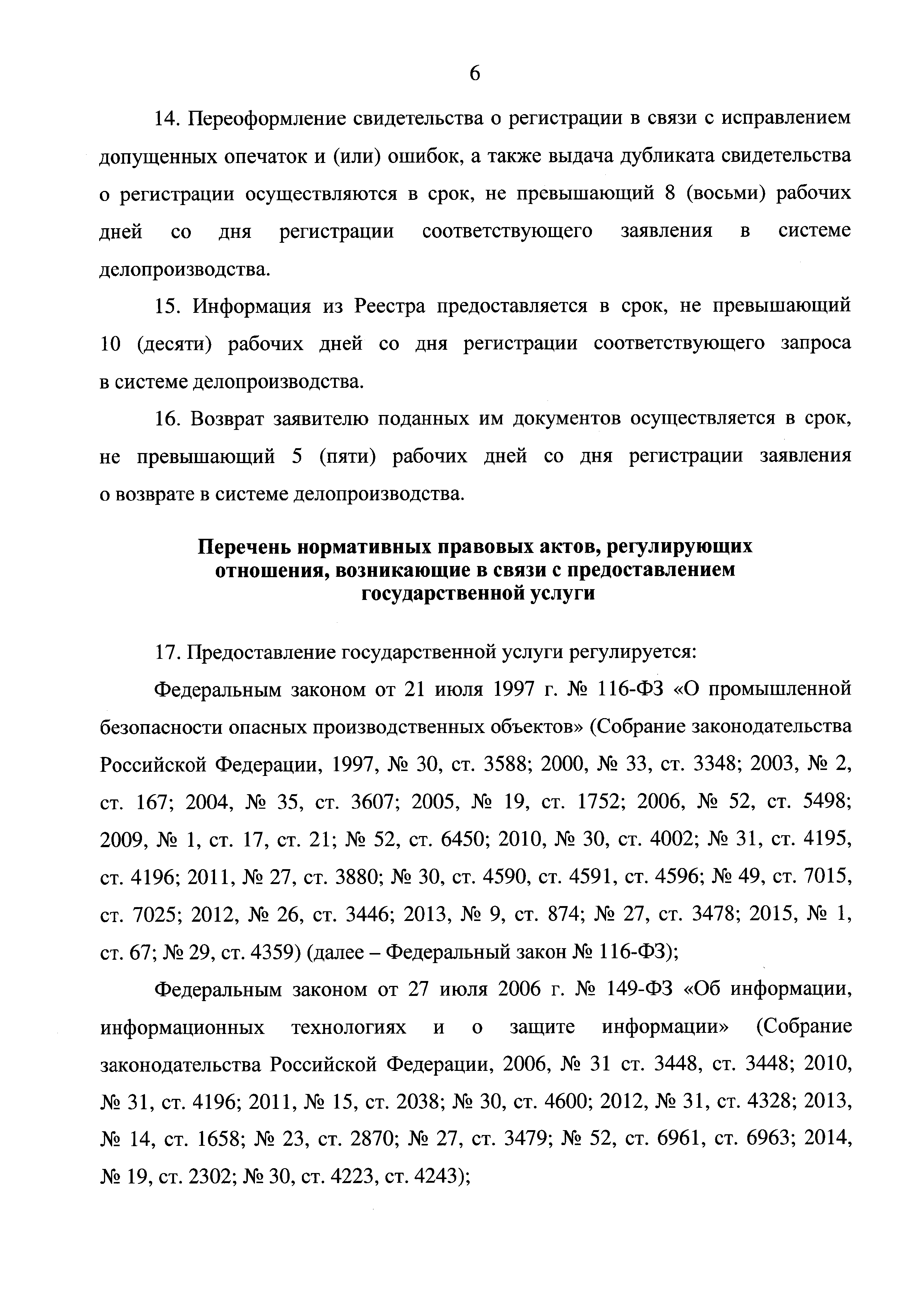 | Оглавление: | I. Общие положения II. Стандарт предоставления государственной услуги III. Состав, последовательность и сроки выполнения административных процедур (действий), требования к порядку их выполнения, в том числе особенности выполнения административных процедур (действий) в электронной форме IV. Формы контроля за исполнением настоящего Регламента V. Досудебный (внесудебный) порядок обжалования решений и действий (бездействия) Ростехнадзора, а также его должностных лиц Приложение № 1. Сведения о местах нахождения, контактных телефонах, адресах официальных сайтов, электронной почты территориальных органов Ростехнадзора Приложение № 2. Опись документов Приложение № 3. Заявление Приложение № 4. Сведения, характеризующие ОПО Приложение № 5. Заявление о переоформлении (выдаче дубликата) свидетельства о регистрации в государственном реестре опасных производственных объектов Приложение № 6. Заявление о предоставлении информации о зарегистрированных в Реестре ОПО в форме выписки Приложение № 7. Блок-схема предоставления государственной услуги |