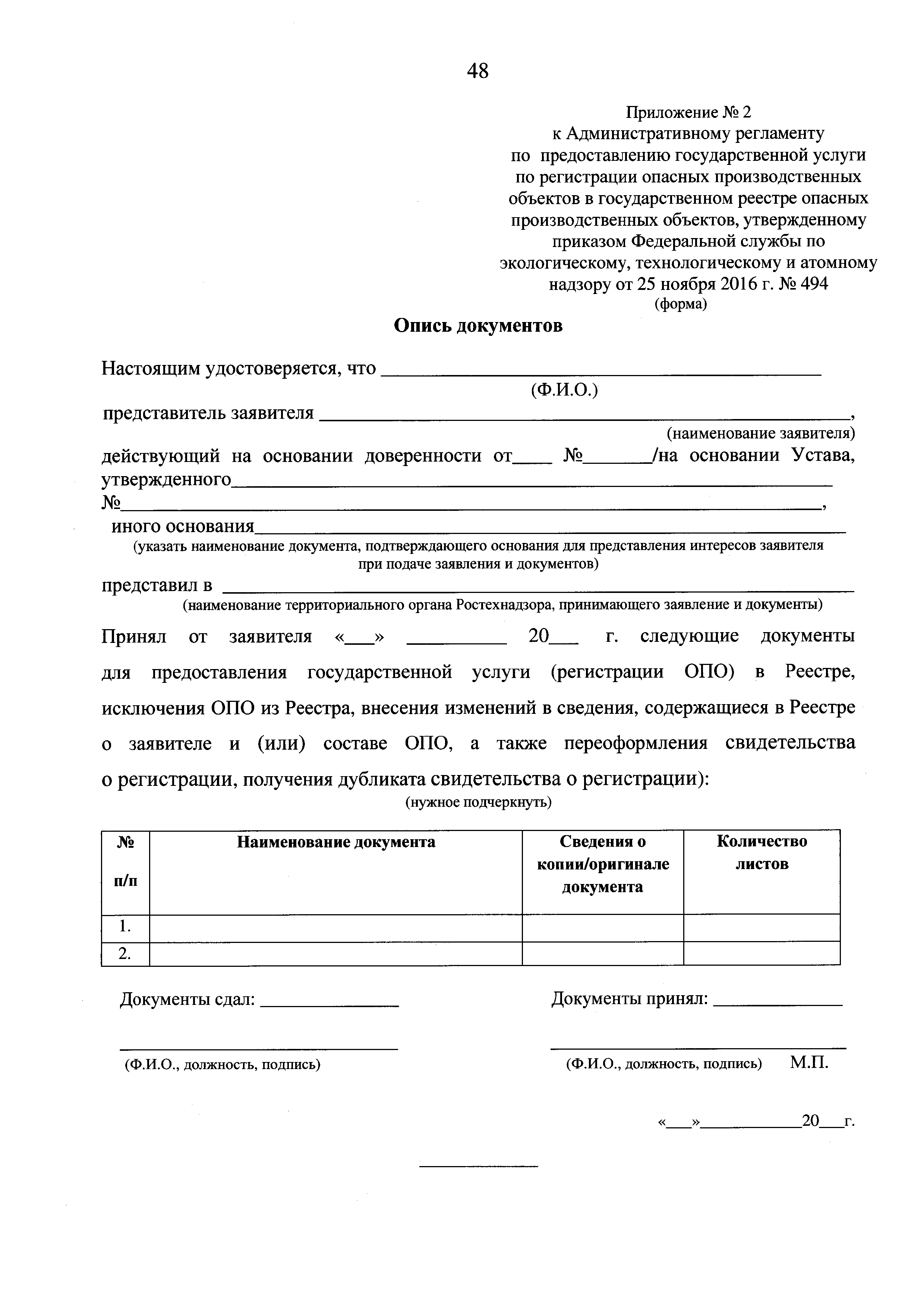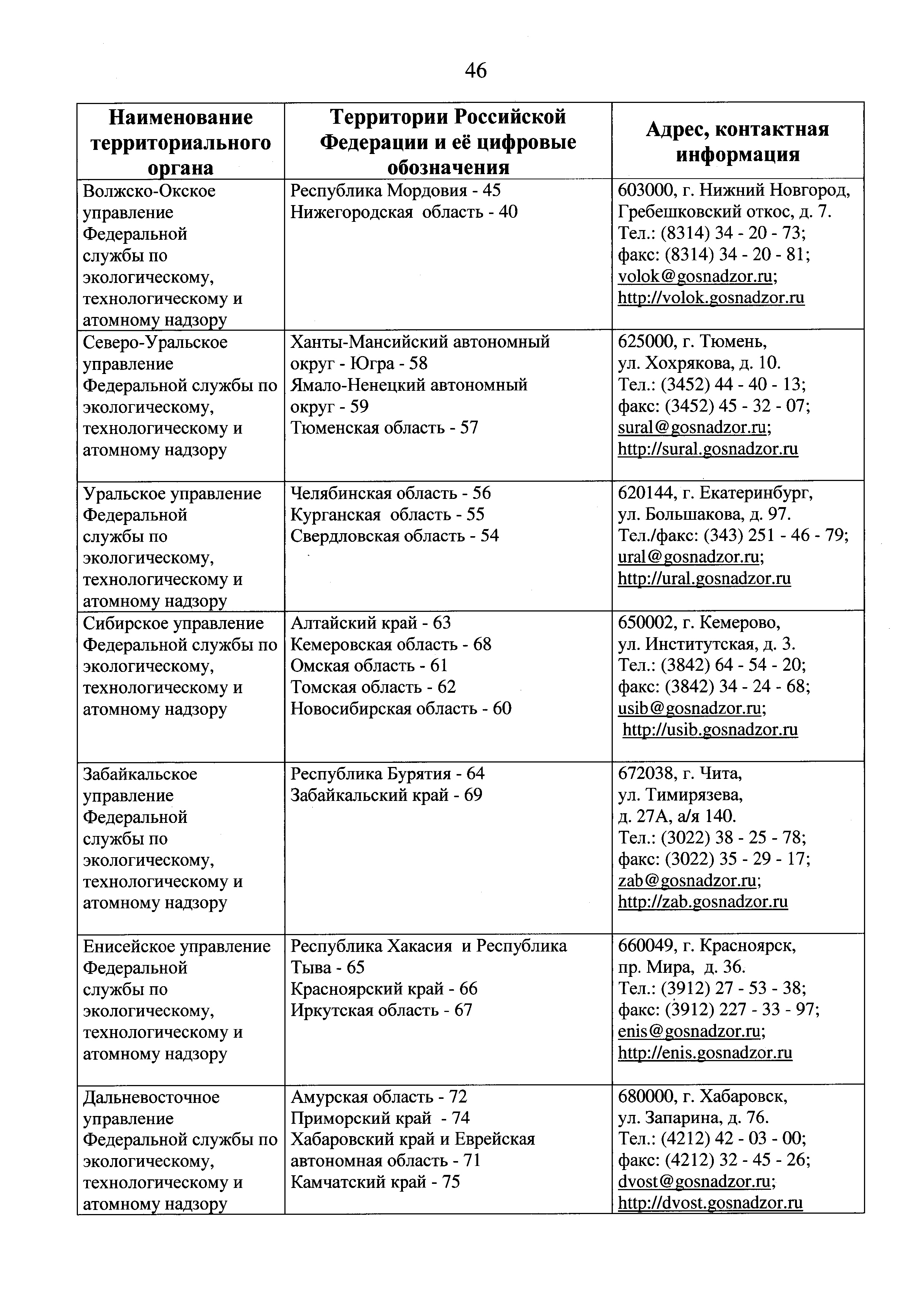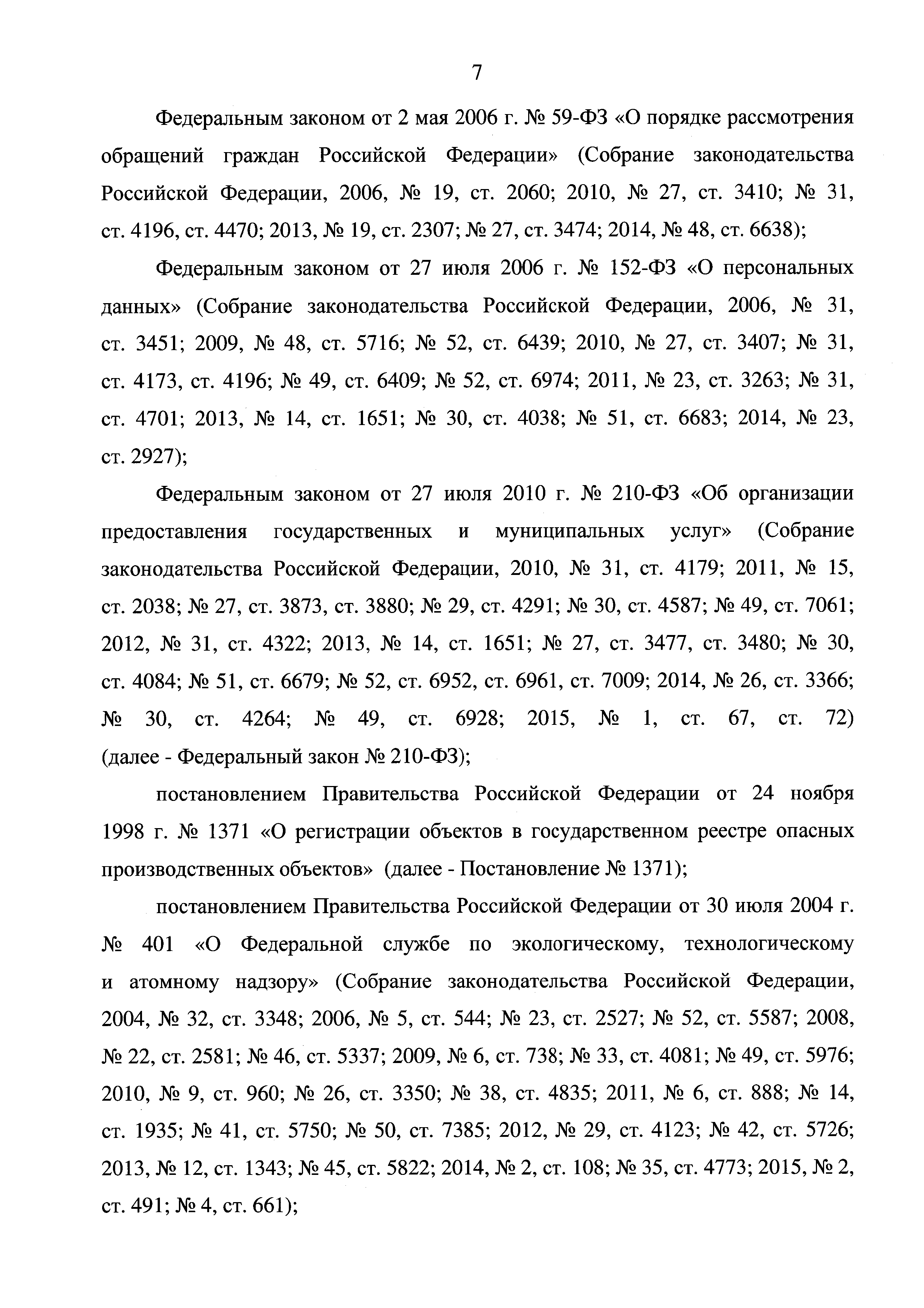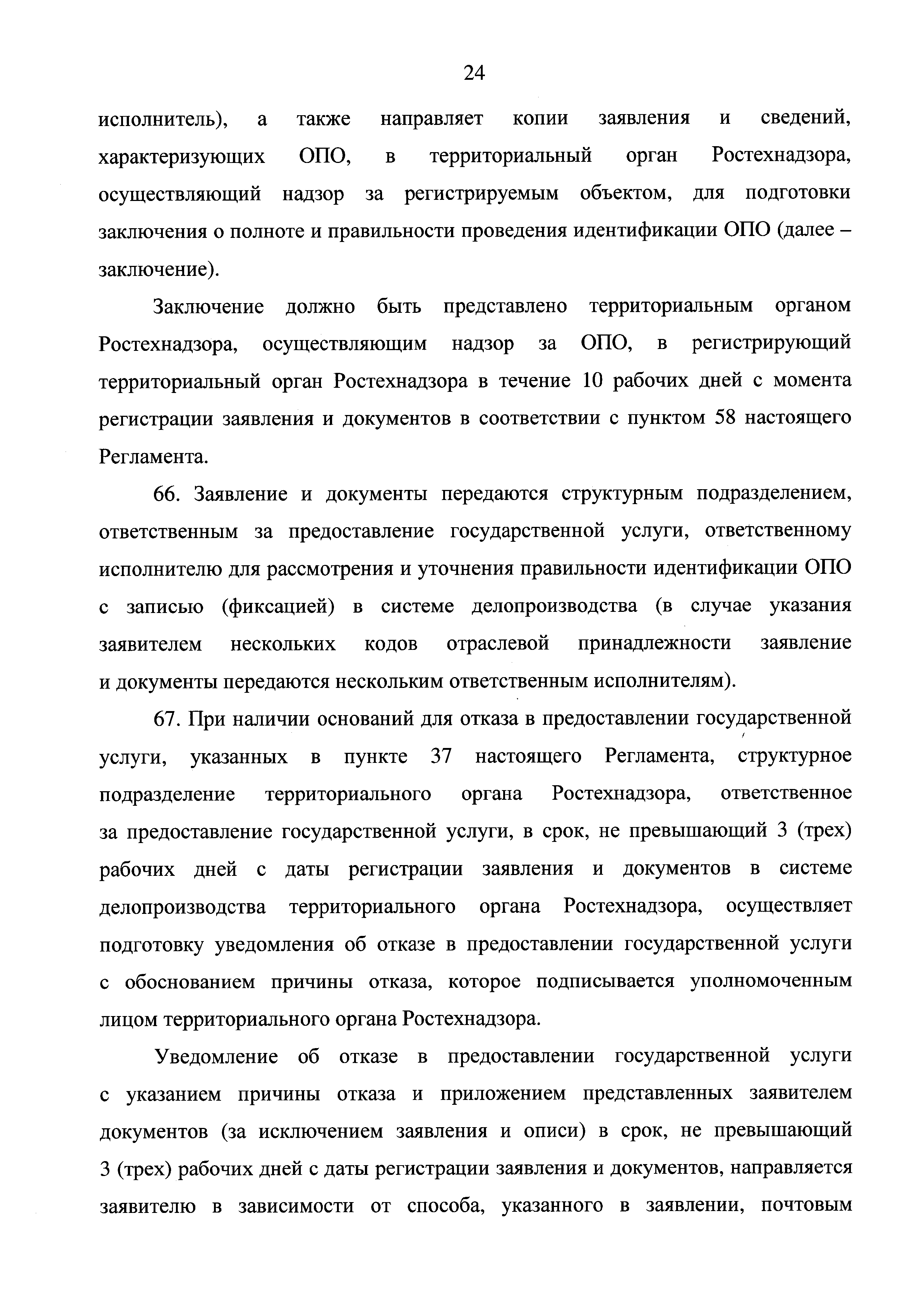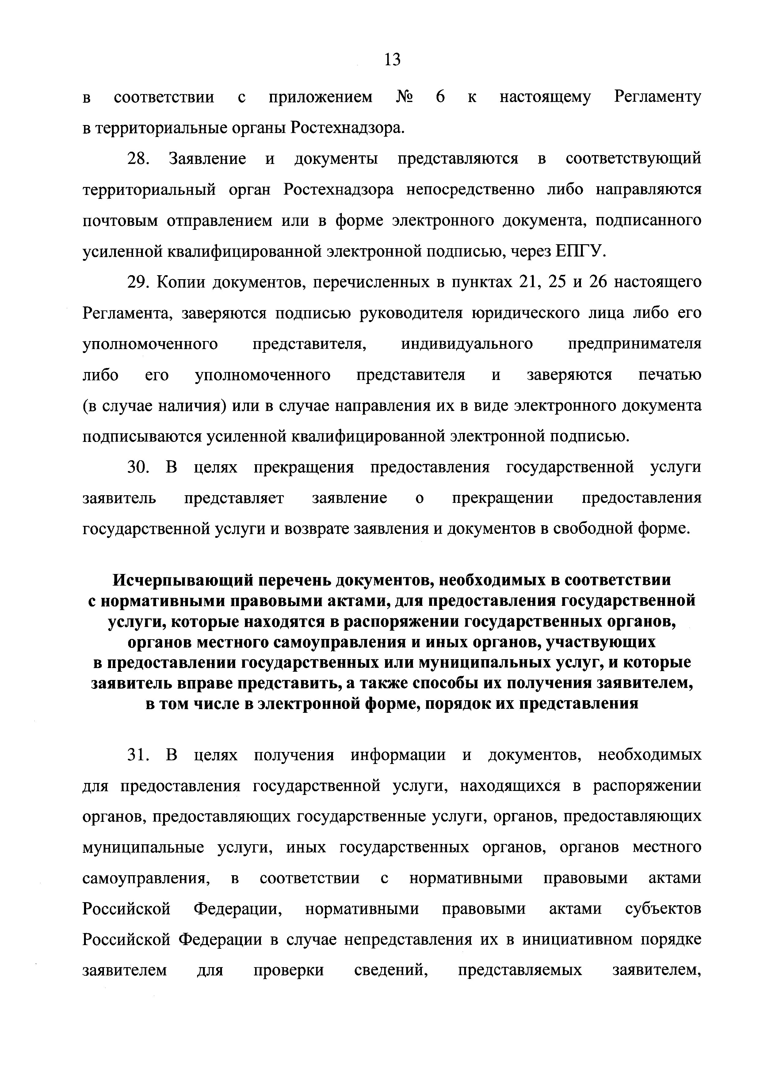| Оглавление: | I. Общие положения II. Стандарт предоставления государственной услуги III. Состав, последовательность и сроки выполнения административных процедур (действий), требования к порядку их выполнения, в том числе особенности выполнения административных процедур (действий) в электронной форме IV. Формы контроля за исполнением настоящего Регламента V. Досудебный (внесудебный) порядок обжалования решений и действий (бездействия) Ростехнадзора, а также его должностных лиц Приложение № 1. Сведения о местах нахождения, контактных телефонах, адресах официальных сайтов, электронной почты территориальных органов Ростехнадзора Приложение № 2. Опись документов Приложение № 3. Заявление Приложение № 4. Сведения, характеризующие ОПО Приложение № 5. Заявление о переоформлении (выдаче дубликата) свидетельства о регистрации в государственном реестре опасных производственных объектов Приложение № 6. Заявление о предоставлении информации о зарегистрированных в Реестре ОПО в форме выписки Приложение № 7. Блок-схема предоставления государственной услуги |