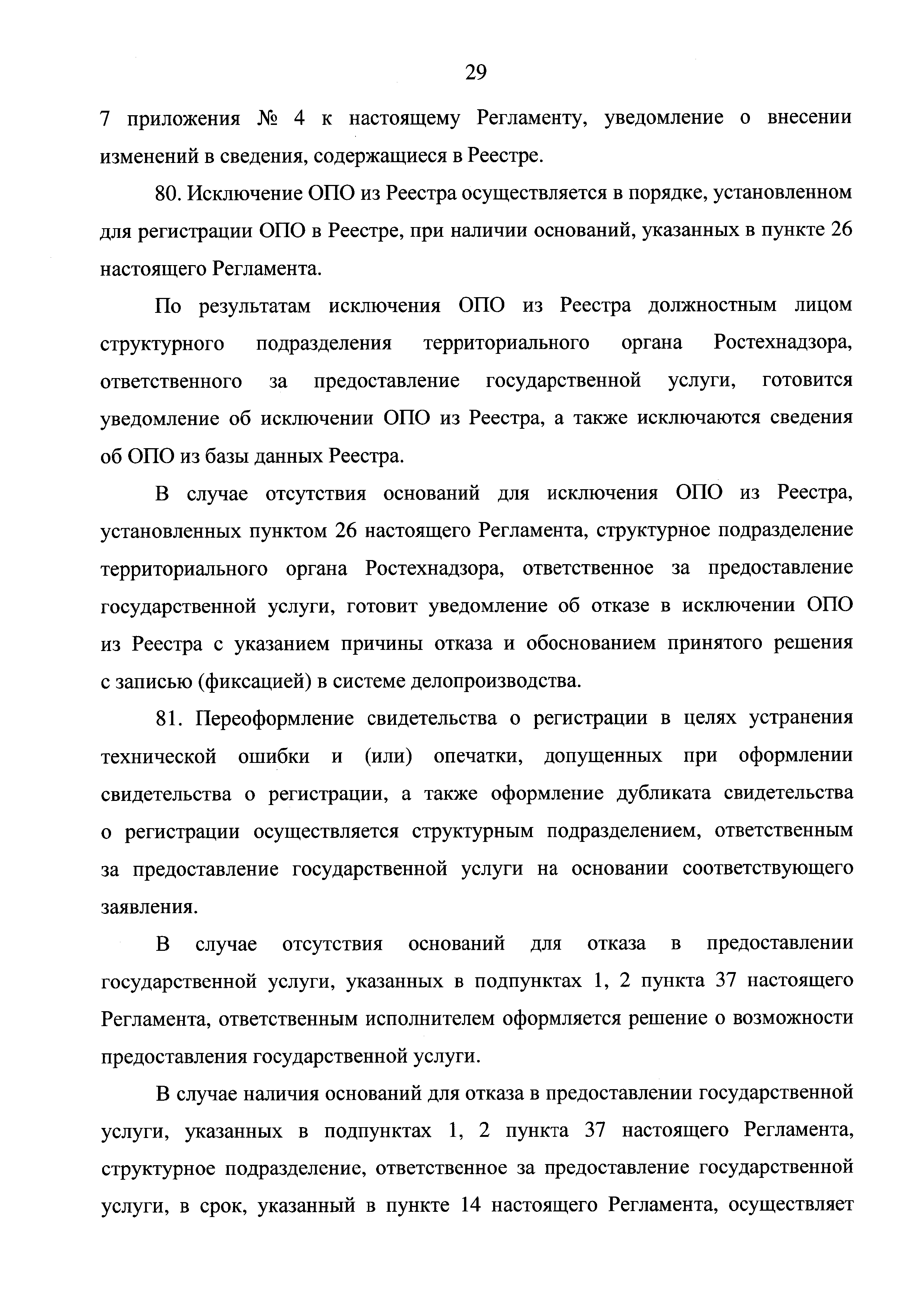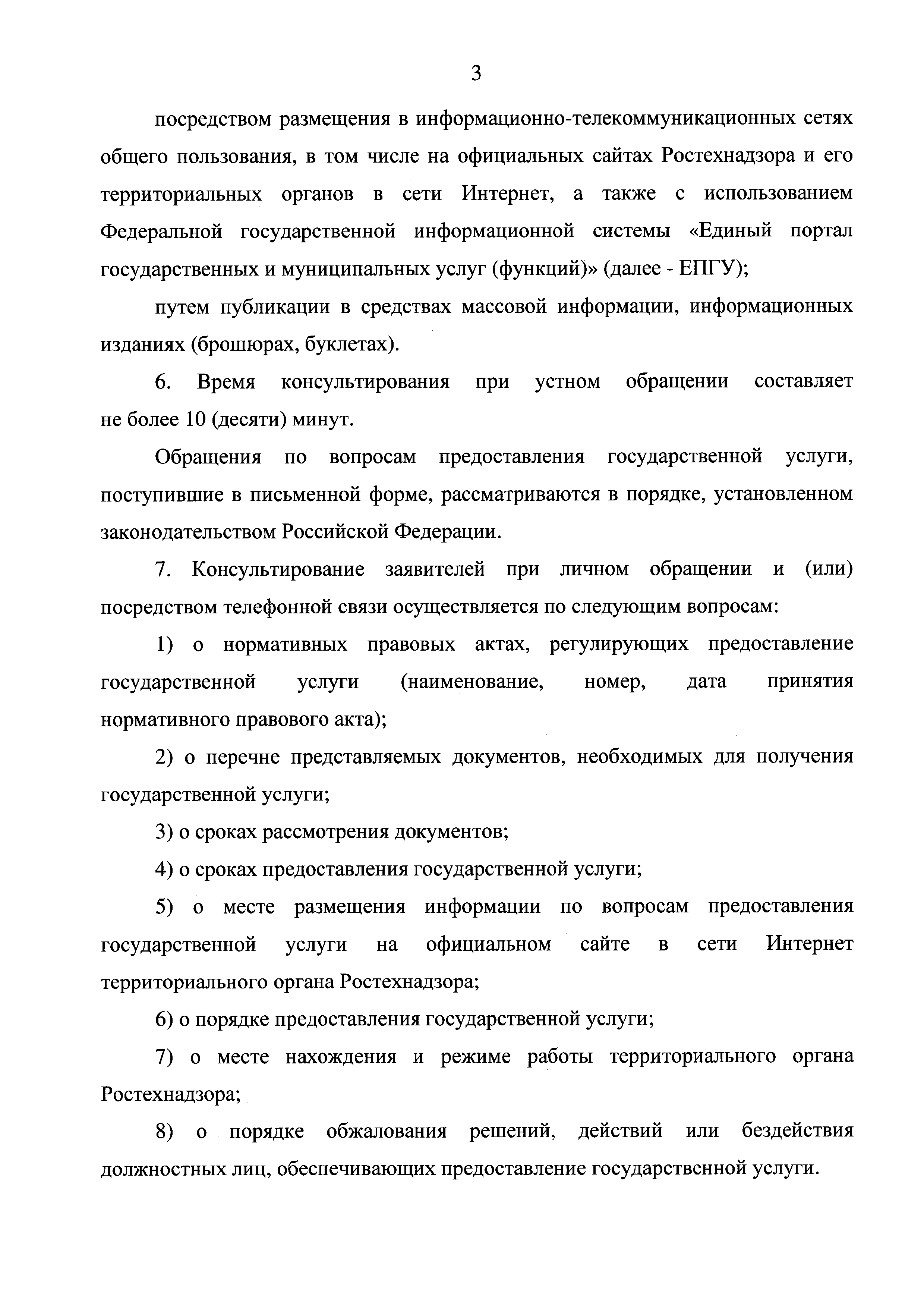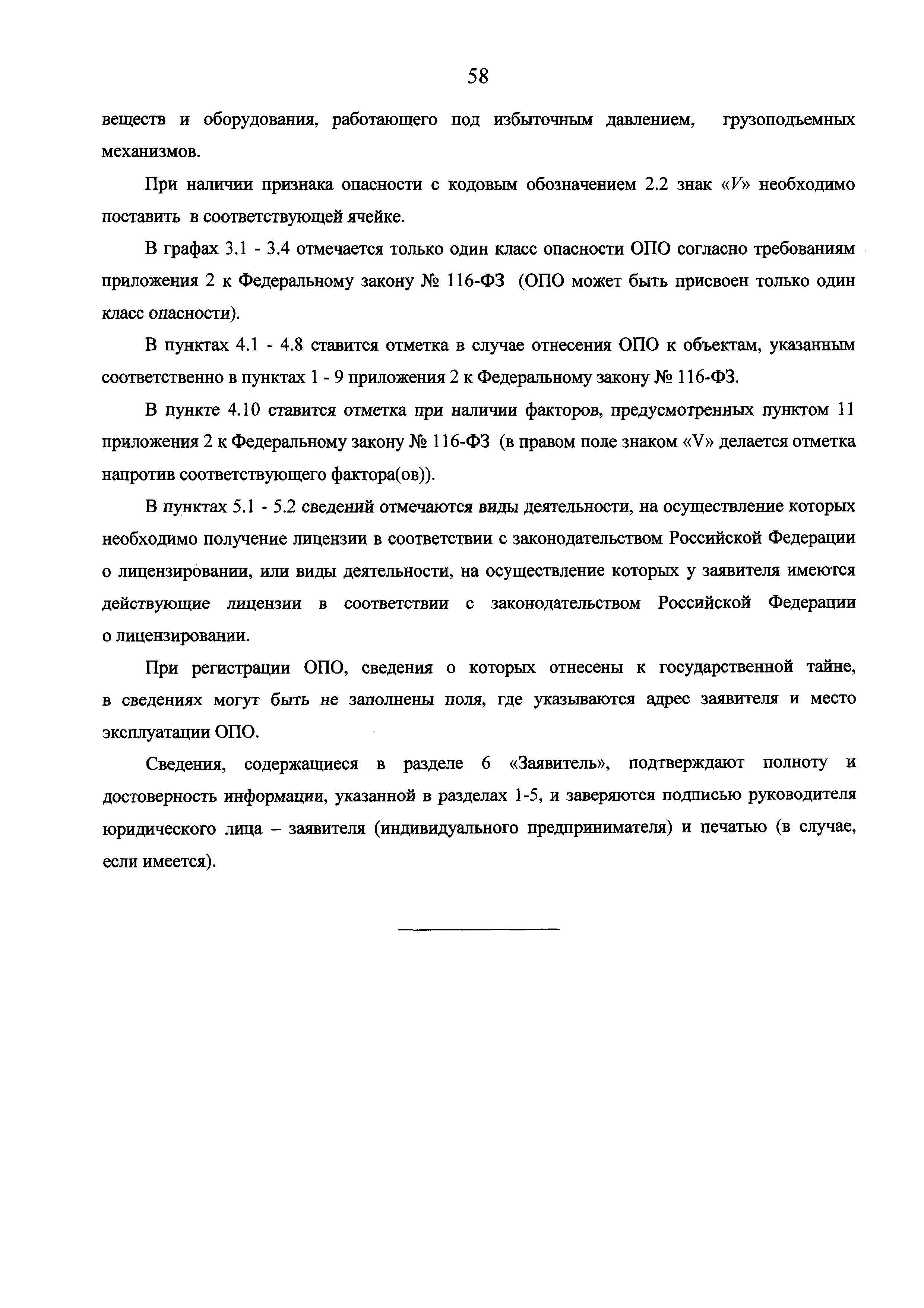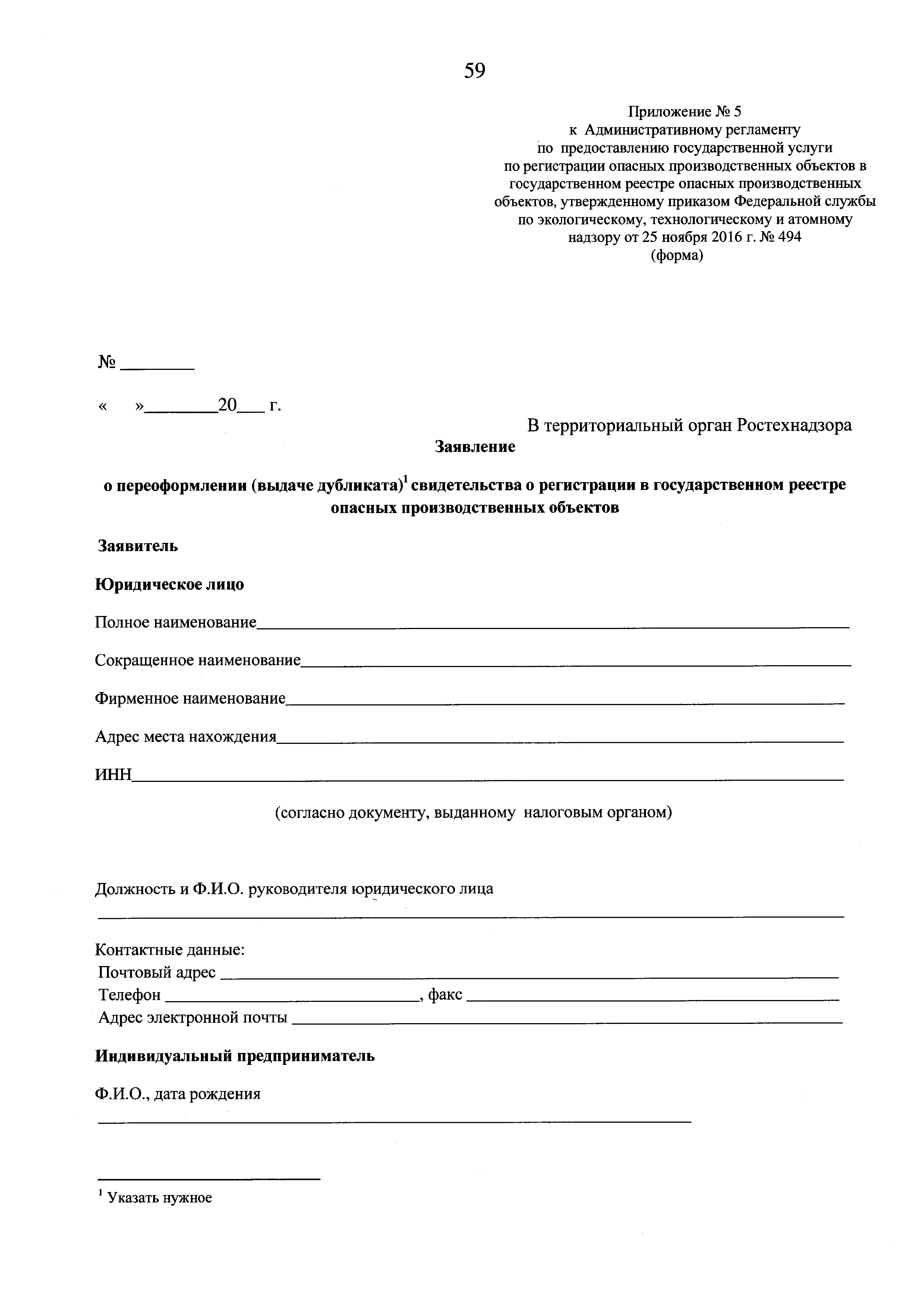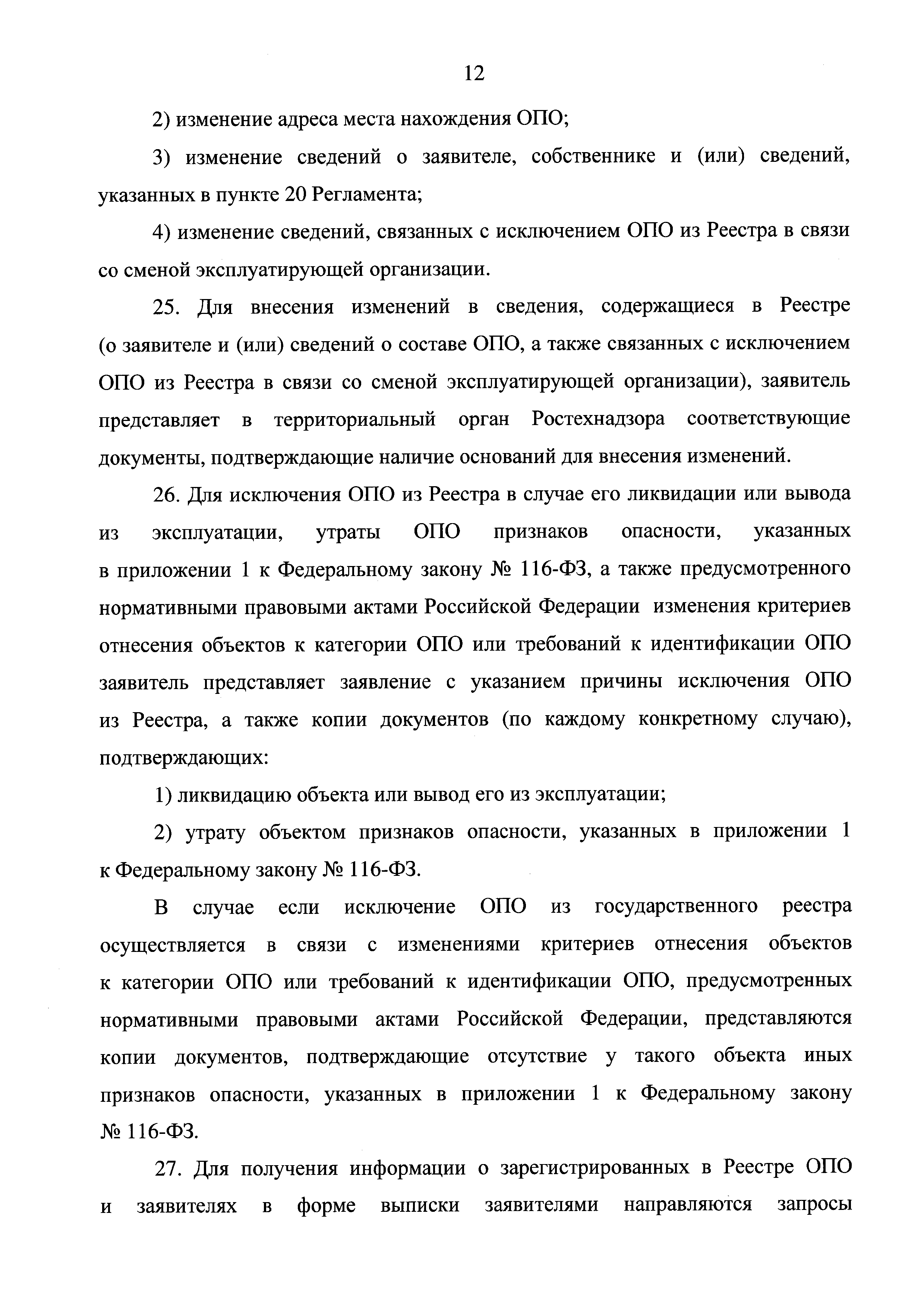 | Оглавление: | I. Общие положения II. Стандарт предоставления государственной услуги III. Состав, последовательность и сроки выполнения административных процедур (действий), требования к порядку их выполнения, в том числе особенности выполнения административных процедур (действий) в электронной форме IV. Формы контроля за исполнением настоящего Регламента V. Досудебный (внесудебный) порядок обжалования решений и действий (бездействия) Ростехнадзора, а также его должностных лиц Приложение № 1. Сведения о местах нахождения, контактных телефонах, адресах официальных сайтов, электронной почты территориальных органов Ростехнадзора Приложение № 2. Опись документов Приложение № 3. Заявление Приложение № 4. Сведения, характеризующие ОПО Приложение № 5. Заявление о переоформлении (выдаче дубликата) свидетельства о регистрации в государственном реестре опасных производственных объектов Приложение № 6. Заявление о предоставлении информации о зарегистрированных в Реестре ОПО в форме выписки Приложение № 7. Блок-схема предоставления государственной услуги |