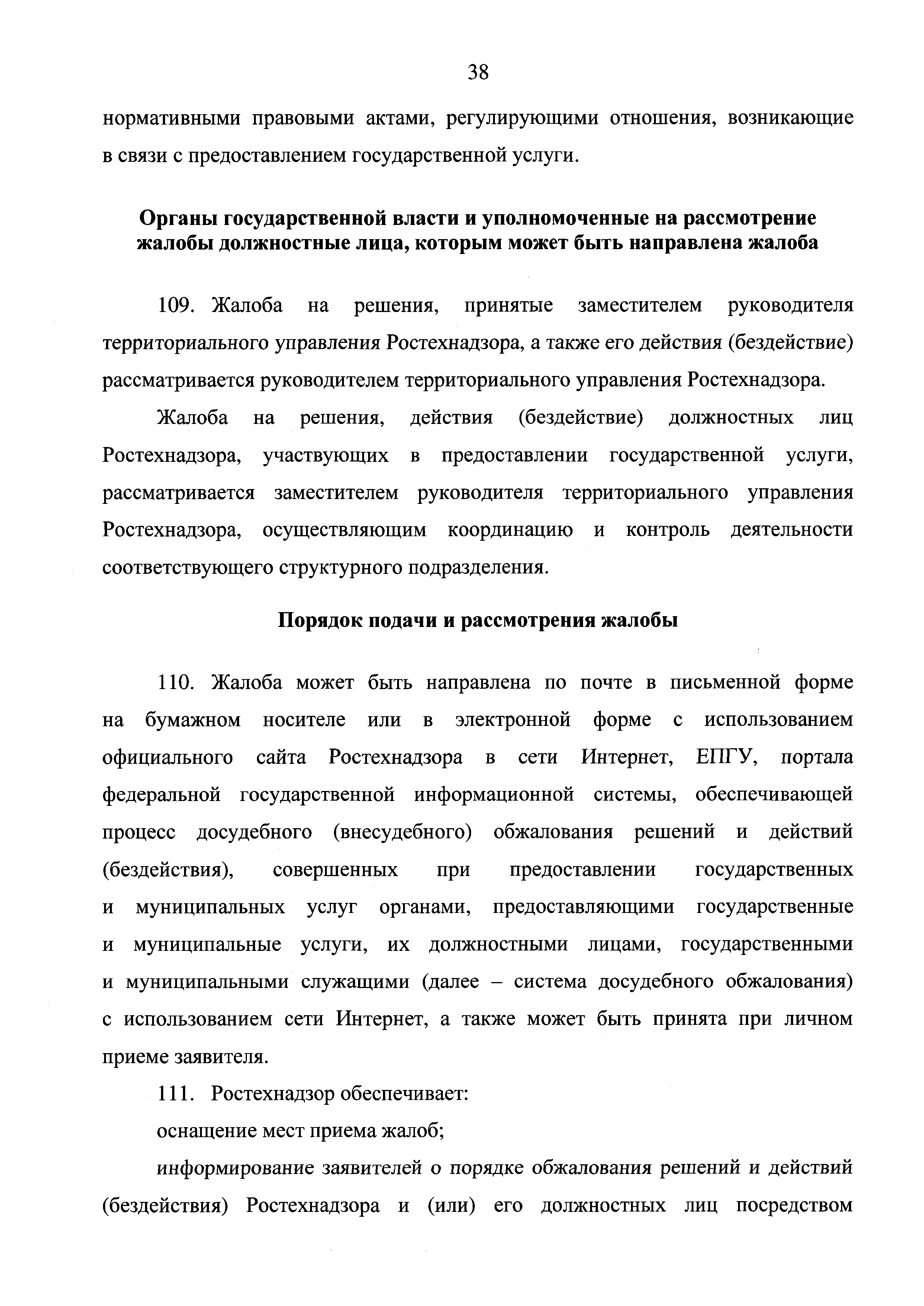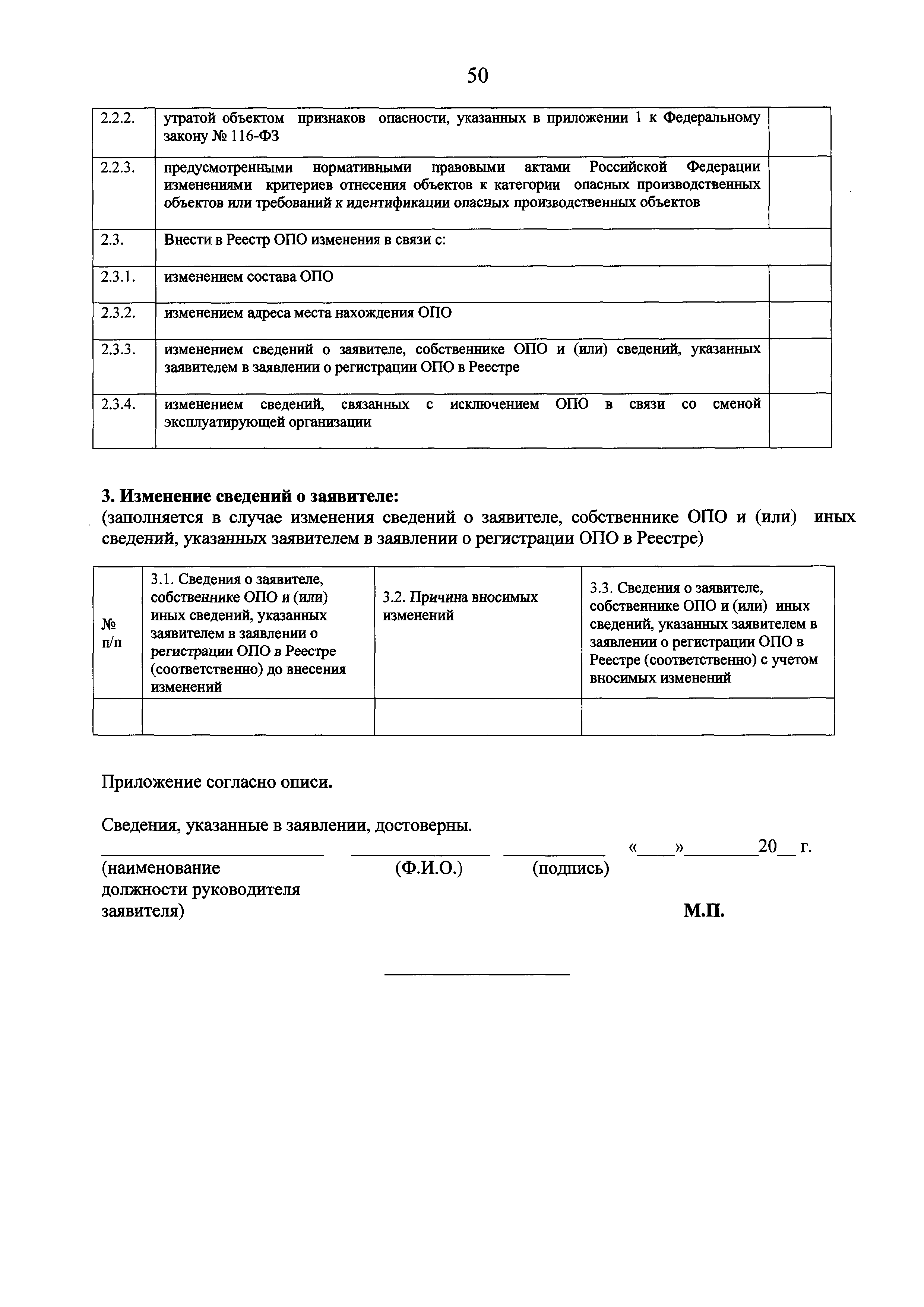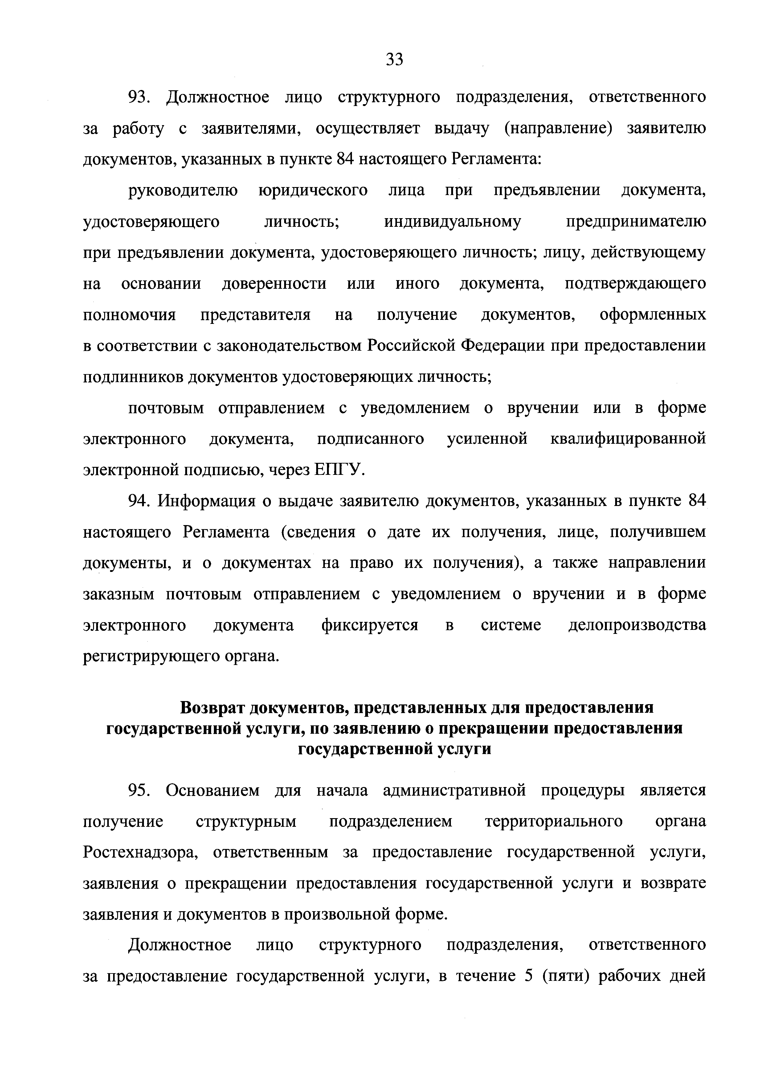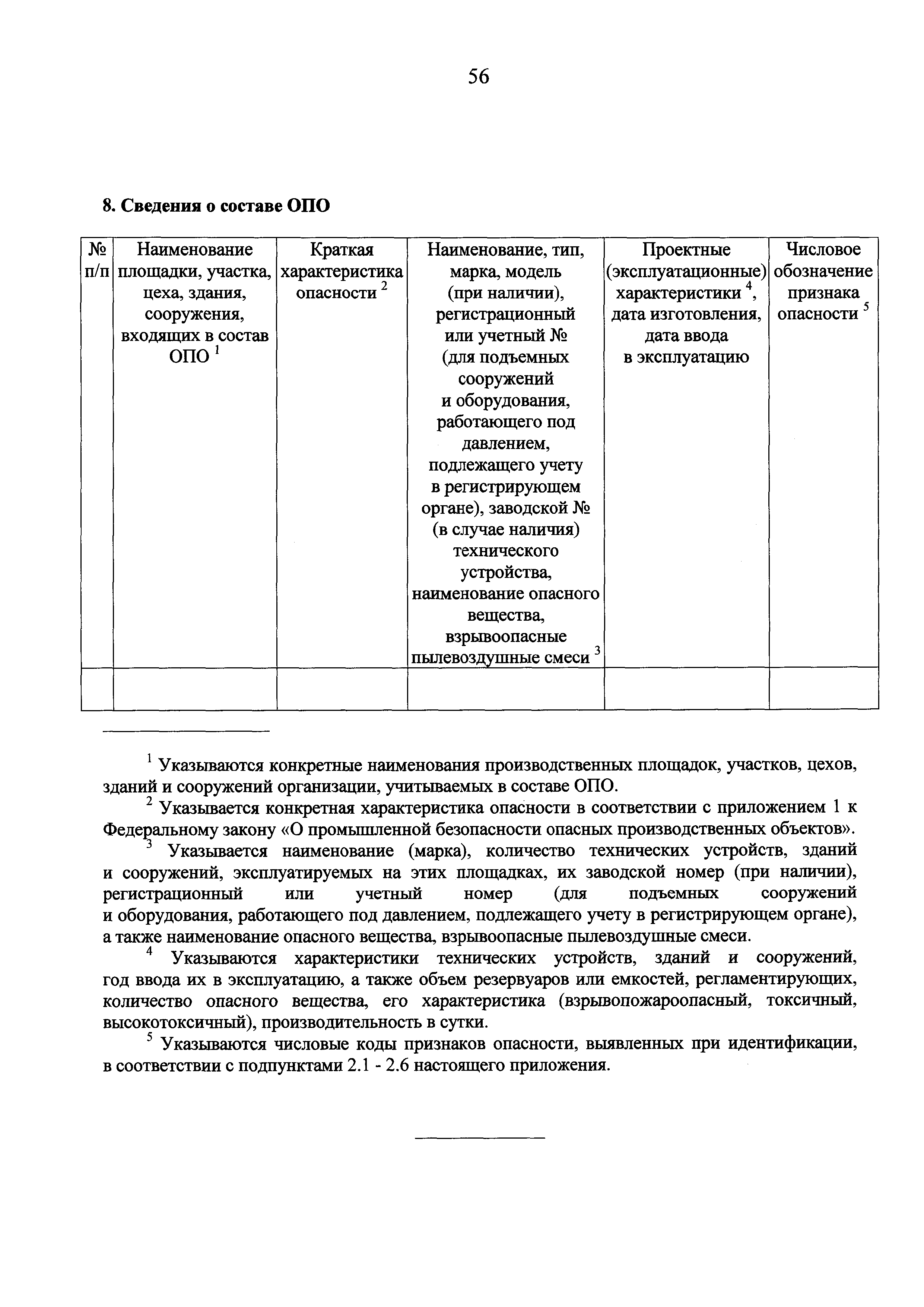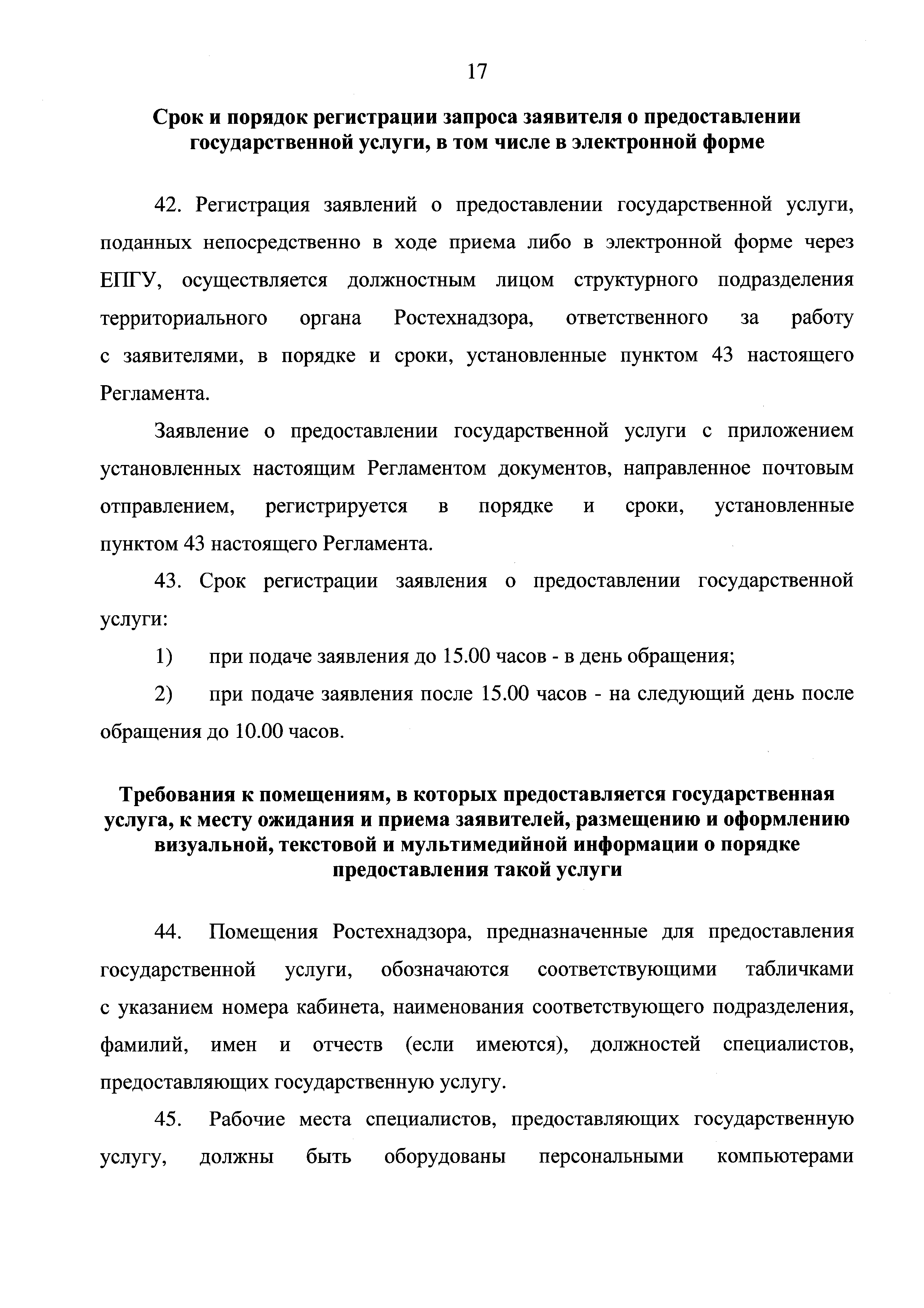 | Оглавление: | I. Общие положения II. Стандарт предоставления государственной услуги III. Состав, последовательность и сроки выполнения административных процедур (действий), требования к порядку их выполнения, в том числе особенности выполнения административных процедур (действий) в электронной форме IV. Формы контроля за исполнением настоящего Регламента V. Досудебный (внесудебный) порядок обжалования решений и действий (бездействия) Ростехнадзора, а также его должностных лиц Приложение № 1. Сведения о местах нахождения, контактных телефонах, адресах официальных сайтов, электронной почты территориальных органов Ростехнадзора Приложение № 2. Опись документов Приложение № 3. Заявление Приложение № 4. Сведения, характеризующие ОПО Приложение № 5. Заявление о переоформлении (выдаче дубликата) свидетельства о регистрации в государственном реестре опасных производственных объектов Приложение № 6. Заявление о предоставлении информации о зарегистрированных в Реестре ОПО в форме выписки Приложение № 7. Блок-схема предоставления государственной услуги |