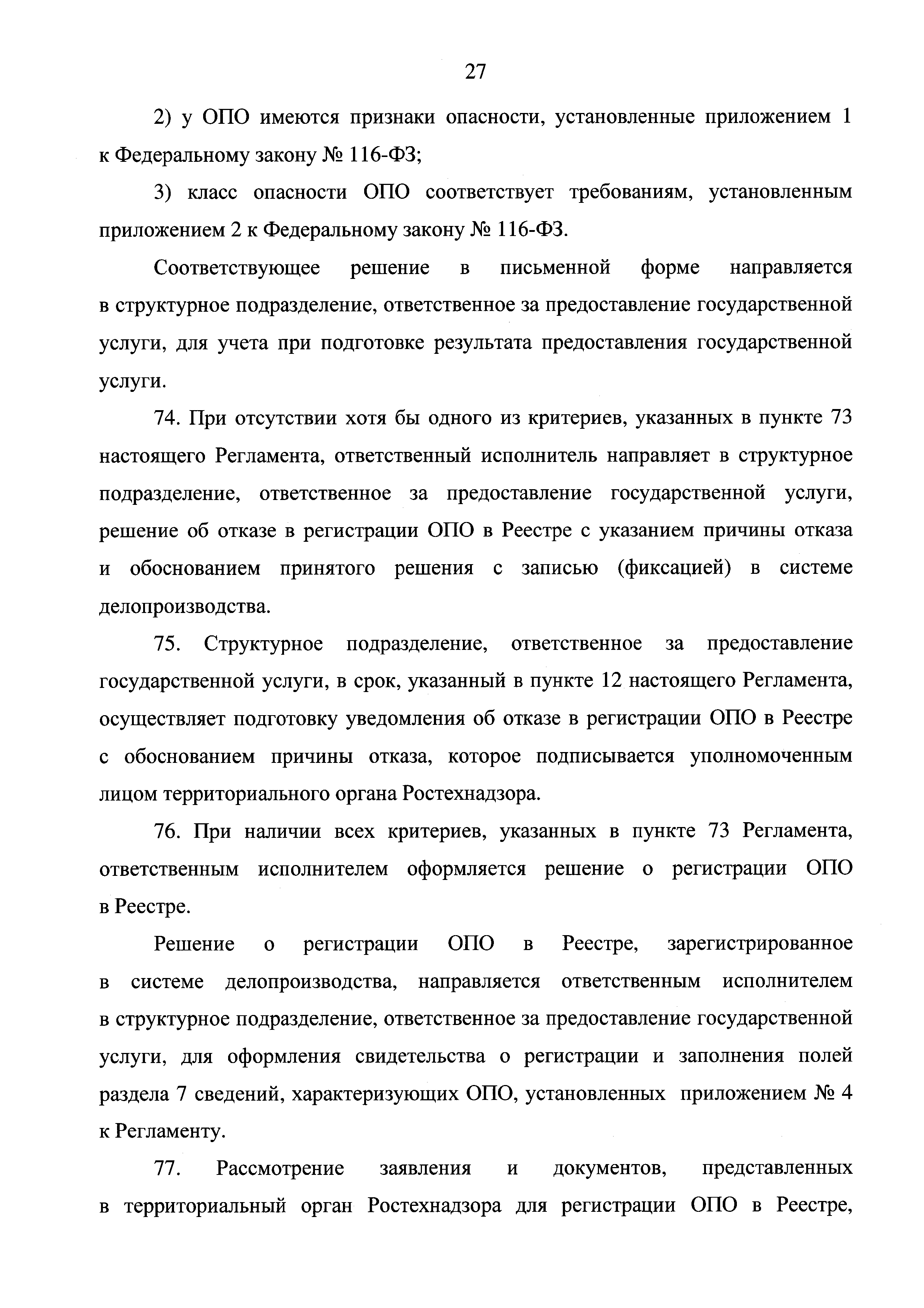 | Область применения: | Административный регламент устанавливает сроки и последовательность административных процедур (действий) Федеральной службы по экологическому, технологическому и атомному надзору по предоставлению государственной услуги по регистрации опасных производственных объектов в государственном реестре опасных производственных объектов |