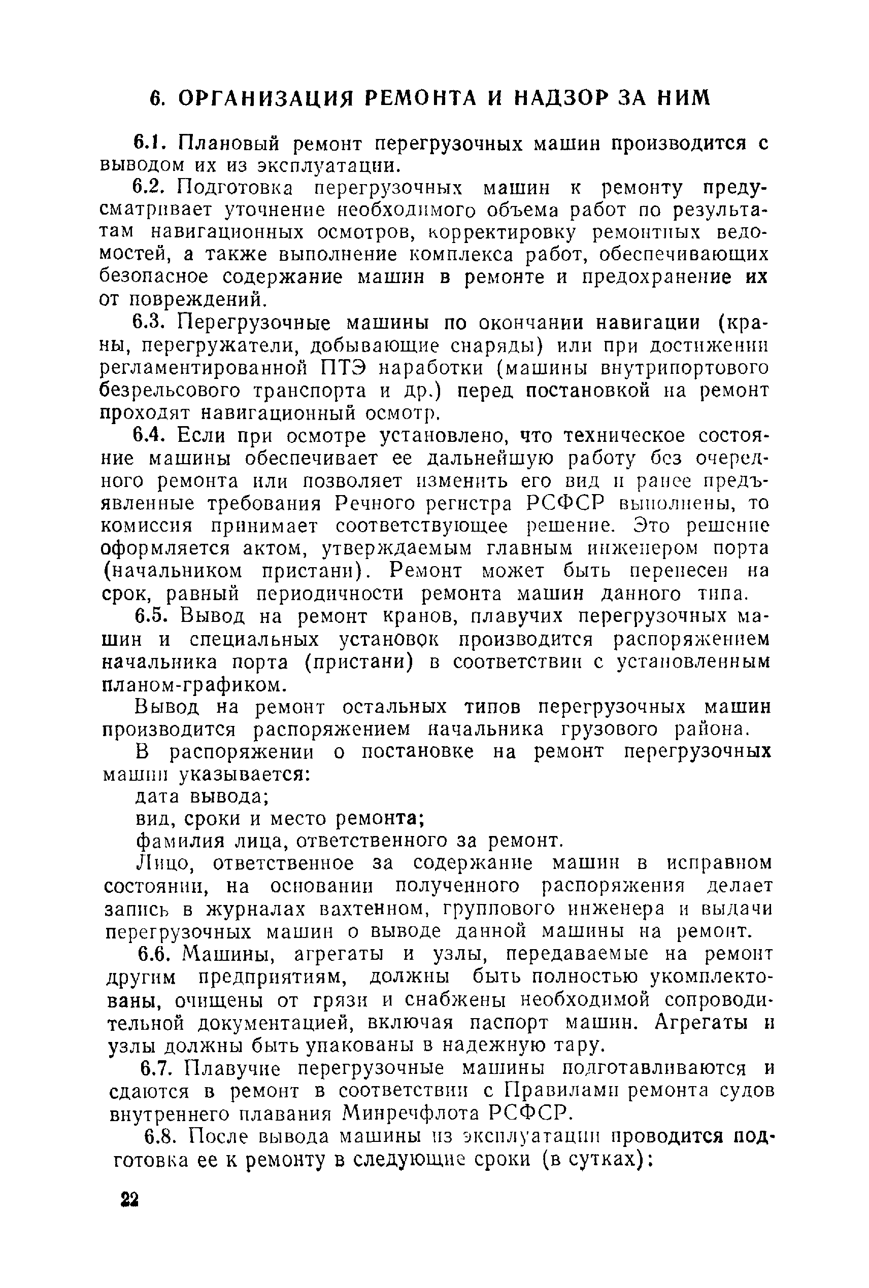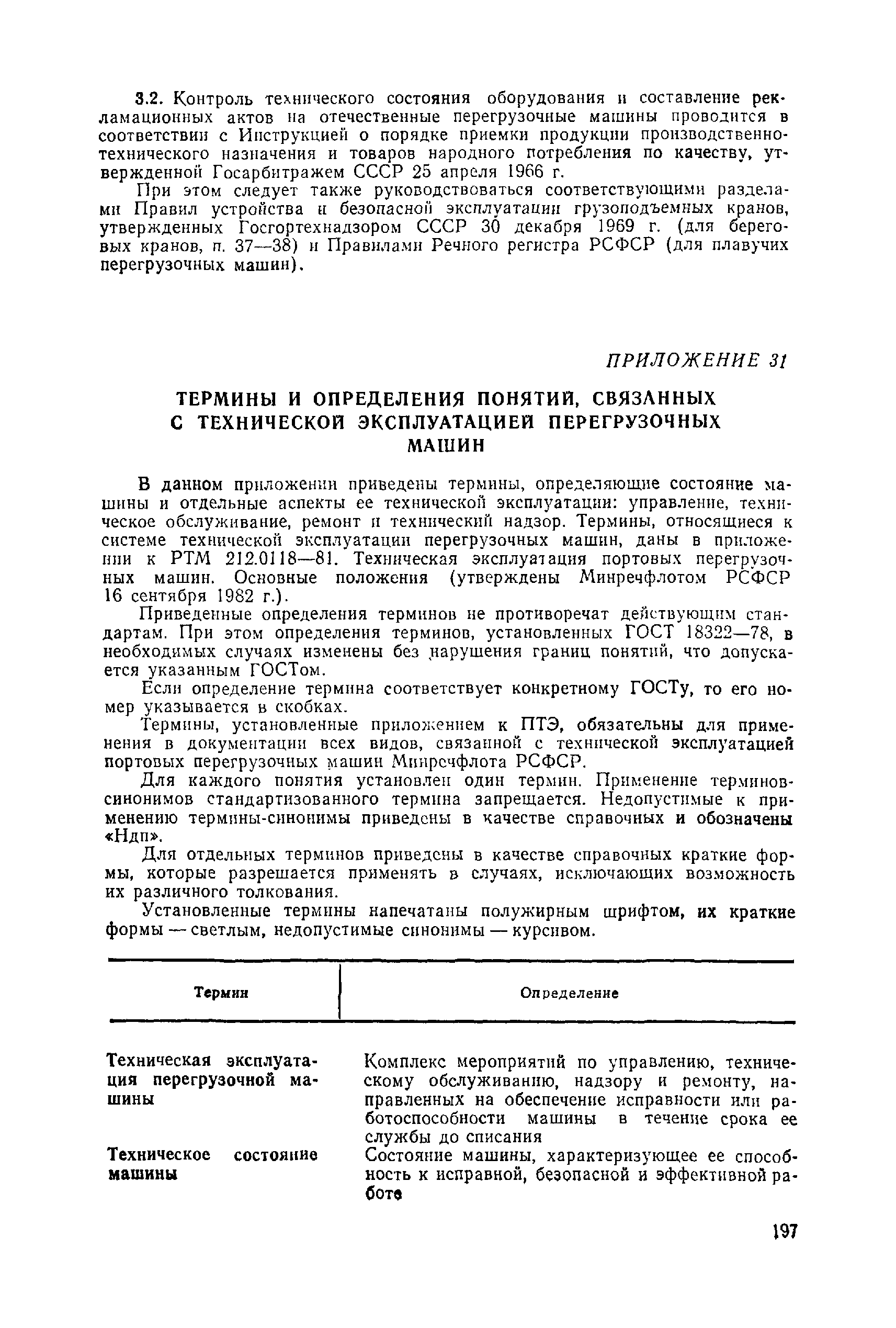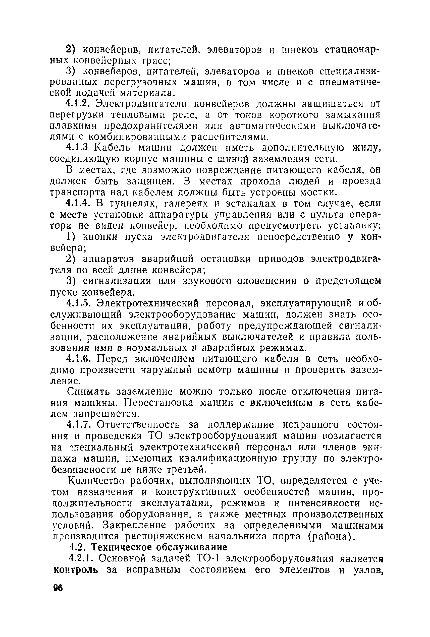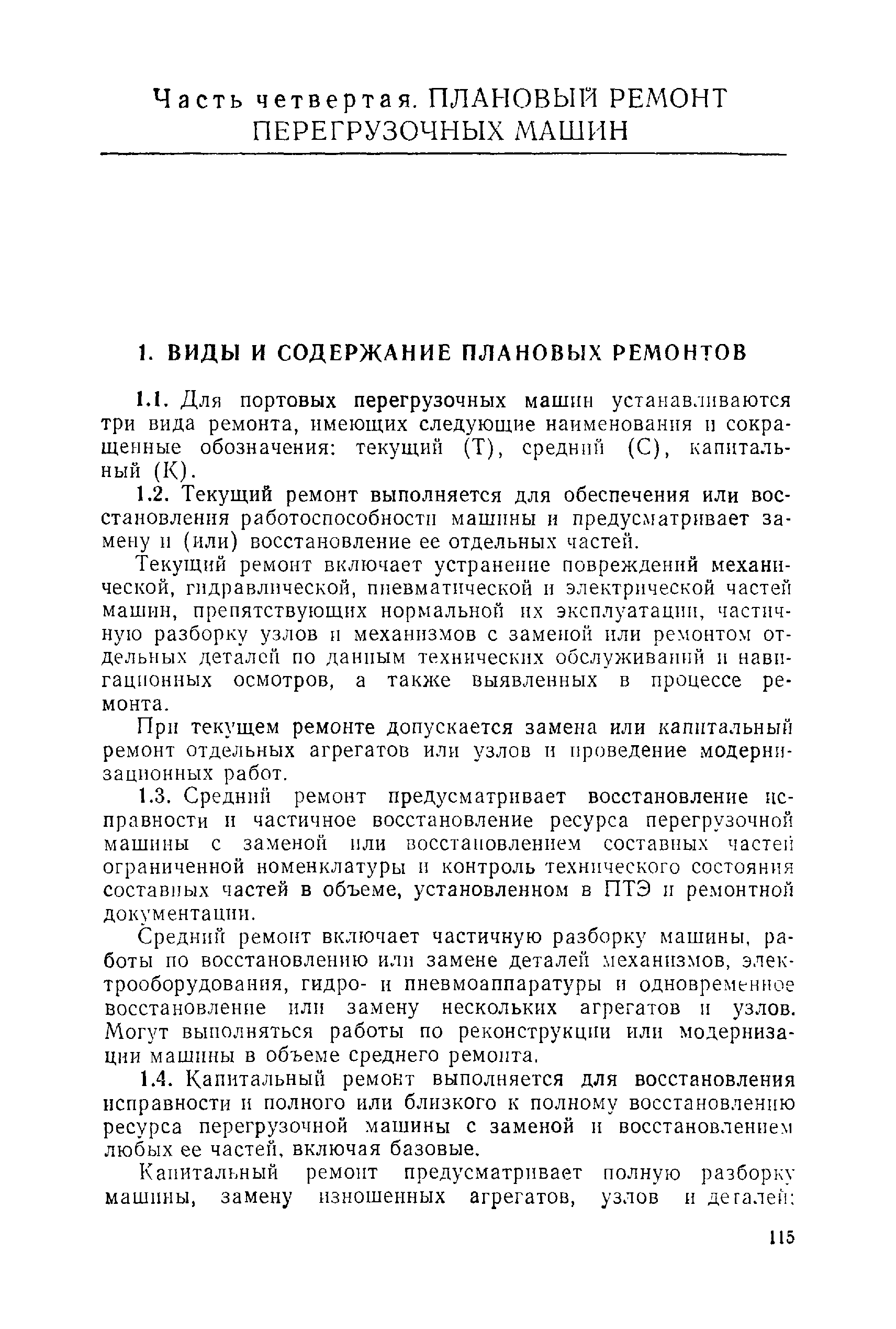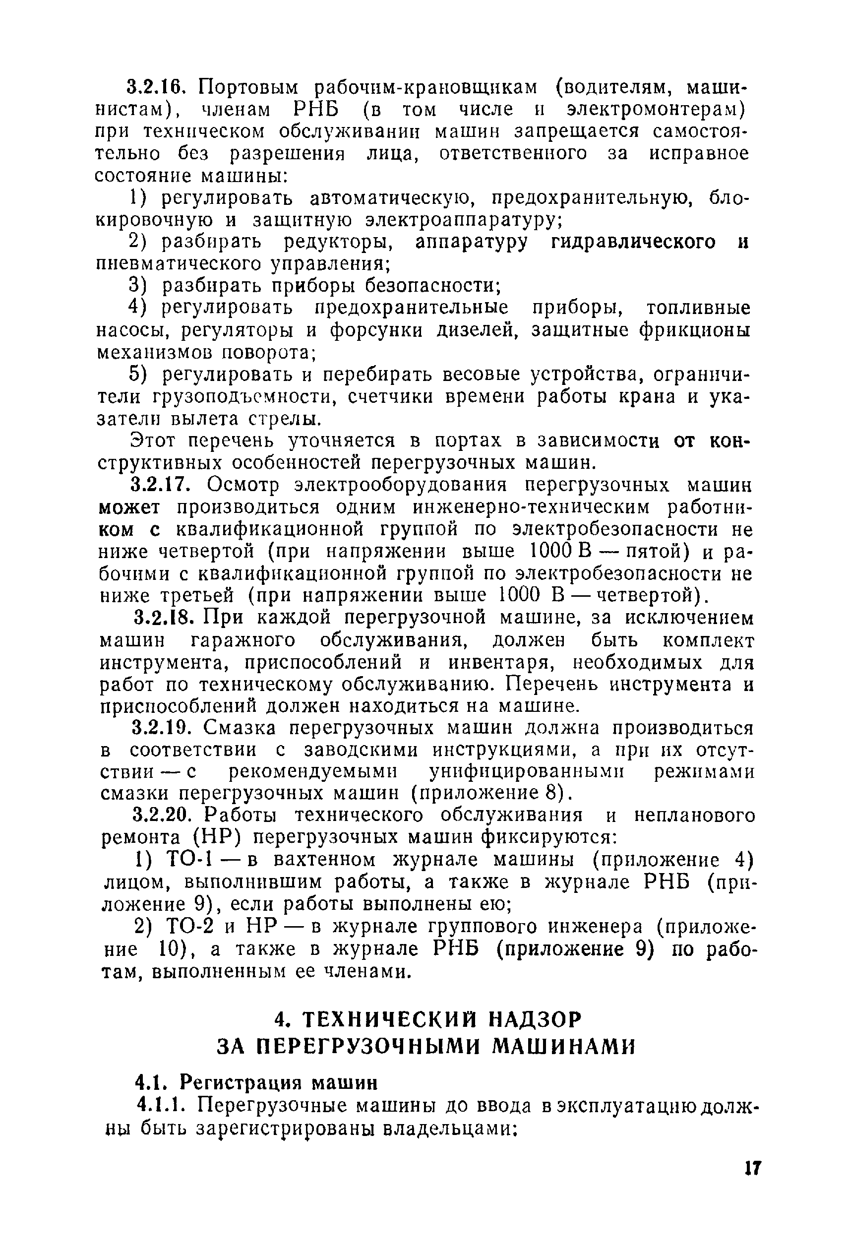 Правила технической эксплуатации перегрузочных машин речных портов| Статус: | взамен | | Название рус.: | Правила технической эксплуатации перегрузочных машин речных портов | | Дата добавления в базу: | 05.05.2017 | | Дата актуализации: | 01.01.2021 | | Дата введения: | 01.01.1984 | | Область применения: | Правила технической эксплуатации перегрузочных машин регламентируют управление машинами, технический надзор, техническое обслуживание и плановый ремонт перегрузочных машин. | | Оглавление: | Введение Часть первая. Организация технической эксплуатации перегрузочных машин 1. Область применения ПТЭ 2. Управление перегрузочными машинами 3. Техническое обслуживание перегрузочных машин 3.1. Виды и содержание технического обслуживания 3.2. Организация технического обслуживания 4. Технический надзор за перегрузочными машинами 4.1. Регистрация машин 4.2. Виды и организация технического надзора 4.3. Технические освидетельствования 4.4. Навигационные осмотры 4.5. Оперативные осмотры 5. Ремонт перегрузочных машин 6. Техническая документация 7. Порядок расследования аварий и несчастных случаев Часть вторая. Техническое обслуживание механического оборудования перегрузочных машин и технический надзор за ним 1. Краны 1.1. Общие правила работы кранов 1.2 Спаренная работа кранов 1.3. Особенности работы железнодорожных, гусеничных, пневмоколесных и автомобильных кранов 1.4. Особенности работы кранов с грейфером 1.5. Особенности работы кранов с грузоподъемным электромагнитом 1.6. Работа кранов при ветре и низкой температуре окружающей среды 1.7. Порядок ухода портовых рабочих-крановщиков с крана 1.8. Запрещенные приемы работы 1.9. Повреждения, при которых работа кранов не допускается 1.10. Техническое обслуживание при использовании (ТО-1) 1.11. Периодическое техническое обслуживание (ТО-2) 1.12. Технические освидетельствования береговых кранов 1.13. Технические освидетельствования плавучих кранов 2. Добывающие землесосные снаряды и гидроперегружатели 2.1. Общие правила работы машин 2.2. Управление машинами 2.3. Техническое обслуживание при использовании (ТО-1) 2.4. Периодическое техническое обслуживание (ТО-2) 2.5. Технические освидетельствования 3. Добывающие многочерпаковые снаряды 3.1. Общие правила работы машин 3.2. Управление машинами 3.3. Техническое обслуживание при использовании (ТО-1) 3.4. Периодическое техническое обслуживание (ТО-2) 3.5. Технические освидетельствования 4. Машины внутрипортового безрельсового транспорта 4.1. Общие правила работы машин 4.2. Правила работы погрузчиков 4.3 Правила работы тягачей, прицепов (трейлеров) и аккумуляторных тележек 4.4. Правила работы зачистных машин 4.5. Повреждения, при которых работа машин не допускается 4.6. Техническое обслуживание при использовании (ТО-1) 4.7. Периодическое техническое обслуживание (ТО-2) 4.8. Технические освидетельствования 5. Машины непрерывного транспорта 5.1. Общие правила работы машин 5.2. Повреждения, при которых работа машин не допускается 5.3. Техническое обслуживание при использовании (ТО-1) 5.4. Периодическое техническое обслуживание (ТО-2) 5.5. Технические освидетельствования 6. Двигатели внутреннего сгорания 7. Сменные грузозахватные органы, съемные грузозахватные приспособления и тара Часть третья. Техническое обслуживание электрооборудования перегрузочных машин и технический надзор за мим 1. Общие требования по эксплуатации в те