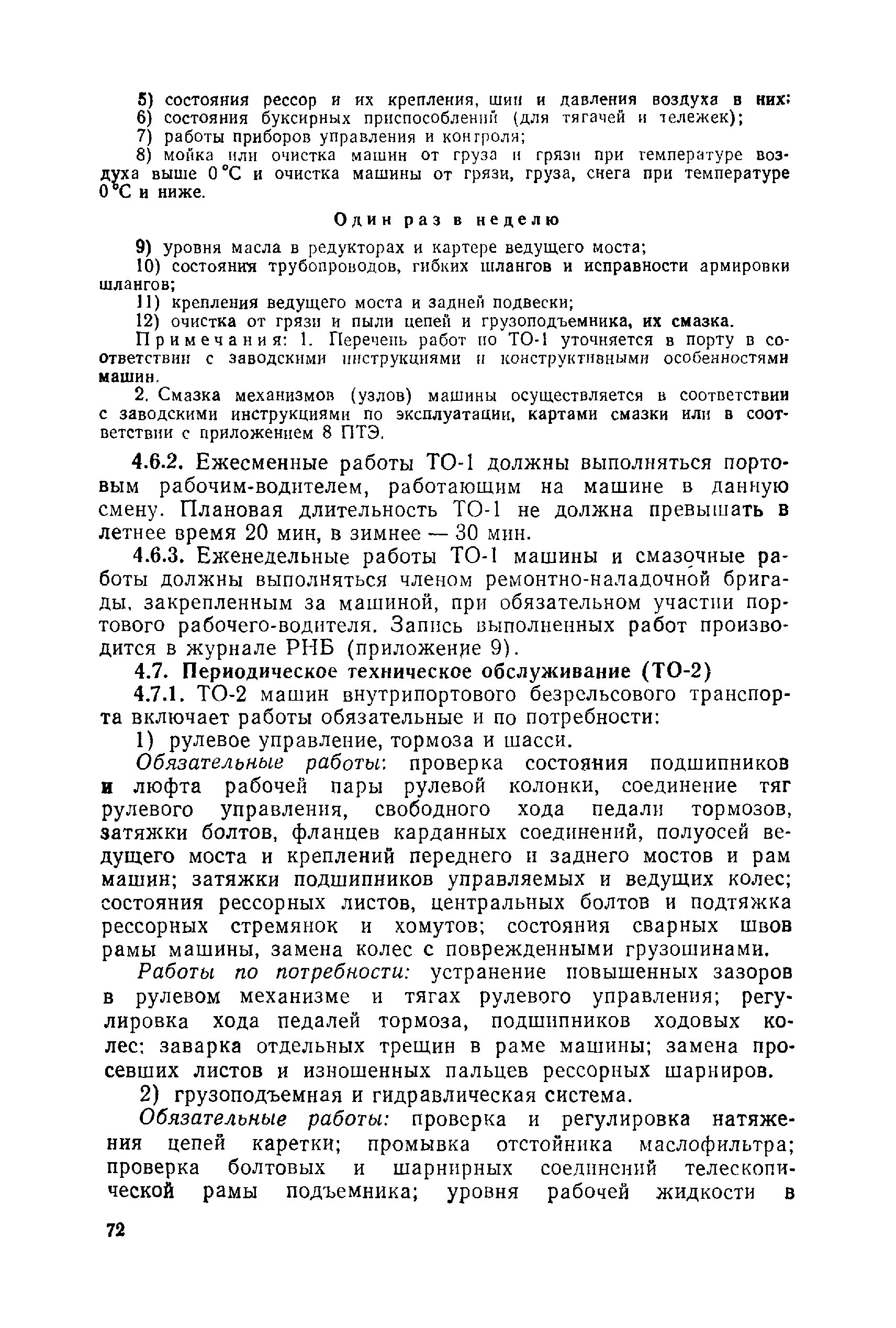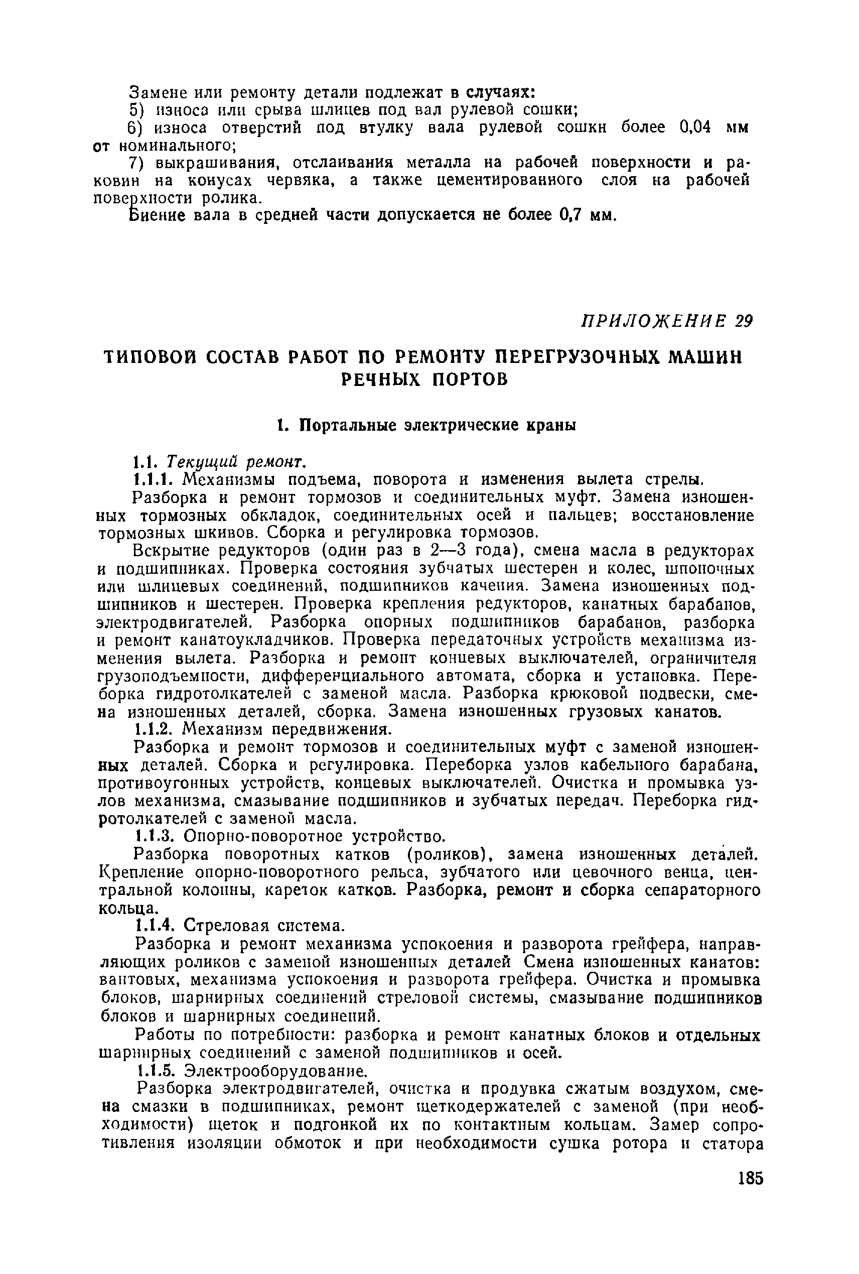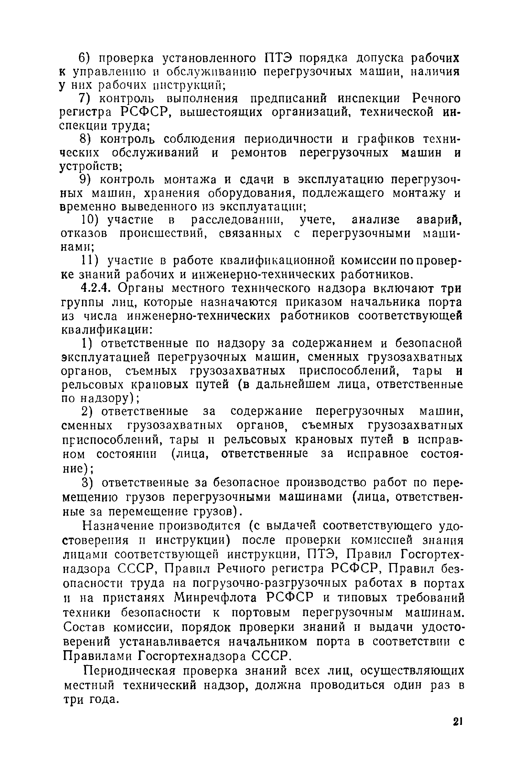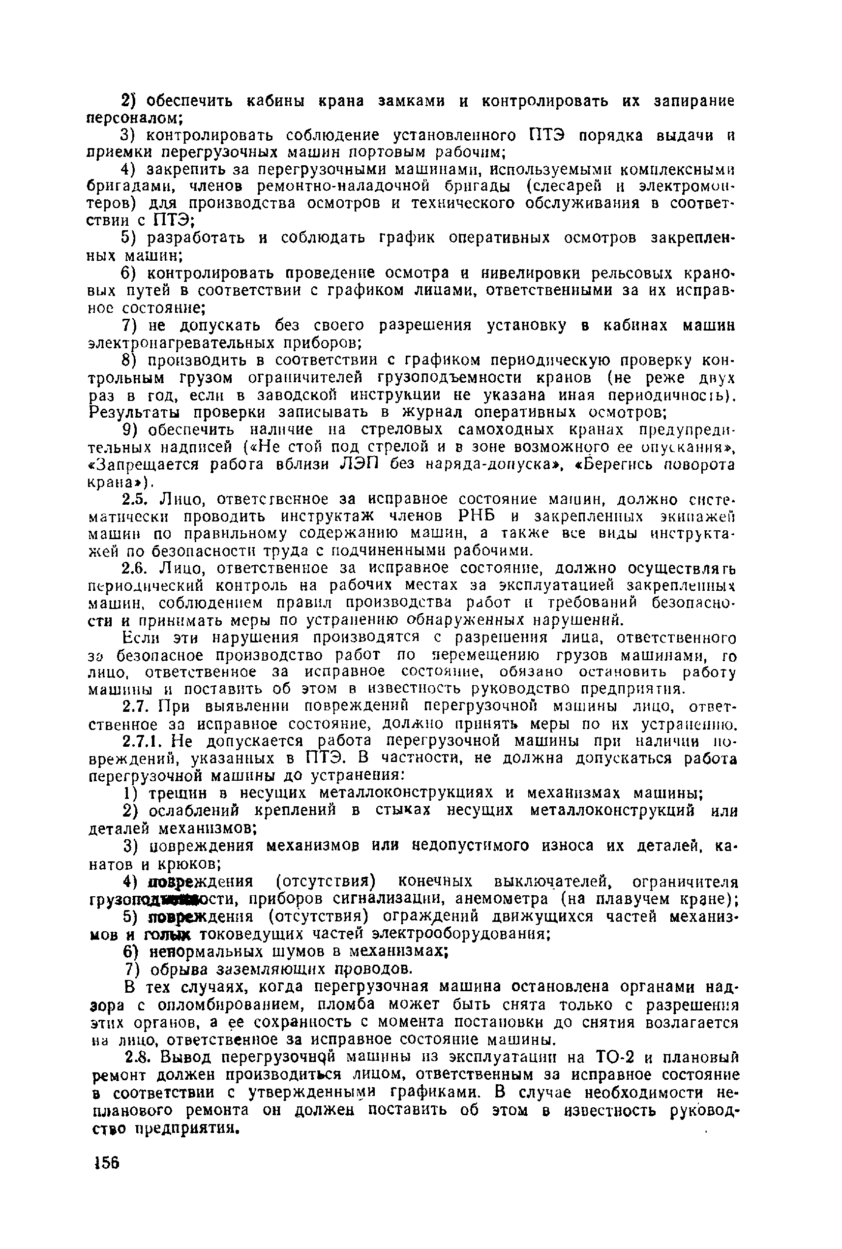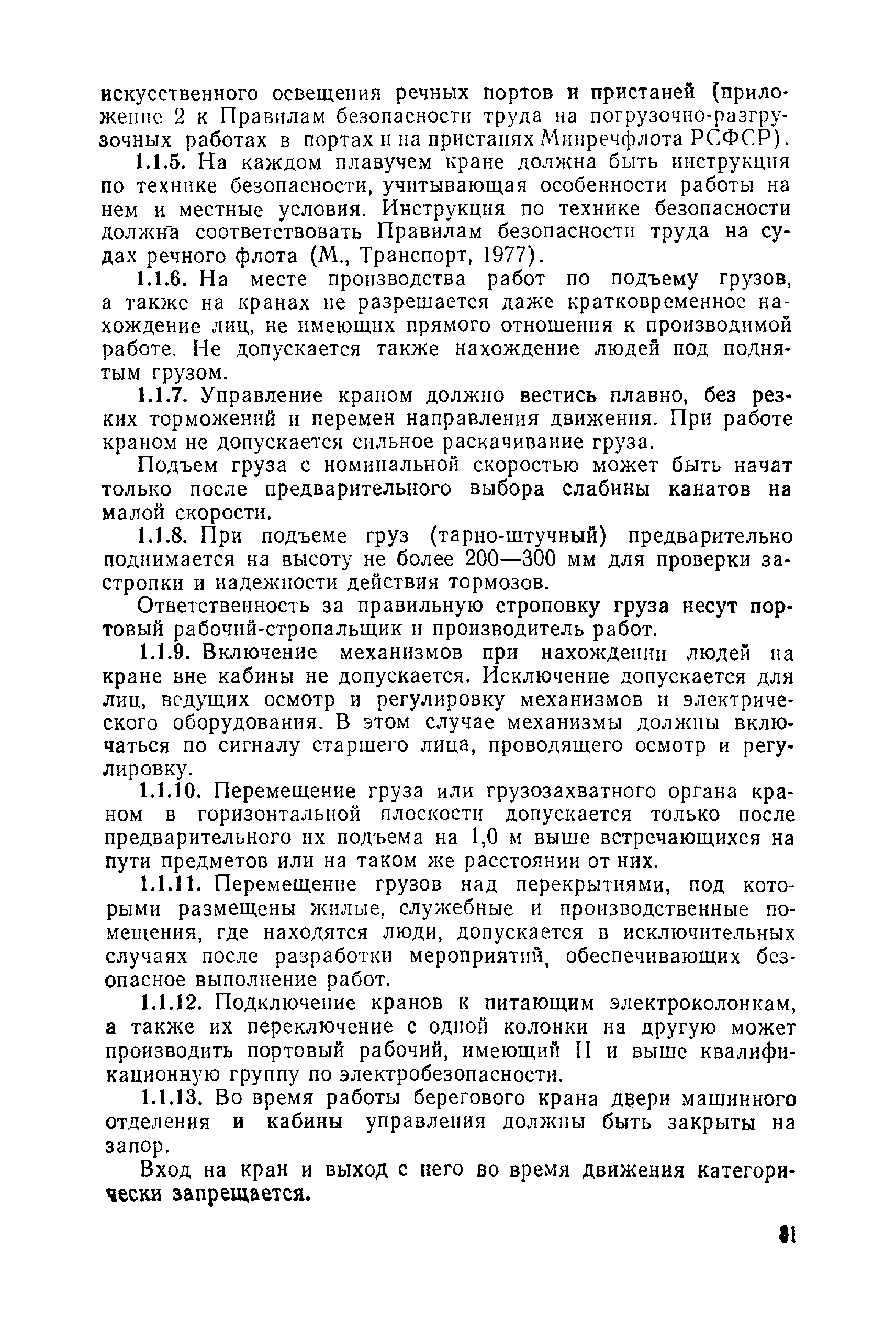 Правила технической эксплуатации перегрузочных машин речных портов| Статус: | взамен | | Название рус.: | Правила технической эксплуатации перегрузочных машин речных портов | | Дата добавления в базу: | 05.05.2017 | | Дата актуализации: | 01.01.2021 | | Дата введения: | 01.01.1984 | | Область применения: | Правила технической эксплуатации перегрузочных машин регламентируют управление машинами, технический надзор, техническое обслуживание и плановый ремонт перегрузочных машин. | | Оглавление: | Введение Часть первая. Организация технической эксплуатации перегрузочных машин 1. Область применения ПТЭ 2. Управление перегрузочными машинами 3. Техническое обслуживание перегрузочных машин 3.1. Виды и содержание технического обслуживания 3.2. Организация технического обслуживания 4. Технический надзор за перегрузочными машинами 4.1. Регистрация машин 4.2. Виды и организация технического надзора 4.3. Технические освидетельствования 4.4. Навигационные осмотры 4.5. Оперативные осмотры 5. Ремонт перегрузочных машин 6. Техническая документация 7. Порядок расследования аварий и несчастных случаев Часть вторая. Техническое обслуживание механического оборудования перегрузочных машин и технический надзор за ним 1. Краны 1.1. Общие правила работы кранов 1.2 Спаренная работа кранов 1.3. Особенности работы железнодорожных, гусеничных, пневмоколесных и автомобильных кранов 1.4. Особенности работы кранов с грейфером 1.5. Особенности работы кранов с грузоподъемным электромагнитом 1.6. Работа кранов при ветре и низкой температуре окружающей среды 1.7. Порядок ухода портовых рабочих-крановщиков с крана 1.8. Запрещенные приемы работы 1.9. Повреждения, при которых работа кранов не допускается 1.10. Техническое обслуживание при использовании (ТО-1) 1.11. Периодическое техническое обслуживание (ТО-2) 1.12. Технические освидетельствования береговых кранов 1.13. Технические освидетельствования плавучих кранов 2. Добывающие землесосные снаряды и гидроперегружатели 2.1. Общие правила работы машин 2.2. Управление машинами 2.3. Техническое обслуживание при использовании (ТО-1) 2.4. Периодическое техническое обслуживание (ТО-2) 2.5. Технические освидетельствования 3. Добывающие многочерпаковые снаряды 3.1. Общие правила работы машин 3.2. Управление машинами 3.3. Техническое обслуживание при использовании (ТО-1) 3.4. Периодическое техническое обслуживание (ТО-2) 3.5. Технические освидетельствования 4. Машины внутрипортового безрельсового транспорта 4.1. Общие правила работы машин 4.2. Правила работы погрузчиков 4.3 Правила работы тягачей, прицепов (трейлеров) и аккумуляторных тележек 4.4. Правила работы зачистных машин 4.5. Повреждения, при которых работа машин не допускается 4.6. Техническое обслуживание при использовании (ТО-1) 4.7. Периодическое техническое обслуживание (ТО-2) 4.8. Технические освидетельствования 5. Машины непрерывного транспорта 5.1. Общие правила работы машин 5.2. Повреждения, при которых работа машин не допускается 5.3. Техническое обслуживание при использовании (ТО-1) 5.4. Периодическое техническое обслуживание (ТО-2) 5.5. Технические освидетельствования 6. Двигатели внутреннего сгорания 7. Сменные грузозахватные органы, съемные грузозахватные приспособления и тара Часть третья. Техническое обслуживание электрооборудования перегрузочных машин и технический надзор за мим 1. Общие требования по эксплуатации в те