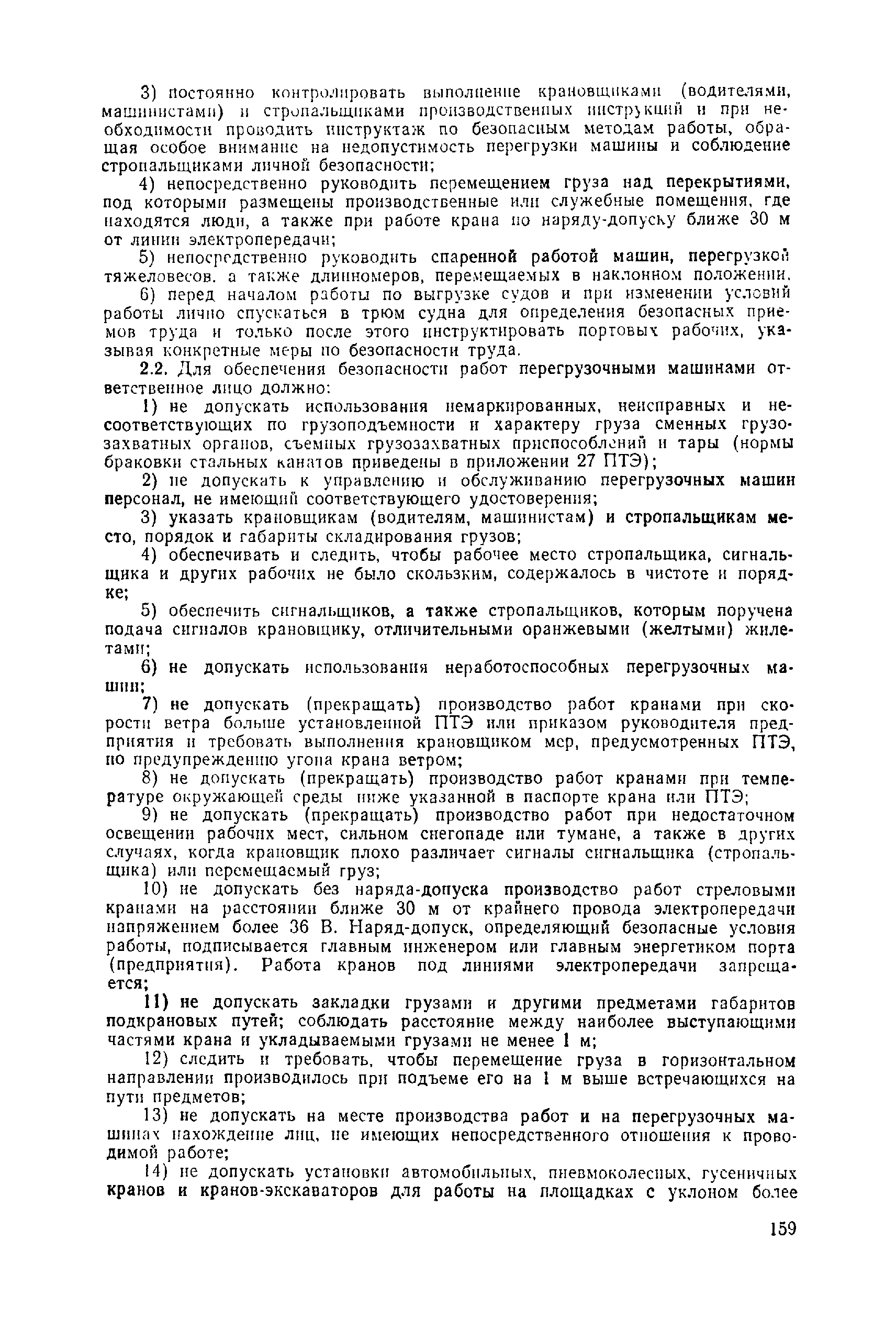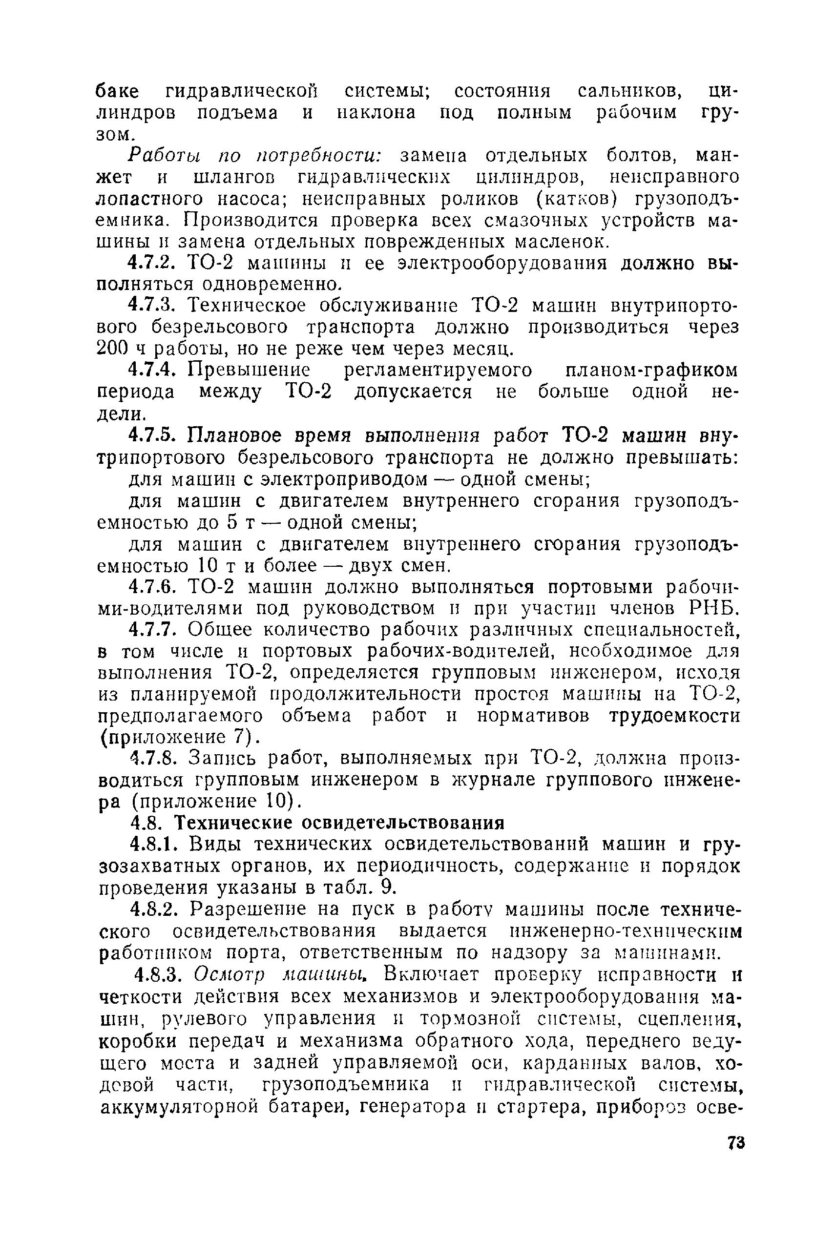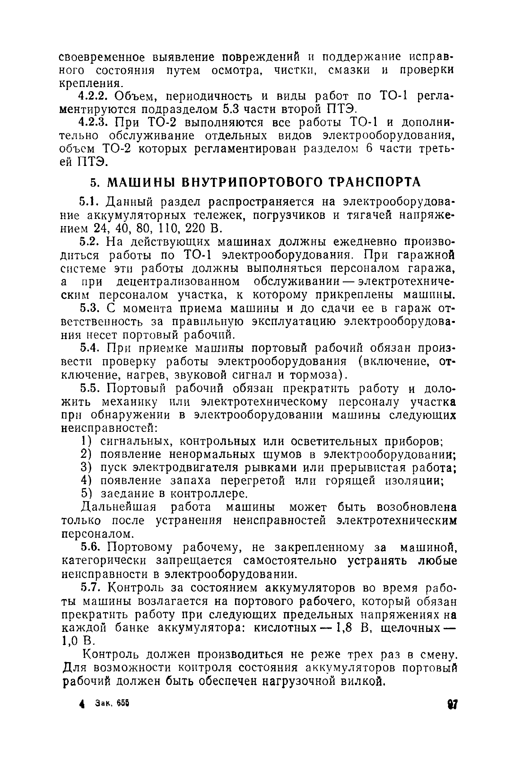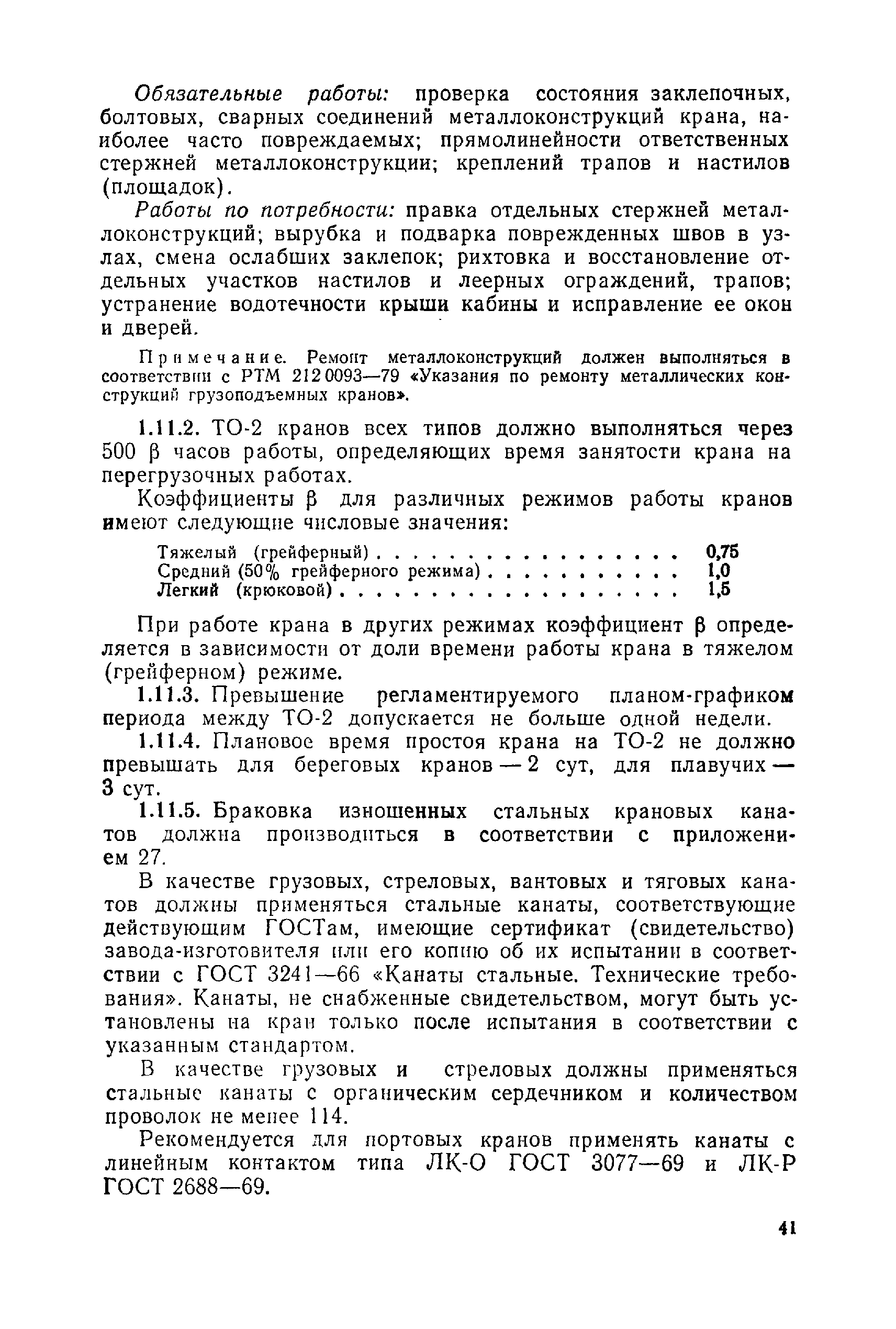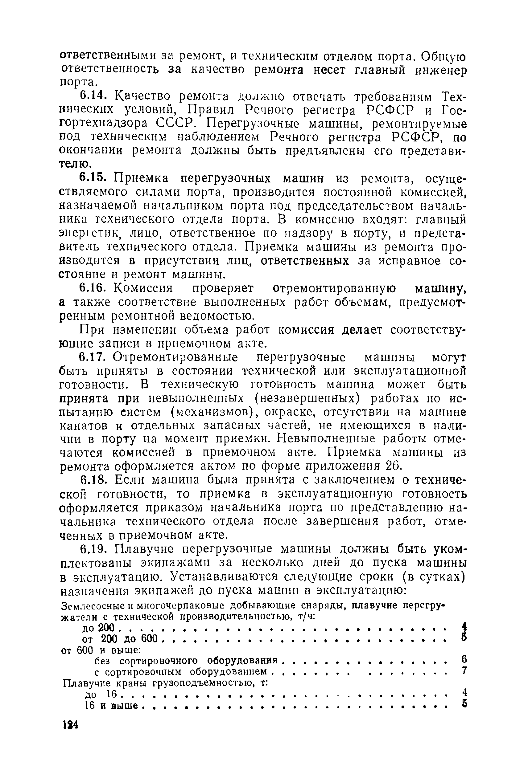 Правила технической эксплуатации перегрузочных машин речных портов| Статус: | взамен | | Название рус.: | Правила технической эксплуатации перегрузочных машин речных портов | | Дата добавления в базу: | 05.05.2017 | | Дата актуализации: | 01.01.2021 | | Дата введения: | 01.01.1984 | | Область применения: | Правила технической эксплуатации перегрузочных машин регламентируют управление машинами, технический надзор, техническое обслуживание и плановый ремонт перегрузочных машин. | | Оглавление: | Введение Часть первая. Организация технической эксплуатации перегрузочных машин 1. Область применения ПТЭ 2. Управление перегрузочными машинами 3. Техническое обслуживание перегрузочных машин 3.1. Виды и содержание технического обслуживания 3.2. Организация технического обслуживания 4. Технический надзор за перегрузочными машинами 4.1. Регистрация машин 4.2. Виды и организация технического надзора 4.3. Технические освидетельствования 4.4. Навигационные осмотры 4.5. Оперативные осмотры 5. Ремонт перегрузочных машин 6. Техническая документация 7. Порядок расследования аварий и несчастных случаев Часть вторая. Техническое обслуживание механического оборудования перегрузочных машин и технический надзор за ним 1. Краны 1.1. Общие правила работы кранов 1.2 Спаренная работа кранов 1.3. Особенности работы железнодорожных, гусеничных, пневмоколесных и автомобильных кранов 1.4. Особенности работы кранов с грейфером 1.5. Особенности работы кранов с грузоподъемным электромагнитом 1.6. Работа кранов при ветре и низкой температуре окружающей среды 1.7. Порядок ухода портовых рабочих-крановщиков с крана 1.8. Запрещенные приемы работы 1.9. Повреждения, при которых работа кранов не допускается 1.10. Техническое обслуживание при использовании (ТО-1) 1.11. Периодическое техническое обслуживание (ТО-2) 1.12. Технические освидетельствования береговых кранов 1.13. Технические освидетельствования плавучих кранов 2. Добывающие землесосные снаряды и гидроперегружатели 2.1. Общие правила работы машин 2.2. Управление машинами 2.3. Техническое обслуживание при использовании (ТО-1) 2.4. Периодическое техническое обслуживание (ТО-2) 2.5. Технические освидетельствования 3. Добывающие многочерпаковые снаряды 3.1. Общие правила работы машин 3.2. Управление машинами 3.3. Техническое обслуживание при использовании (ТО-1) 3.4. Периодическое техническое обслуживание (ТО-2) 3.5. Технические освидетельствования 4. Машины внутрипортового безрельсового транспорта 4.1. Общие правила работы машин 4.2. Правила работы погрузчиков 4.3 Правила работы тягачей, прицепов (трейлеров) и аккумуляторных тележек 4.4. Правила работы зачистных машин 4.5. Повреждения, при которых работа машин не допускается 4.6. Техническое обслуживание при использовании (ТО-1) 4.7. Периодическое техническое обслуживание (ТО-2) 4.8. Технические освидетельствования 5. Машины непрерывного транспорта 5.1. Общие правила работы машин 5.2. Повреждения, при которых работа машин не допускается 5.3. Техническое обслуживание при использовании (ТО-1) 5.4. Периодическое техническое обслуживание (ТО-2) 5.5. Технические освидетельствования 6. Двигатели внутреннего сгорания 7. Сменные грузозахватные органы, съемные грузозахватные приспособления и тара Часть третья. Техническое обслуживание электрооборудования перегрузочных машин и технический надзор за мим 1. Общие требования по эксплуатации в те