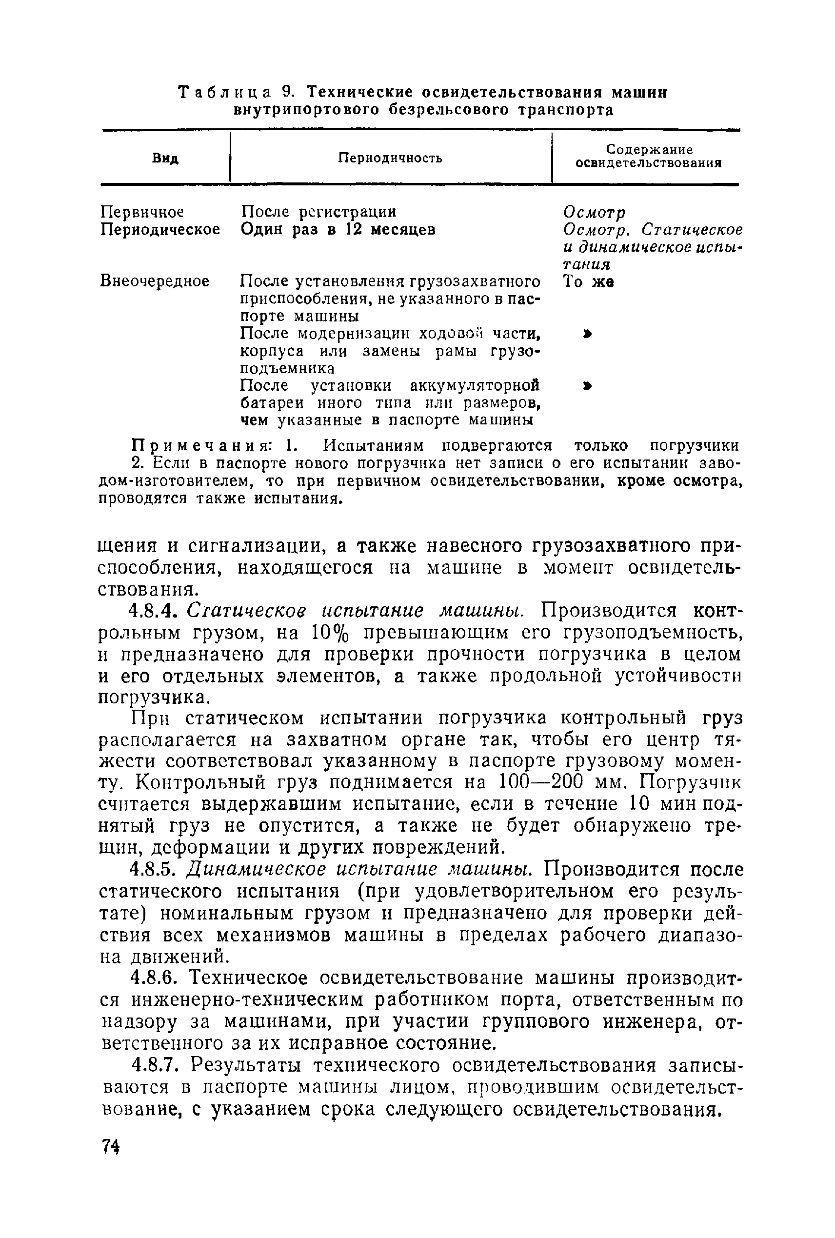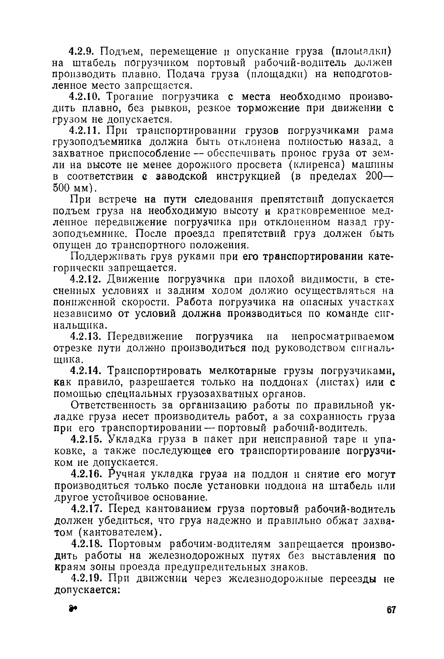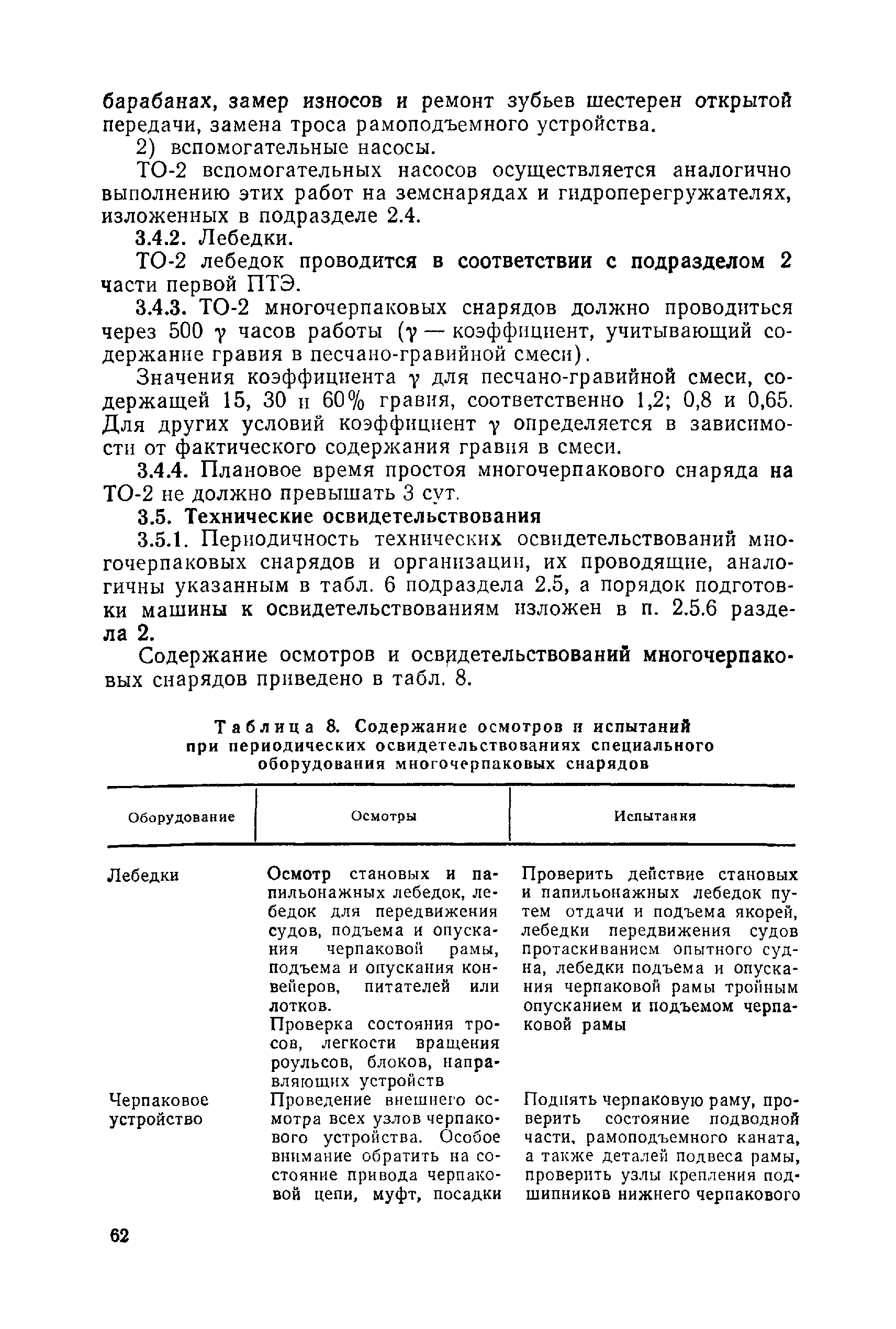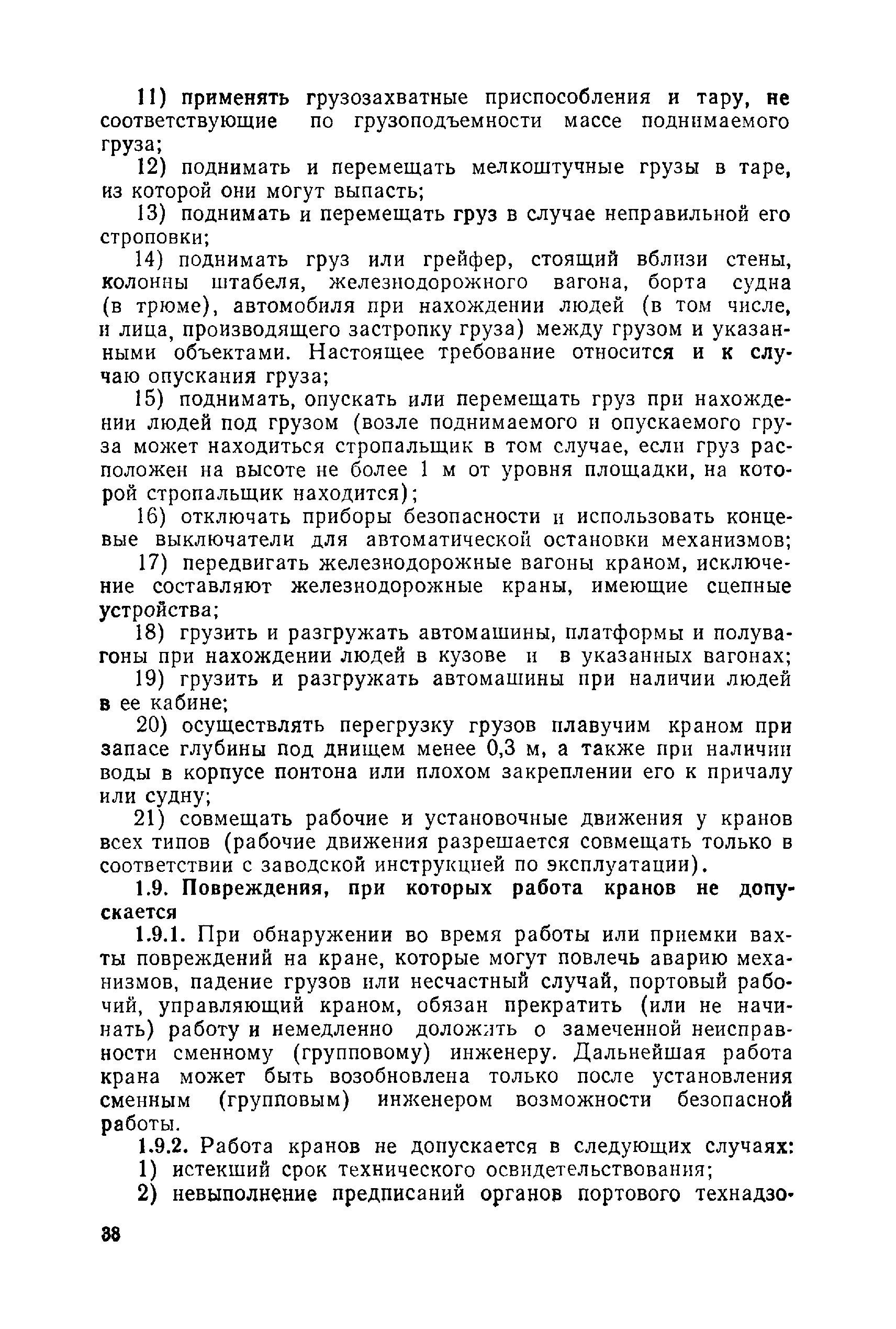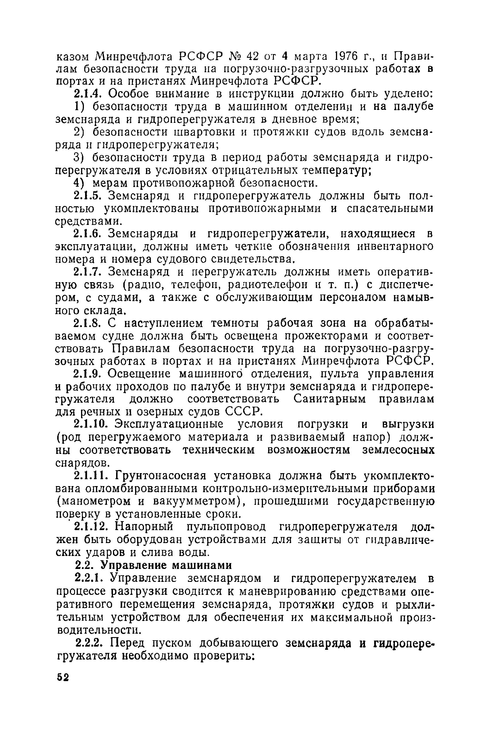 Правила технической эксплуатации перегрузочных машин речных портов| Статус: | взамен | | Название рус.: | Правила технической эксплуатации перегрузочных машин речных портов | | Дата добавления в базу: | 05.05.2017 | | Дата актуализации: | 01.01.2021 | | Дата введения: | 01.01.1984 | | Область применения: | Правила технической эксплуатации перегрузочных машин регламентируют управление машинами, технический надзор, техническое обслуживание и плановый ремонт перегрузочных машин. | | Оглавление: | Введение Часть первая. Организация технической эксплуатации перегрузочных машин 1. Область применения ПТЭ 2. Управление перегрузочными машинами 3. Техническое обслуживание перегрузочных машин 3.1. Виды и содержание технического обслуживания 3.2. Организация технического обслуживания 4. Технический надзор за перегрузочными машинами 4.1. Регистрация машин 4.2. Виды и организация технического надзора 4.3. Технические освидетельствования 4.4. Навигационные осмотры 4.5. Оперативные осмотры 5. Ремонт перегрузочных машин 6. Техническая документация 7. Порядок расследования аварий и несчастных случаев Часть вторая. Техническое обслуживание механического оборудования перегрузочных машин и технический надзор за ним 1. Краны 1.1. Общие правила работы кранов 1.2 Спаренная работа кранов 1.3. Особенности работы железнодорожных, гусеничных, пневмоколесных и автомобильных кранов 1.4. Особенности работы кранов с грейфером 1.5. Особенности работы кранов с грузоподъемным электромагнитом 1.6. Работа кранов при ветре и низкой температуре окружающей среды 1.7. Порядок ухода портовых рабочих-крановщиков с крана 1.8. Запрещенные приемы работы 1.9. Повреждения, при которых работа кранов не допускается 1.10. Техническое обслуживание при использовании (ТО-1) 1.11. Периодическое техническое обслуживание (ТО-2) 1.12. Технические освидетельствования береговых кранов 1.13. Технические освидетельствования плавучих кранов 2. Добывающие землесосные снаряды и гидроперегружатели 2.1. Общие правила работы машин 2.2. Управление машинами 2.3. Техническое обслуживание при использовании (ТО-1) 2.4. Периодическое техническое обслуживание (ТО-2) 2.5. Технические освидетельствования 3. Добывающие многочерпаковые снаряды 3.1. Общие правила работы машин 3.2. Управление машинами 3.3. Техническое обслуживание при использовании (ТО-1) 3.4. Периодическое техническое обслуживание (ТО-2) 3.5. Технические освидетельствования 4. Машины внутрипортового безрельсового транспорта 4.1. Общие правила работы машин 4.2. Правила работы погрузчиков 4.3 Правила работы тягачей, прицепов (трейлеров) и аккумуляторных тележек 4.4. Правила работы зачистных машин 4.5. Повреждения, при которых работа машин не допускается 4.6. Техническое обслуживание при использовании (ТО-1) 4.7. Периодическое техническое обслуживание (ТО-2) 4.8. Технические освидетельствования 5. Машины непрерывного транспорта 5.1. Общие правила работы машин 5.2. Повреждения, при которых работа машин не допускается 5.3. Техническое обслуживание при использовании (ТО-1) 5.4. Периодическое техническое обслуживание (ТО-2) 5.5. Технические освидетельствования 6. Двигатели внутреннего сгорания 7. Сменные грузозахватные органы, съемные грузозахватные приспособления и тара Часть третья. Техническое обслуживание электрооборудования перегрузочных машин и технический надзор за мим 1. Общие требования по эксплуатации в те