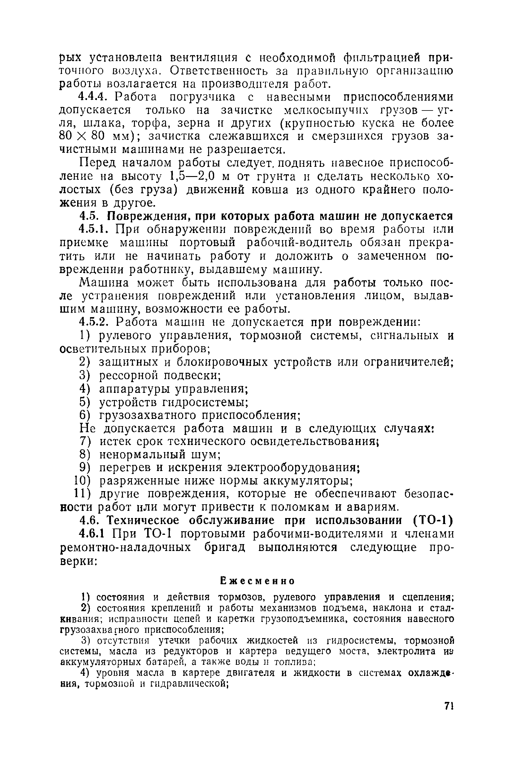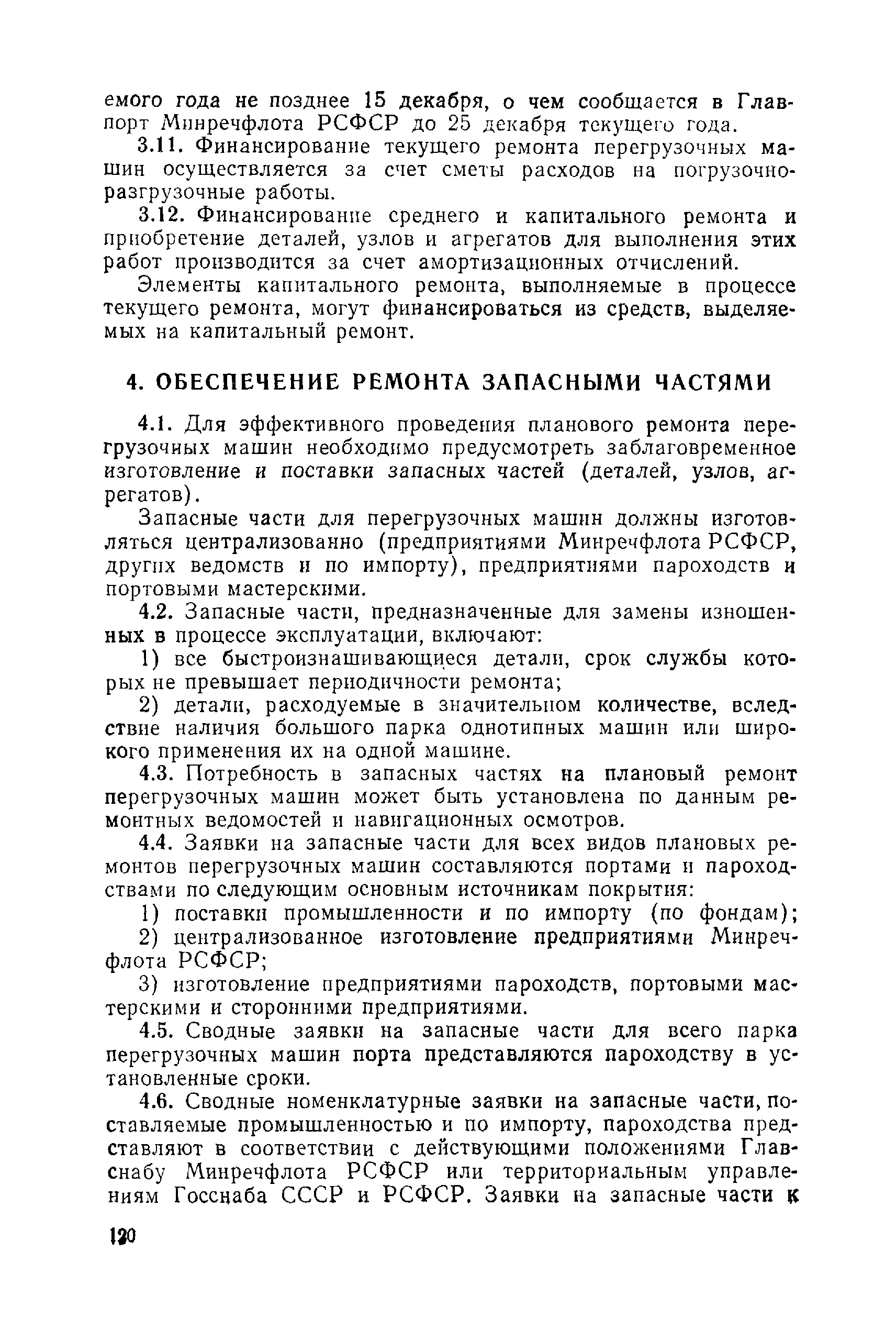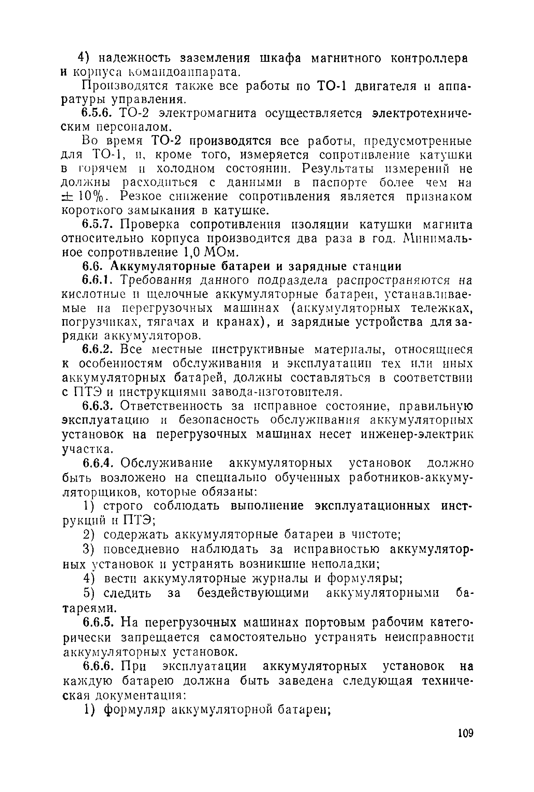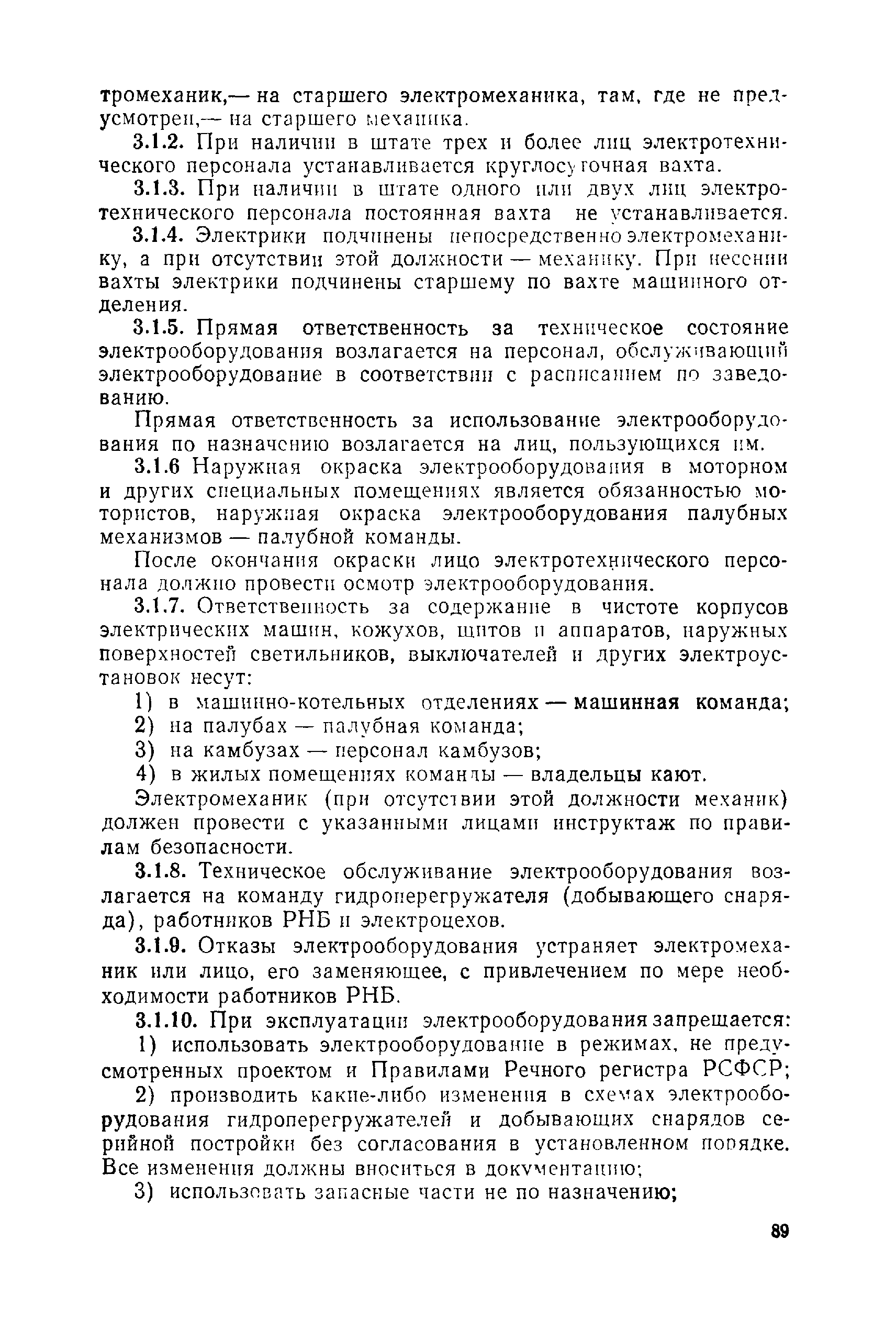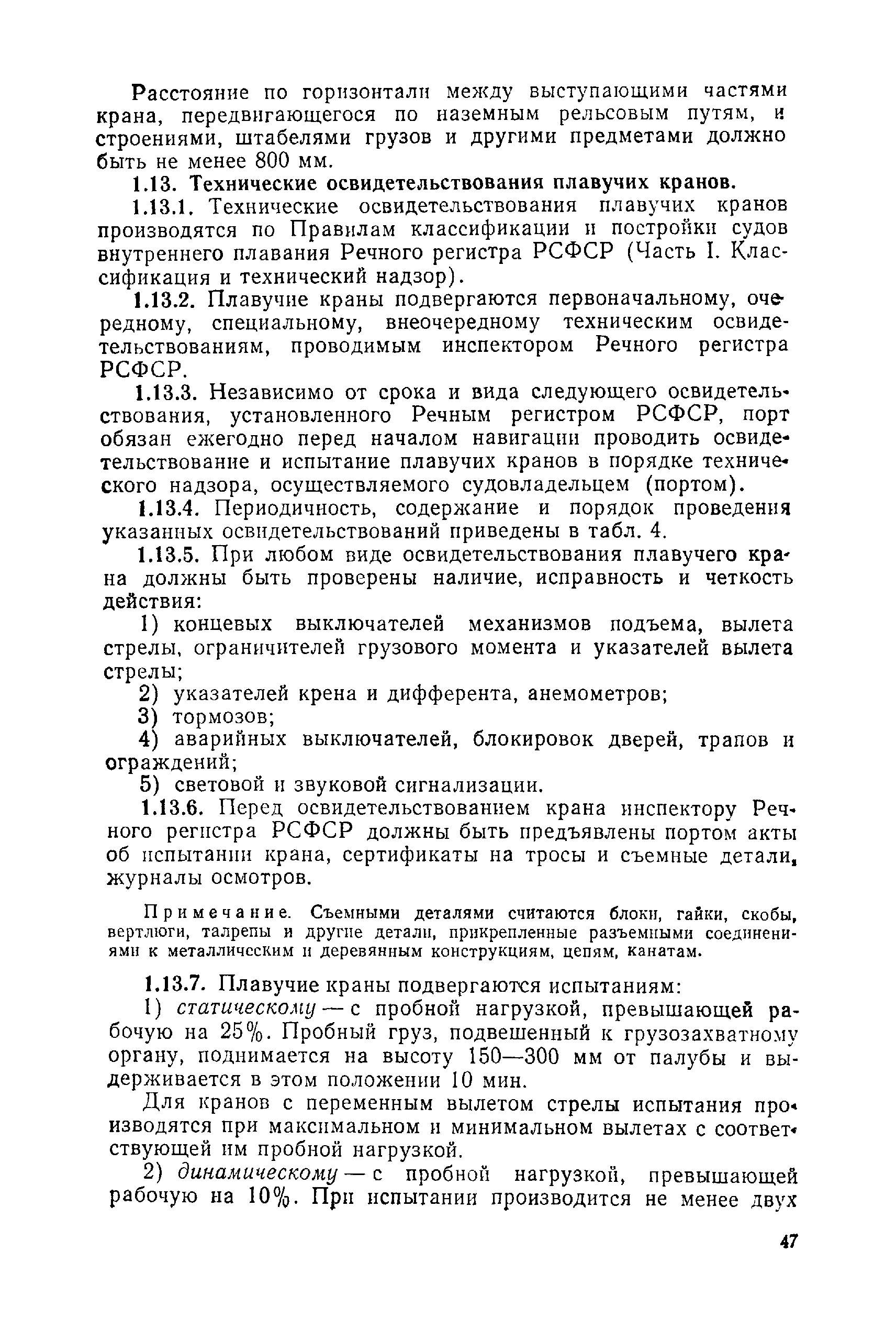 Правила технической эксплуатации перегрузочных машин речных портов| Статус: | взамен | | Название рус.: | Правила технической эксплуатации перегрузочных машин речных портов | | Дата добавления в базу: | 05.05.2017 | | Дата актуализации: | 01.01.2021 | | Дата введения: | 01.01.1984 | | Область применения: | Правила технической эксплуатации перегрузочных машин регламентируют управление машинами, технический надзор, техническое обслуживание и плановый ремонт перегрузочных машин. | | Оглавление: | Введение Часть первая. Организация технической эксплуатации перегрузочных машин 1. Область применения ПТЭ 2. Управление перегрузочными машинами 3. Техническое обслуживание перегрузочных машин 3.1. Виды и содержание технического обслуживания 3.2. Организация технического обслуживания 4. Технический надзор за перегрузочными машинами 4.1. Регистрация машин 4.2. Виды и организация технического надзора 4.3. Технические освидетельствования 4.4. Навигационные осмотры 4.5. Оперативные осмотры 5. Ремонт перегрузочных машин 6. Техническая документация 7. Порядок расследования аварий и несчастных случаев Часть вторая. Техническое обслуживание механического оборудования перегрузочных машин и технический надзор за ним 1. Краны 1.1. Общие правила работы кранов 1.2 Спаренная работа кранов 1.3. Особенности работы железнодорожных, гусеничных, пневмоколесных и автомобильных кранов 1.4. Особенности работы кранов с грейфером 1.5. Особенности работы кранов с грузоподъемным электромагнитом 1.6. Работа кранов при ветре и низкой температуре окружающей среды 1.7. Порядок ухода портовых рабочих-крановщиков с крана 1.8. Запрещенные приемы работы 1.9. Повреждения, при которых работа кранов не допускается 1.10. Техническое обслуживание при использовании (ТО-1) 1.11. Периодическое техническое обслуживание (ТО-2) 1.12. Технические освидетельствования береговых кранов 1.13. Технические освидетельствования плавучих кранов 2. Добывающие землесосные снаряды и гидроперегружатели 2.1. Общие правила работы машин 2.2. Управление машинами 2.3. Техническое обслуживание при использовании (ТО-1) 2.4. Периодическое техническое обслуживание (ТО-2) 2.5. Технические освидетельствования 3. Добывающие многочерпаковые снаряды 3.1. Общие правила работы машин 3.2. Управление машинами 3.3. Техническое обслуживание при использовании (ТО-1) 3.4. Периодическое техническое обслуживание (ТО-2) 3.5. Технические освидетельствования 4. Машины внутрипортового безрельсового транспорта 4.1. Общие правила работы машин 4.2. Правила работы погрузчиков 4.3 Правила работы тягачей, прицепов (трейлеров) и аккумуляторных тележек 4.4. Правила работы зачистных машин 4.5. Повреждения, при которых работа машин не допускается 4.6. Техническое обслуживание при использовании (ТО-1) 4.7. Периодическое техническое обслуживание (ТО-2) 4.8. Технические освидетельствования 5. Машины непрерывного транспорта 5.1. Общие правила работы машин 5.2. Повреждения, при которых работа машин не допускается 5.3. Техническое обслуживание при использовании (ТО-1) 5.4. Периодическое техническое обслуживание (ТО-2) 5.5. Технические освидетельствования 6. Двигатели внутреннего сгорания 7. Сменные грузозахватные органы, съемные грузозахватные приспособления и тара Часть третья. Техническое обслуживание электрооборудования перегрузочных машин и технический надзор за мим 1. Общие требования по эксплуатации в те