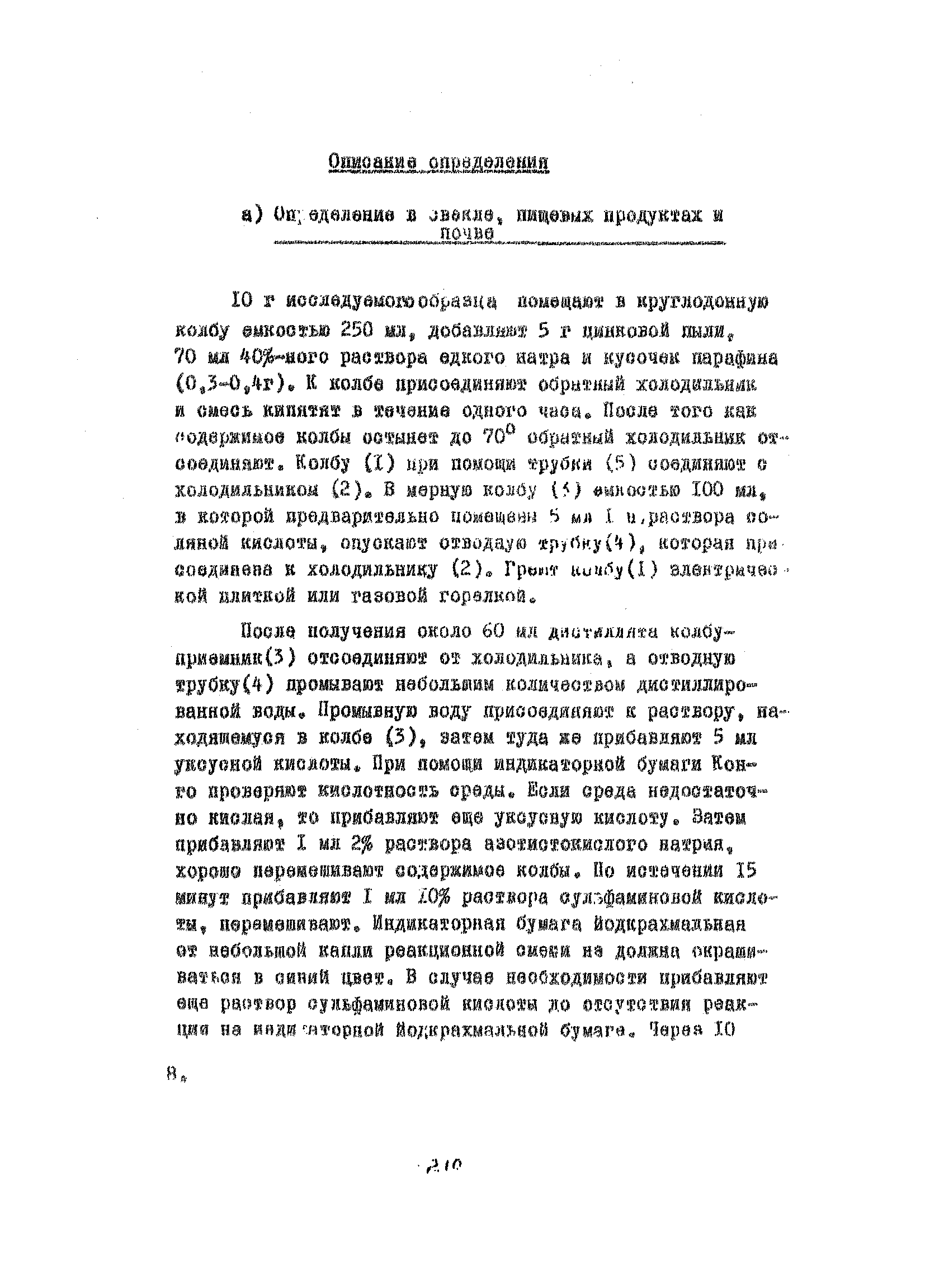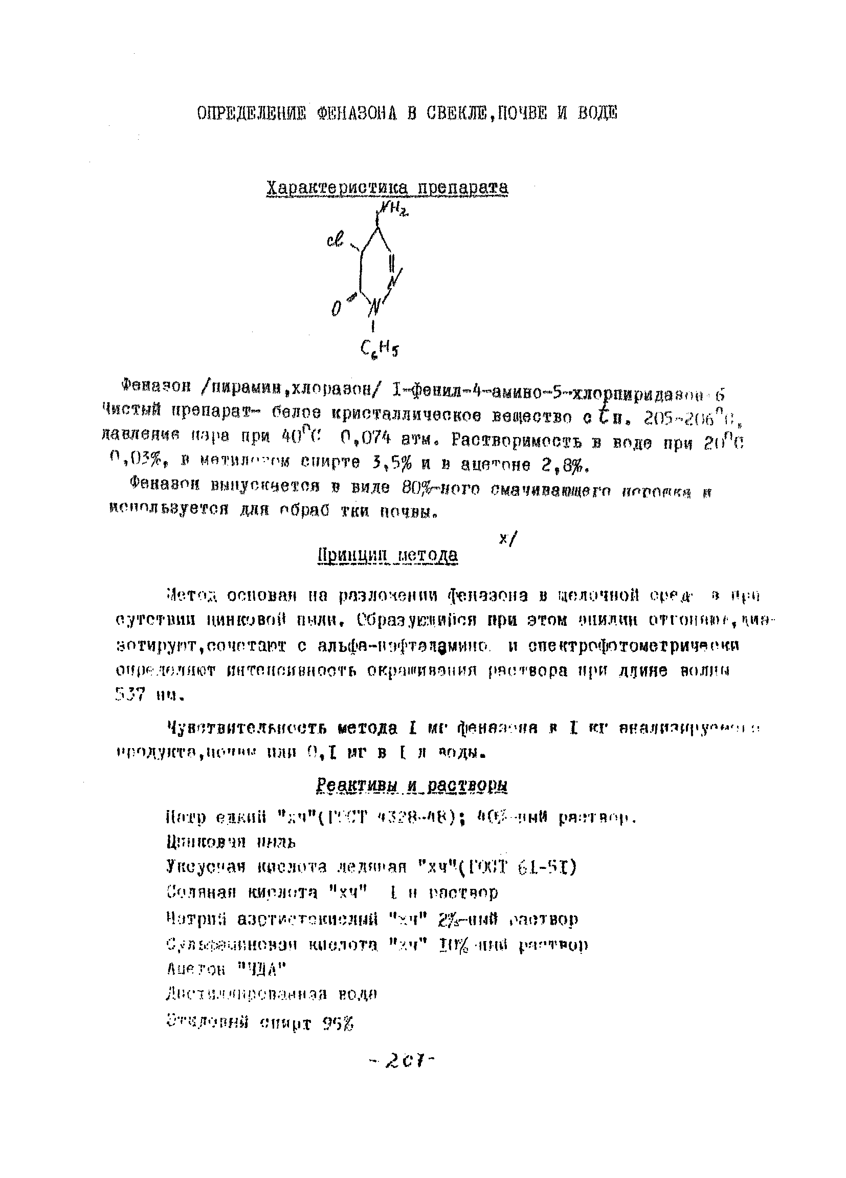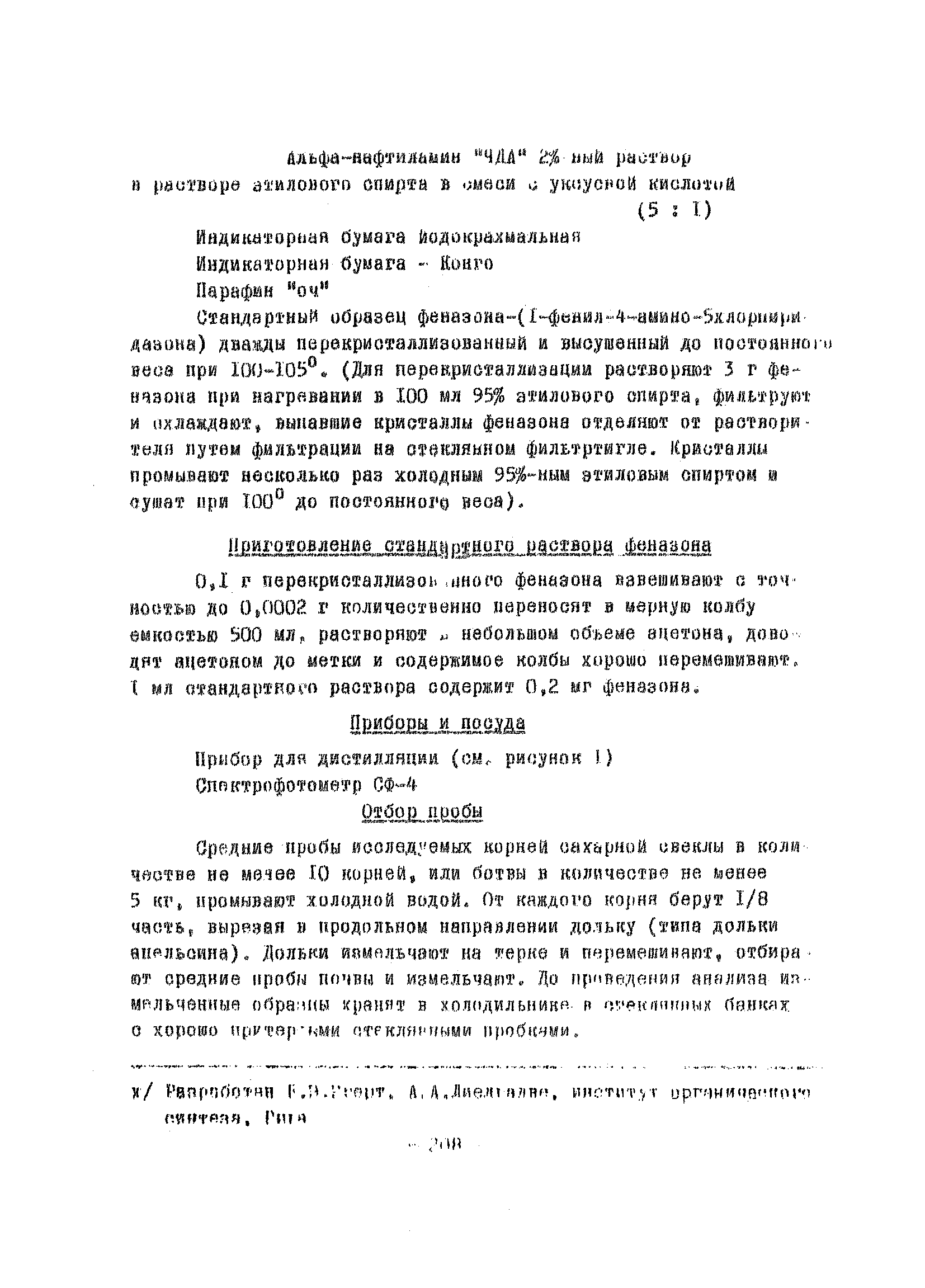 Определение феназона в свекле, почве и воде| Статус: | справочные материалы, мп, тпр | | Название рус.: | Определение феназона в свекле, почве и воде | | Дата добавления в базу: | 05.05.2017 | | Дата актуализации: | 01.01.2021 | | Область применения: | Метод основан на разложении феназона в щелочной среде в присутствии цинковой пыли | | Оглавление: | Характеристика препарата Принцип метода Реактивы и растворы Приготовление стандартного раствора феназона Приборы и посуда Отбор пробы Описание определения Построение калибровочной кривой | | Разработан: | Институт органического синтеза