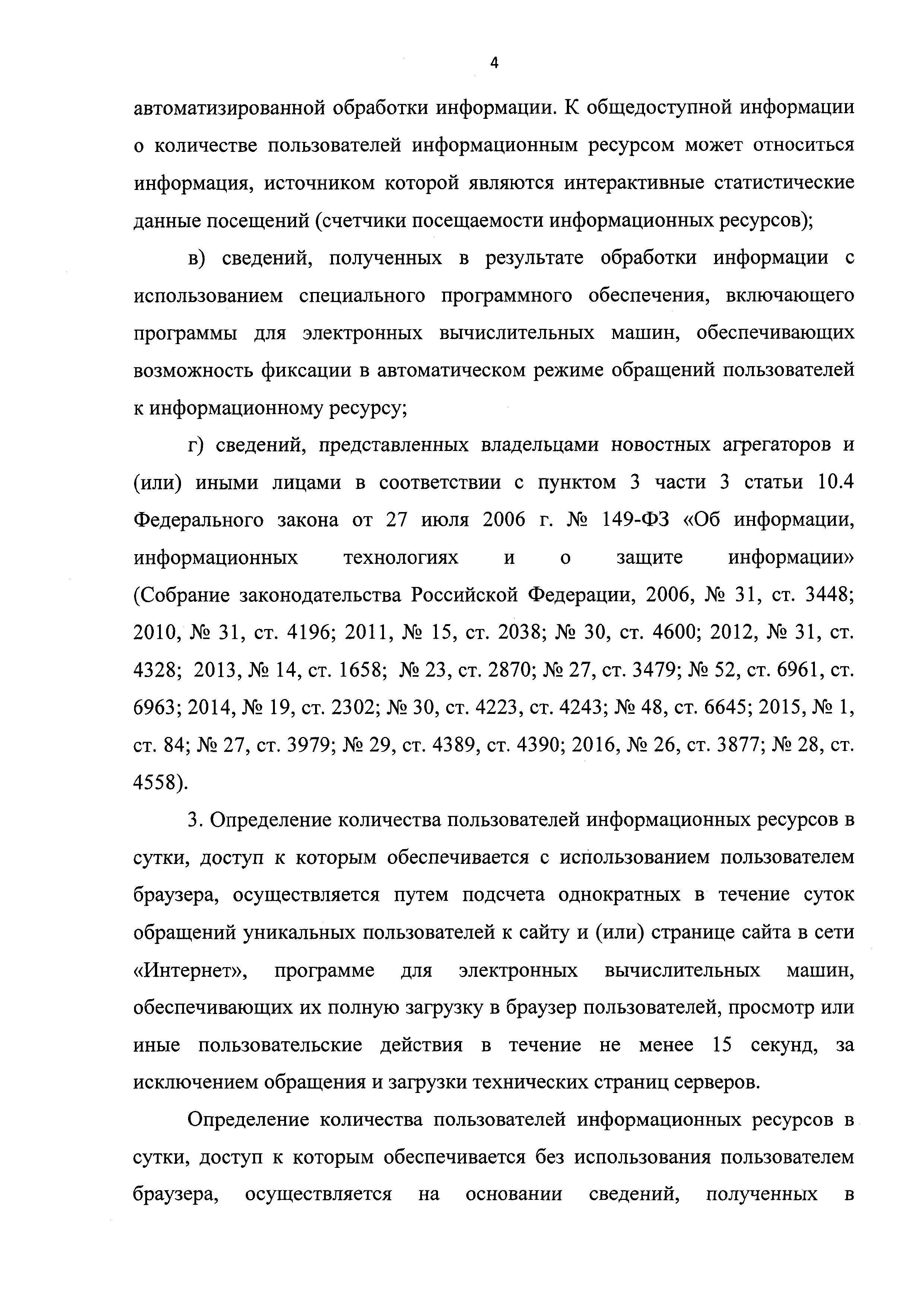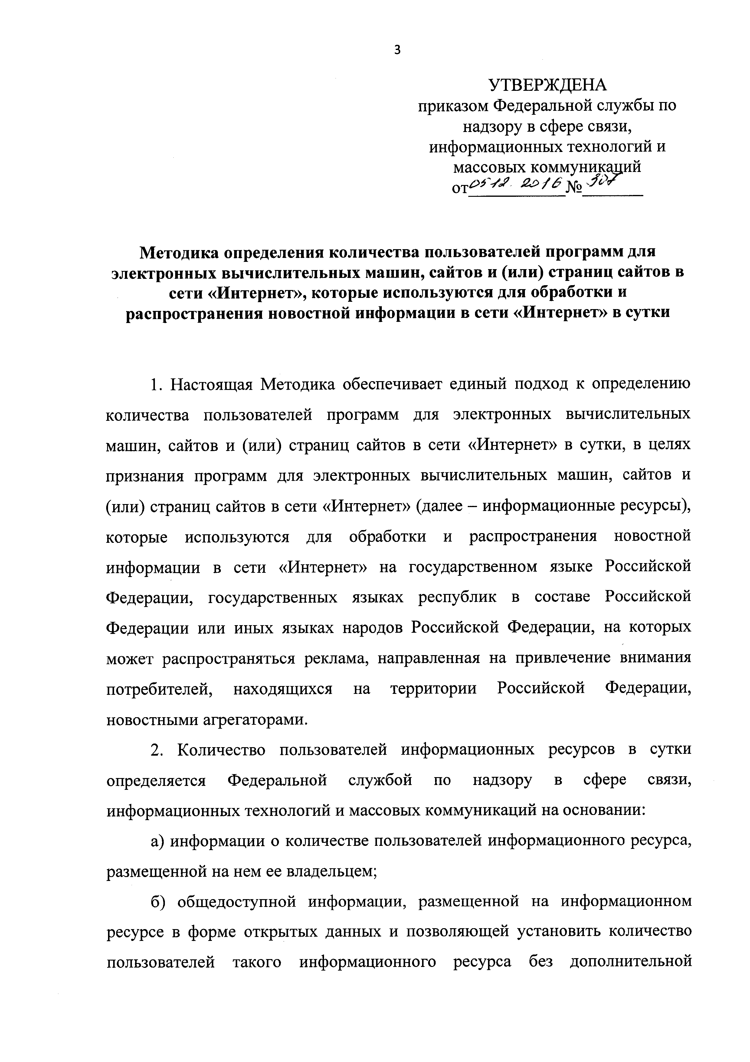 Методика определения количества пользователей программ для электронных вычислительных машин, сайтов и (или) страниц сайтов в сети "Интернет", которые используются для обработки и распространения новостной информации в сети "Интернет" в сутки| Статус: | действует | | Название рус.: | Методика определения количества пользователей программ для электронных вычислительных машин, сайтов и (или) страниц сайтов в сети "Интернет", которые используются для обработки и распространения новостной информации в сети "Интернет" в сутки | | Дата добавления в базу: | 05.05.2017 | | Дата актуализации: | 01.01.2021 | | Дата введения: | 11.02.2017 | | Область применения: | Методика обеспечивает единый подход к определению количества пользователей программ для электронных вычислительных машин, сайтов и (или) страниц сайтов в сети "Интернет" в сутки, в целях признания программ для электронных вычислительных машин, сайтов и (или) страниц сайтов в сети "Интернет", которые используются для обработки и распространения новостной информации в сети "Интернет" на государственном языке Российской Федерации, государственных языках республик в составе Российской Федерации или иных языках народов Российской Федерации, на которых может распространяться реклама, направленная на привлечение внимания потребителей, находящихся на территории Российской Федерации, новостными агрегаторами | | Утверждён: | 05.12.2016 Федеральная служба по надзору в сфере связи, информационных технологий и массовых коммуникаций (307)