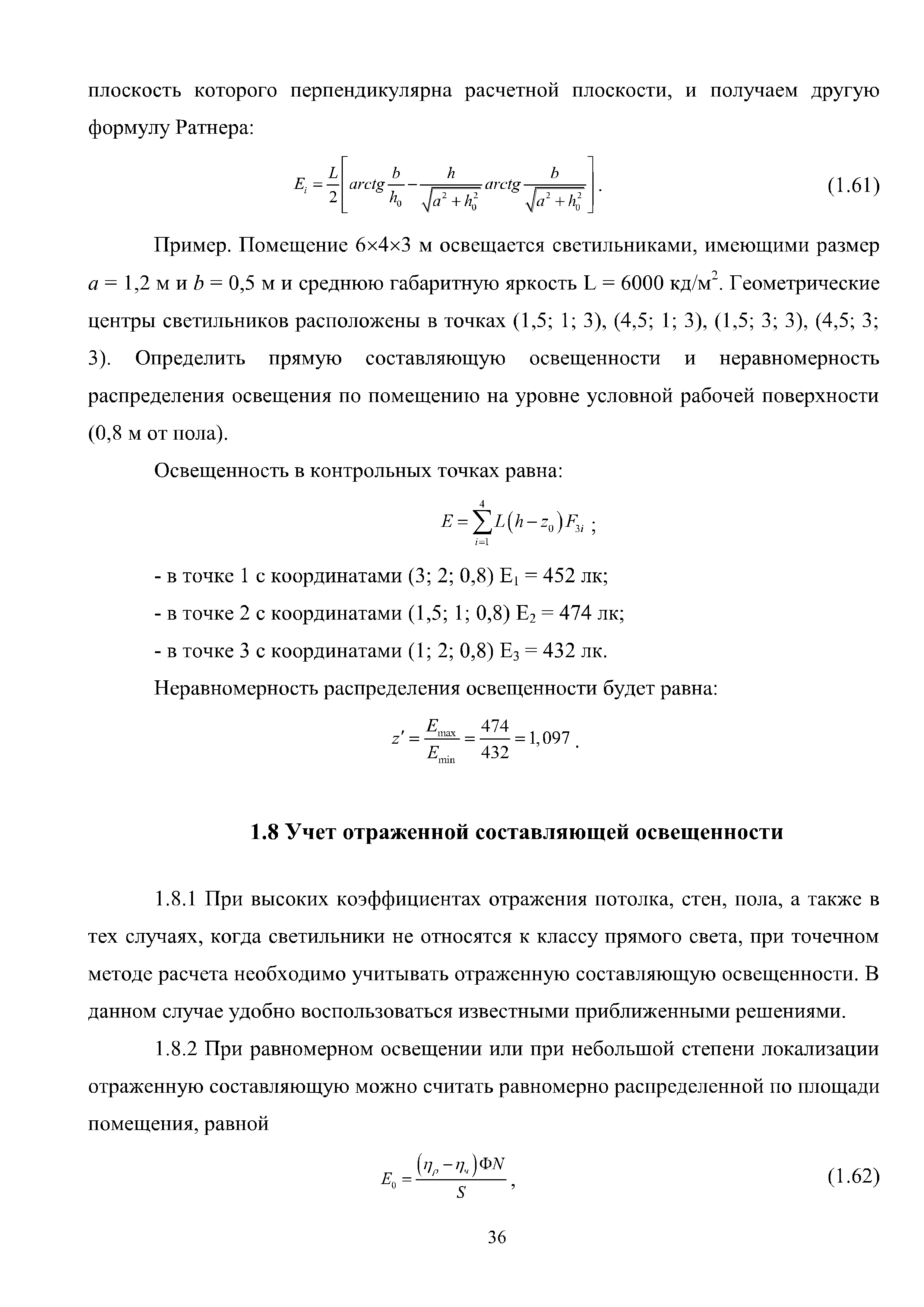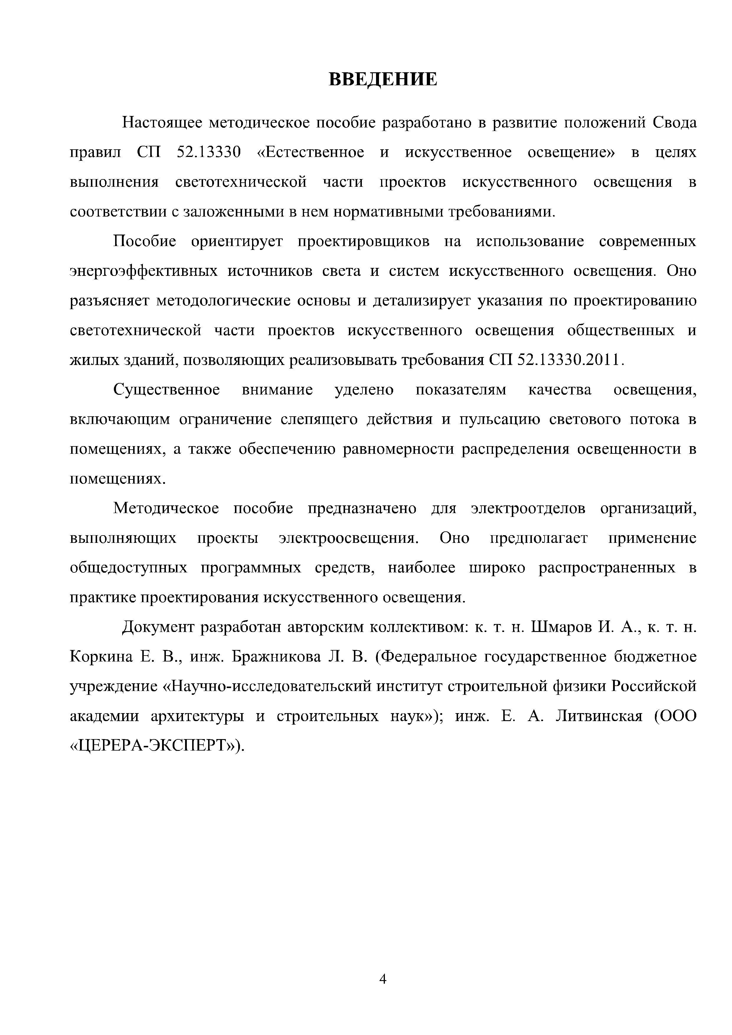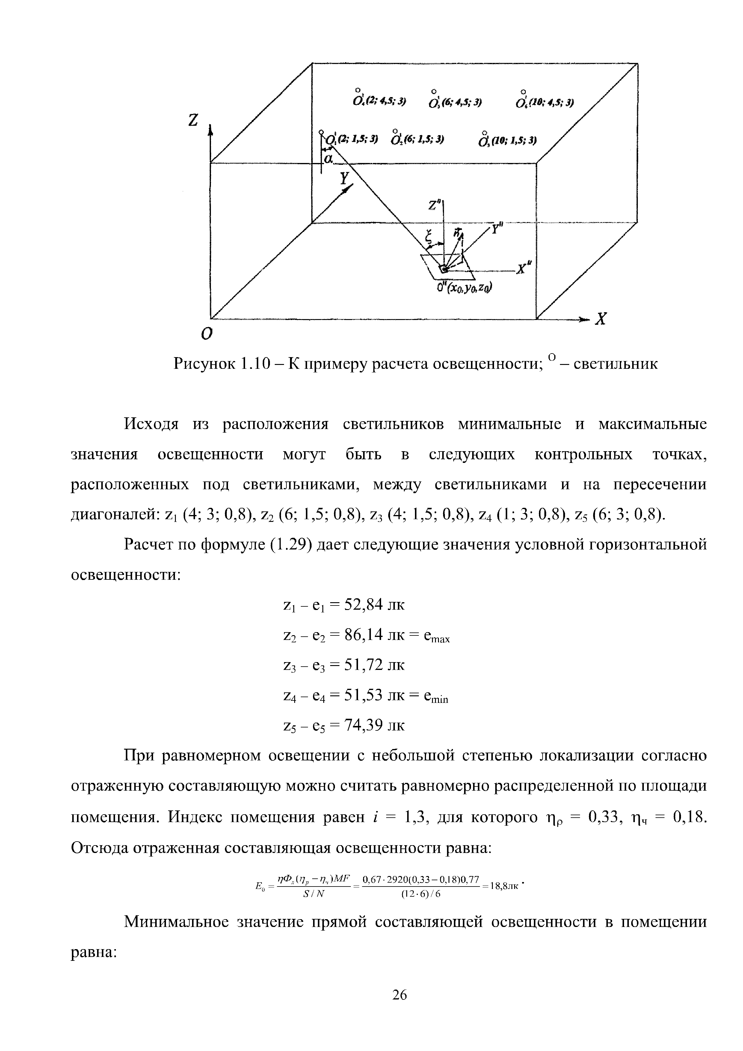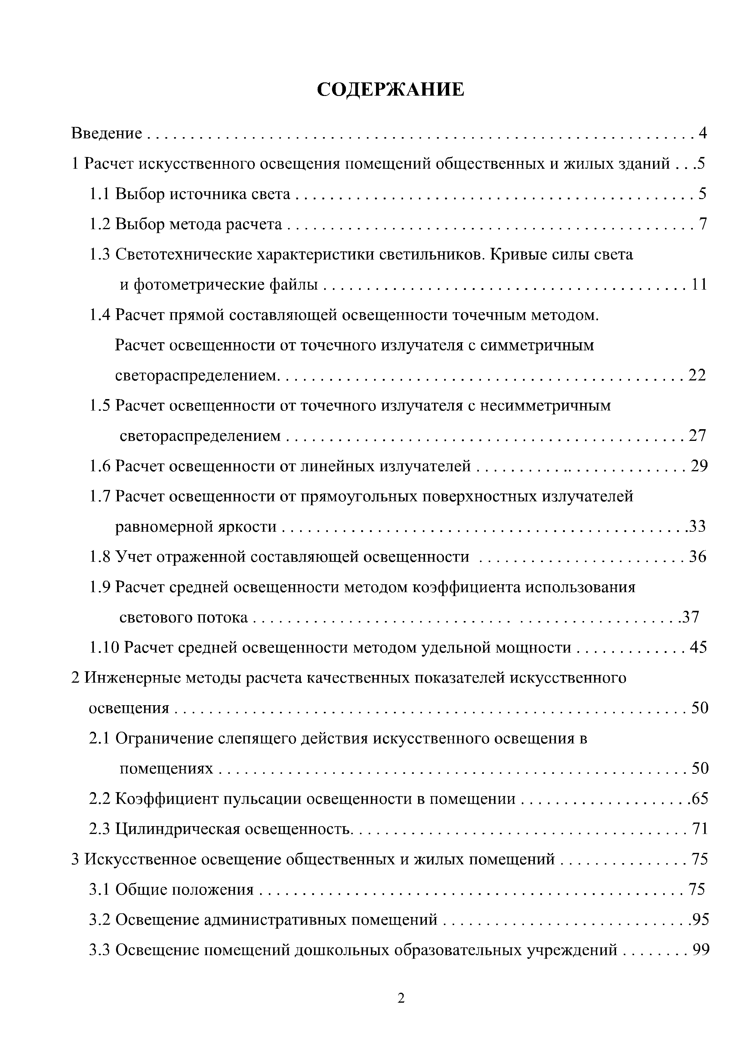 | Оглавление: | Введение 1 Расчет искусственного освещения помещений общественных и жилых зданий 1.1 Выбор источника света 1.2 Выбор метода расчета 1.3 Светотехнические характеристики светильников. Кривые силы света и фотометрические файлы 1.4 Расчет прямой составляющей освещенности точечным методом. Расчет освещенности от точечного излучателя с симметричным светораспределением 1.5 Расчет освещенности от точечного излучателя с несимметричным светораспределением 1.6 Расчет освещенности от линейных излучателей 1.7 Расчет освещенности от прямоугольных поверхностных излучателей равномерной яркости 1.8 Учет отраженной составляющей освещенности 1.9 Расчет средней освещенности методом коэффициента использования светового потока 1.10 Расчет средней освещенности методом удельной мощности 2 Инженерные методы расчета качественных показателей искусственного светового потока 2.1 Ограничение слепящего действия искусственного освещения в помещениях 2.2 Коэффициент пульсации освещенности в помещении 2.3 Цилиндрическая освещенность 3 Искусственное освещение общественных и жилых помещений 3.1 Общие положения 3.2 Освещение административных помещений 3.3 Освещение помещений дошкольных образовательных учреждений 3.4 Освещение помещений общеобразовательных школ и высших учебных заведений 3.5 Освещение помещений лечебно-профилактических учреждений 3.6 Освещение помещений предприятий торговли 3.7 Освещение помещений предприятий общественного питания 3.8 Освещение помещений предприятий бытового обслуживания 3.9 Освещение гостиничных помещений 4 Искусственное освещение помещений жилых зданий Приложение А Основные понятия, термины и определения Приложение Б Пример расчета объединенного показателя дискомфорта Приложение В Программные средства для расчета искусственного освещения помещений жилых и общественных зданий Список использованной литературы Заключение |