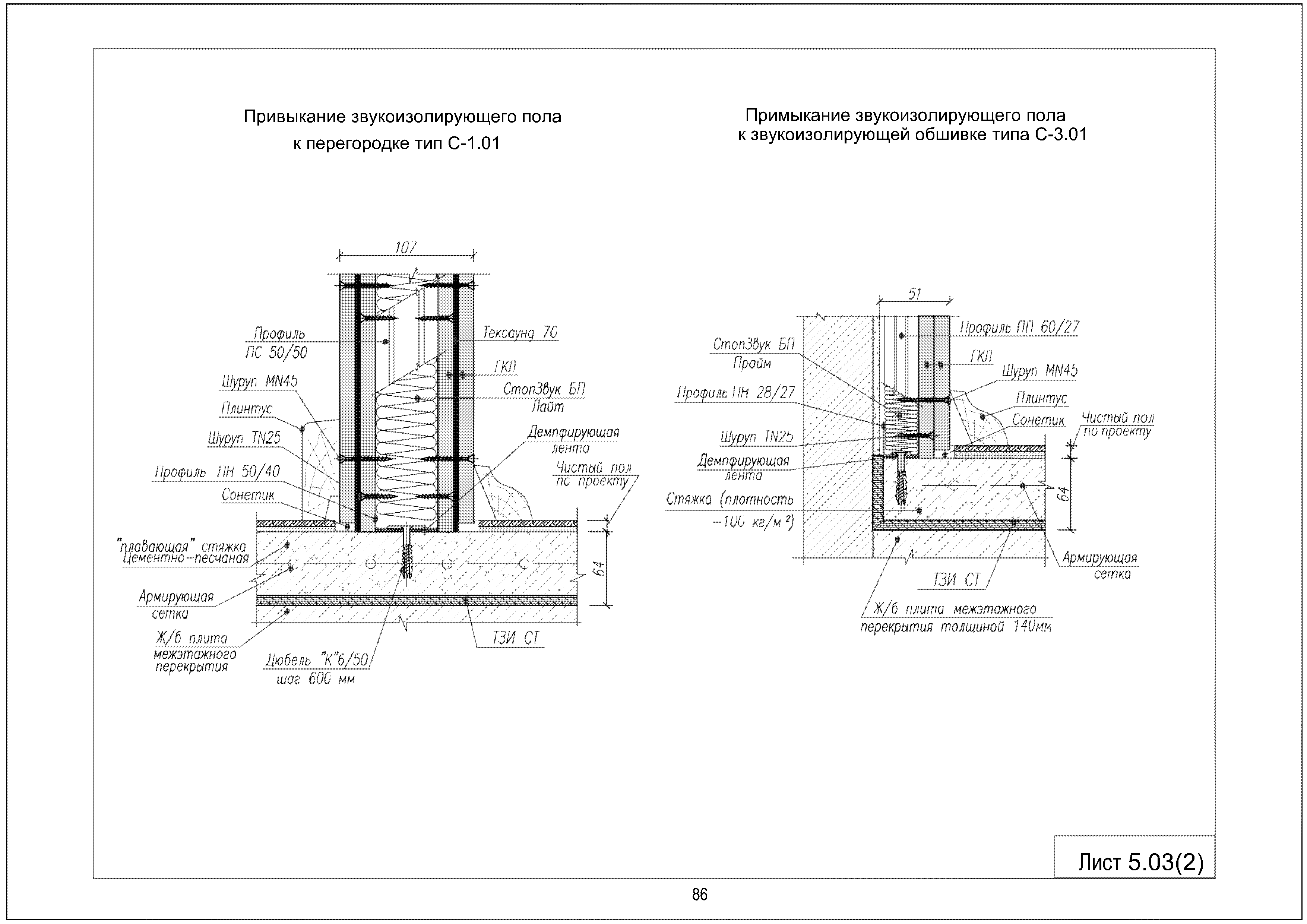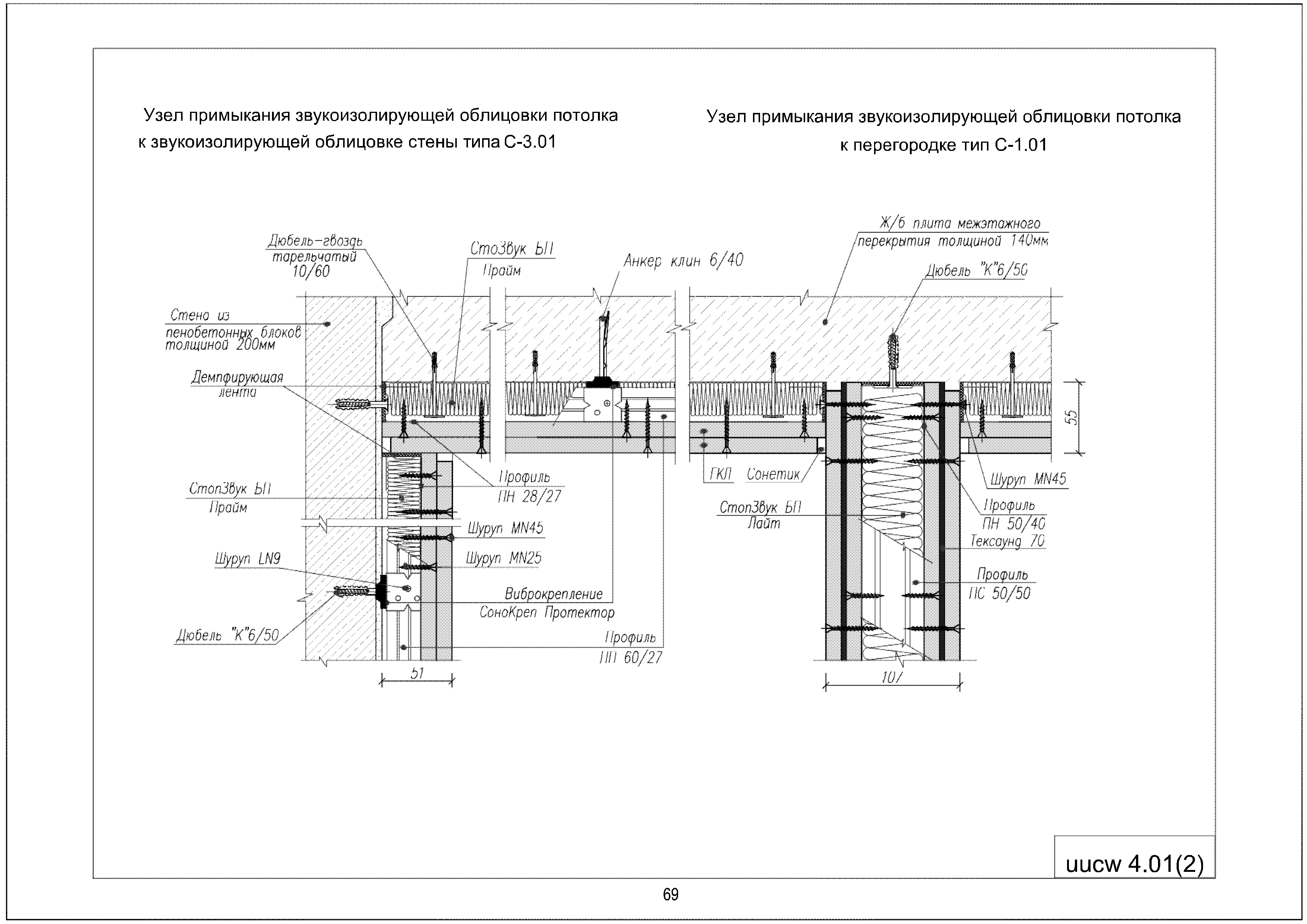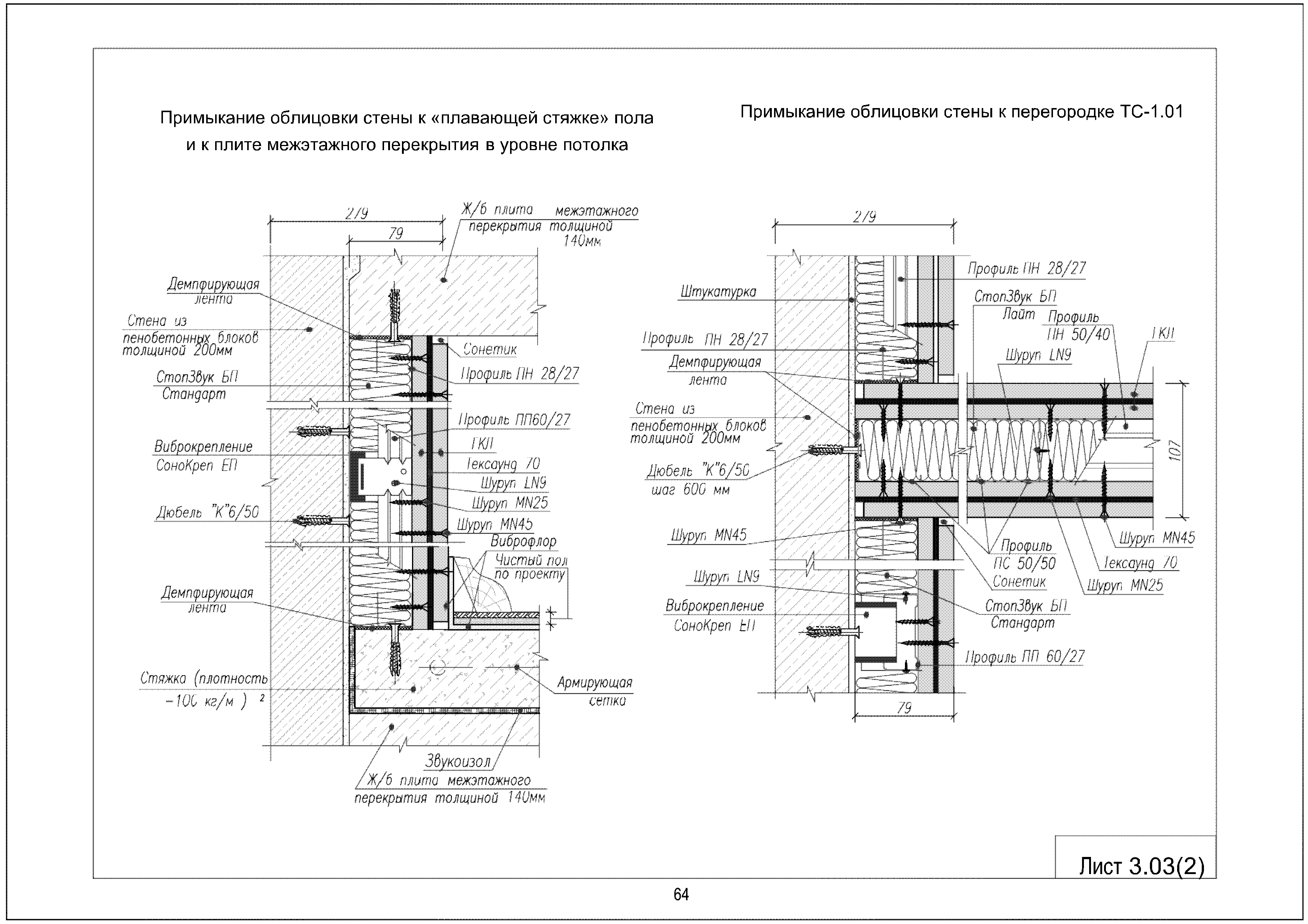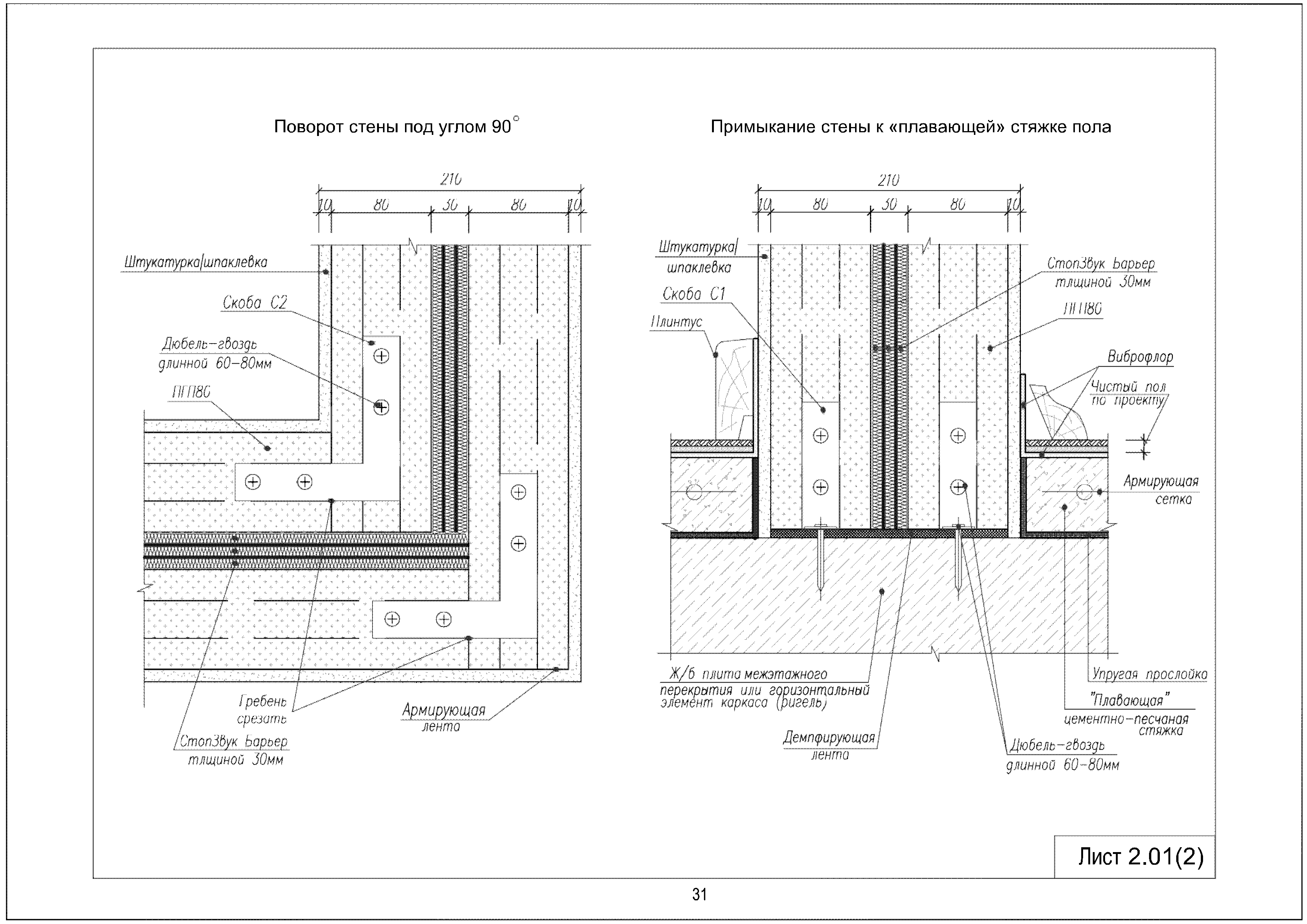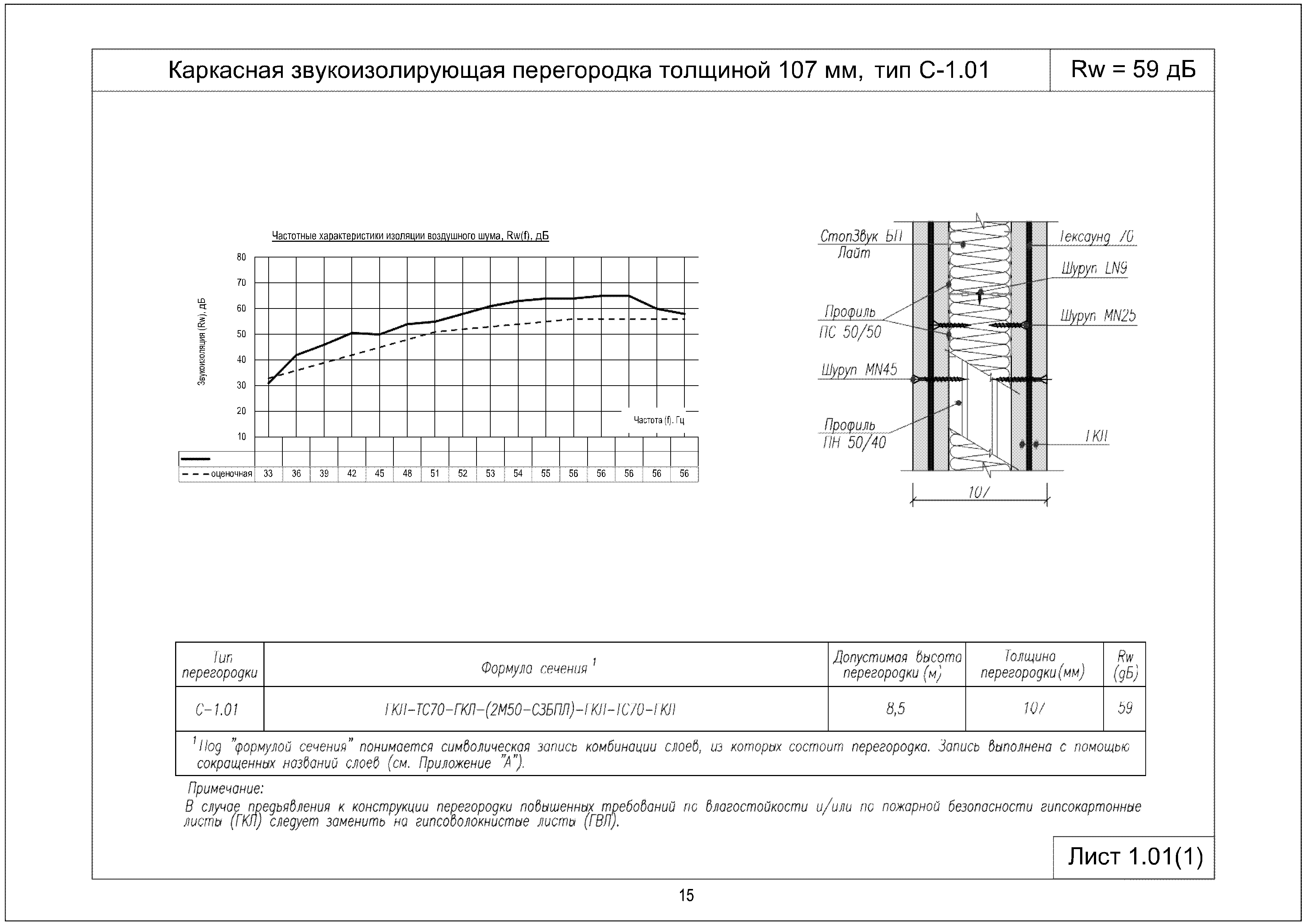 | Оглавление: | Введение Область применения Раздел 1. Общие положения. Нормативы и методики Общие положения Нормативы и методики Перечень схем ограждающих конструкций и помещений для возможного применения Раздел 2. Звукоизолирующие каркасные перегородки Перегородки на одинарном каркасе Перегородки на двойном каркасе Перегородки на специальном каркасе Раздел 3. Бескаркасные перегородки и межквартирные стены Звукоизолирующие межквартирные стены с облицовкой Звукоизолирующие перегородки и межквартирные стены без облицовки Раздел 4. Звукоизолирующие обшивки стен Раздел 5. Звукоизолирующие обшивки потолков Раздел 6. Звукоизолирующие конструкции полов Приложение А. Перечень акустических материалов и конструктивных элементов Приложение Б. Нормативные данные (выписка из СП 51.13330.2011 "СНиП 23-03-2003 "Защита от шума") Приложение В. Методика расчета звукоизоляции внутренних ограждающих конструкций жилых и общественных зданий |