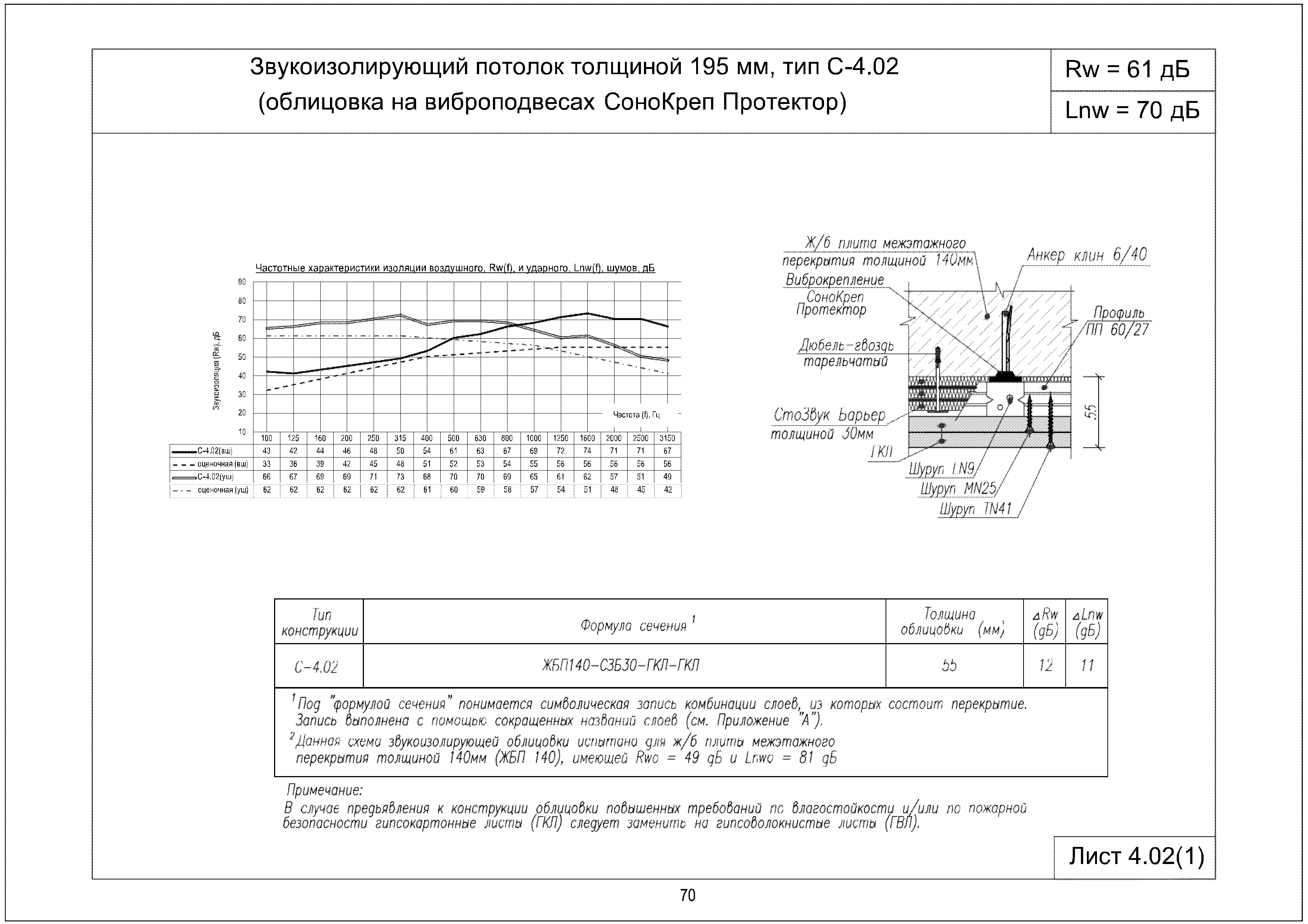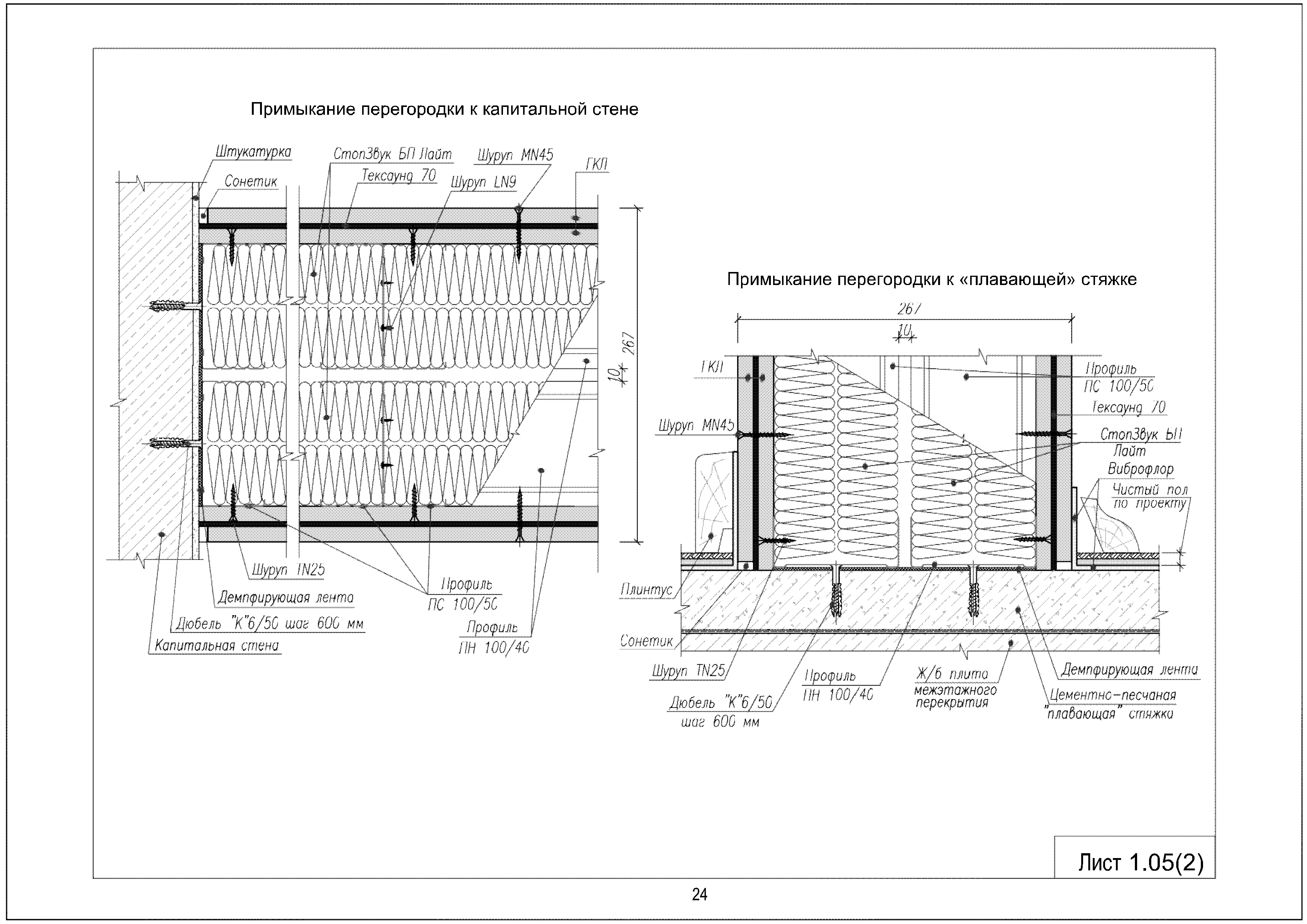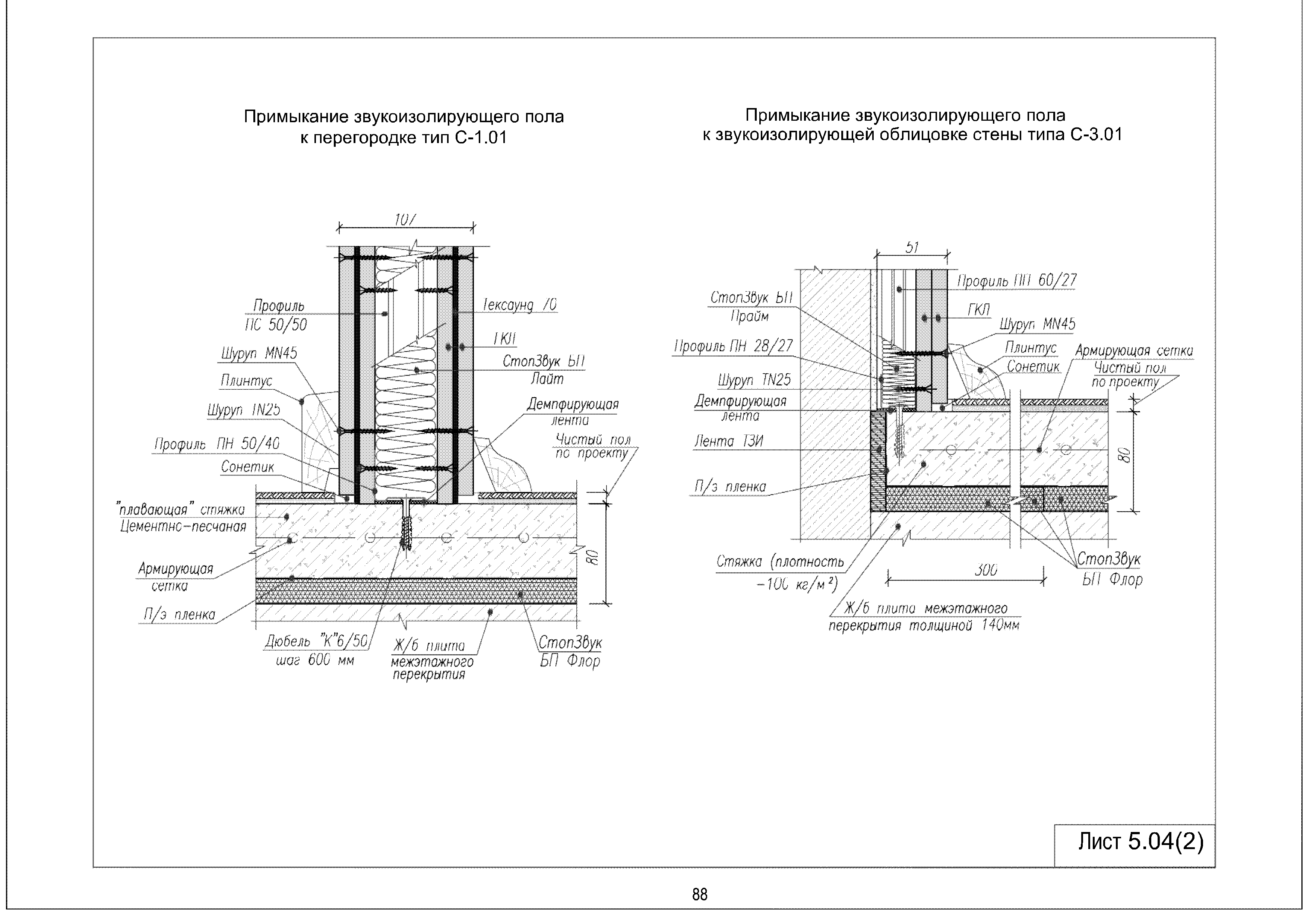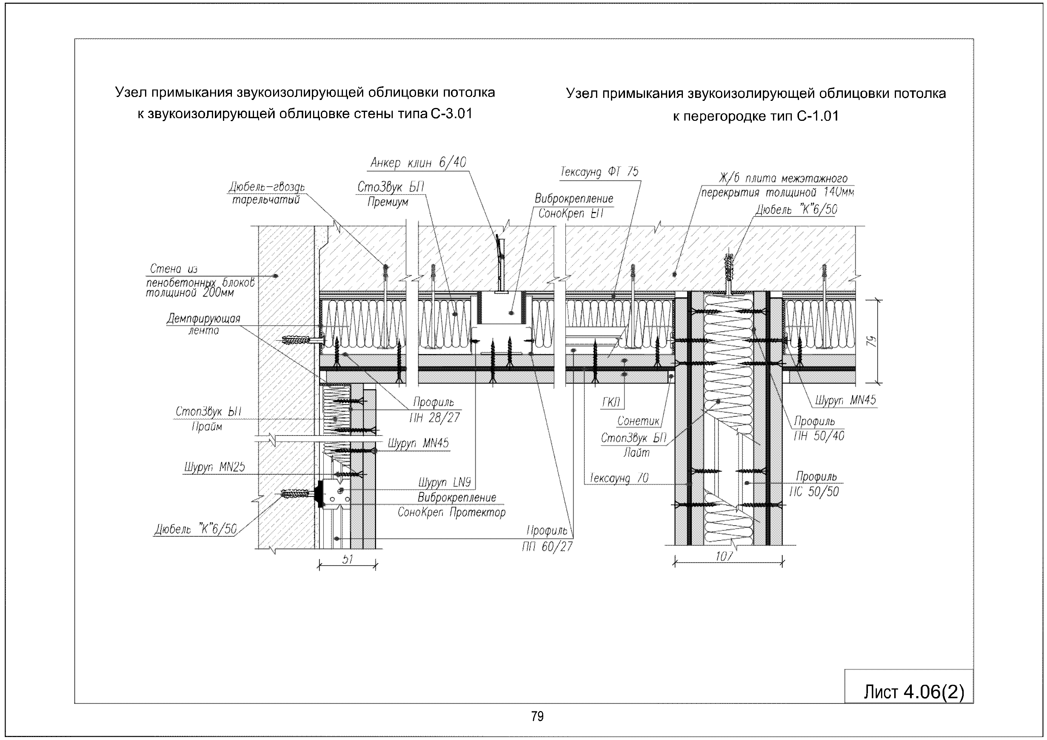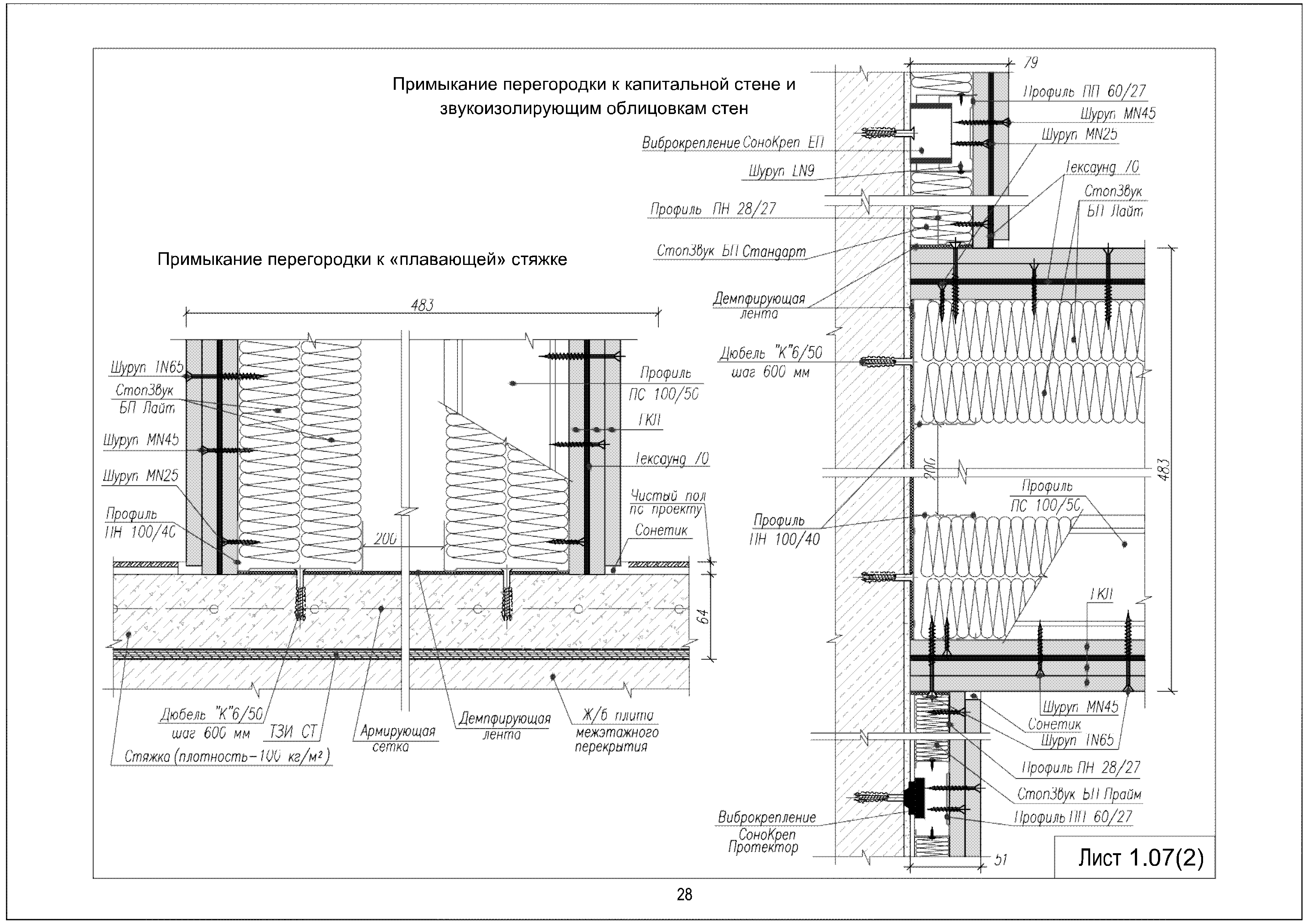 | Оглавление: | Введение Область применения Раздел 1. Общие положения. Нормативы и методики Общие положения Нормативы и методики Перечень схем ограждающих конструкций и помещений для возможного применения Раздел 2. Звукоизолирующие каркасные перегородки Перегородки на одинарном каркасе Перегородки на двойном каркасе Перегородки на специальном каркасе Раздел 3. Бескаркасные перегородки и межквартирные стены Звукоизолирующие межквартирные стены с облицовкой Звукоизолирующие перегородки и межквартирные стены без облицовки Раздел 4. Звукоизолирующие обшивки стен Раздел 5. Звукоизолирующие обшивки потолков Раздел 6. Звукоизолирующие конструкции полов Приложение А. Перечень акустических материалов и конструктивных элементов Приложение Б. Нормативные данные (выписка из СП 51.13330.2011 "СНиП 23-03-2003 "Защита от шума") Приложение В. Методика расчета звукоизоляции внутренних ограждающих конструкций жилых и общественных зданий |
