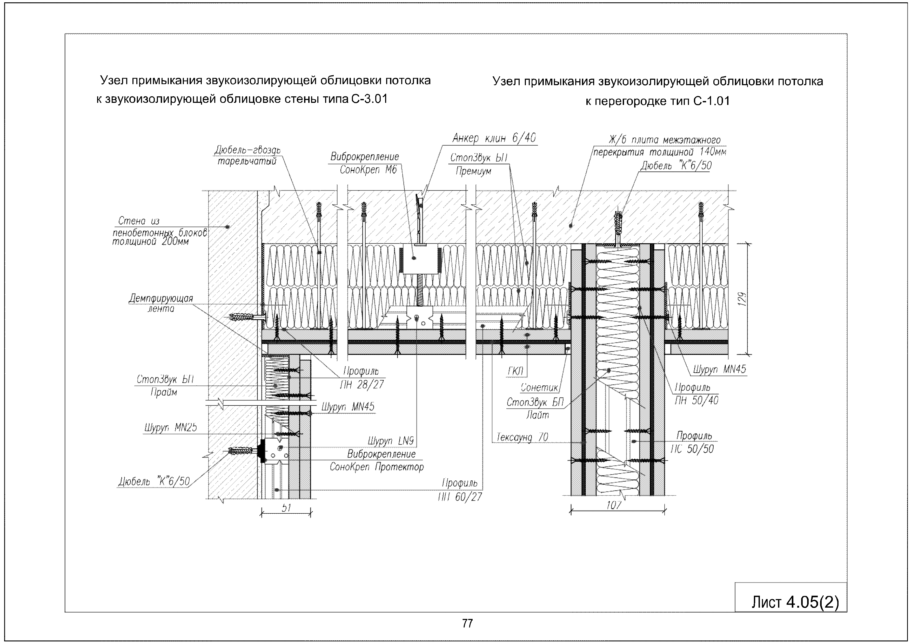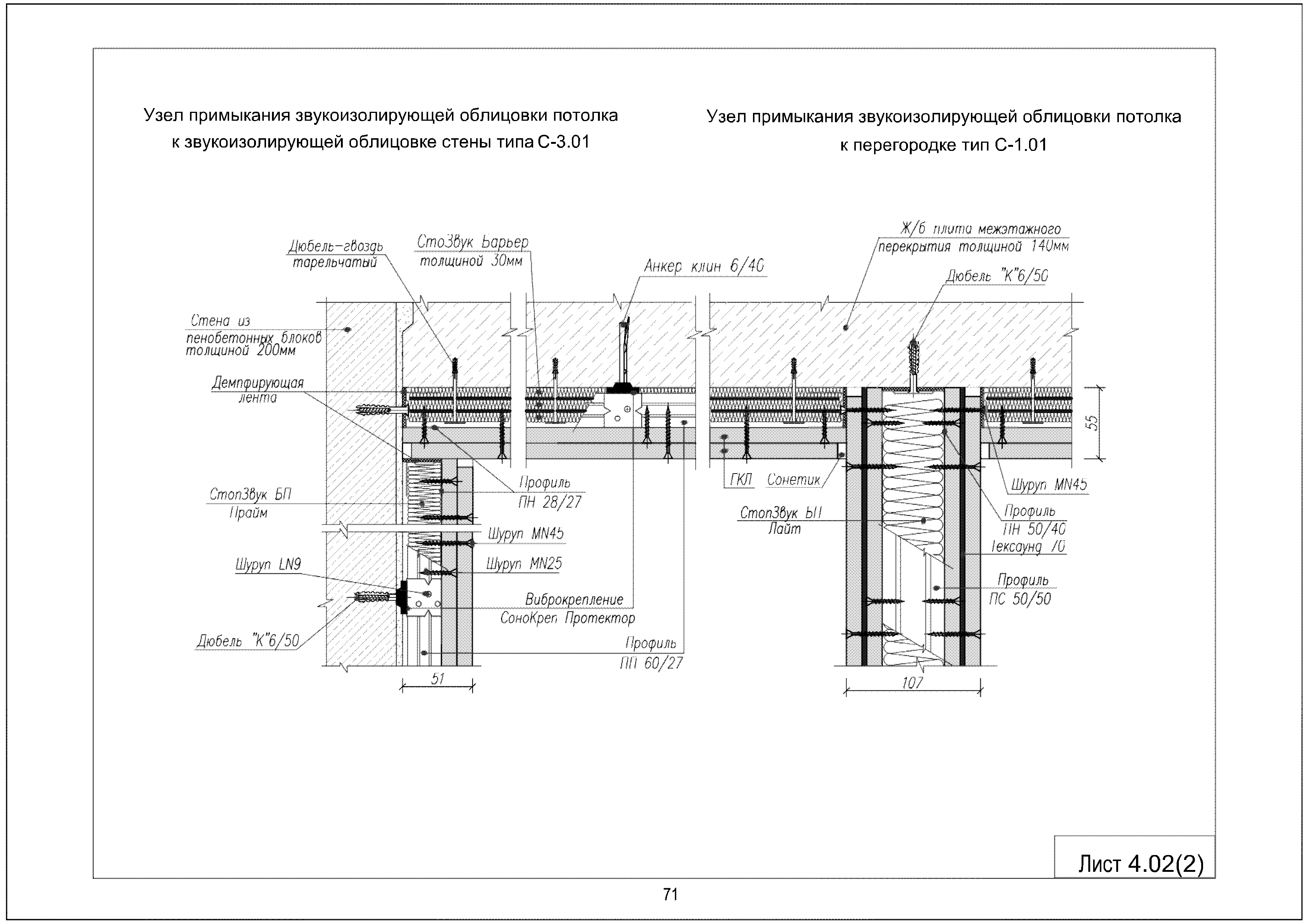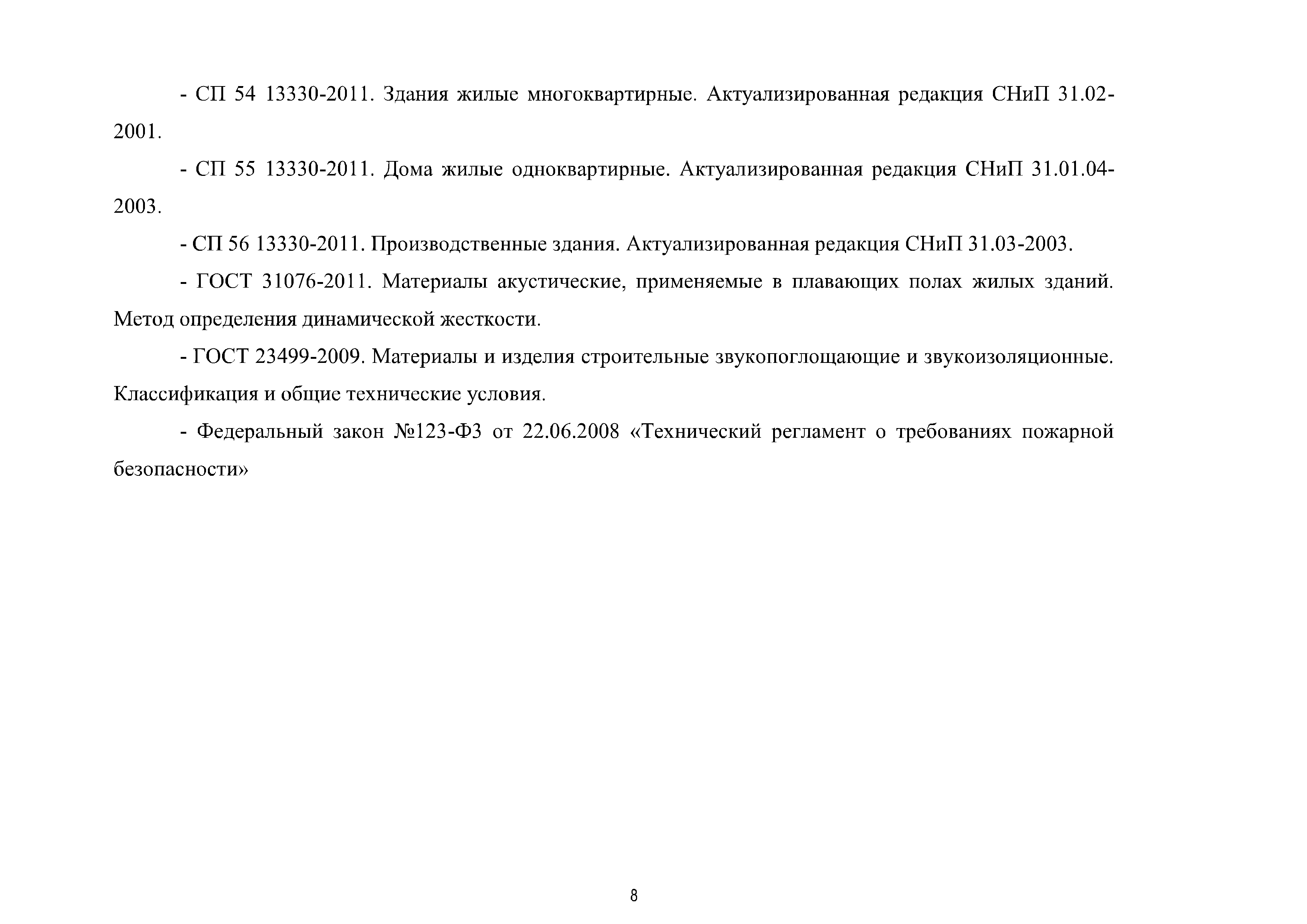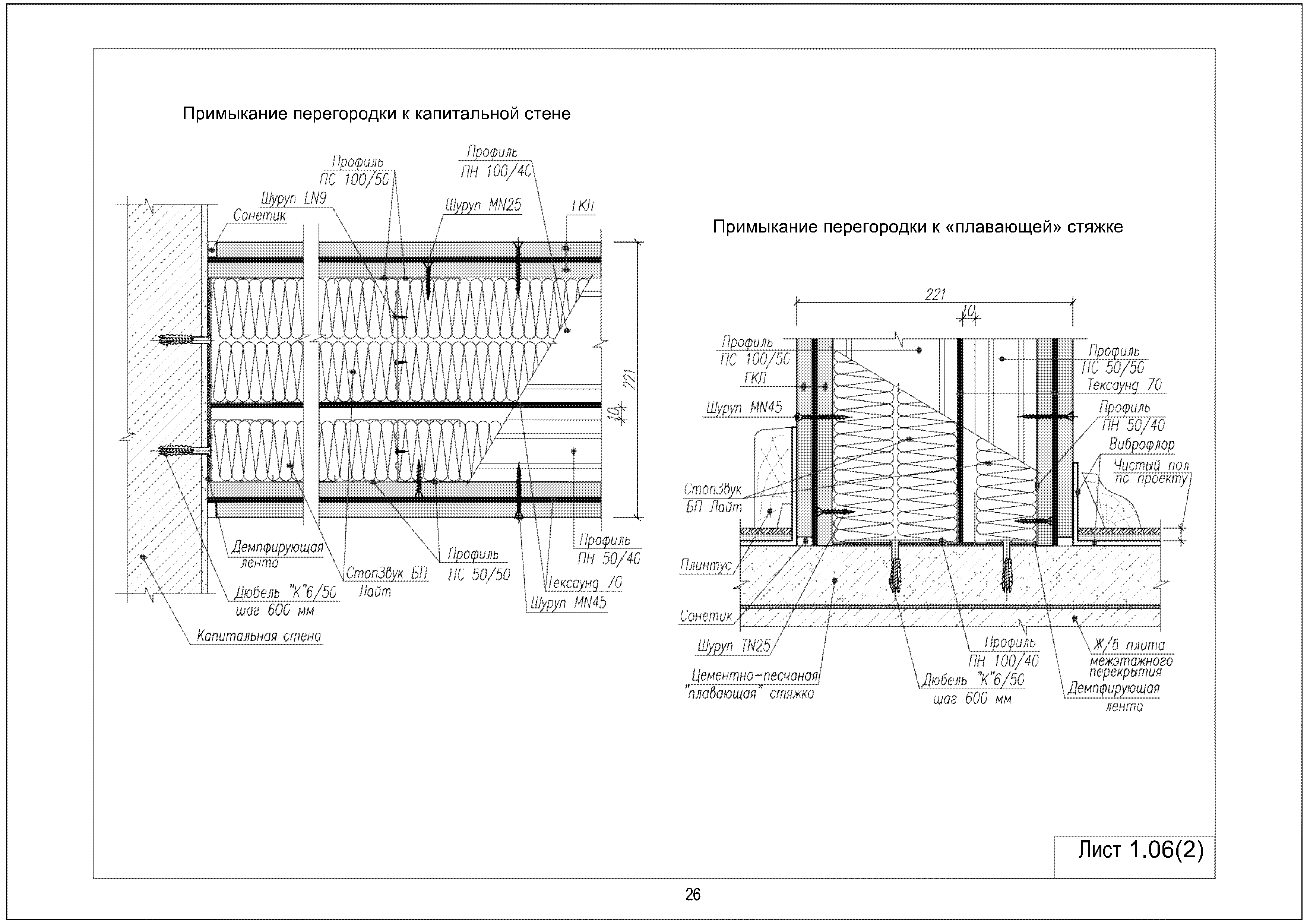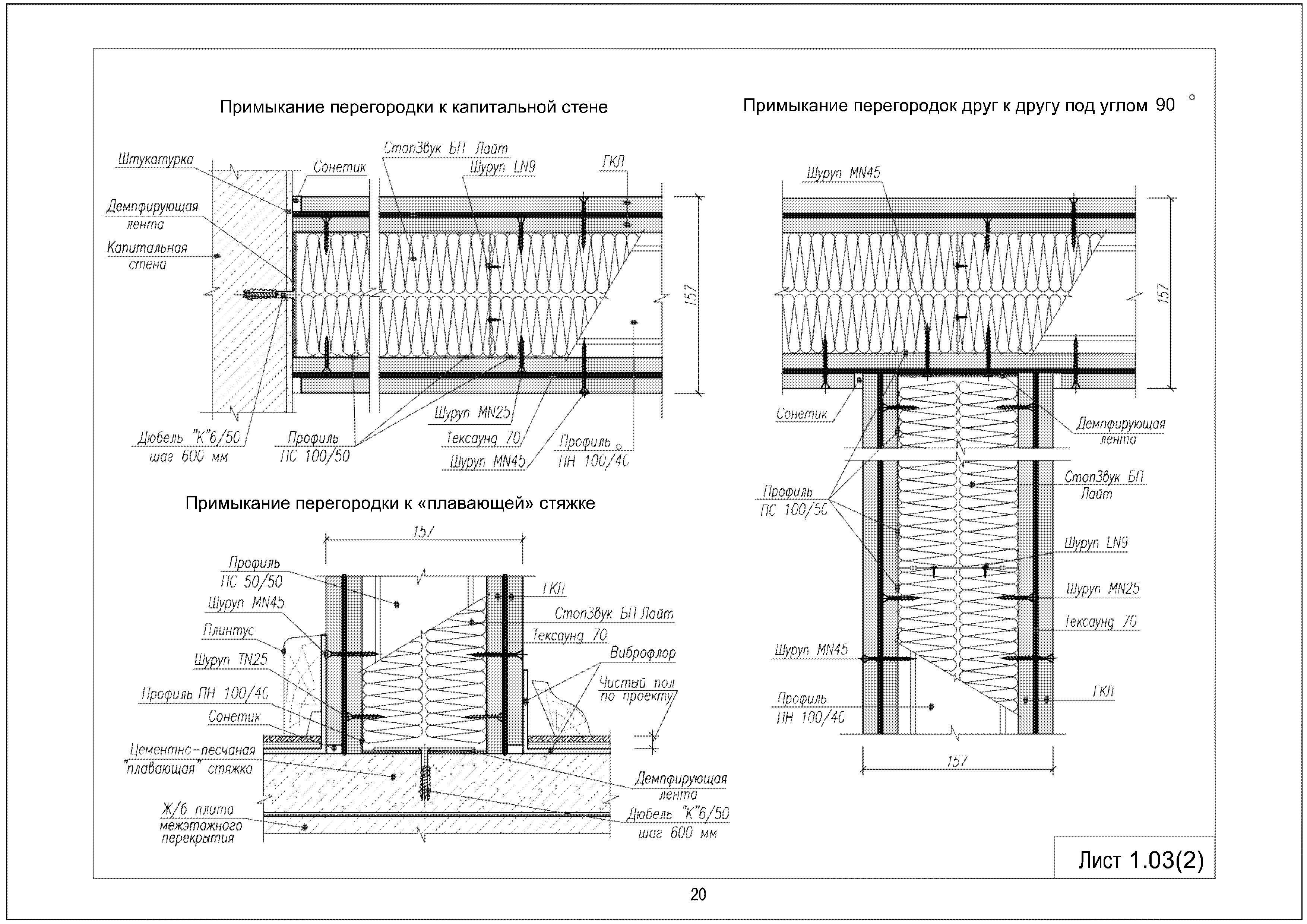 | Оглавление: | Введение Область применения Раздел 1. Общие положения. Нормативы и методики Общие положения Нормативы и методики Перечень схем ограждающих конструкций и помещений для возможного применения Раздел 2. Звукоизолирующие каркасные перегородки Перегородки на одинарном каркасе Перегородки на двойном каркасе Перегородки на специальном каркасе Раздел 3. Бескаркасные перегородки и межквартирные стены Звукоизолирующие межквартирные стены с облицовкой Звукоизолирующие перегородки и межквартирные стены без облицовки Раздел 4. Звукоизолирующие обшивки стен Раздел 5. Звукоизолирующие обшивки потолков Раздел 6. Звукоизолирующие конструкции полов Приложение А. Перечень акустических материалов и конструктивных элементов Приложение Б. Нормативные данные (выписка из СП 51.13330.2011 "СНиП 23-03-2003 "Защита от шума") Приложение В. Методика расчета звукоизоляции внутренних ограждающих конструкций жилых и общественных зданий |