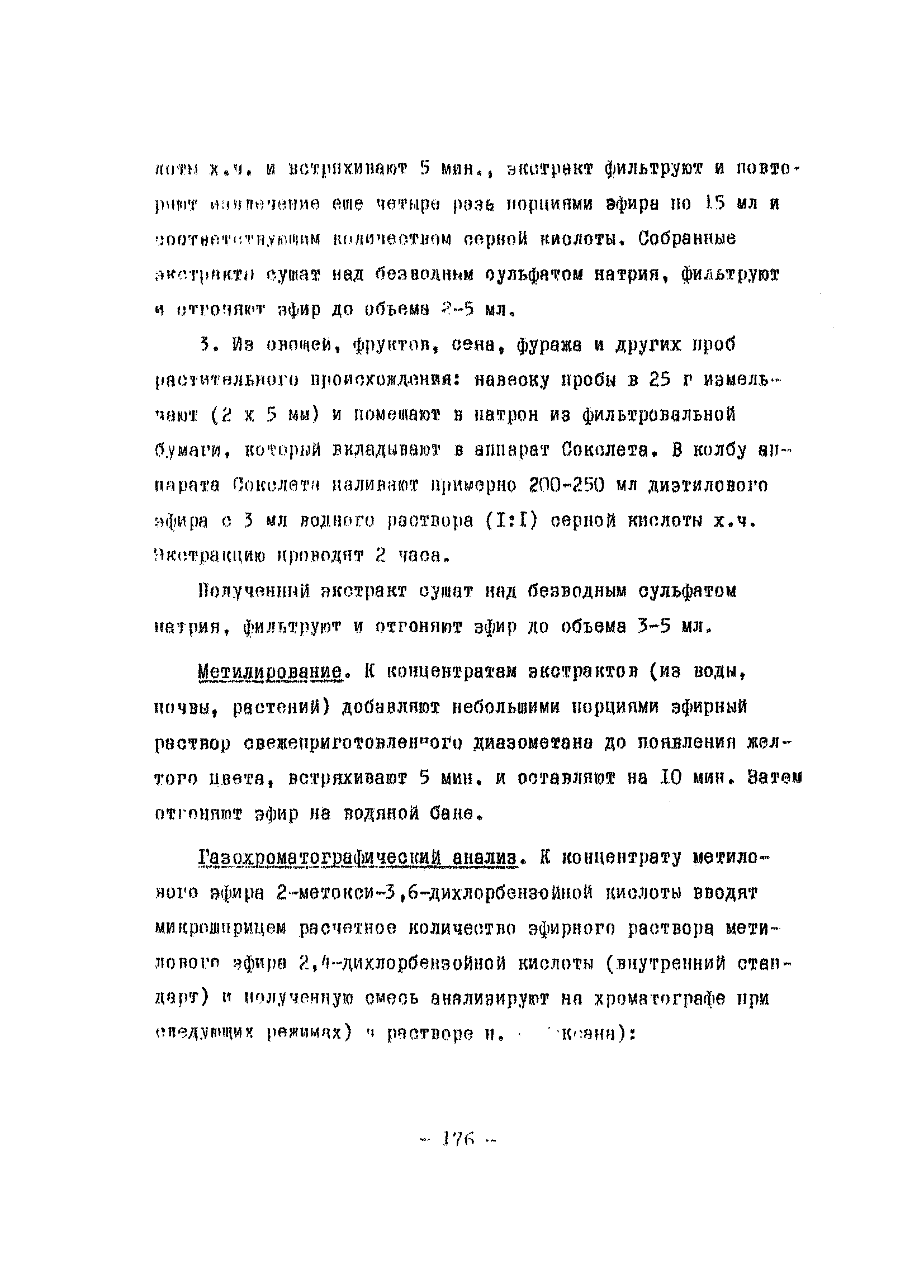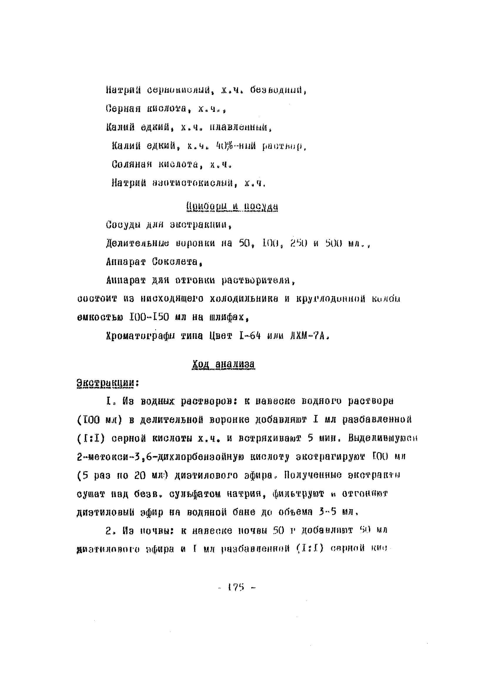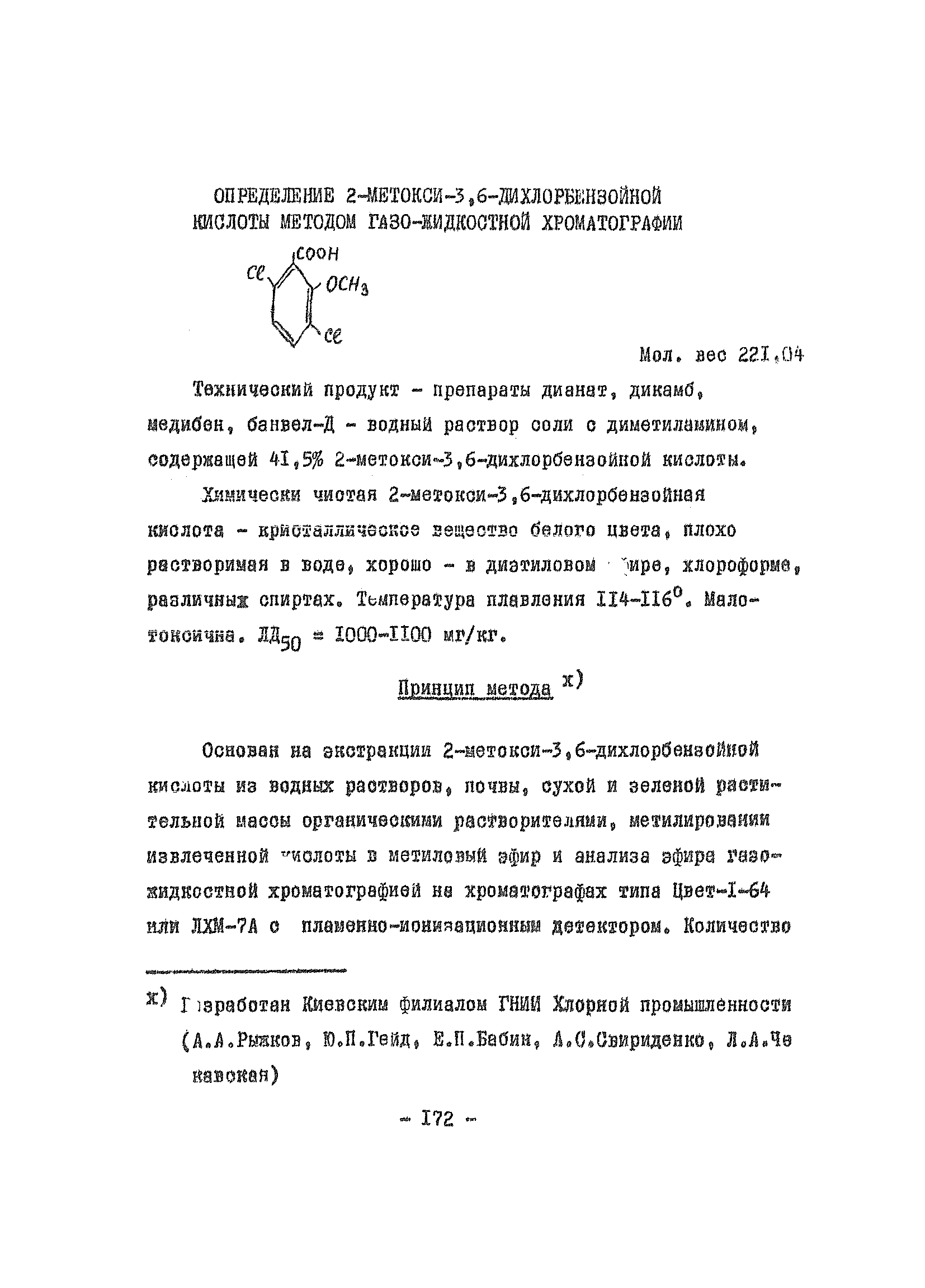 Определение 2-метокси-3,6-дихлорбензойной кислоты методом газо-жидкостной хроматографии| Статус: | справочные материалы, мп, тпр | | Название рус.: | Определение 2-метокси-3,6-дихлорбензойной кислоты методом газо-жидкостной хроматографии | | Дата добавления в базу: | 05.05.2017 | | Дата актуализации: | 01.01.2021 | | Область применения: | Основан на экстракции 2-метокси-3,6-дихлорбензойной кислоты из водных растворов, почвы, сухой и зеленой растительной массы органическими растворителями, метилировании извлеченной кислоты в метиловый эфир и анализа эфира газожидкостной хроматографией на хроматографах типа Цвет-1-64 или ЛХМ-7А с пламенно-ионизационным детектором | | Оглавление: | Принцип метода Реактивы Приборы и посуда Ход анализа | | Разработан: | ГНИИ хлорной промышленности