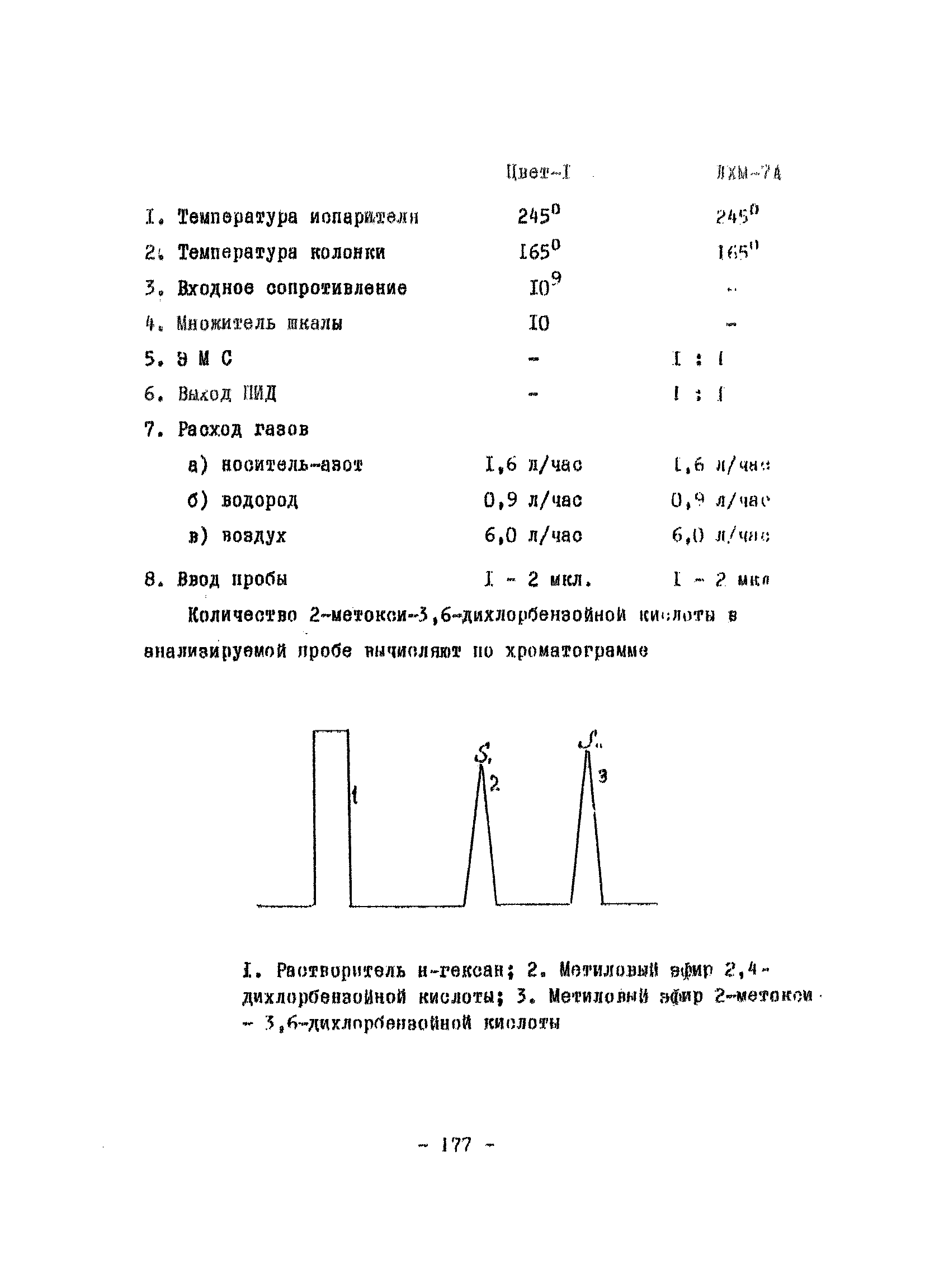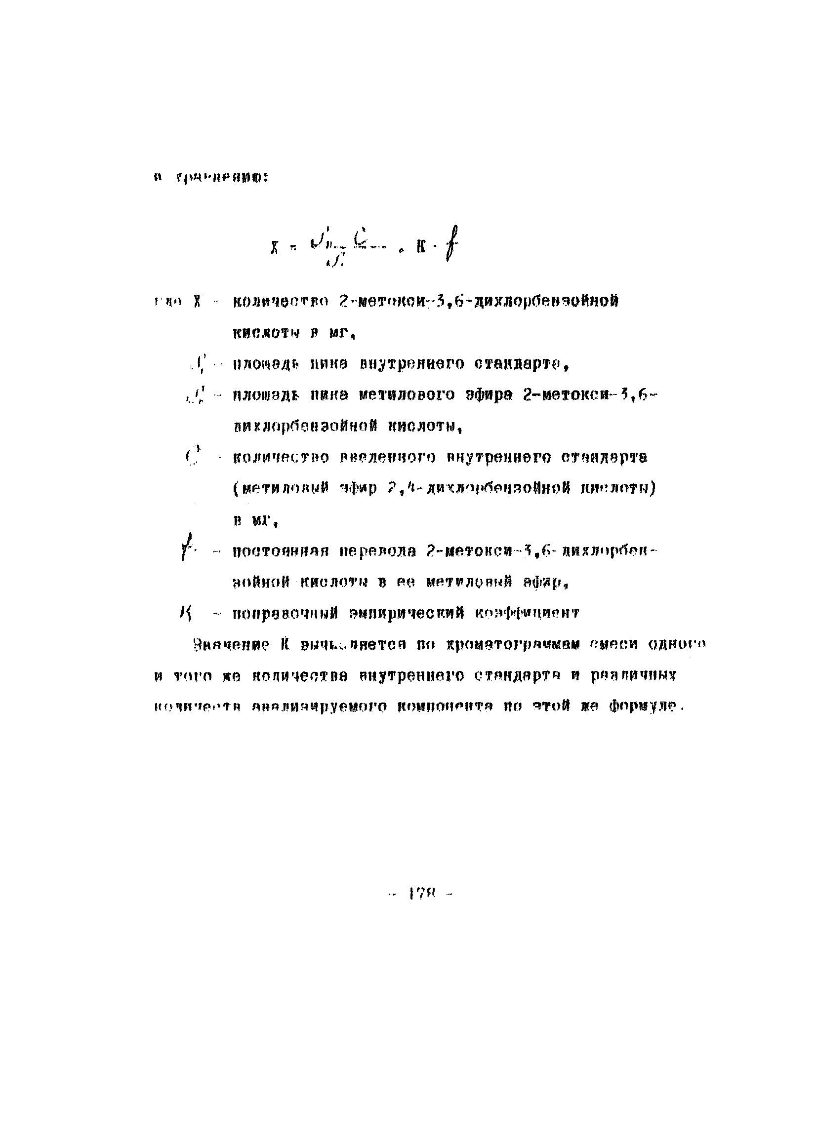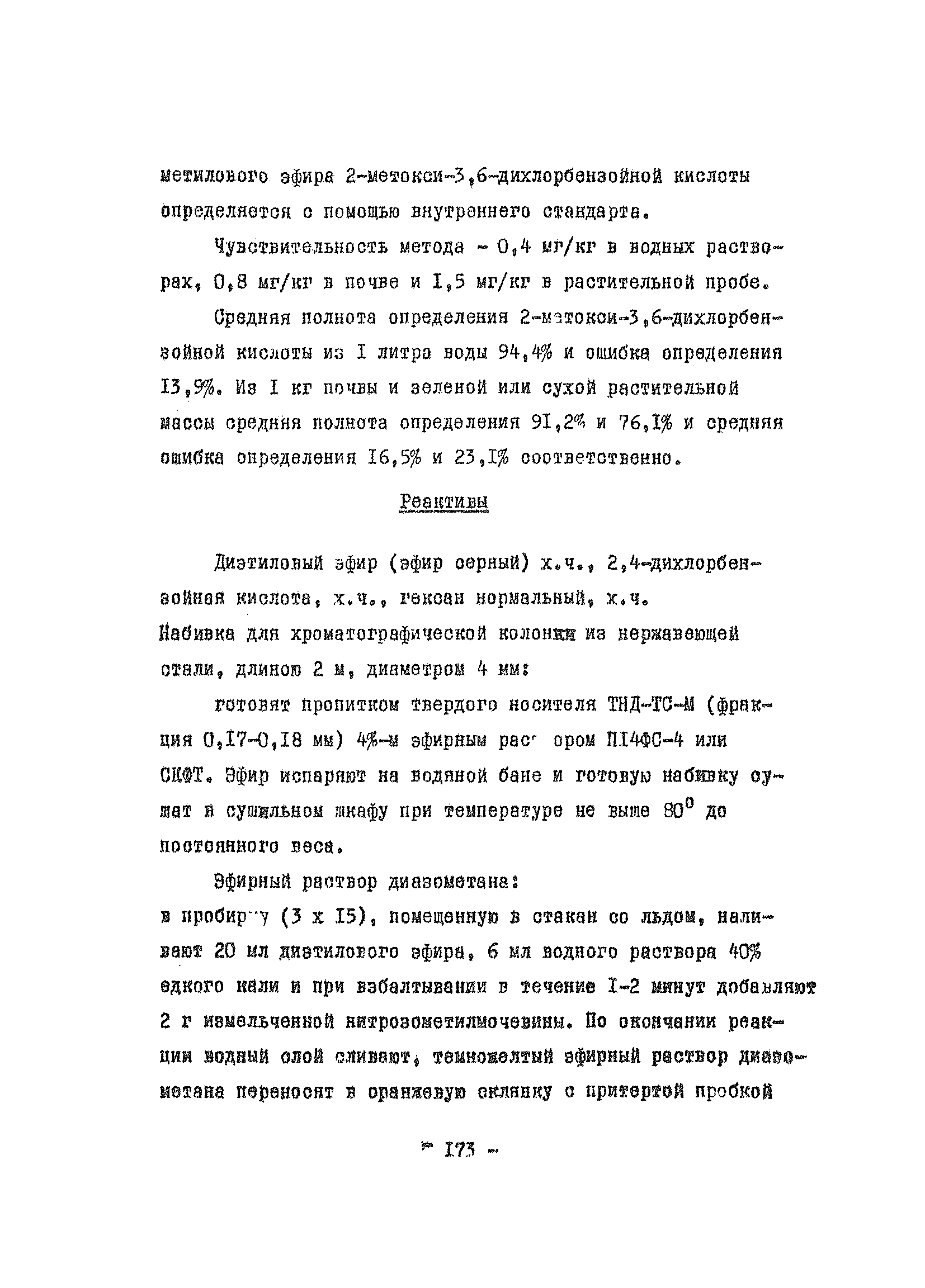 Определение 2-метокси-3,6-дихлорбензойной кислоты методом газо-жидкостной хроматографии| Статус: | справочные материалы, мп, тпр | | Название рус.: | Определение 2-метокси-3,6-дихлорбензойной кислоты методом газо-жидкостной хроматографии | | Дата добавления в базу: | 05.05.2017 | | Дата актуализации: | 01.01.2021 | | Область применения: | Основан на экстракции 2-метокси-3,6-дихлорбензойной кислоты из водных растворов, почвы, сухой и зеленой растительной массы органическими растворителями, метилировании извлеченной кислоты в метиловый эфир и анализа эфира газожидкостной хроматографией на хроматографах типа Цвет-1-64 или ЛХМ-7А с пламенно-ионизационным детектором | | Оглавление: | Принцип метода Реактивы Приборы и посуда Ход анализа | | Разработан: | ГНИИ хлорной промышленности