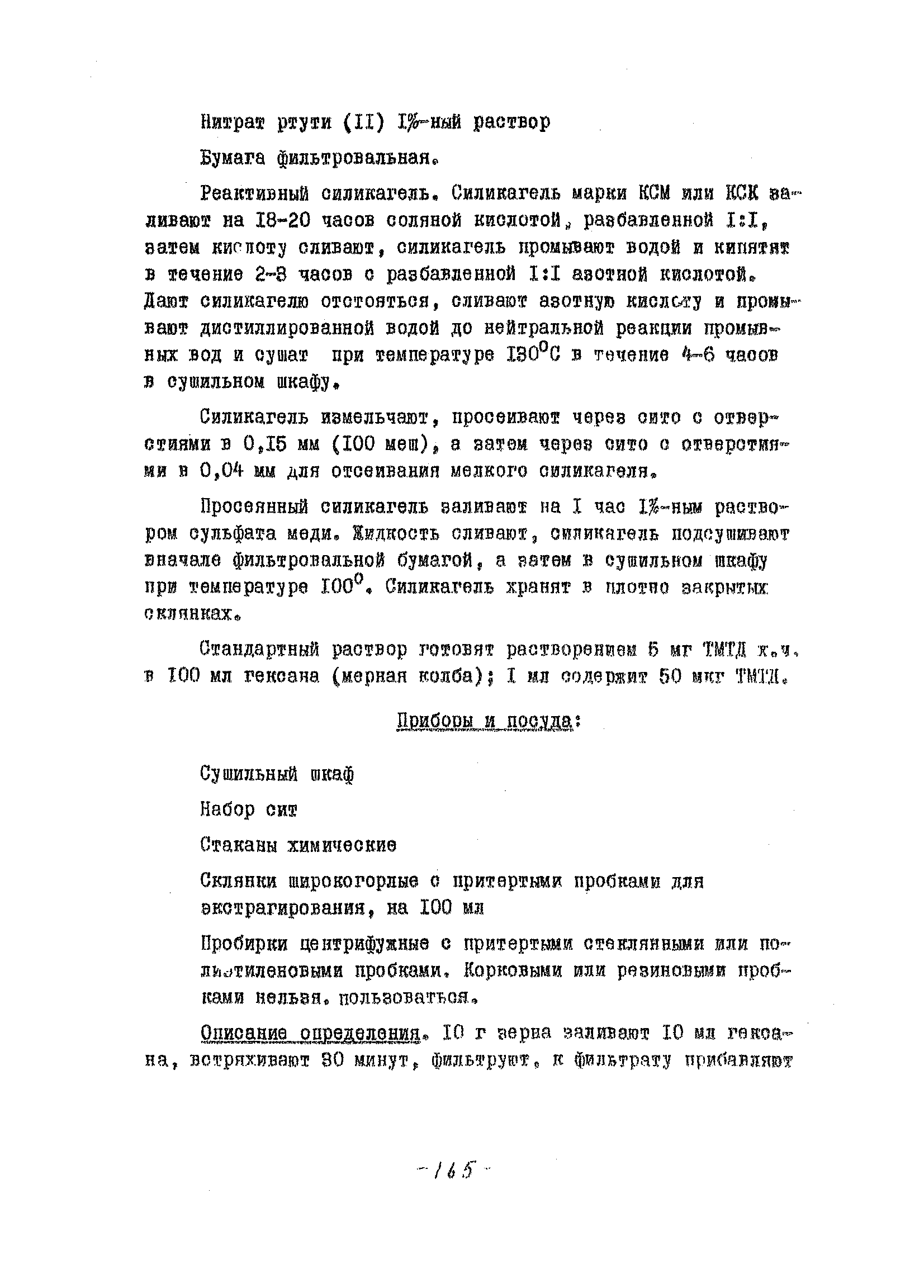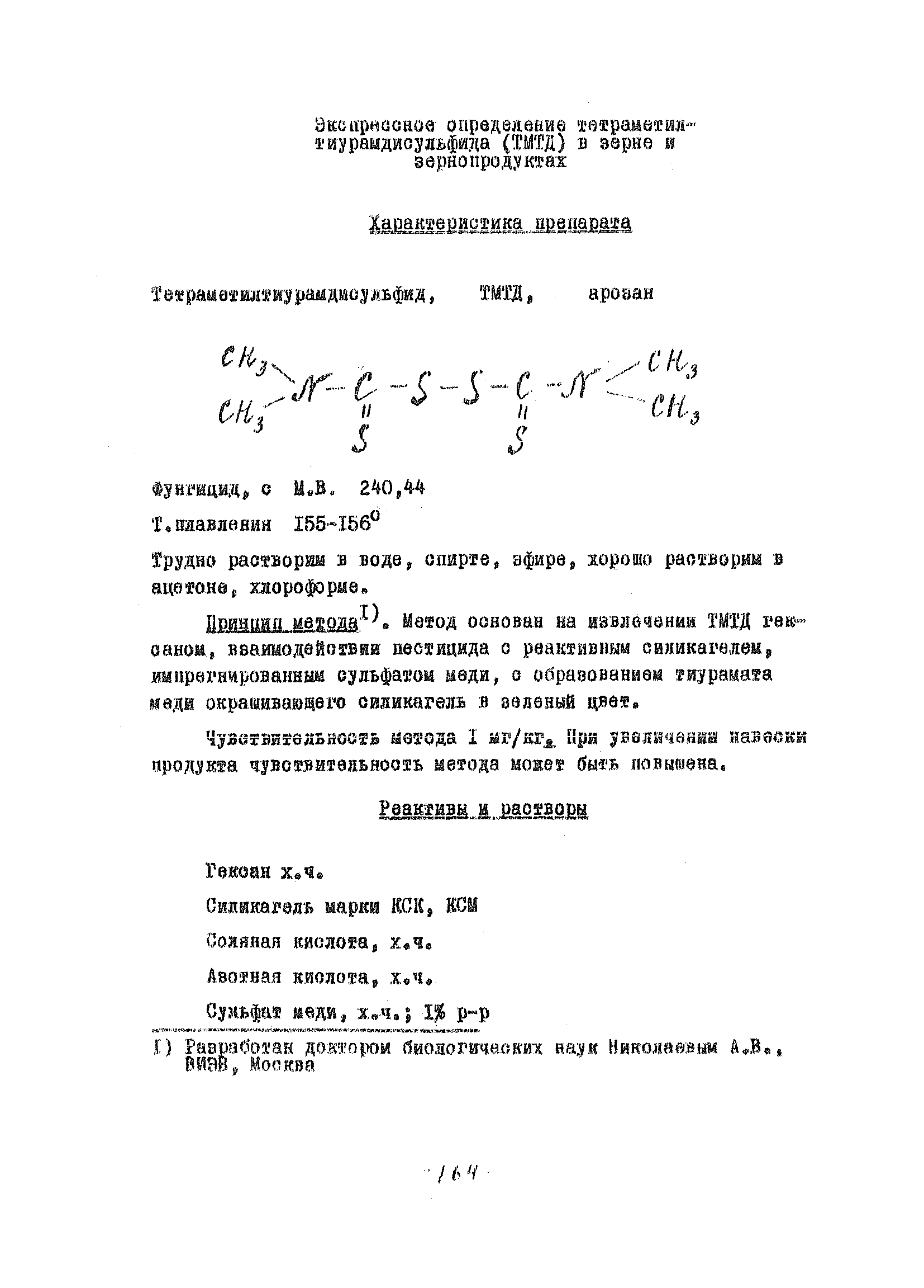 Экспрессное определение тетраметилтиурамдисульфида (ТМТД) в зерне и зернопродуктах| Статус: | справочные материалы, мп, тпр | | Название рус.: | Экспрессное определение тетраметилтиурамдисульфида (ТМТД) в зерне и зернопродуктах | | Дата добавления в базу: | 05.05.2017 | | Дата актуализации: | 01.01.2021 | | Область применения: | Метод основан на извлечении ТМТД гексаном, взаимодействии пестицида с реактивным силикагелем, импрегнированным сульфатом меди, с образованием тиурамата меди окрашивающего силикагель в зеленый цвет | | Оглавление: | Характеристика препарата Реактивы и растворы Приборы и посуда | | Разработан: | ВИЭВ