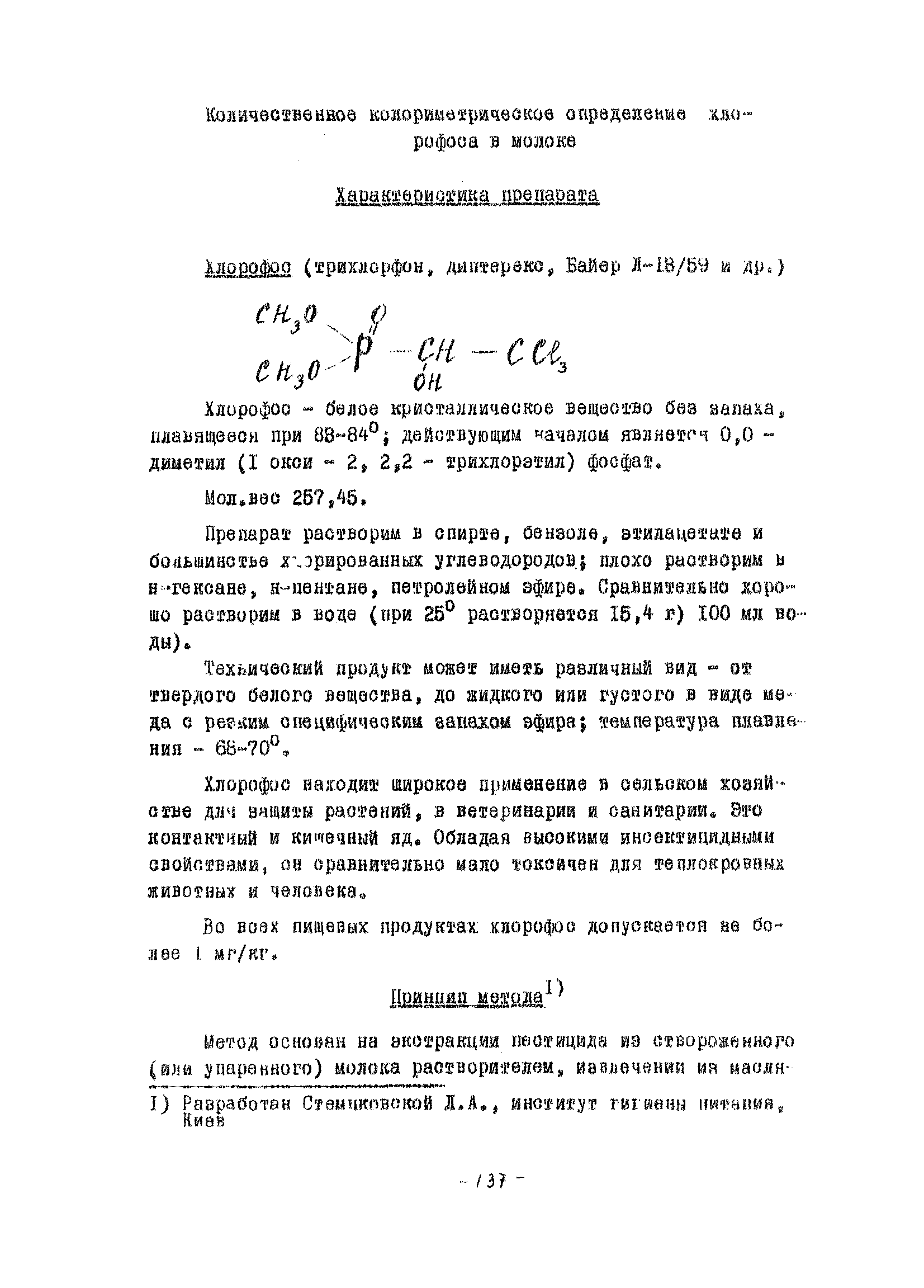 | Название рус.: | Количественное колориметрическое определение хлорофоса в молоке |