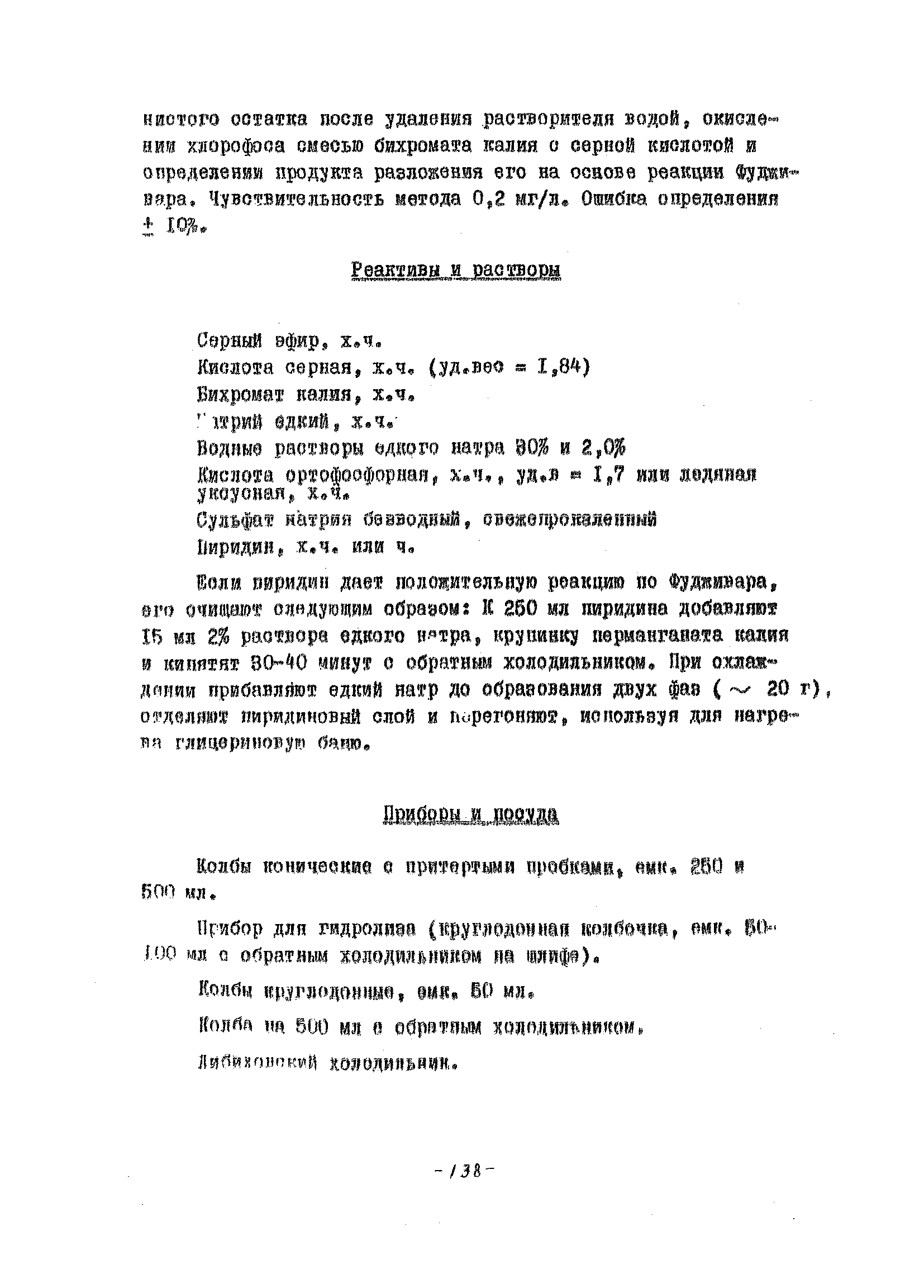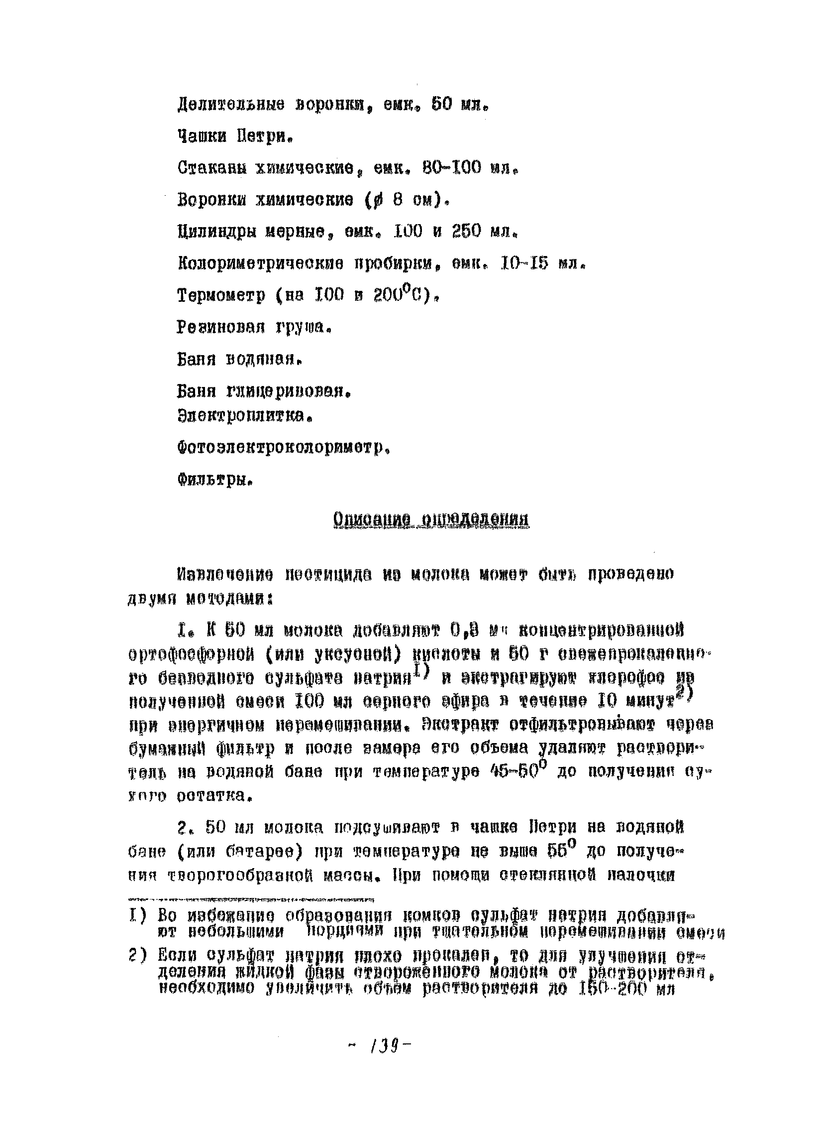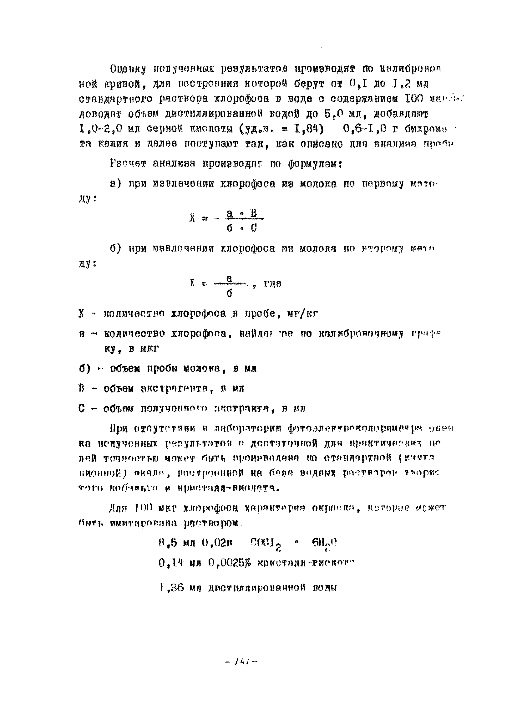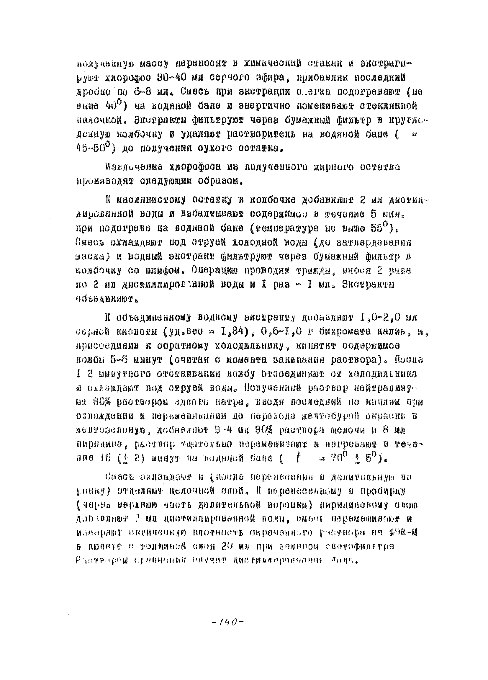 | Область применения: | Метод основан на экстракции пестицида из створоженного (или упаренного) молока растворителем, извлечении из маслянистого остатка после удаления растворителя водой, окислении хлорофоса смесью бихромата калия с серной кислотой и определении продукта разложения его на основе реакции фудживара |