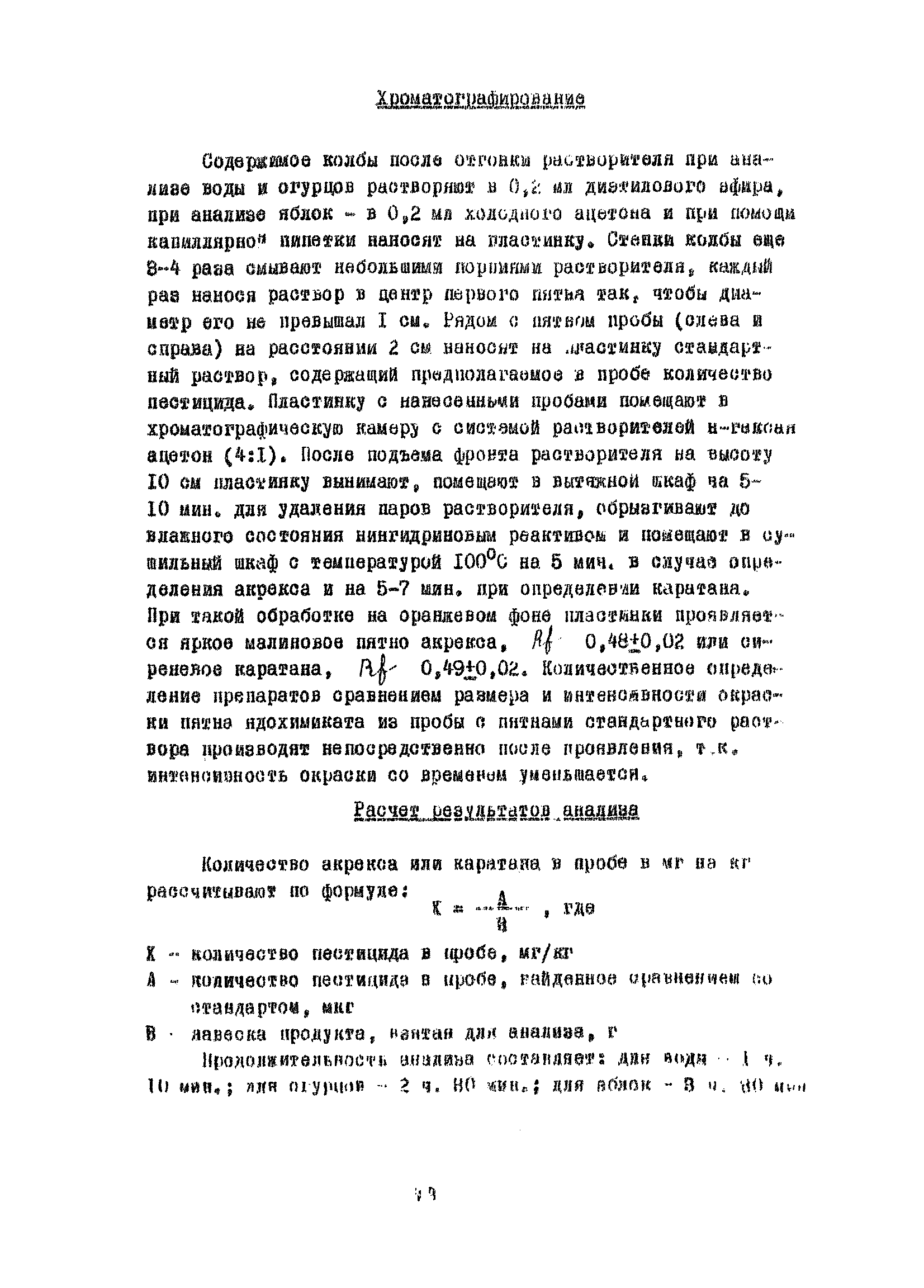 | Область применения: | Метод основан на экстракции пестицидов из исследуемой пробы органическим растворителем, отгонке растворителя, осаждении восков в случае определения пестицидов в яблоках, хроматографировании в тонком слое силикагеля марки КСН с цинковой пылью; подвижной фазой является система растворителей гексан-ацетон в соотношении 4:1 |