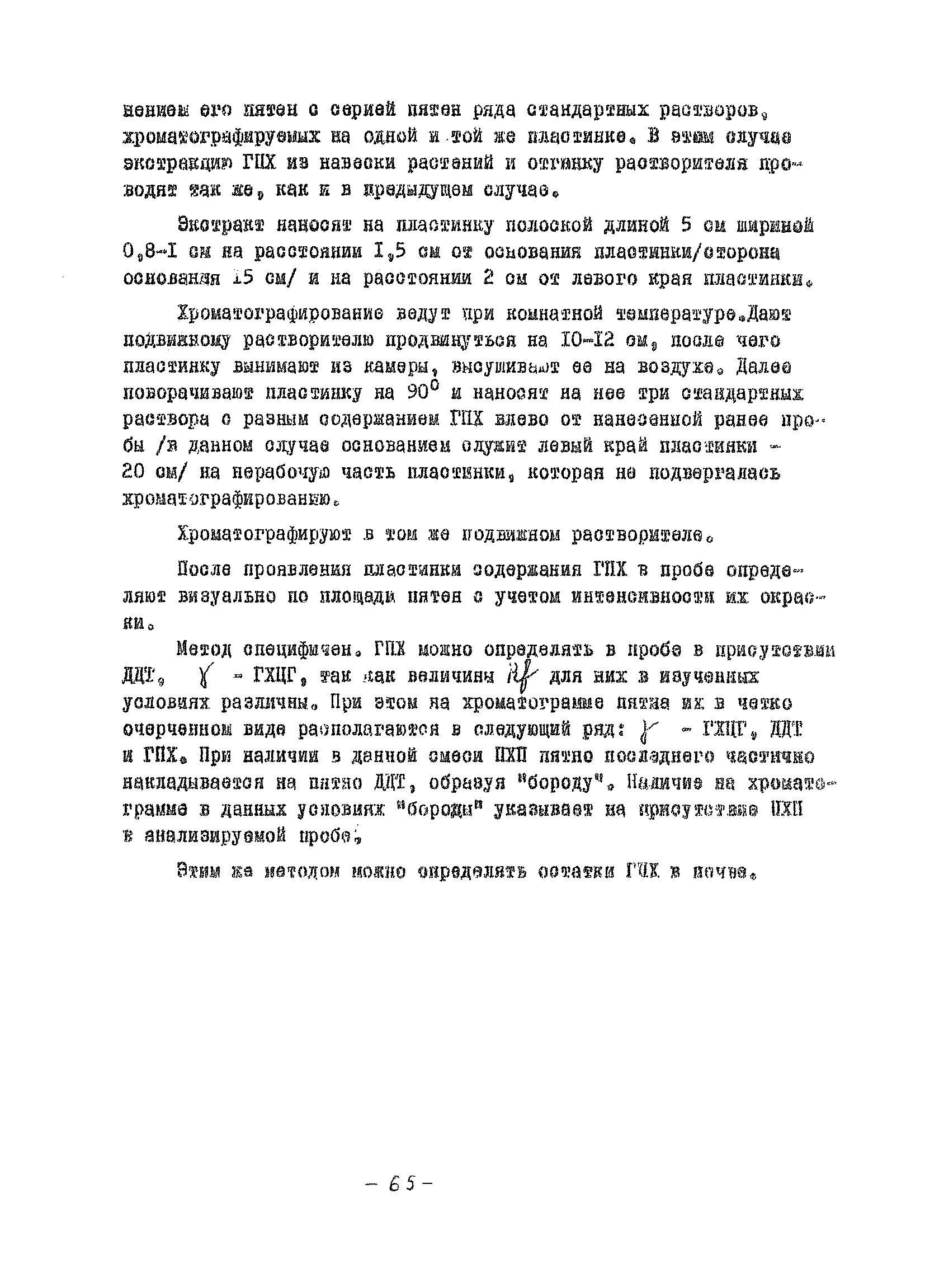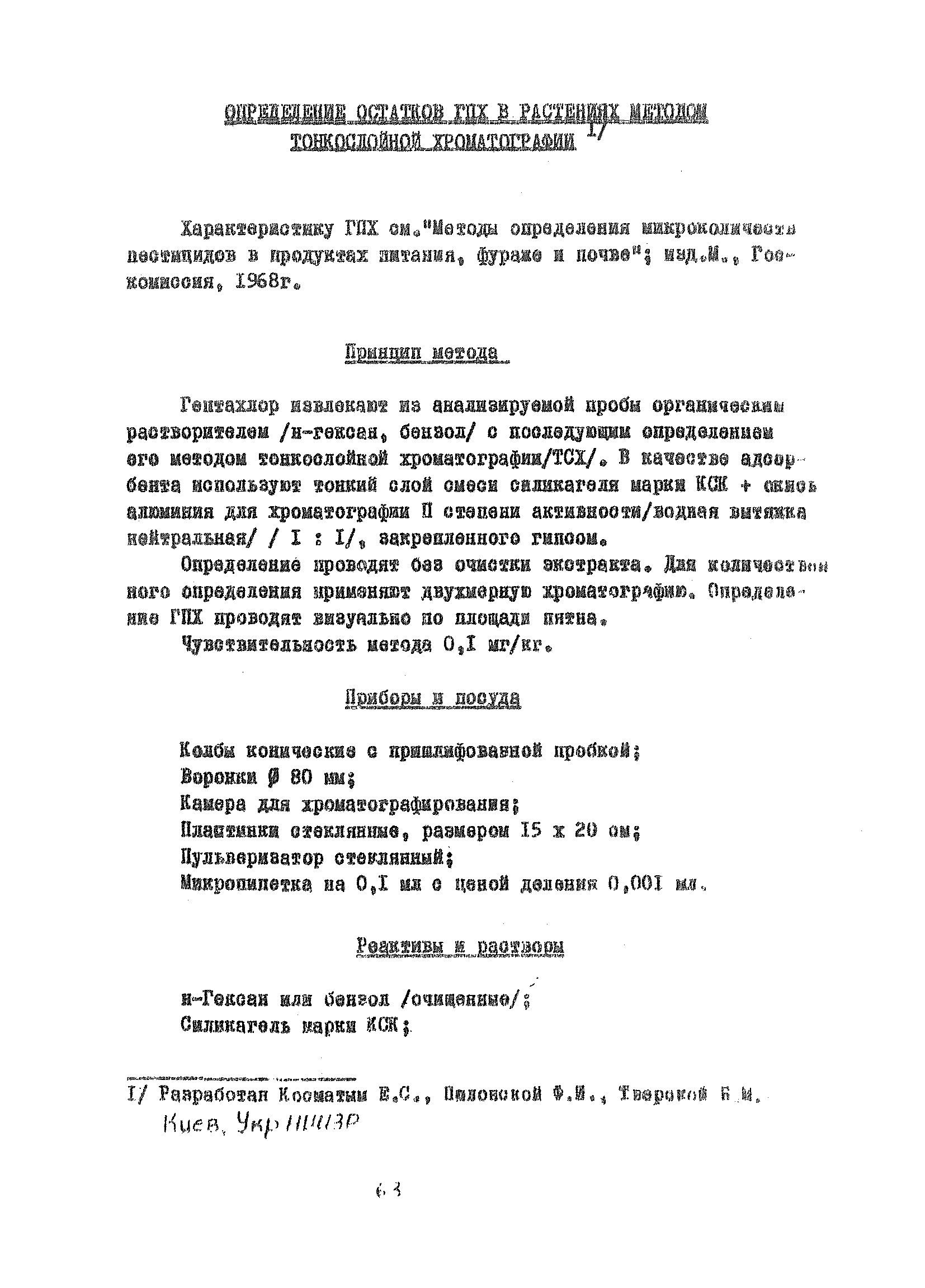 Определение остатков ГПХ в растениях методом тонкослойной хроматографии| Статус: | справочные материалы, мп, тпр | | Название рус.: | Определение остатков ГПХ в растениях методом тонкослойной хроматографии | | Дата добавления в базу: | 05.05.2017 | | Дата актуализации: | 01.01.2021 | | Оглавление: | Принцип метода Приборы и посуда Реактивы и растворы Ход анализа Качественное определение ГПХ Количественное определение ГПХ | | Разработан: | УкрНИИЗР