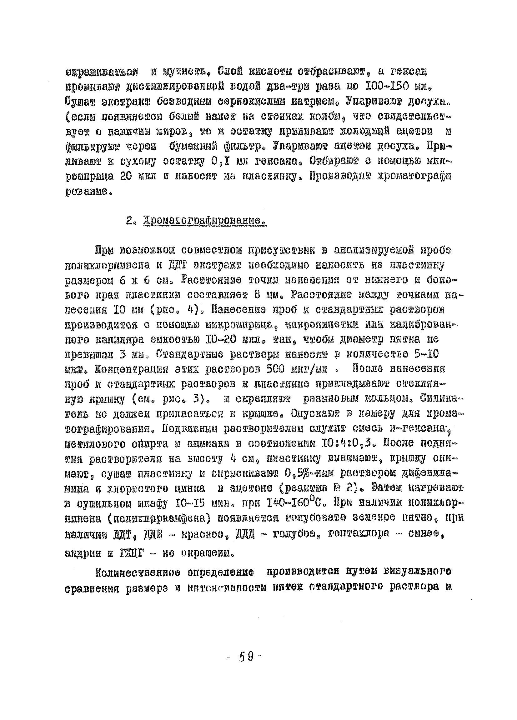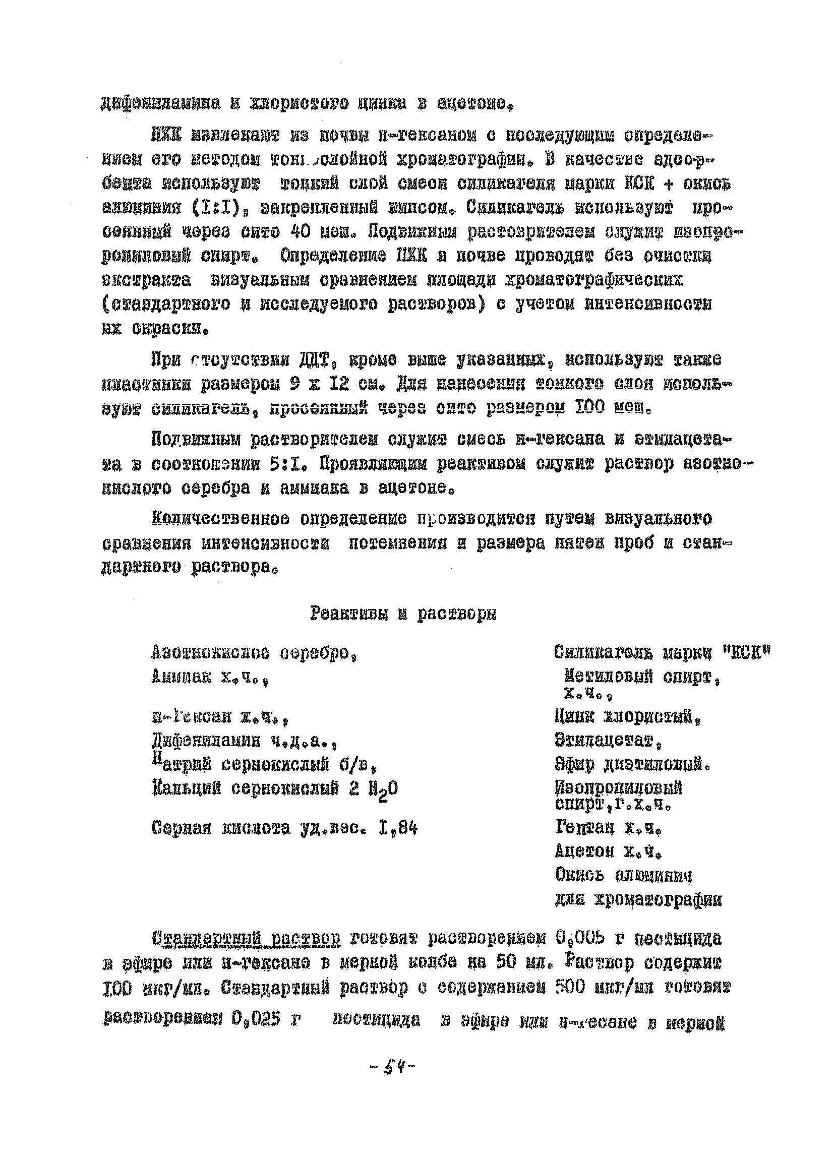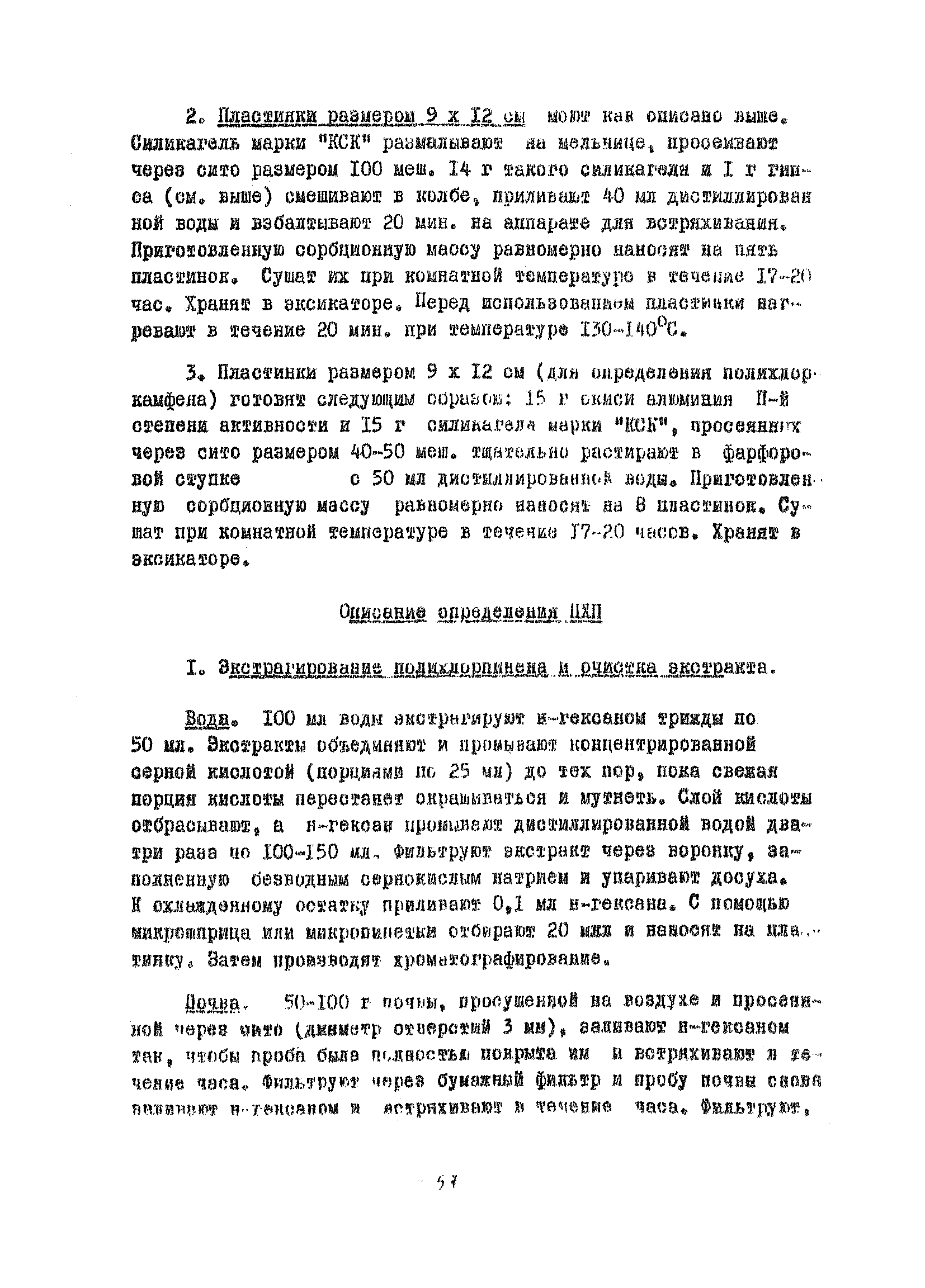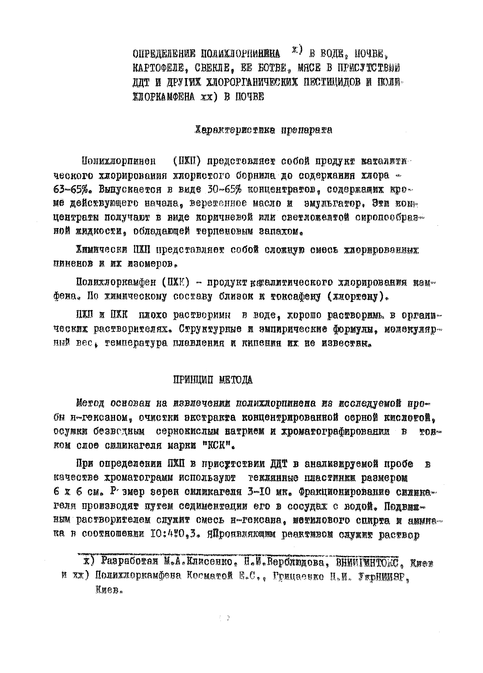 Определение полихлорпинена в воде, почве, картофеле, свекле, ее ботве, мясе в присутствии ДДТ и других хлорорганических пестицидов и полихлоркамфена в почве| Статус: | справочные материалы, мп, тпр | | Название рус.: | Определение полихлорпинена в воде, почве, картофеле, свекле, ее ботве, мясе в присутствии ДДТ и других хлорорганических пестицидов и полихлоркамфена в почве | | Дата добавления в базу: | 05.05.2017 | | Дата актуализации: | 01.01.2021 | | Область применения: | Метод основан на извлечении полихлорпинена из исследуемой пробы н-гексаном, очистки экстракта концентрированной серной кислотой, осушки безводным сернокислым натрием и хроматографировании в тонком слое силикагеля марки "КСК" | | Оглавление: | Характеристика препарата Принцип метода Реактивы и растворы Посуда и оборудование Фракционирование силикагеля Приготовление пластинок Описание определения ЦХП 1. Экстрагирование полихлорпинена и очистка экстракта Вода Почва Картофель, свекла Ботва свеклы, картофеля Мясо 2. Хроматографирование Описание определения ПХК | | Разработан: | ВНИИГИНТОКС УкрНИИЗР