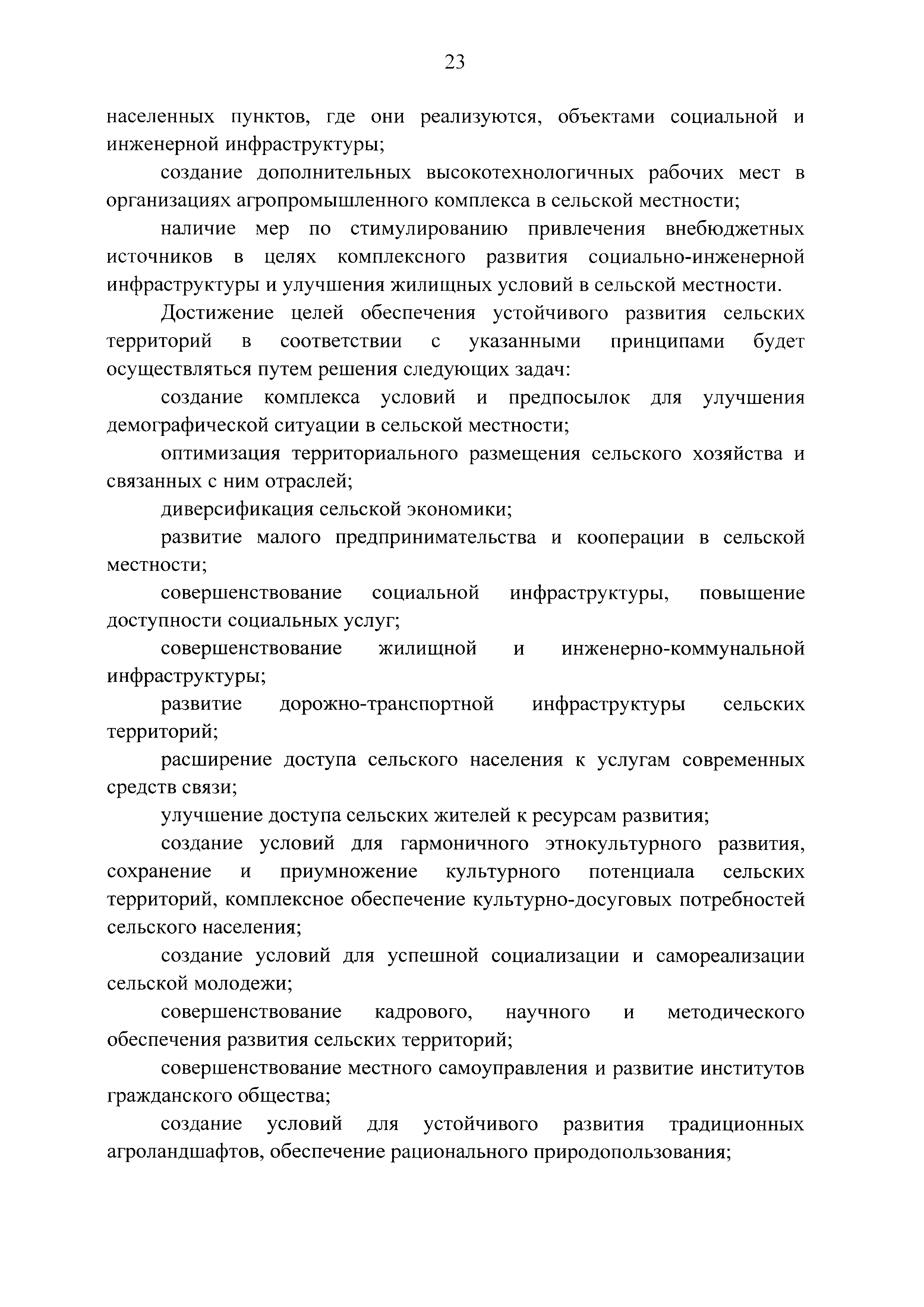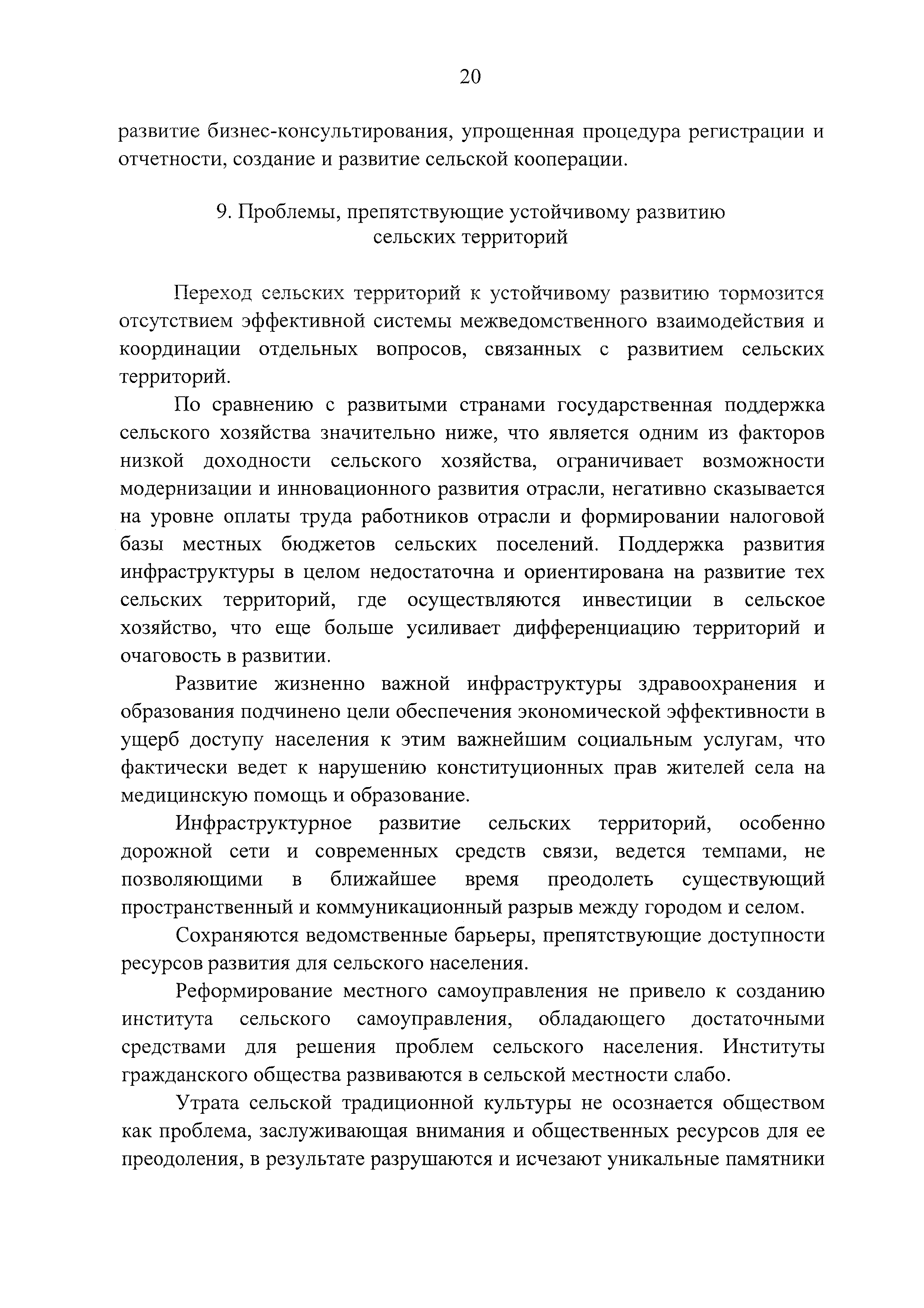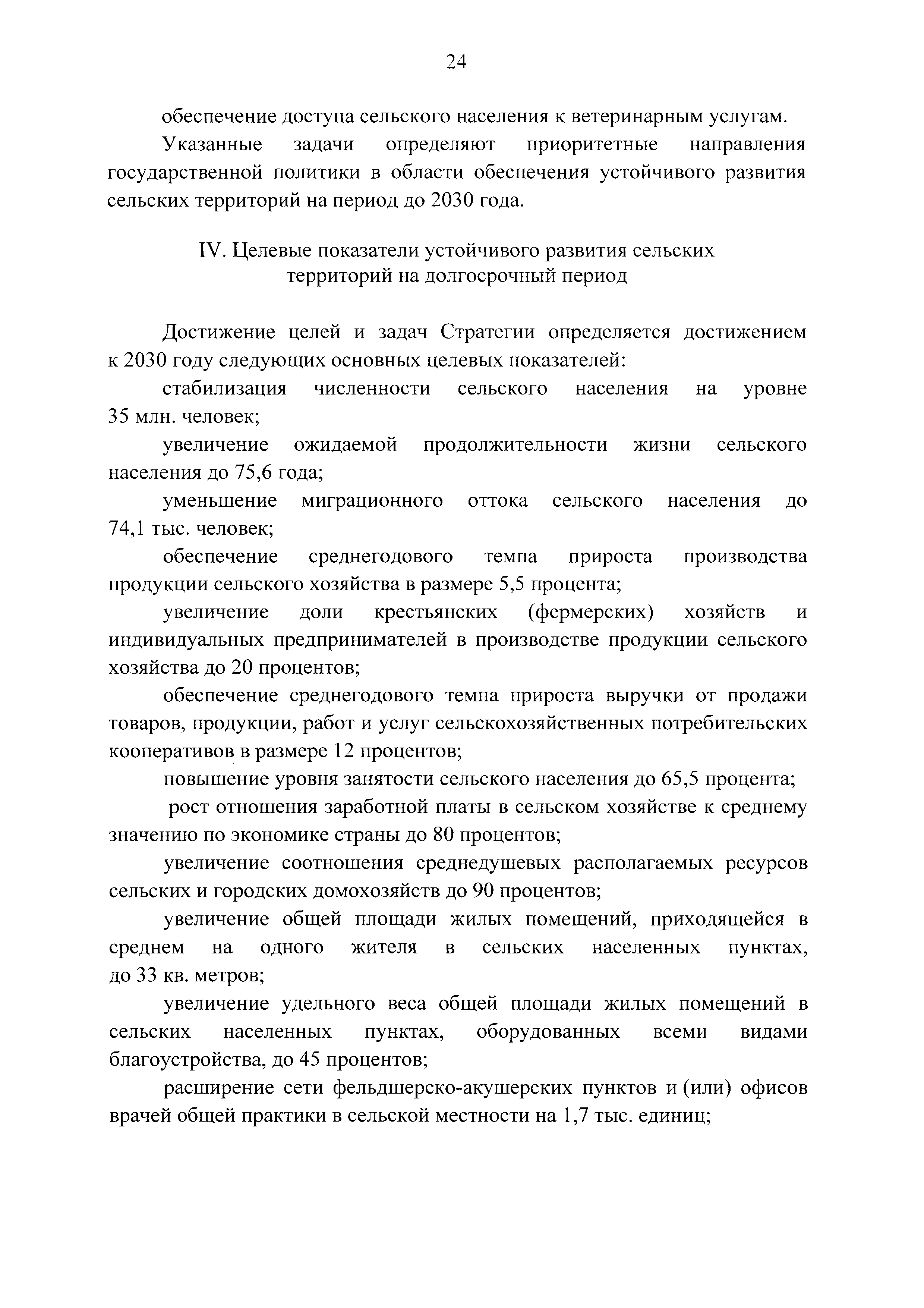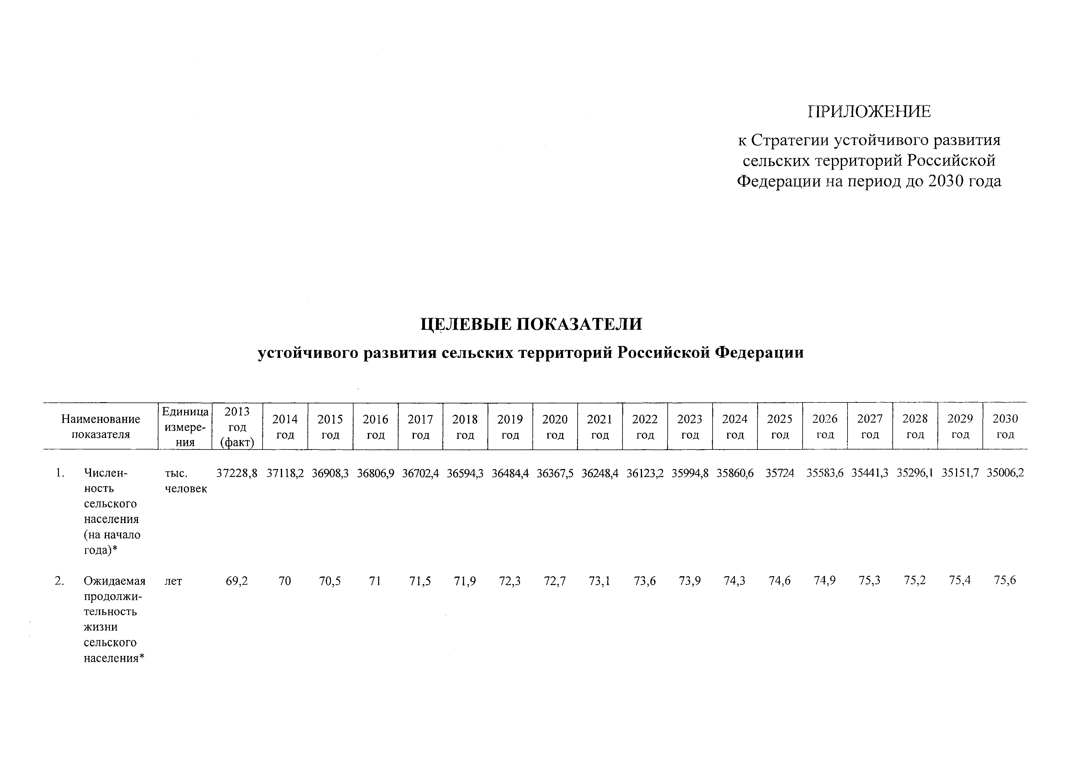 | Оглавление: | I. Общие положения II. Современное состояние и тенденции развития сельских территорий III. Цели, принципы и задачи государственной политики в области обеспечения устойчивого развития сельских территорий IV. Целевые показатели устойчивого развития сельских территорий на долгосрочный период V. Приоритетные направления государственной политики в области устойчивого развития сельских территорий на период до 2030 года VI. Этапы и механизмы реализации Стратегии Приложение. Целевые показатели устойчивого развития сельских территорий Российской Федерации |