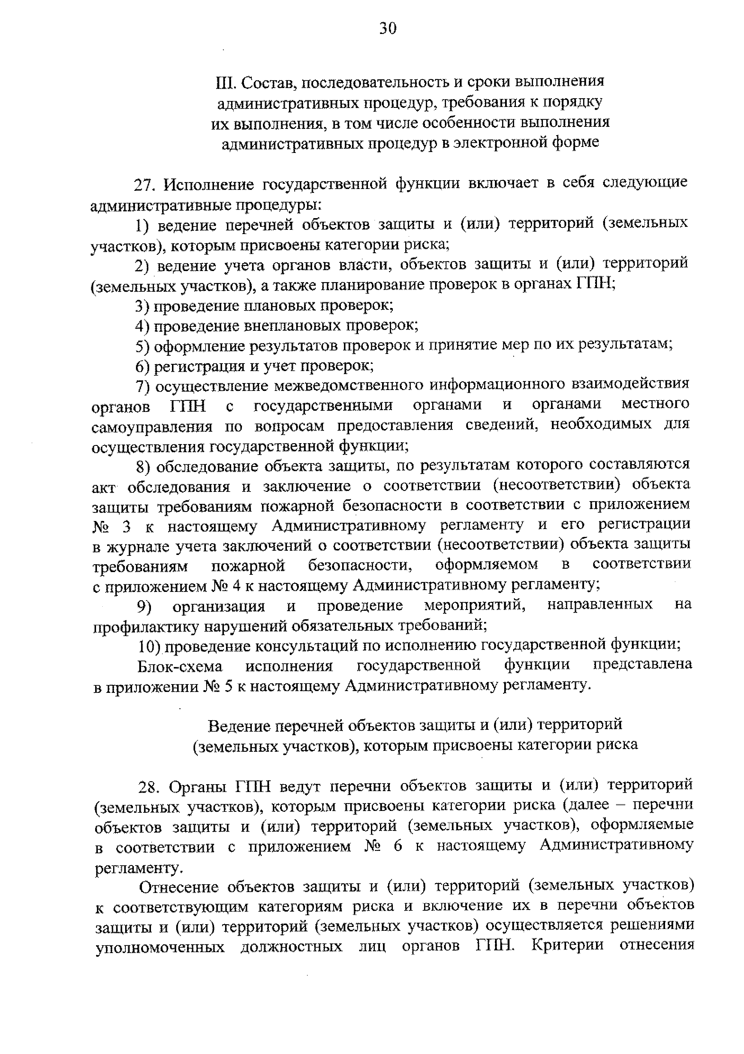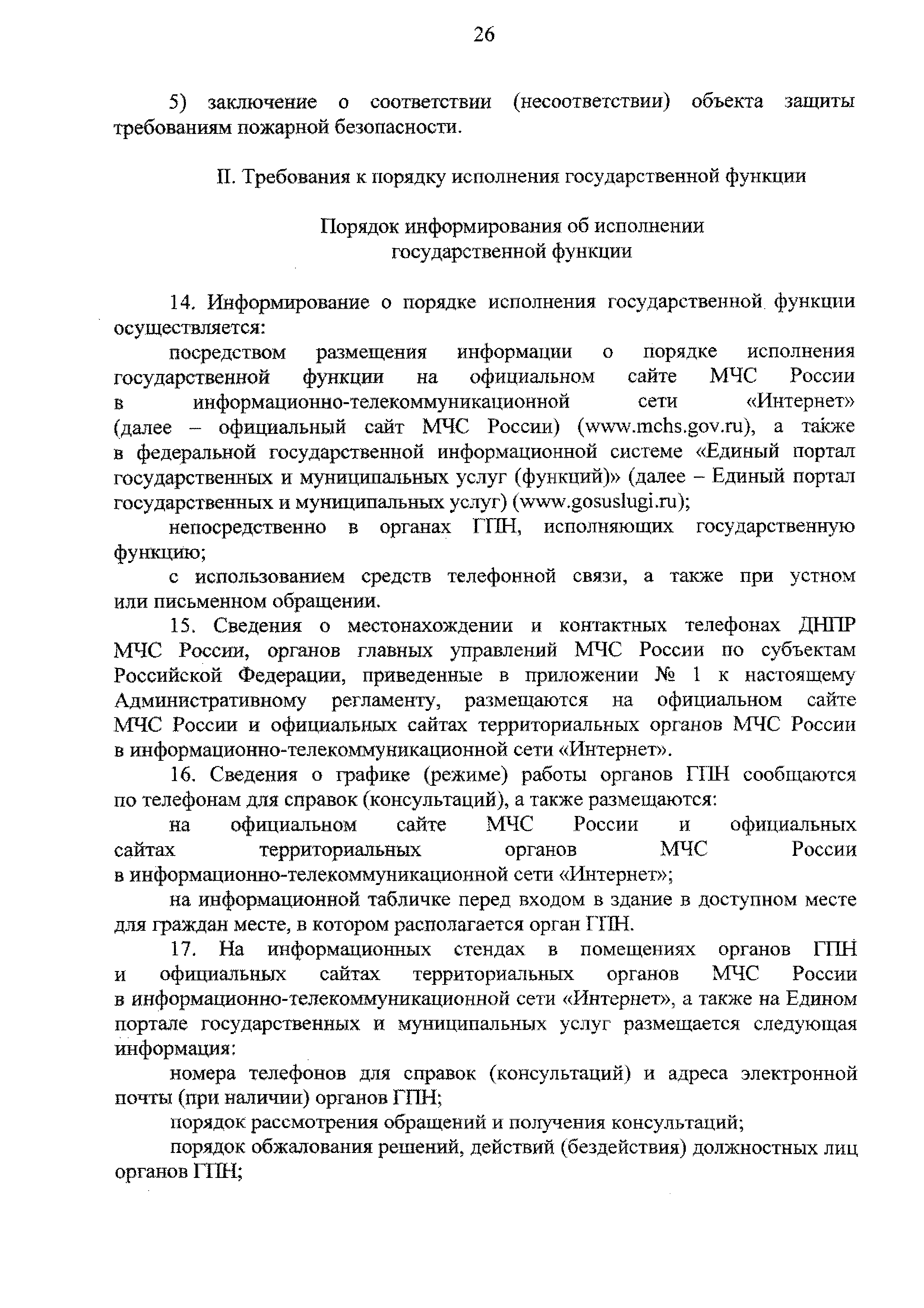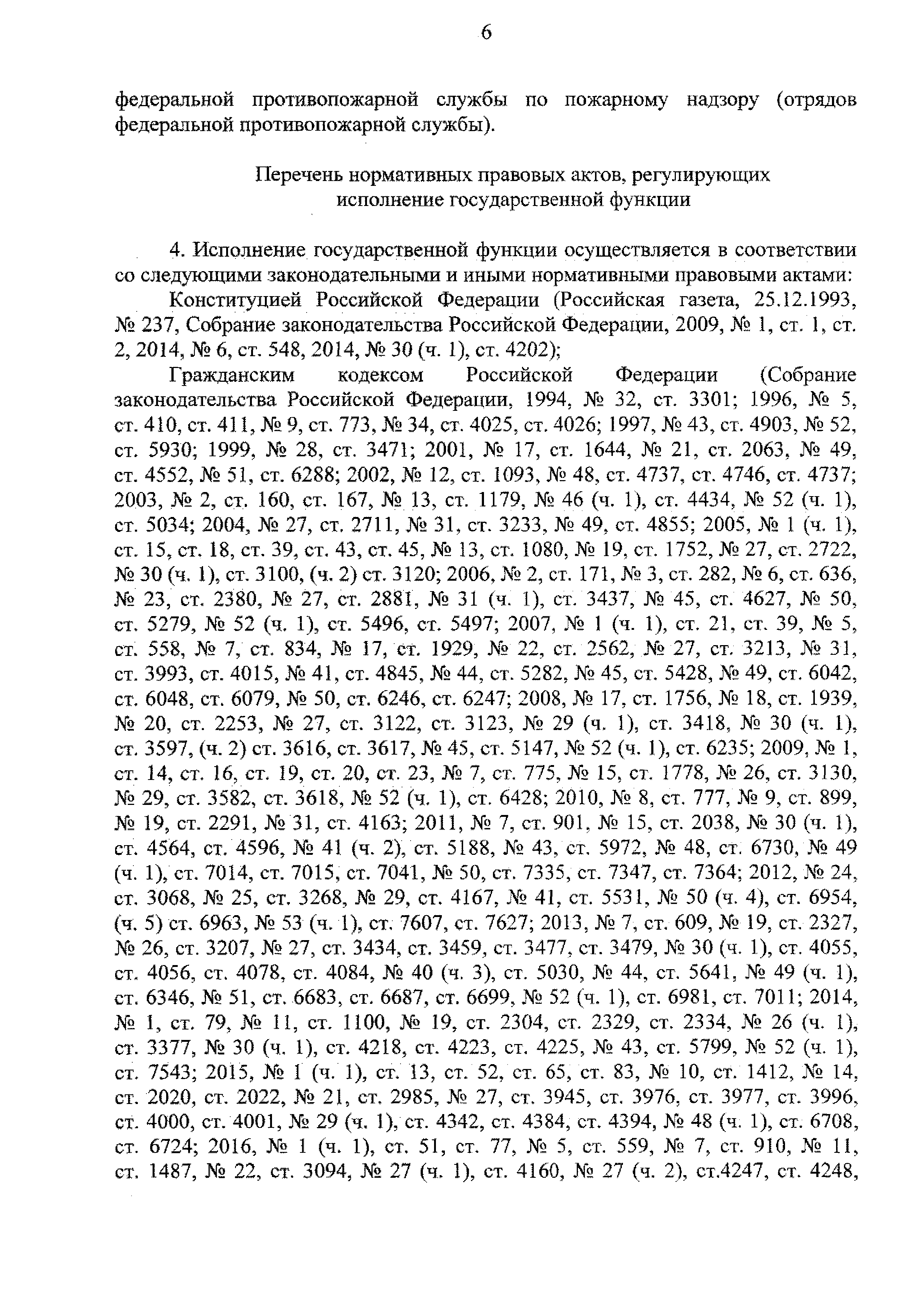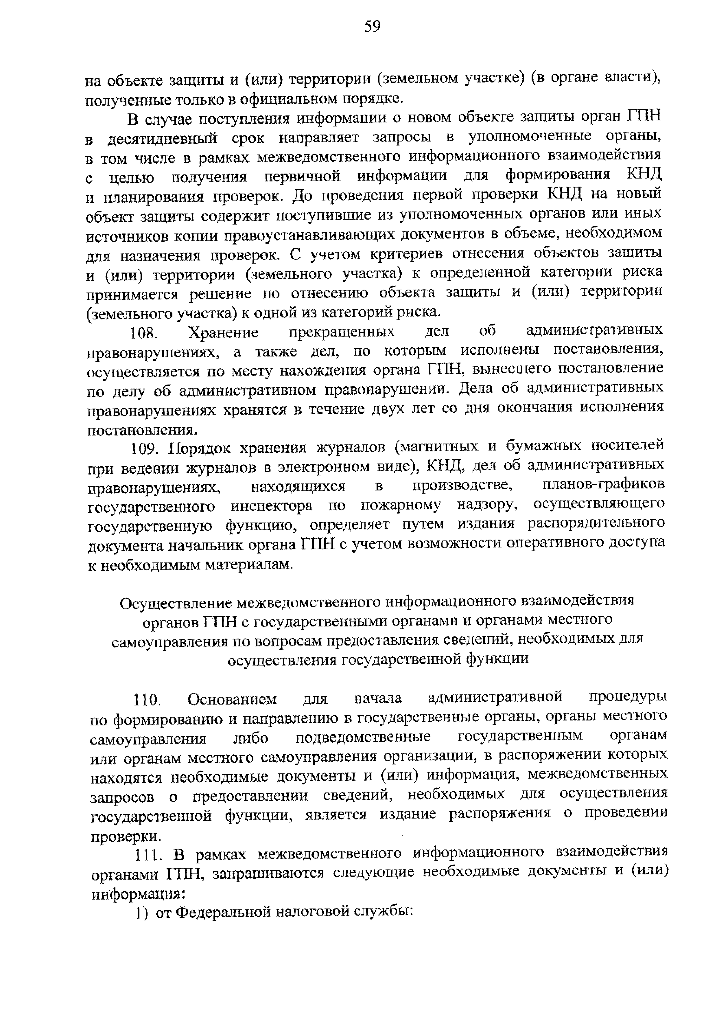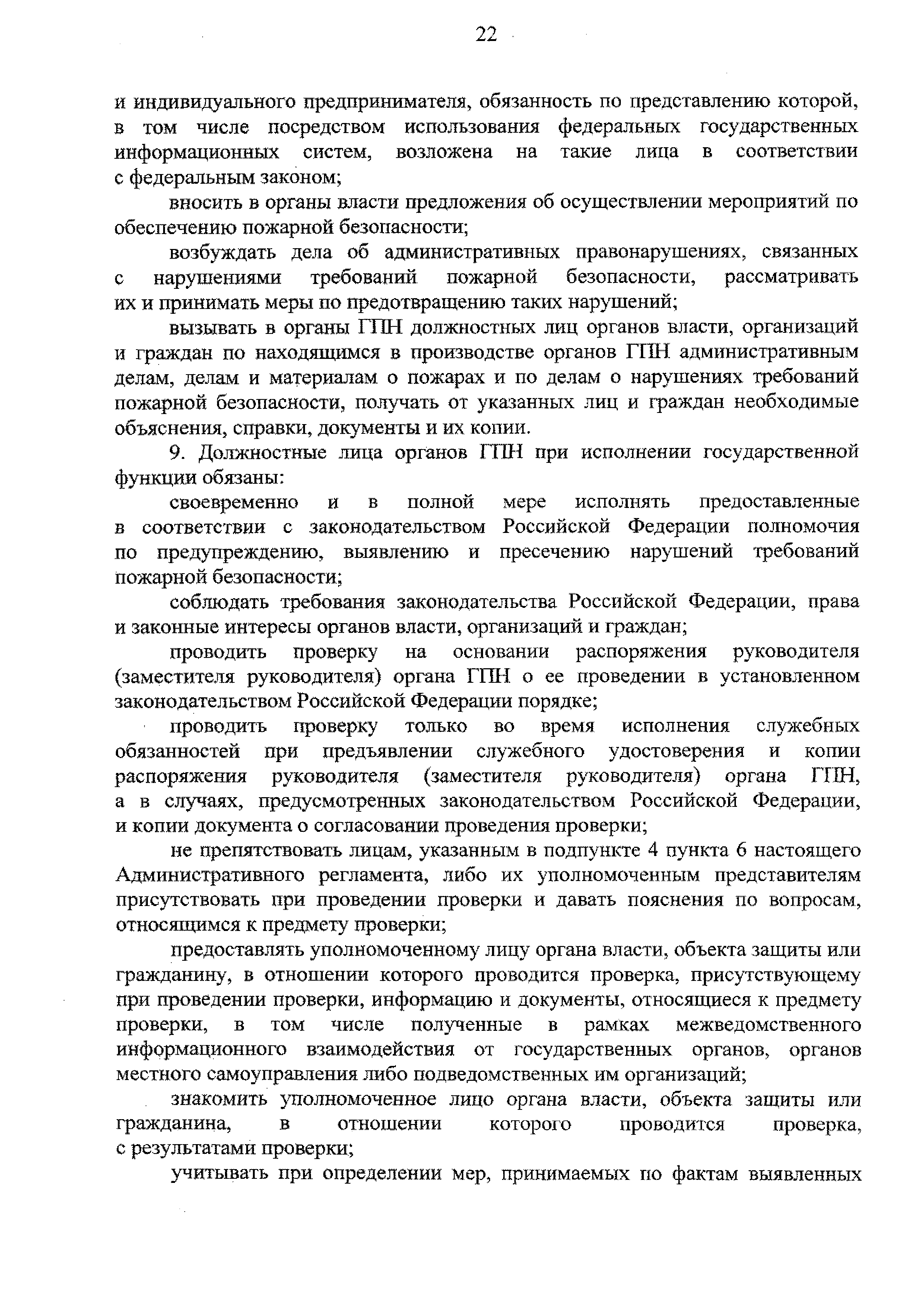 | Оглавление: | I. Общие положения II. Требования к порядку исполнения государственной функции III. Состав, последовательность и сроки выполнения административных процедур, требования к порядку их выполнения, в том числе особенности выполнения административных процедур в электронной форме IV. Порядок и формы контроля за исполнением государственной функции V. Досудебный (внесудебный) порядок обжалования решений и действий (бездействия) органа, исполняющего государственную функцию, а также его должностных лиц Приложение № 1. Сведения о местонахождении и контактных телефонах департамента надзорной деятельности и профилактической работы МЧС России, главных управлений МЧС России по субъектам Российской Федерации Приложение № 2. Учетная карточка консультации гражданина Приложение № 3. Заключение о соответствии (несоответствии) объекта защиты требованиям пожарной безопасности Приложение № 4. Журнал учета выданных заключений о соответствии (несоответствии) объекта защиты требованиям пожарной безопасности Приложение № 5. Блок-схема исполнения государственной функции Приложение № 6. Перечень объектов защиты и (или) территорий (земельных участков), которым присвоена категория риска Приложение № 7. Журнал учета объектов защиты и (или) территорий (земельных участков), органов власти Приложение № 8. Ежегодный план проведения плановых проверок объектов защиты и (или) территорий (земельных участков), правообладателями которых являются граждане, не являющиеся индивидуальными предпринимателями (за исключением объектов защиты - жилых помещений) Приложение № 9. Периодичность осуществления плановых проверок обязательных требований пожарной безопасности в зависимости от категории риска в соответствии с постановлением Правительства Российской Федерации № 806 Приложение № 10. План-график государственного инспектора по пожарному надзору осуществления государственной функции Приложение № 11. Журнал органа ГПН по учету проверок Приложение № 12. Блок-схема проведения административной процедуры плановой (внеплановой) проверки Приложение № 13. Контрольно-наблюдательное дело о противопожарном состоянии объекта защиты и (или) территории (земельного участка), (органа власти) Приложение № 14. Журнал учета дел об административных правонарушениях и представлений об устранении причин и условий, способствовавших совершению административного правонарушения Приложение № 15. Предостережение о недопустимости нарушения обязательных требований |