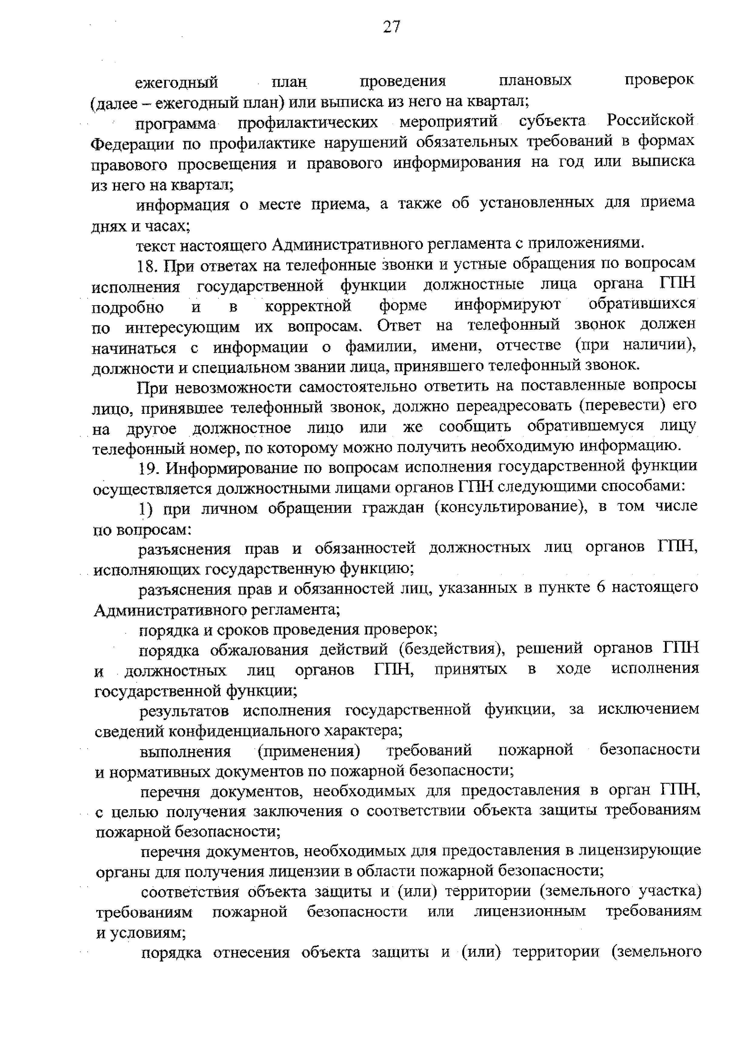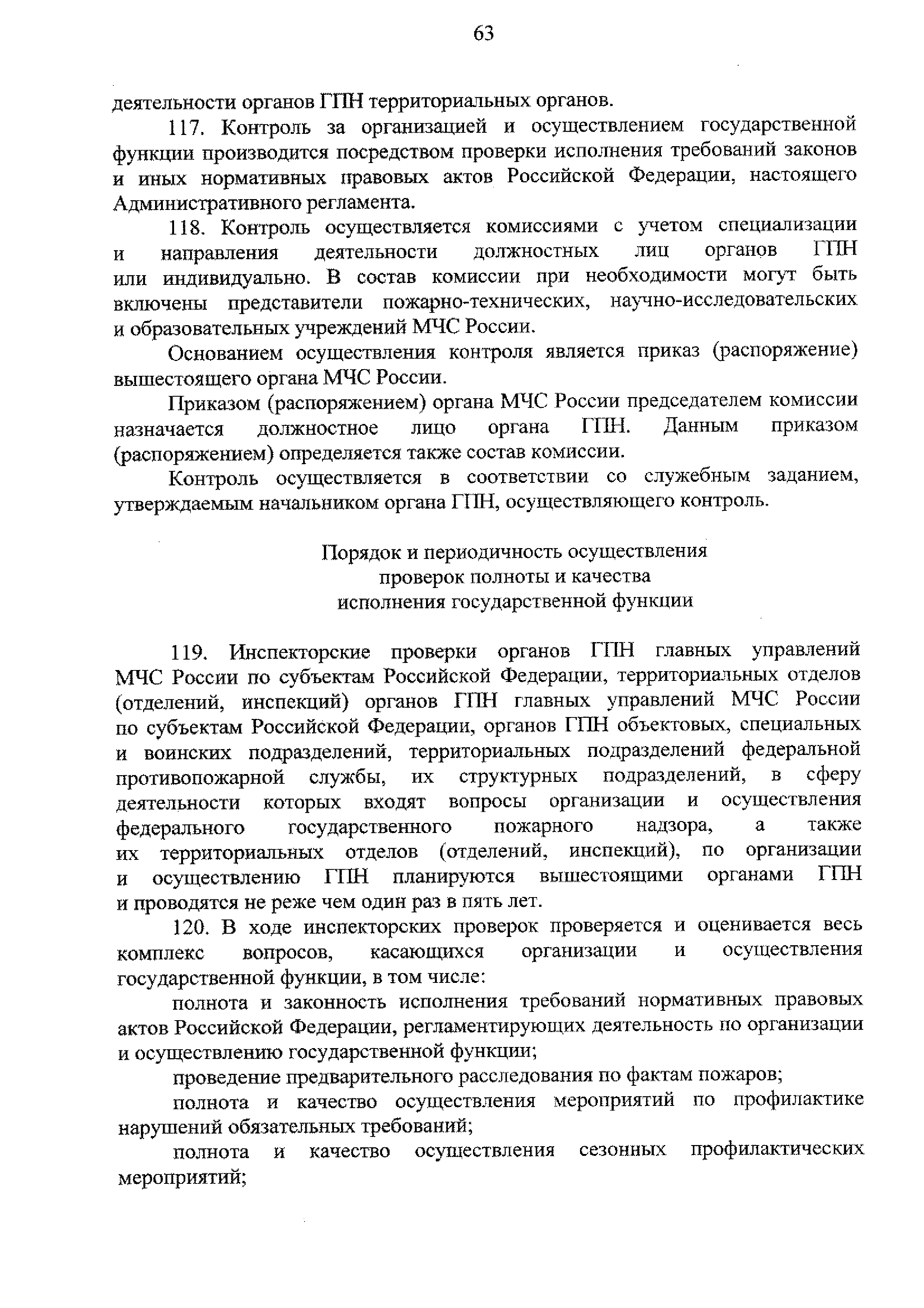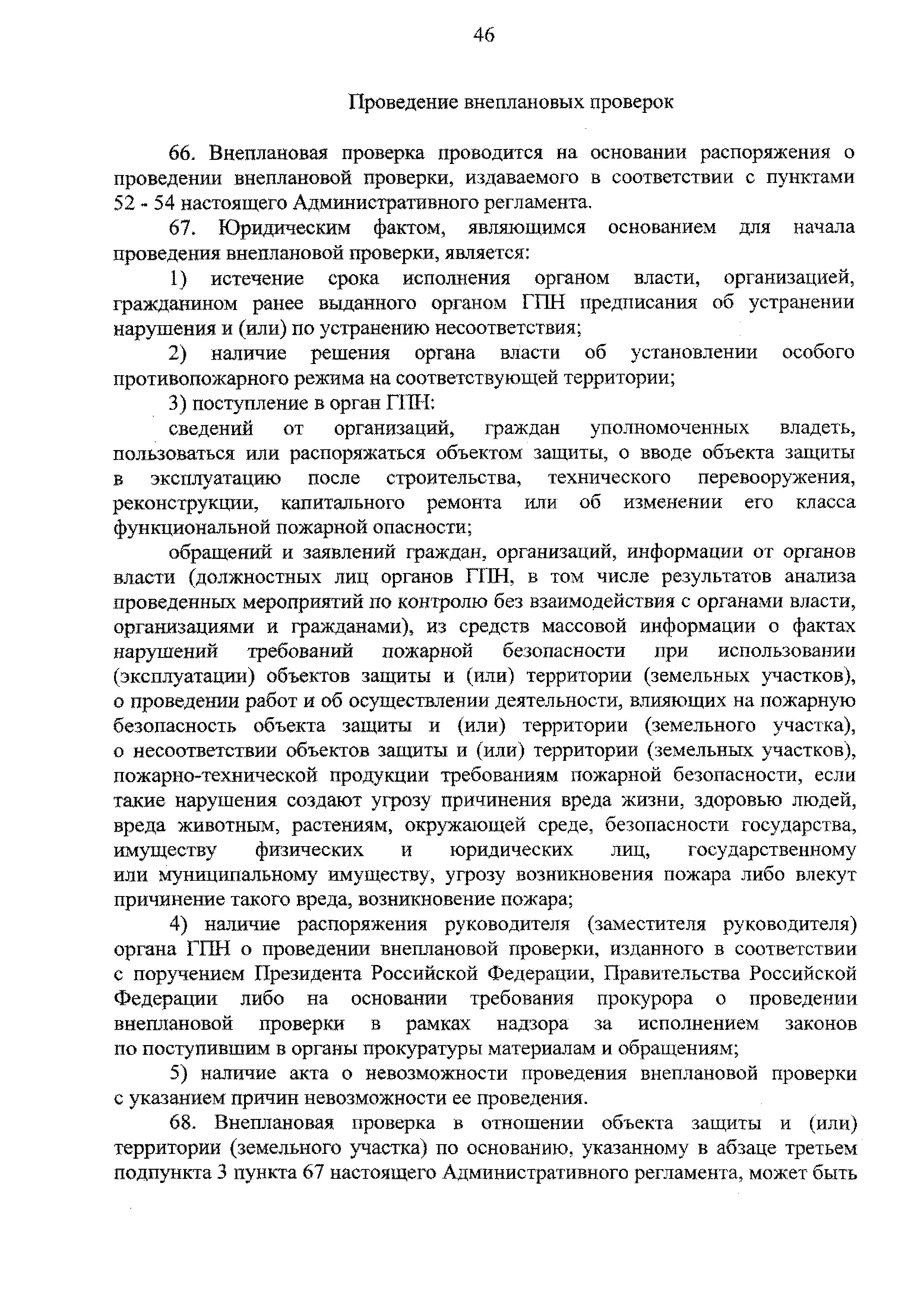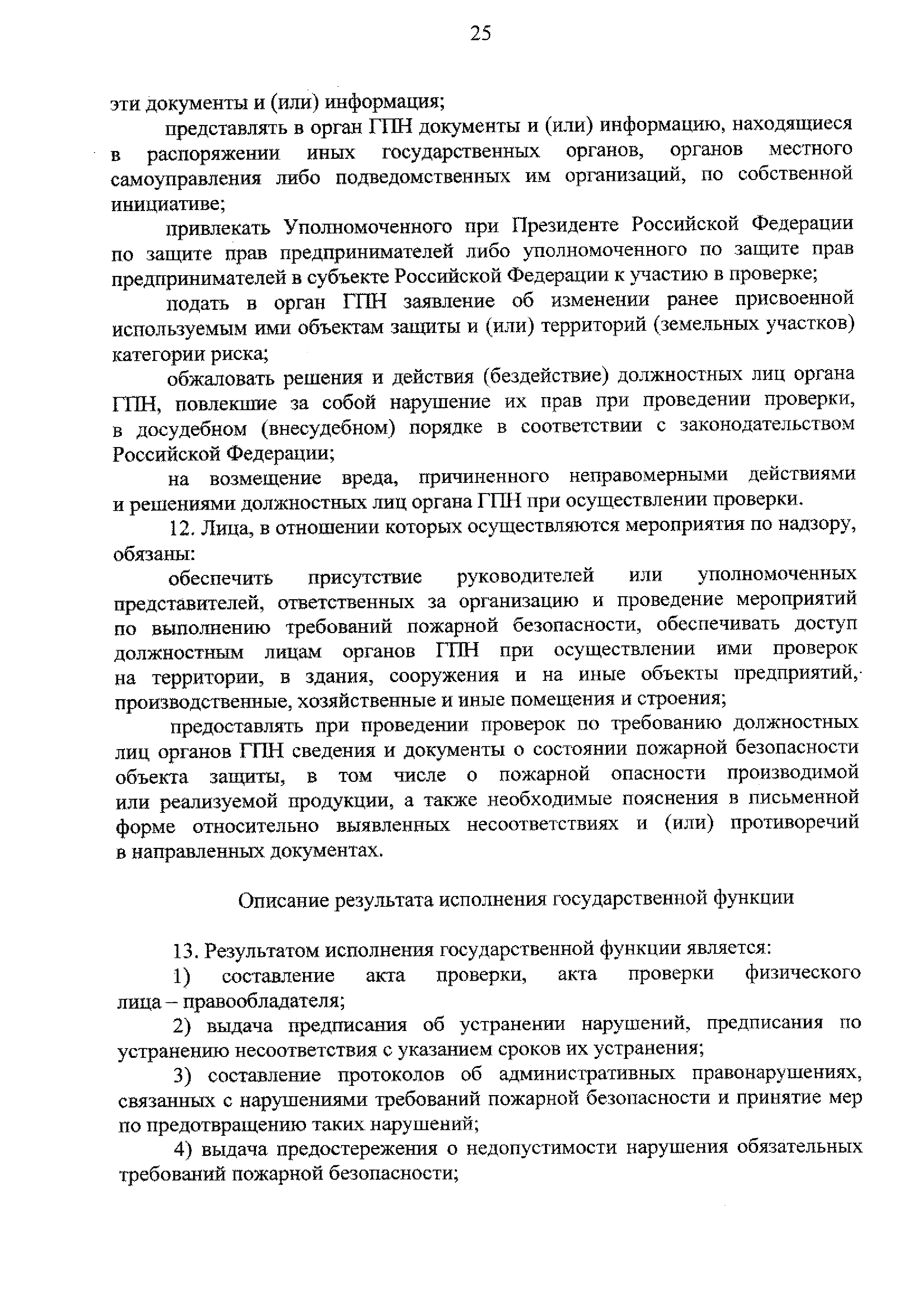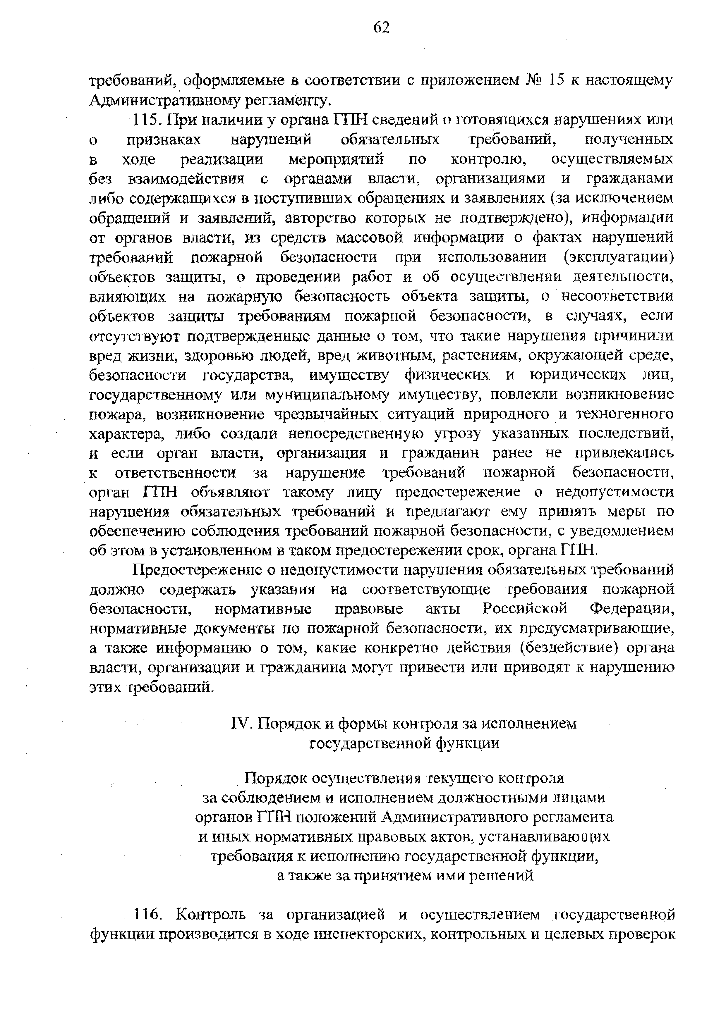 | Оглавление: | I. Общие положения II. Требования к порядку исполнения государственной функции III. Состав, последовательность и сроки выполнения административных процедур, требования к порядку их выполнения, в том числе особенности выполнения административных процедур в электронной форме IV. Порядок и формы контроля за исполнением государственной функции V. Досудебный (внесудебный) порядок обжалования решений и действий (бездействия) органа, исполняющего государственную функцию, а также его должностных лиц Приложение № 1. Сведения о местонахождении и контактных телефонах департамента надзорной деятельности и профилактической работы МЧС России, главных управлений МЧС России по субъектам Российской Федерации Приложение № 2. Учетная карточка консультации гражданина Приложение № 3. Заключение о соответствии (несоответствии) объекта защиты требованиям пожарной безопасности Приложение № 4. Журнал учета выданных заключений о соответствии (несоответствии) объекта защиты требованиям пожарной безопасности Приложение № 5. Блок-схема исполнения государственной функции Приложение № 6. Перечень объектов защиты и (или) территорий (земельных участков), которым присвоена категория риска Приложение № 7. Журнал учета объектов защиты и (или) территорий (земельных участков), органов власти Приложение № 8. Ежегодный план проведения плановых проверок объектов защиты и (или) территорий (земельных участков), правообладателями которых являются граждане, не являющиеся индивидуальными предпринимателями (за исключением объектов защиты - жилых помещений) Приложение № 9. Периодичность осуществления плановых проверок обязательных требований пожарной безопасности в зависимости от категории риска в соответствии с постановлением Правительства Российской Федерации № 806 Приложение № 10. План-график государственного инспектора по пожарному надзору осуществления государственной функции Приложение № 11. Журнал органа ГПН по учету проверок Приложение № 12. Блок-схема проведения административной процедуры плановой (внеплановой) проверки Приложение № 13. Контрольно-наблюдательное дело о противопожарном состоянии объекта защиты и (или) территории (земельного участка), (органа власти) Приложение № 14. Журнал учета дел об административных правонарушениях и представлений об устранении причин и условий, способствовавших совершению административного правонарушения Приложение № 15. Предостережение о недопустимости нарушения обязательных требований |