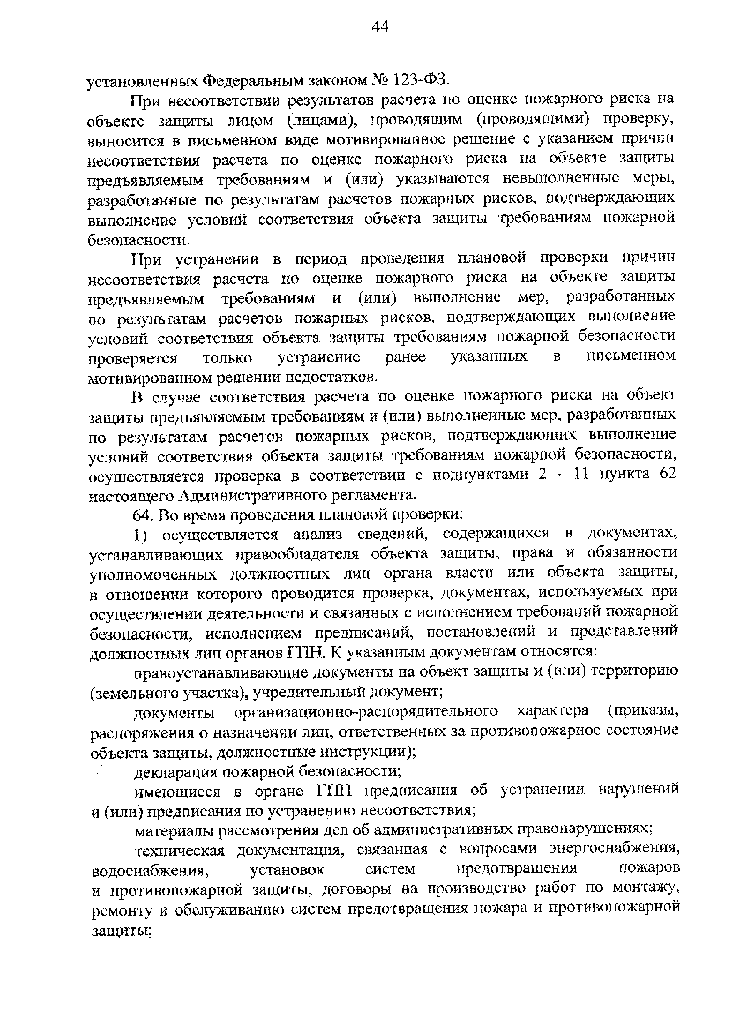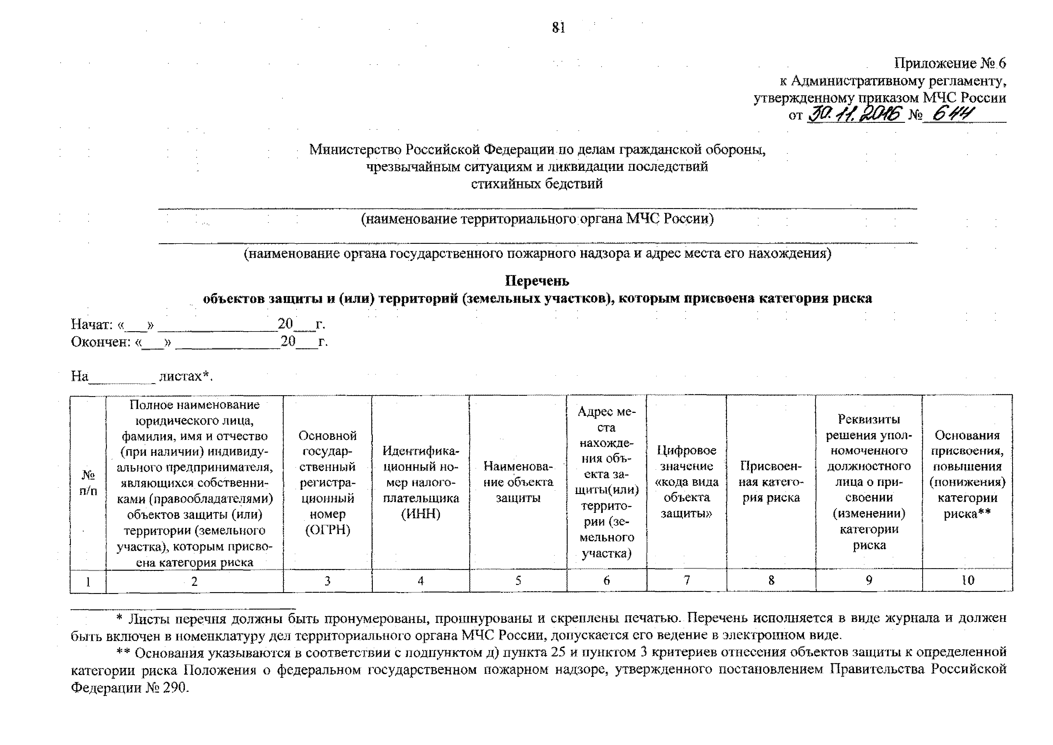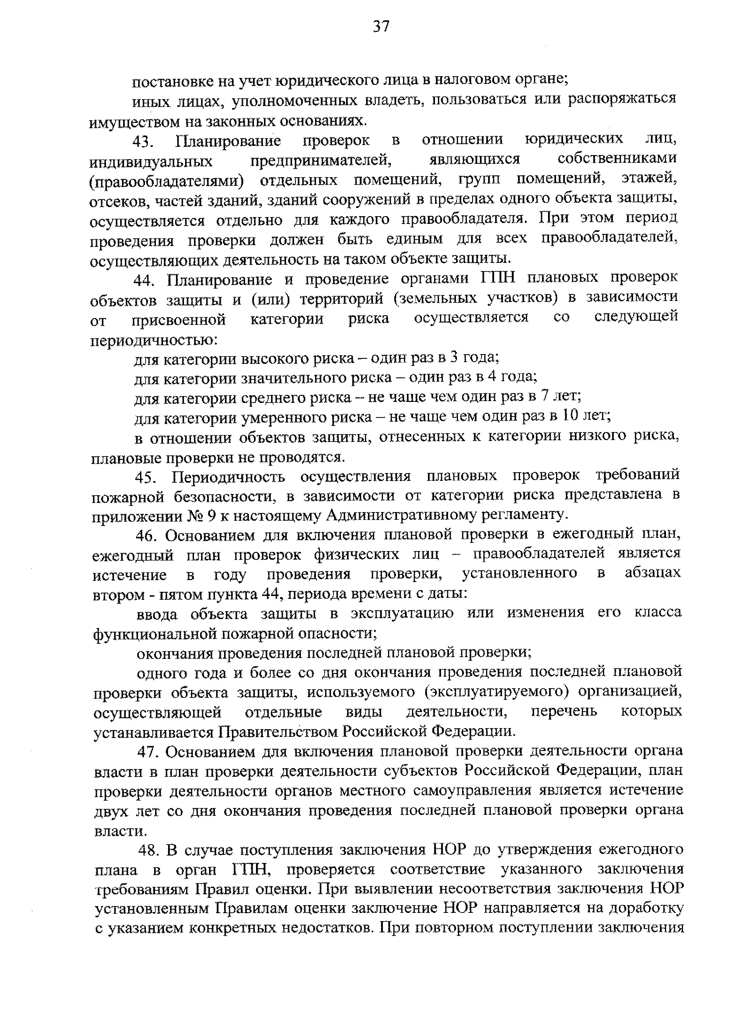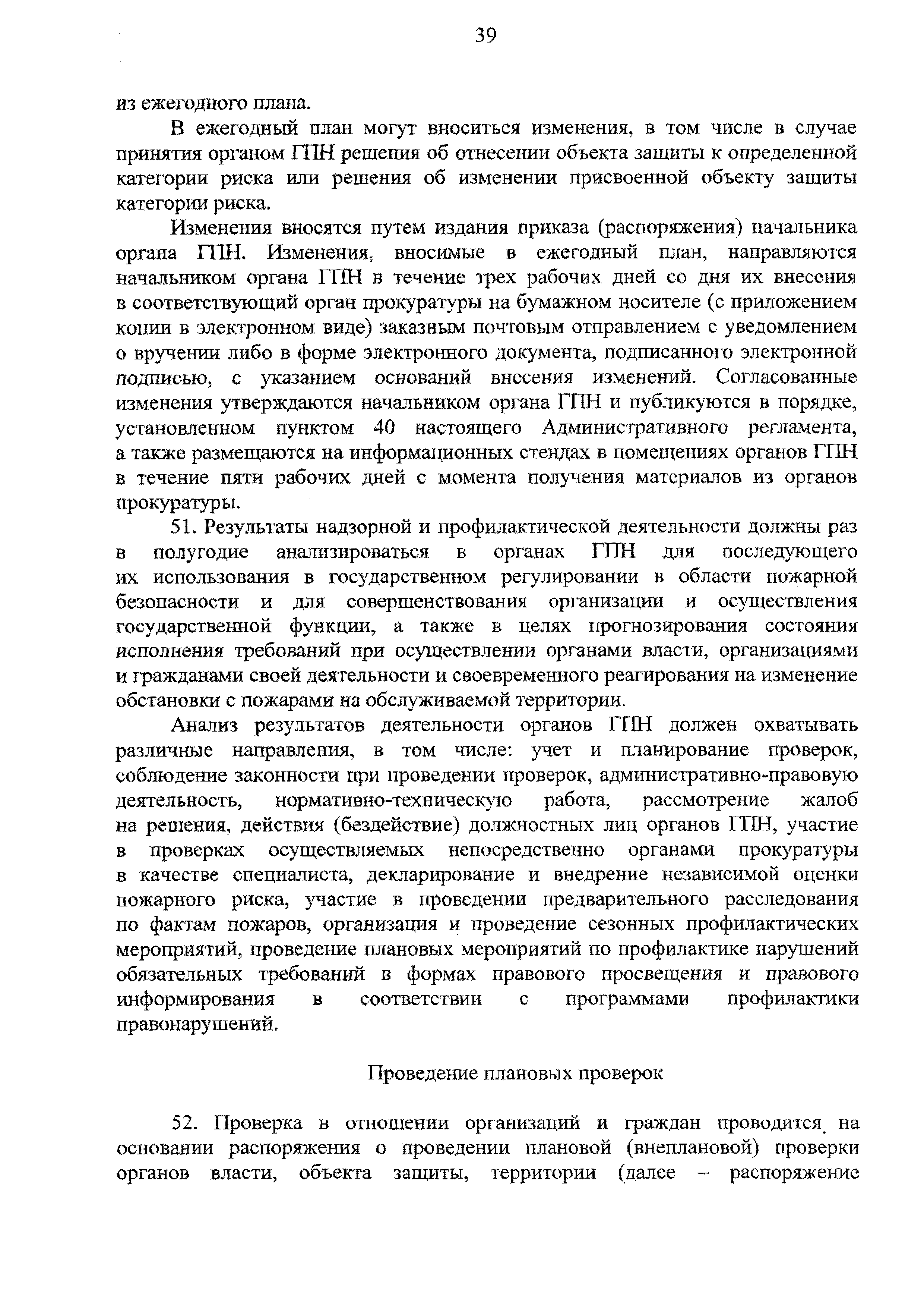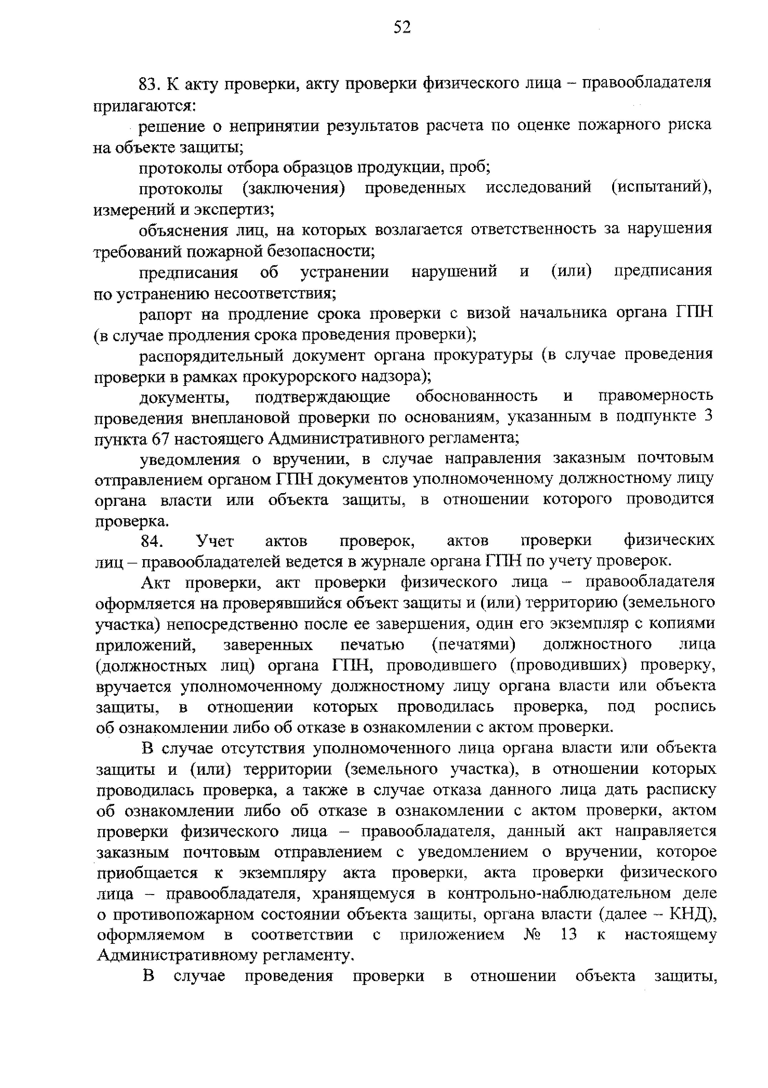 | Оглавление: | I. Общие положения II. Требования к порядку исполнения государственной функции III. Состав, последовательность и сроки выполнения административных процедур, требования к порядку их выполнения, в том числе особенности выполнения административных процедур в электронной форме IV. Порядок и формы контроля за исполнением государственной функции V. Досудебный (внесудебный) порядок обжалования решений и действий (бездействия) органа, исполняющего государственную функцию, а также его должностных лиц Приложение № 1. Сведения о местонахождении и контактных телефонах департамента надзорной деятельности и профилактической работы МЧС России, главных управлений МЧС России по субъектам Российской Федерации Приложение № 2. Учетная карточка консультации гражданина Приложение № 3. Заключение о соответствии (несоответствии) объекта защиты требованиям пожарной безопасности Приложение № 4. Журнал учета выданных заключений о соответствии (несоответствии) объекта защиты требованиям пожарной безопасности Приложение № 5. Блок-схема исполнения государственной функции Приложение № 6. Перечень объектов защиты и (или) территорий (земельных участков), которым присвоена категория риска Приложение № 7. Журнал учета объектов защиты и (или) территорий (земельных участков), органов власти Приложение № 8. Ежегодный план проведения плановых проверок объектов защиты и (или) территорий (земельных участков), правообладателями которых являются граждане, не являющиеся индивидуальными предпринимателями (за исключением объектов защиты - жилых помещений) Приложение № 9. Периодичность осуществления плановых проверок обязательных требований пожарной безопасности в зависимости от категории риска в соответствии с постановлением Правительства Российской Федерации № 806 Приложение № 10. План-график государственного инспектора по пожарному надзору осуществления государственной функции Приложение № 11. Журнал органа ГПН по учету проверок Приложение № 12. Блок-схема проведения административной процедуры плановой (внеплановой) проверки Приложение № 13. Контрольно-наблюдательное дело о противопожарном состоянии объекта защиты и (или) территории (земельного участка), (органа власти) Приложение № 14. Журнал учета дел об административных правонарушениях и представлений об устранении причин и условий, способствовавших совершению административного правонарушения Приложение № 15. Предостережение о недопустимости нарушения обязательных требований |