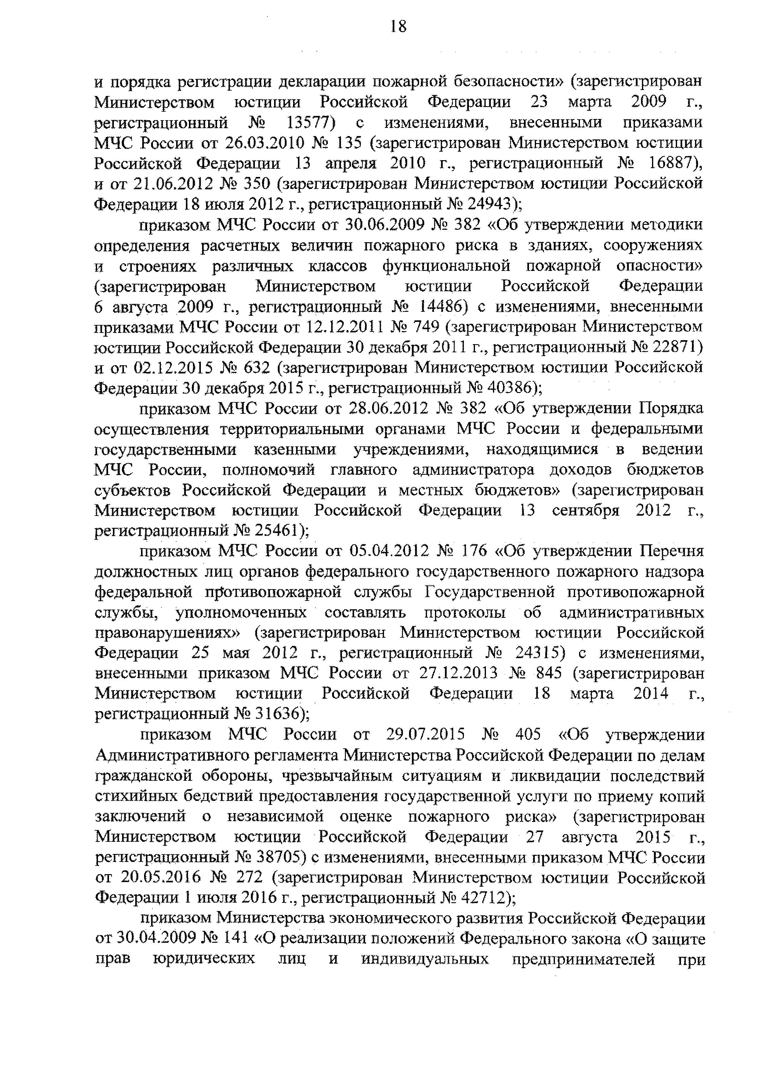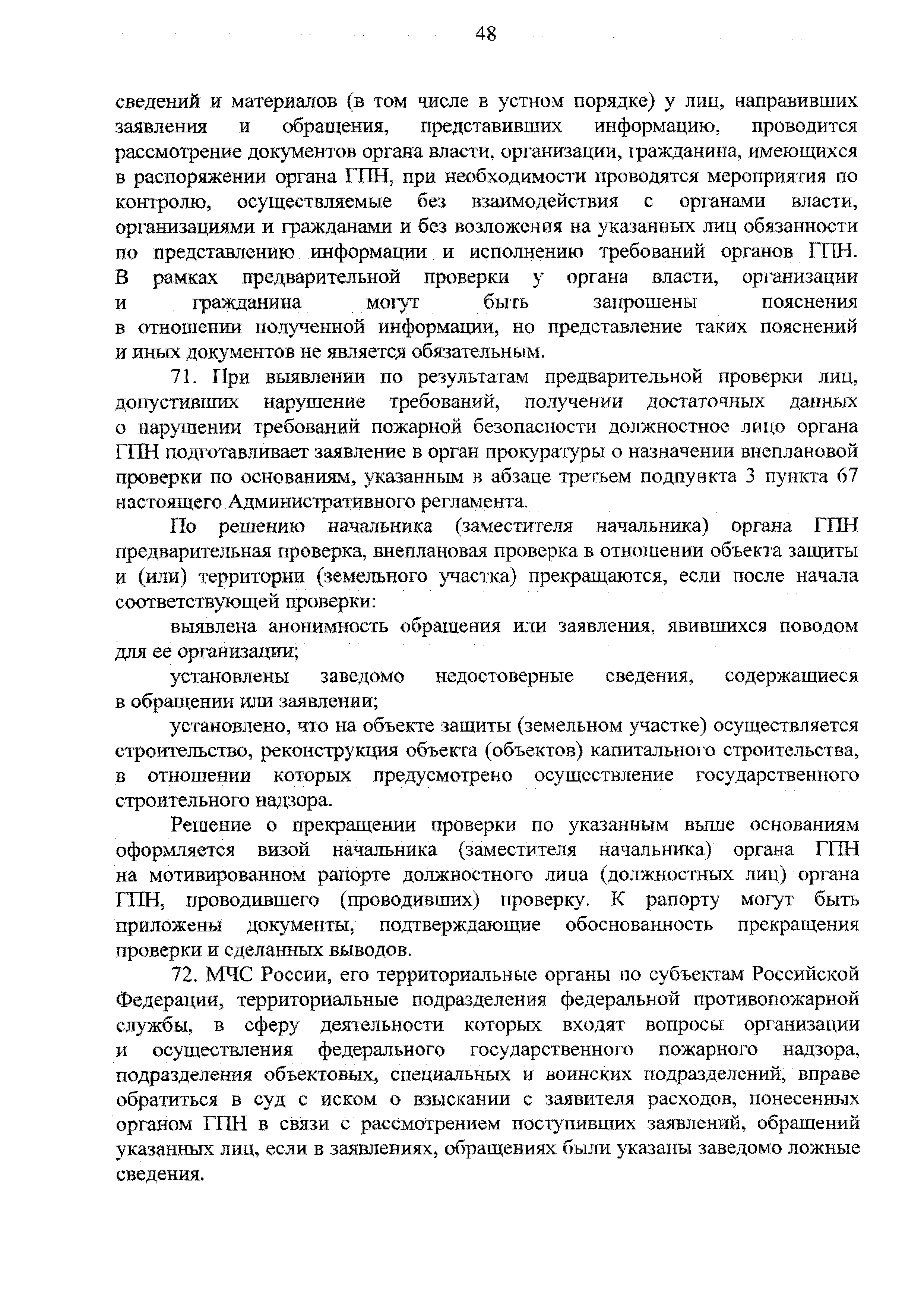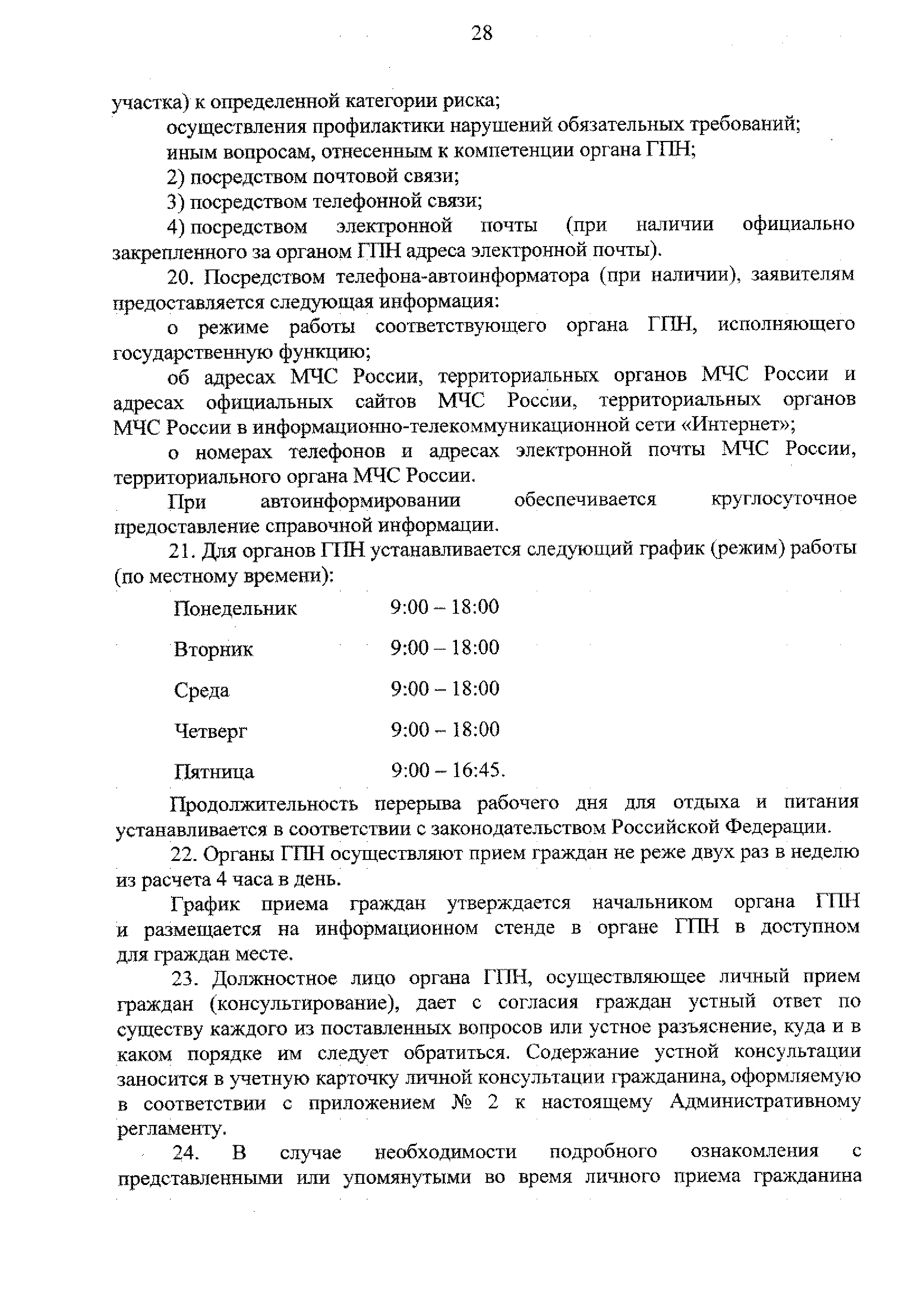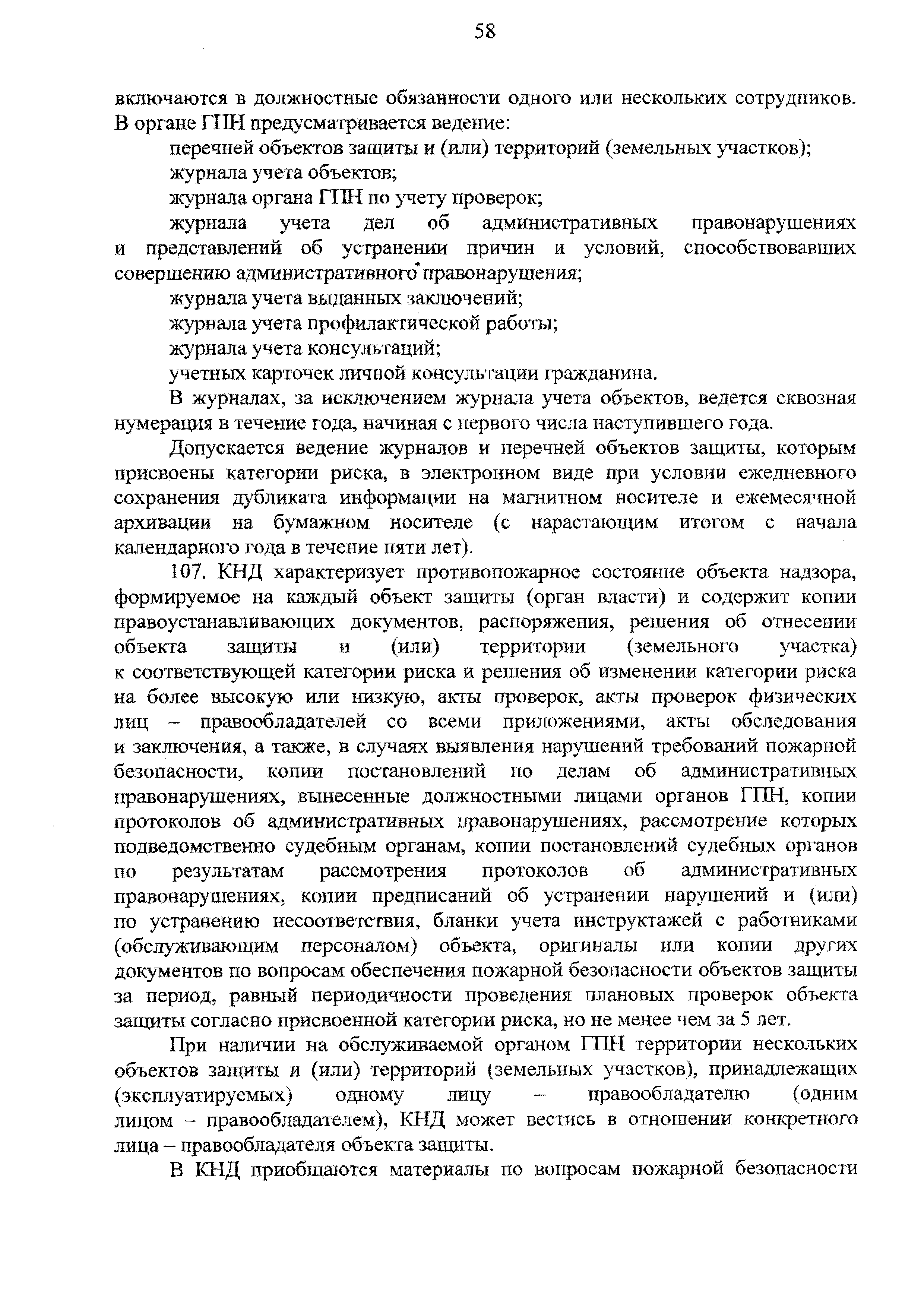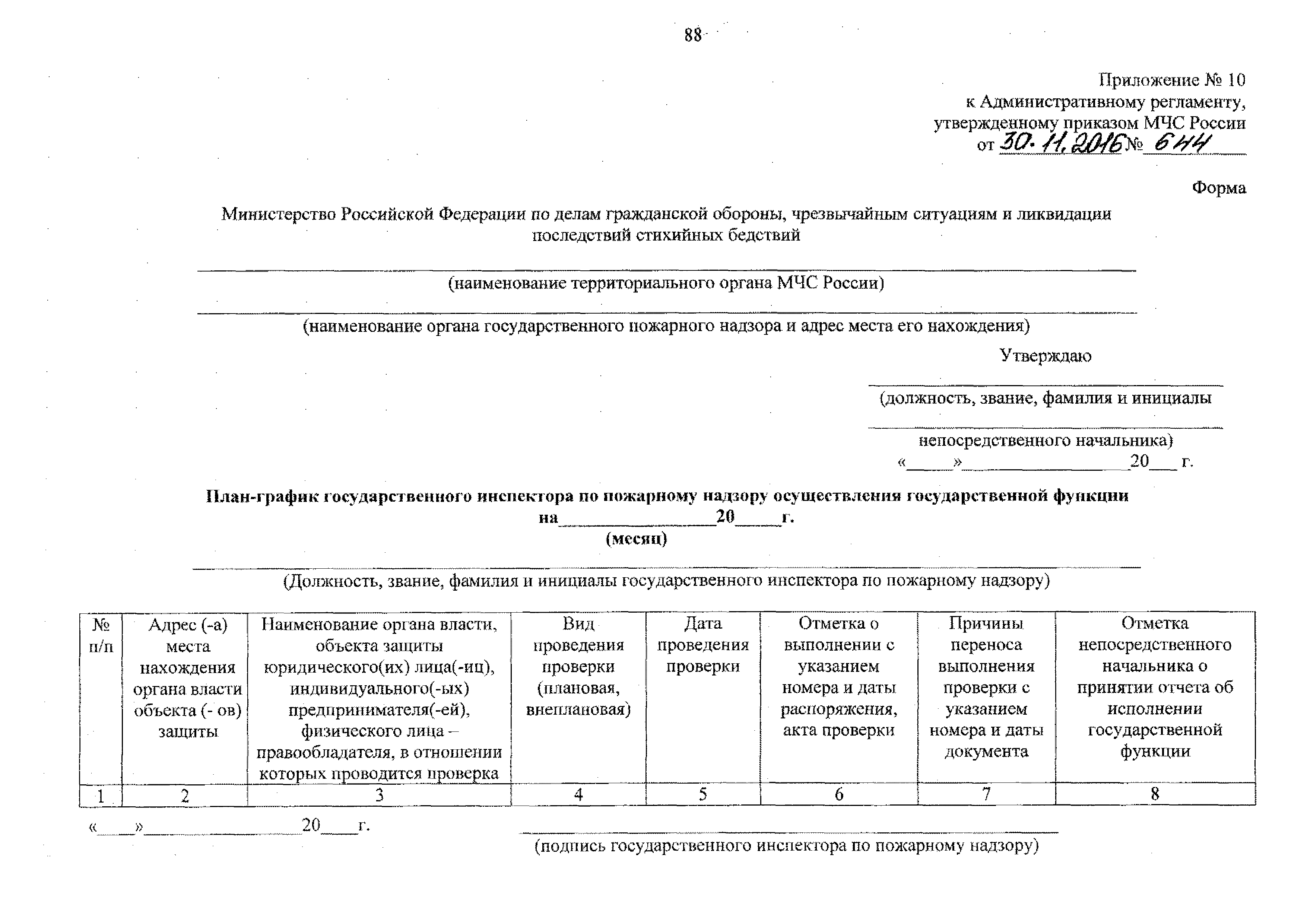 | Оглавление: | I. Общие положения II. Требования к порядку исполнения государственной функции III. Состав, последовательность и сроки выполнения административных процедур, требования к порядку их выполнения, в том числе особенности выполнения административных процедур в электронной форме IV. Порядок и формы контроля за исполнением государственной функции V. Досудебный (внесудебный) порядок обжалования решений и действий (бездействия) органа, исполняющего государственную функцию, а также его должностных лиц Приложение № 1. Сведения о местонахождении и контактных телефонах департамента надзорной деятельности и профилактической работы МЧС России, главных управлений МЧС России по субъектам Российской Федерации Приложение № 2. Учетная карточка консультации гражданина Приложение № 3. Заключение о соответствии (несоответствии) объекта защиты требованиям пожарной безопасности Приложение № 4. Журнал учета выданных заключений о соответствии (несоответствии) объекта защиты требованиям пожарной безопасности Приложение № 5. Блок-схема исполнения государственной функции Приложение № 6. Перечень объектов защиты и (или) территорий (земельных участков), которым присвоена категория риска Приложение № 7. Журнал учета объектов защиты и (или) территорий (земельных участков), органов власти Приложение № 8. Ежегодный план проведения плановых проверок объектов защиты и (или) территорий (земельных участков), правообладателями которых являются граждане, не являющиеся индивидуальными предпринимателями (за исключением объектов защиты - жилых помещений) Приложение № 9. Периодичность осуществления плановых проверок обязательных требований пожарной безопасности в зависимости от категории риска в соответствии с постановлением Правительства Российской Федерации № 806 Приложение № 10. План-график государственного инспектора по пожарному надзору осуществления государственной функции Приложение № 11. Журнал органа ГПН по учету проверок Приложение № 12. Блок-схема проведения административной процедуры плановой (внеплановой) проверки Приложение № 13. Контрольно-наблюдательное дело о противопожарном состоянии объекта защиты и (или) территории (земельного участка), (органа власти) Приложение № 14. Журнал учета дел об административных правонарушениях и представлений об устранении причин и условий, способствовавших совершению административного правонарушения Приложение № 15. Предостережение о недопустимости нарушения обязательных требований |