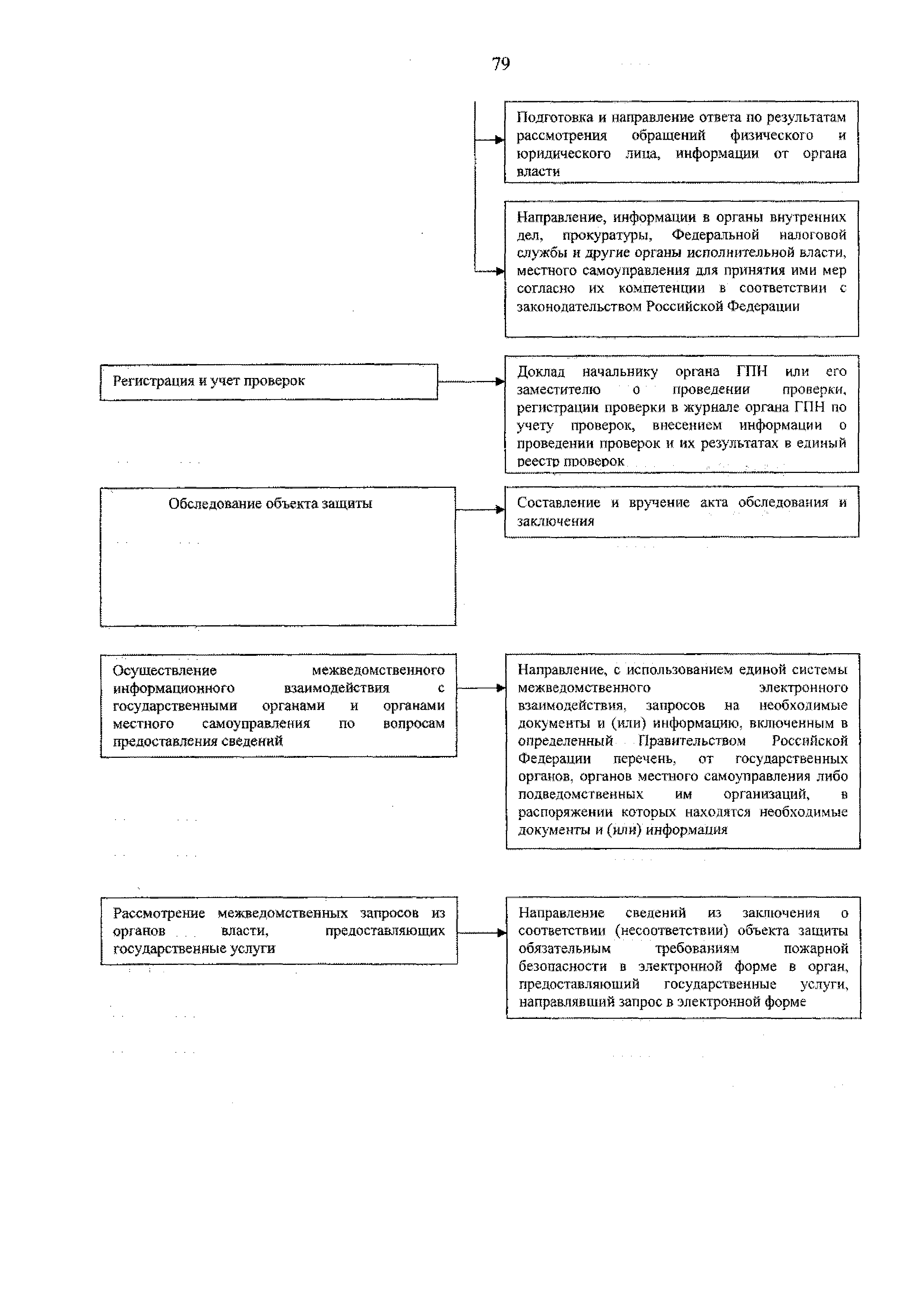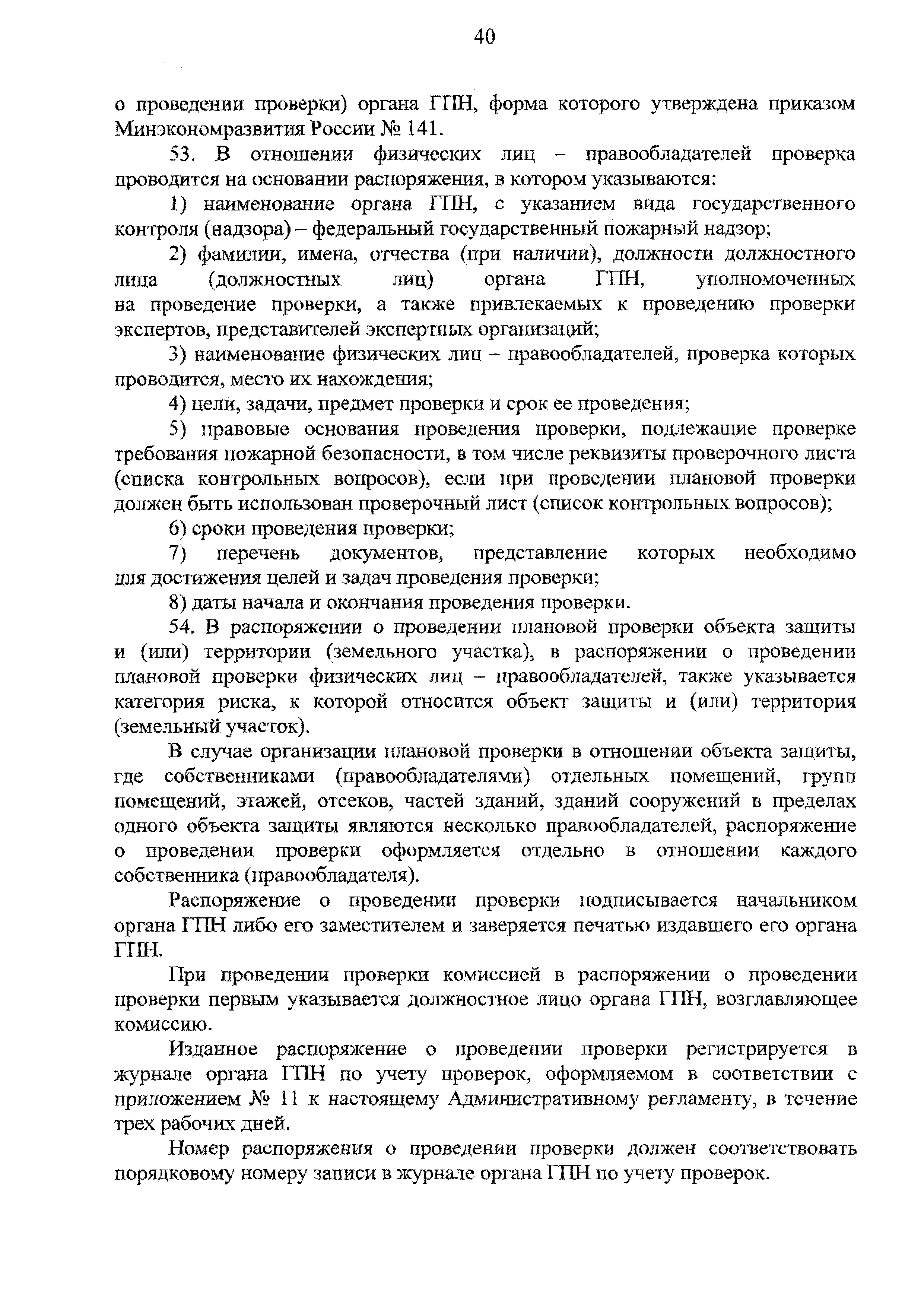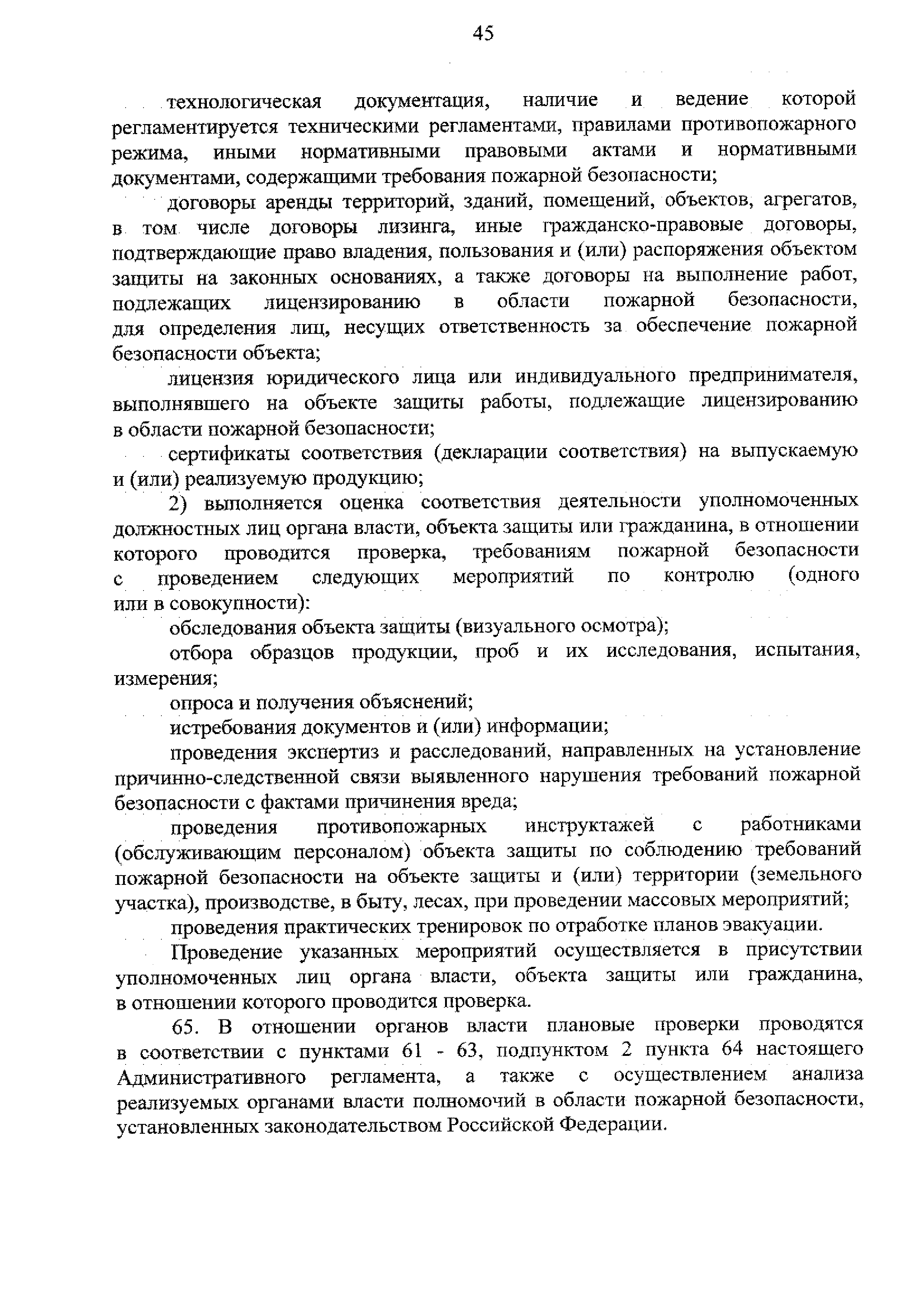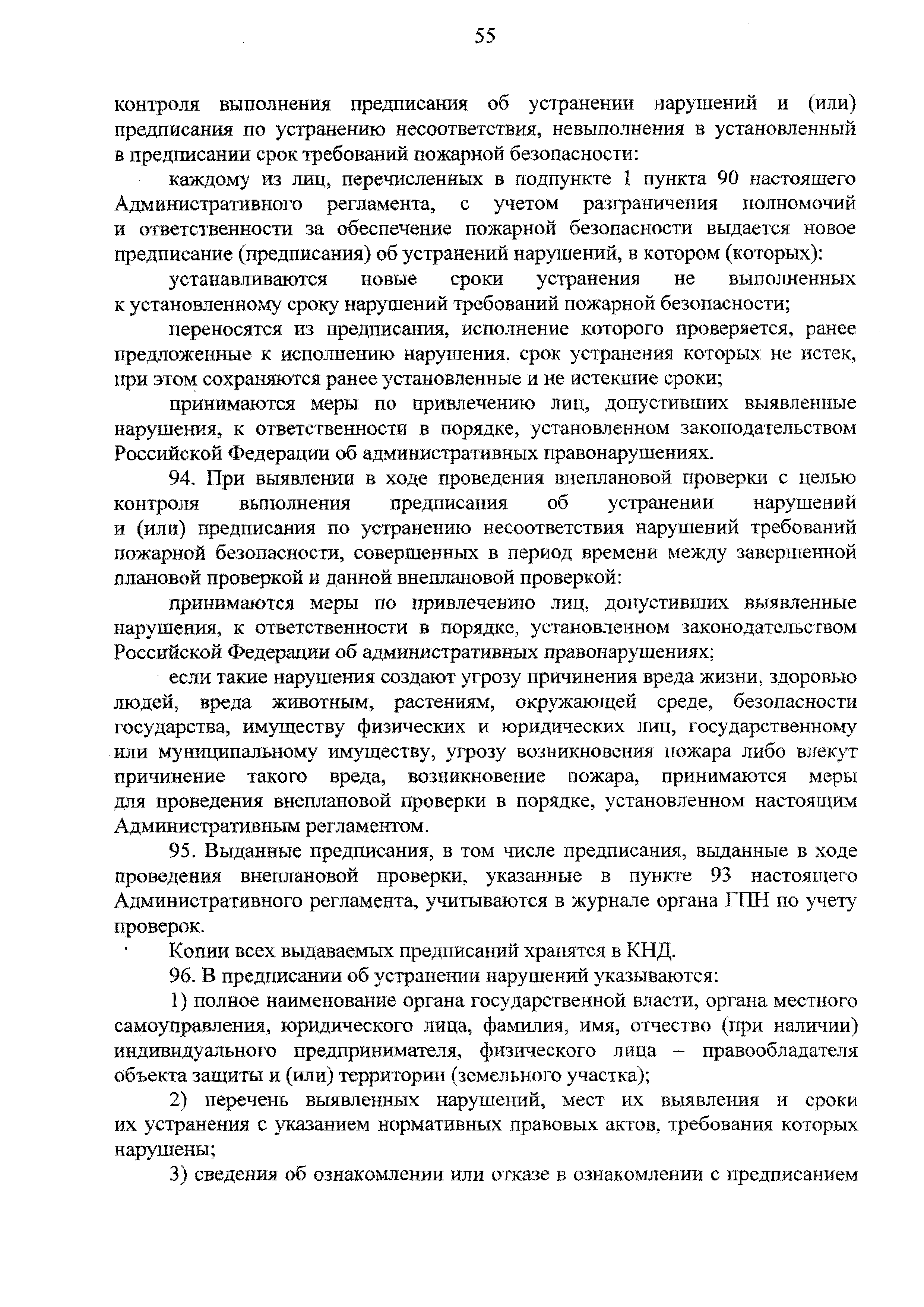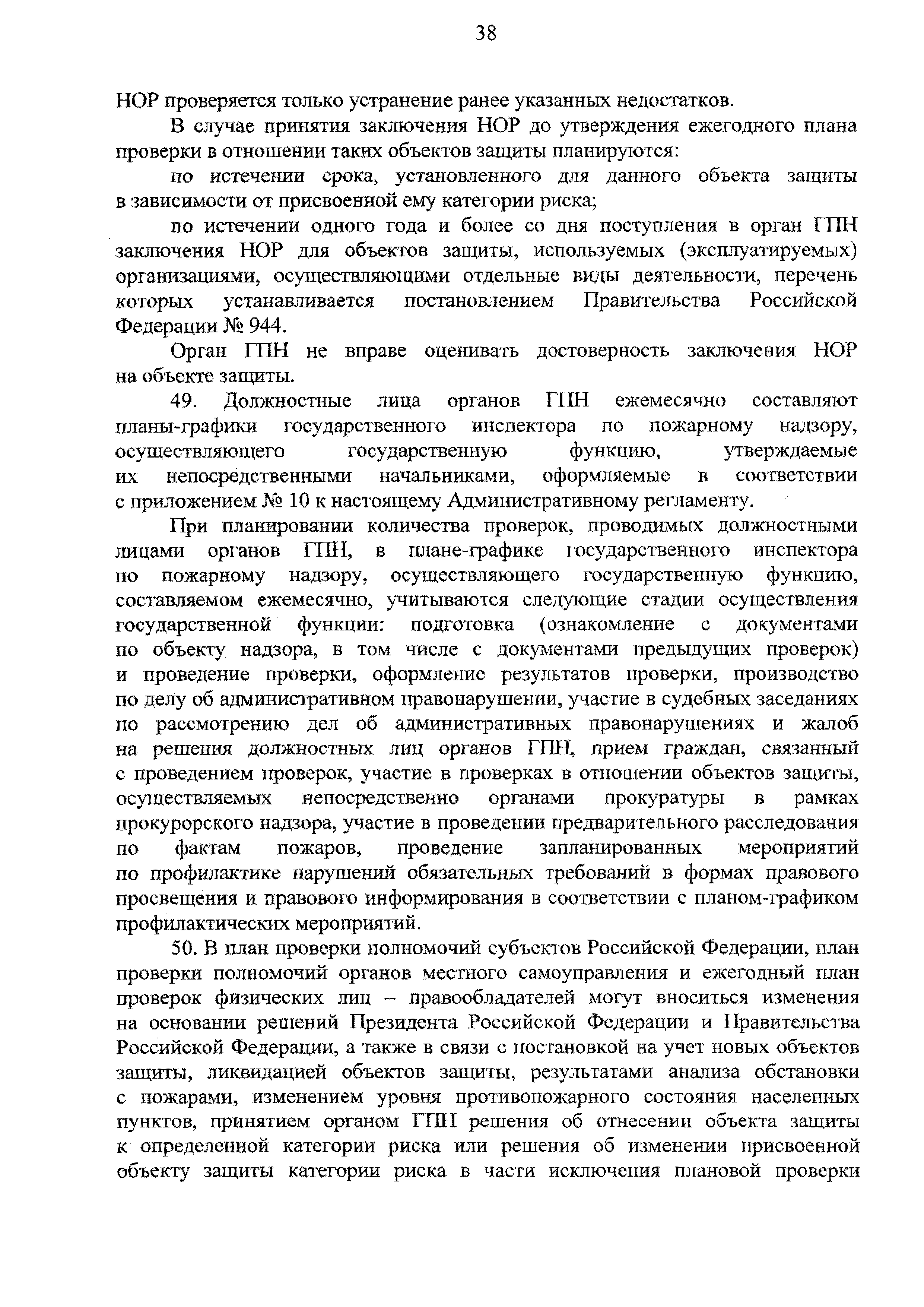 | Оглавление: | I. Общие положения II. Требования к порядку исполнения государственной функции III. Состав, последовательность и сроки выполнения административных процедур, требования к порядку их выполнения, в том числе особенности выполнения административных процедур в электронной форме IV. Порядок и формы контроля за исполнением государственной функции V. Досудебный (внесудебный) порядок обжалования решений и действий (бездействия) органа, исполняющего государственную функцию, а также его должностных лиц Приложение № 1. Сведения о местонахождении и контактных телефонах департамента надзорной деятельности и профилактической работы МЧС России, главных управлений МЧС России по субъектам Российской Федерации Приложение № 2. Учетная карточка консультации гражданина Приложение № 3. Заключение о соответствии (несоответствии) объекта защиты требованиям пожарной безопасности Приложение № 4. Журнал учета выданных заключений о соответствии (несоответствии) объекта защиты требованиям пожарной безопасности Приложение № 5. Блок-схема исполнения государственной функции Приложение № 6. Перечень объектов защиты и (или) территорий (земельных участков), которым присвоена категория риска Приложение № 7. Журнал учета объектов защиты и (или) территорий (земельных участков), органов власти Приложение № 8. Ежегодный план проведения плановых проверок объектов защиты и (или) территорий (земельных участков), правообладателями которых являются граждане, не являющиеся индивидуальными предпринимателями (за исключением объектов защиты - жилых помещений) Приложение № 9. Периодичность осуществления плановых проверок обязательных требований пожарной безопасности в зависимости от категории риска в соответствии с постановлением Правительства Российской Федерации № 806 Приложение № 10. План-график государственного инспектора по пожарному надзору осуществления государственной функции Приложение № 11. Журнал органа ГПН по учету проверок Приложение № 12. Блок-схема проведения административной процедуры плановой (внеплановой) проверки Приложение № 13. Контрольно-наблюдательное дело о противопожарном состоянии объекта защиты и (или) территории (земельного участка), (органа власти) Приложение № 14. Журнал учета дел об административных правонарушениях и представлений об устранении причин и условий, способствовавших совершению административного правонарушения Приложение № 15. Предостережение о недопустимости нарушения обязательных требований |