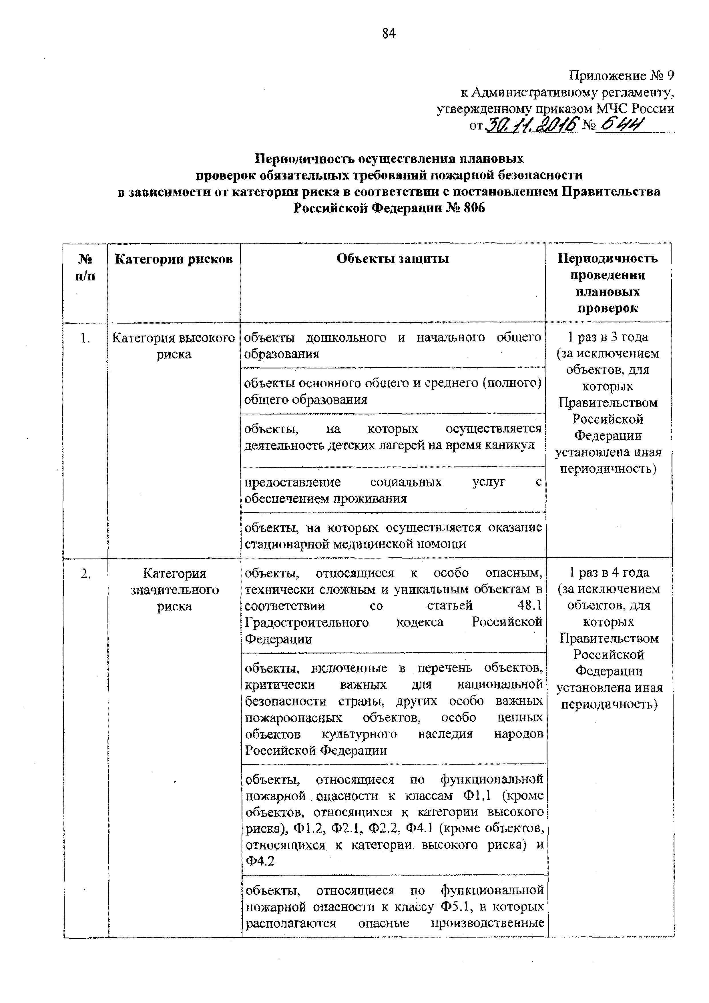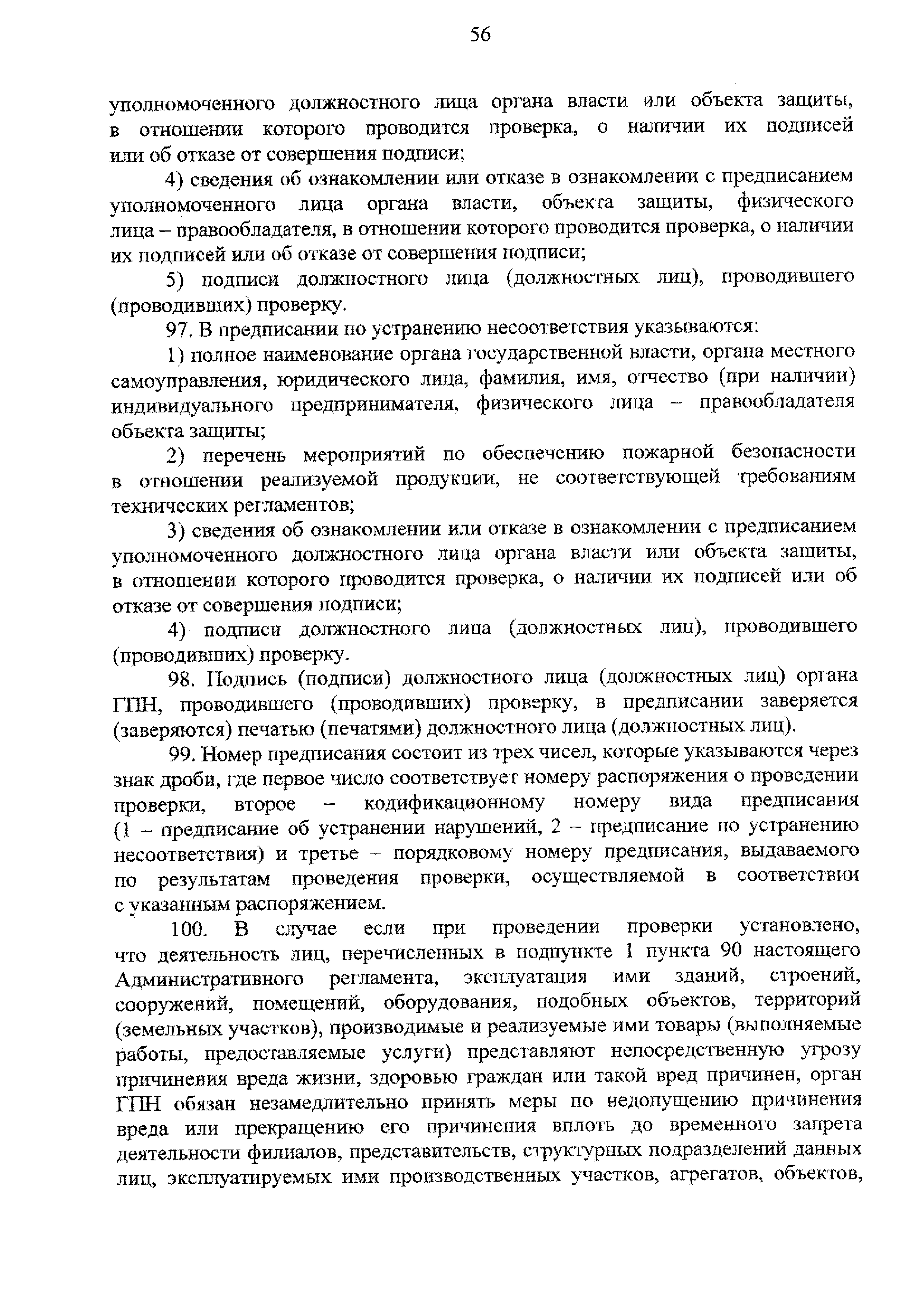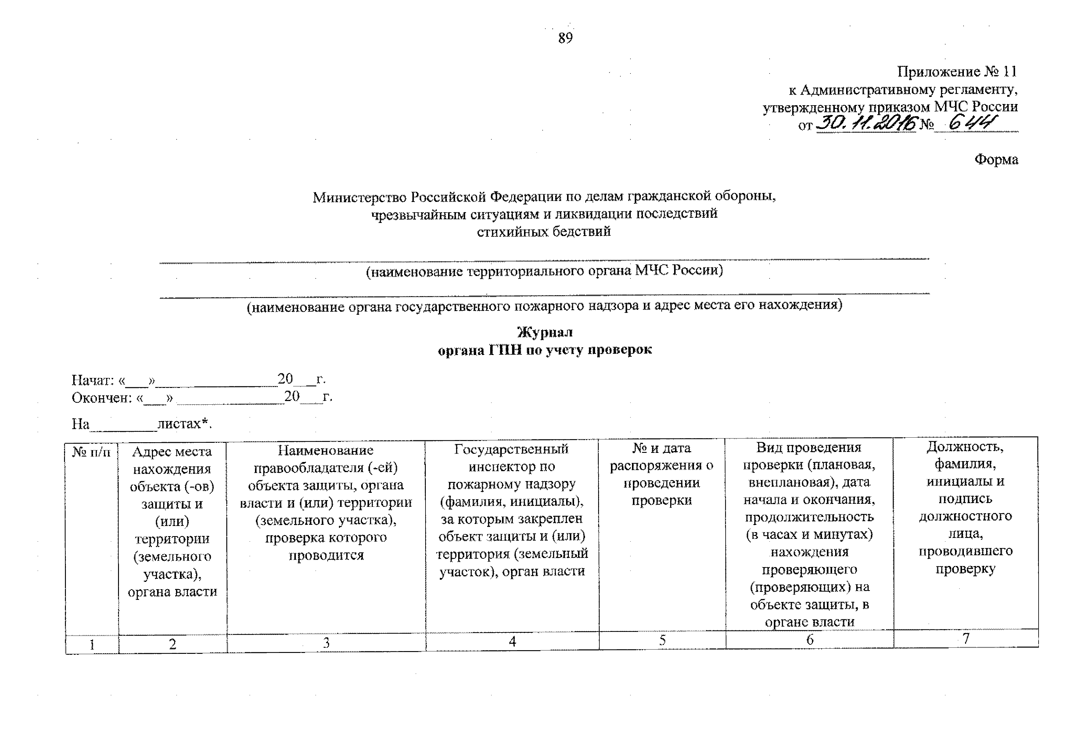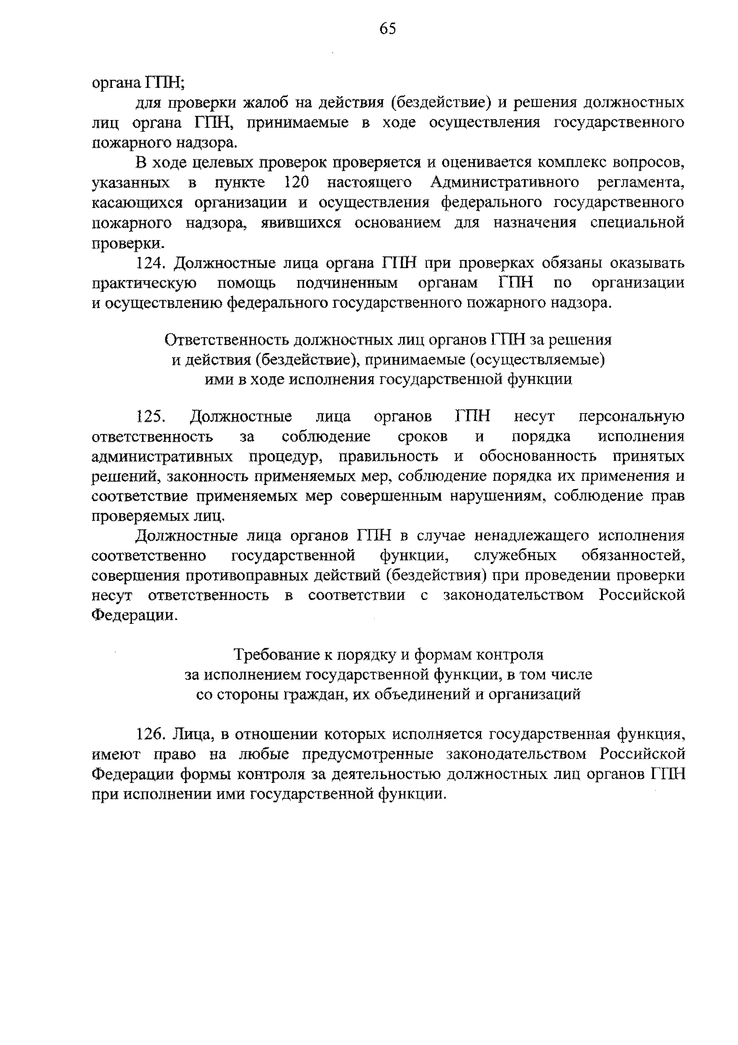 | Оглавление: | I. Общие положения II. Требования к порядку исполнения государственной функции III. Состав, последовательность и сроки выполнения административных процедур, требования к порядку их выполнения, в том числе особенности выполнения административных процедур в электронной форме IV. Порядок и формы контроля за исполнением государственной функции V. Досудебный (внесудебный) порядок обжалования решений и действий (бездействия) органа, исполняющего государственную функцию, а также его должностных лиц Приложение № 1. Сведения о местонахождении и контактных телефонах департамента надзорной деятельности и профилактической работы МЧС России, главных управлений МЧС России по субъектам Российской Федерации Приложение № 2. Учетная карточка консультации гражданина Приложение № 3. Заключение о соответствии (несоответствии) объекта защиты требованиям пожарной безопасности Приложение № 4. Журнал учета выданных заключений о соответствии (несоответствии) объекта защиты требованиям пожарной безопасности Приложение № 5. Блок-схема исполнения государственной функции Приложение № 6. Перечень объектов защиты и (или) территорий (земельных участков), которым присвоена категория риска Приложение № 7. Журнал учета объектов защиты и (или) территорий (земельных участков), органов власти Приложение № 8. Ежегодный план проведения плановых проверок объектов защиты и (или) территорий (земельных участков), правообладателями которых являются граждане, не являющиеся индивидуальными предпринимателями (за исключением объектов защиты - жилых помещений) Приложение № 9. Периодичность осуществления плановых проверок обязательных требований пожарной безопасности в зависимости от категории риска в соответствии с постановлением Правительства Российской Федерации № 806 Приложение № 10. План-график государственного инспектора по пожарному надзору осуществления государственной функции Приложение № 11. Журнал органа ГПН по учету проверок Приложение № 12. Блок-схема проведения административной процедуры плановой (внеплановой) проверки Приложение № 13. Контрольно-наблюдательное дело о противопожарном состоянии объекта защиты и (или) территории (земельного участка), (органа власти) Приложение № 14. Журнал учета дел об административных правонарушениях и представлений об устранении причин и условий, способствовавших совершению административного правонарушения Приложение № 15. Предостережение о недопустимости нарушения обязательных требований |