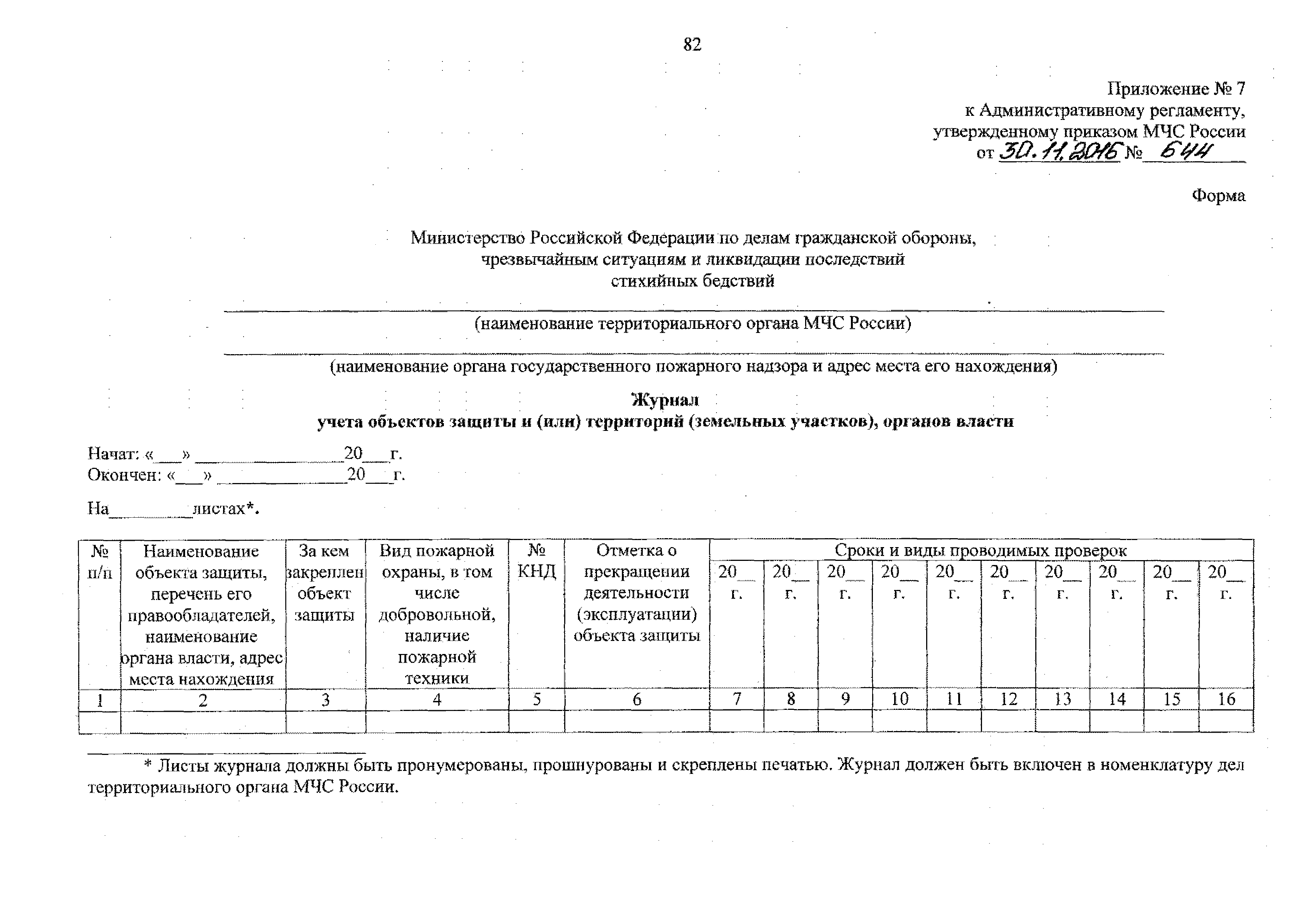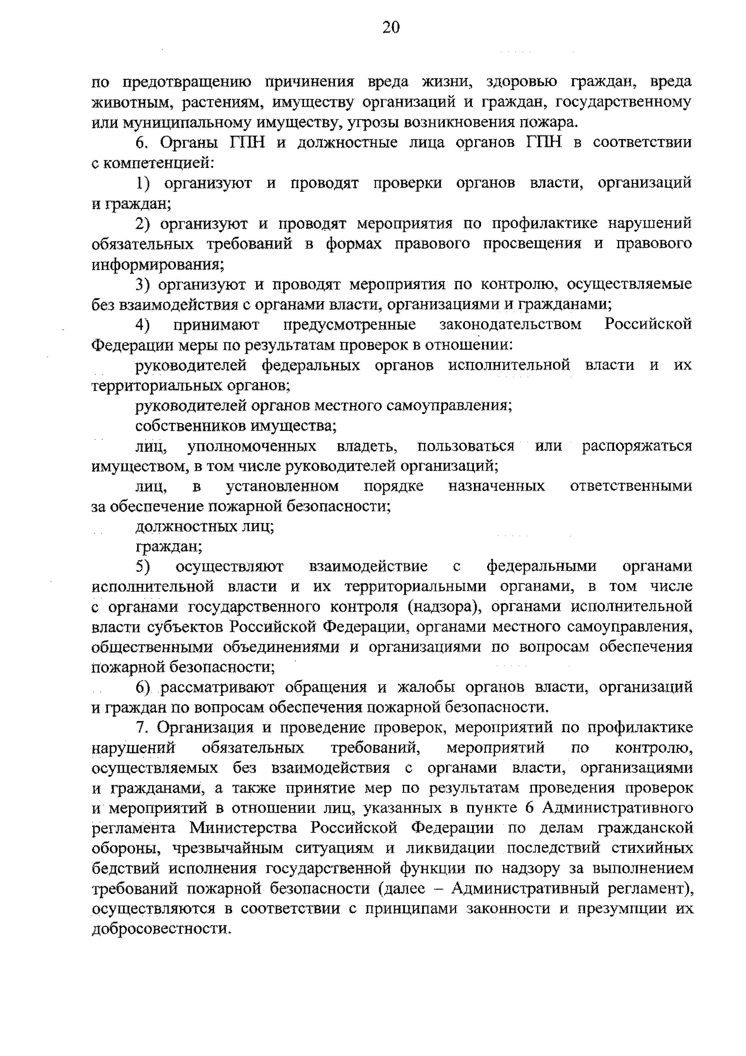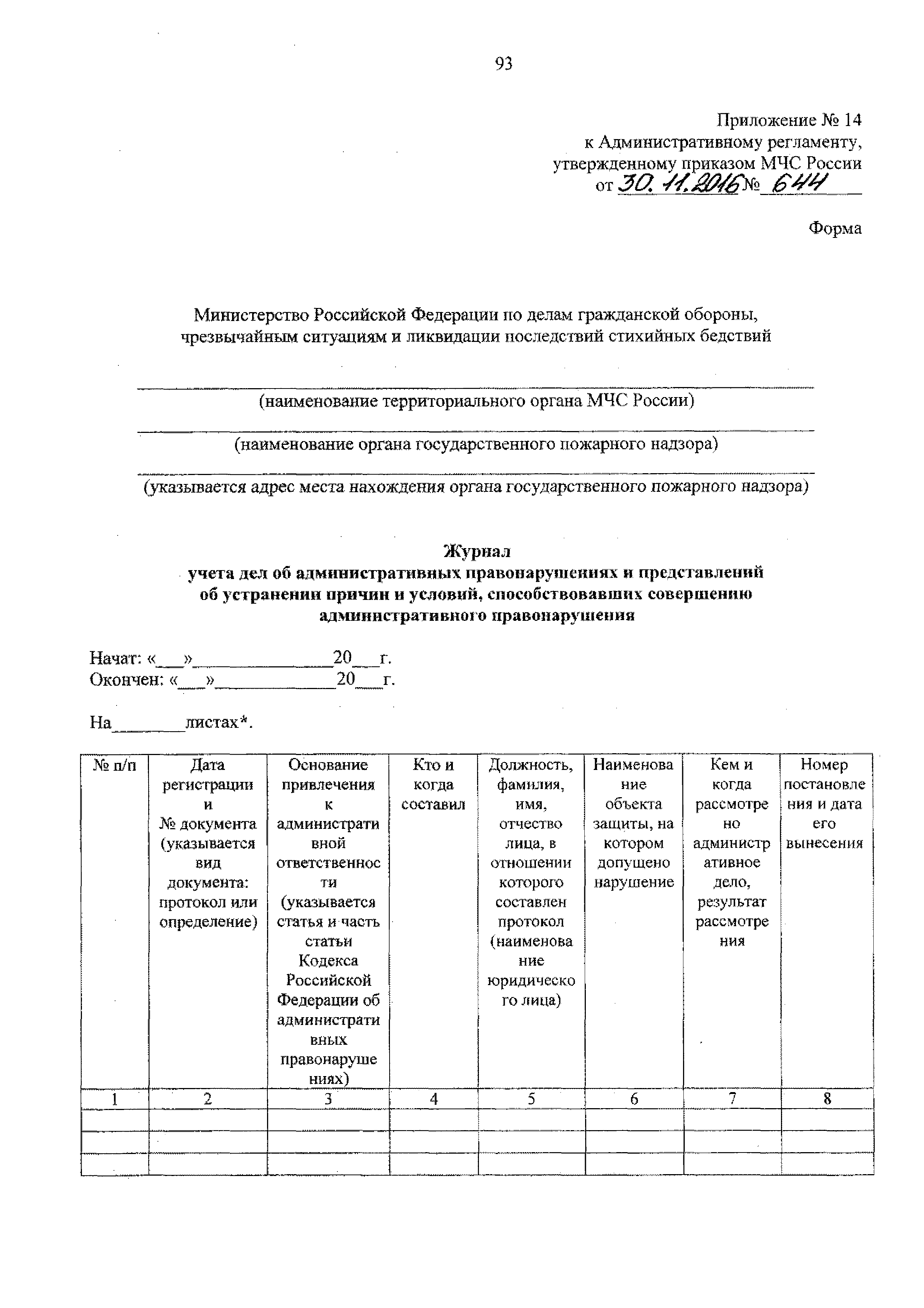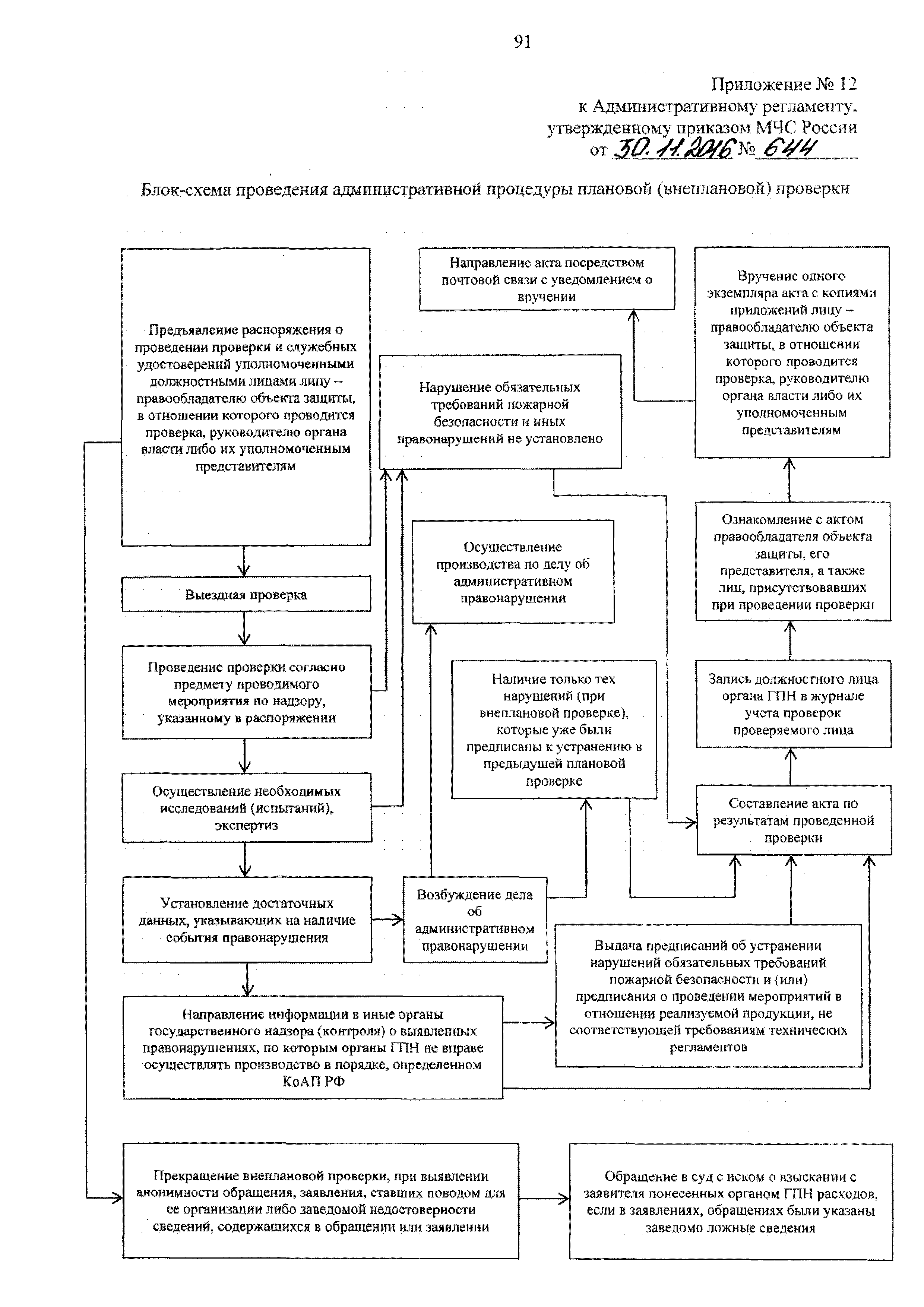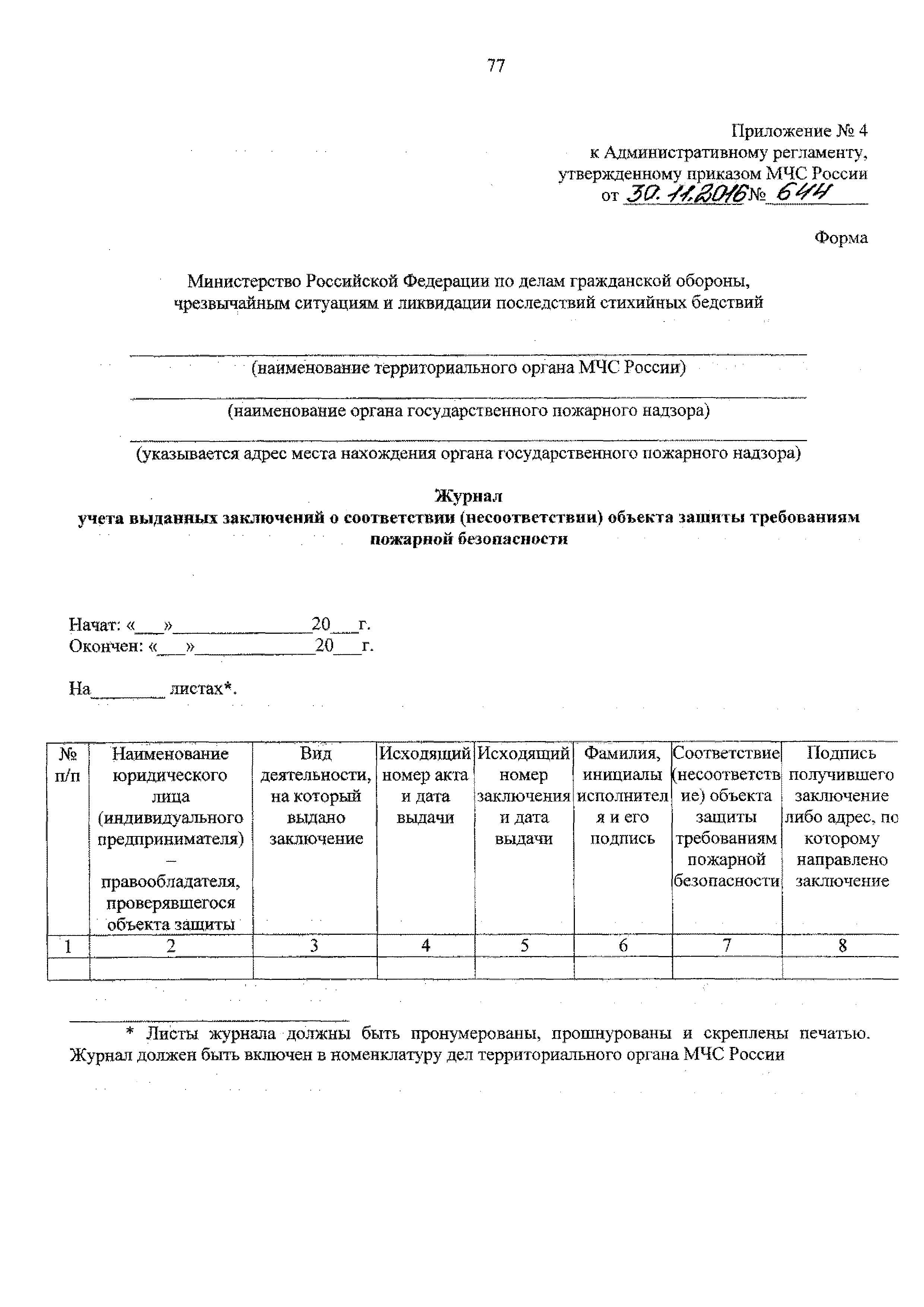 | Оглавление: | I. Общие положения II. Требования к порядку исполнения государственной функции III. Состав, последовательность и сроки выполнения административных процедур, требования к порядку их выполнения, в том числе особенности выполнения административных процедур в электронной форме IV. Порядок и формы контроля за исполнением государственной функции V. Досудебный (внесудебный) порядок обжалования решений и действий (бездействия) органа, исполняющего государственную функцию, а также его должностных лиц Приложение № 1. Сведения о местонахождении и контактных телефонах департамента надзорной деятельности и профилактической работы МЧС России, главных управлений МЧС России по субъектам Российской Федерации Приложение № 2. Учетная карточка консультации гражданина Приложение № 3. Заключение о соответствии (несоответствии) объекта защиты требованиям пожарной безопасности Приложение № 4. Журнал учета выданных заключений о соответствии (несоответствии) объекта защиты требованиям пожарной безопасности Приложение № 5. Блок-схема исполнения государственной функции Приложение № 6. Перечень объектов защиты и (или) территорий (земельных участков), которым присвоена категория риска Приложение № 7. Журнал учета объектов защиты и (или) территорий (земельных участков), органов власти Приложение № 8. Ежегодный план проведения плановых проверок объектов защиты и (или) территорий (земельных участков), правообладателями которых являются граждане, не являющиеся индивидуальными предпринимателями (за исключением объектов защиты - жилых помещений) Приложение № 9. Периодичность осуществления плановых проверок обязательных требований пожарной безопасности в зависимости от категории риска в соответствии с постановлением Правительства Российской Федерации № 806 Приложение № 10. План-график государственного инспектора по пожарному надзору осуществления государственной функции Приложение № 11. Журнал органа ГПН по учету проверок Приложение № 12. Блок-схема проведения административной процедуры плановой (внеплановой) проверки Приложение № 13. Контрольно-наблюдательное дело о противопожарном состоянии объекта защиты и (или) территории (земельного участка), (органа власти) Приложение № 14. Журнал учета дел об административных правонарушениях и представлений об устранении причин и условий, способствовавших совершению административного правонарушения Приложение № 15. Предостережение о недопустимости нарушения обязательных требований |