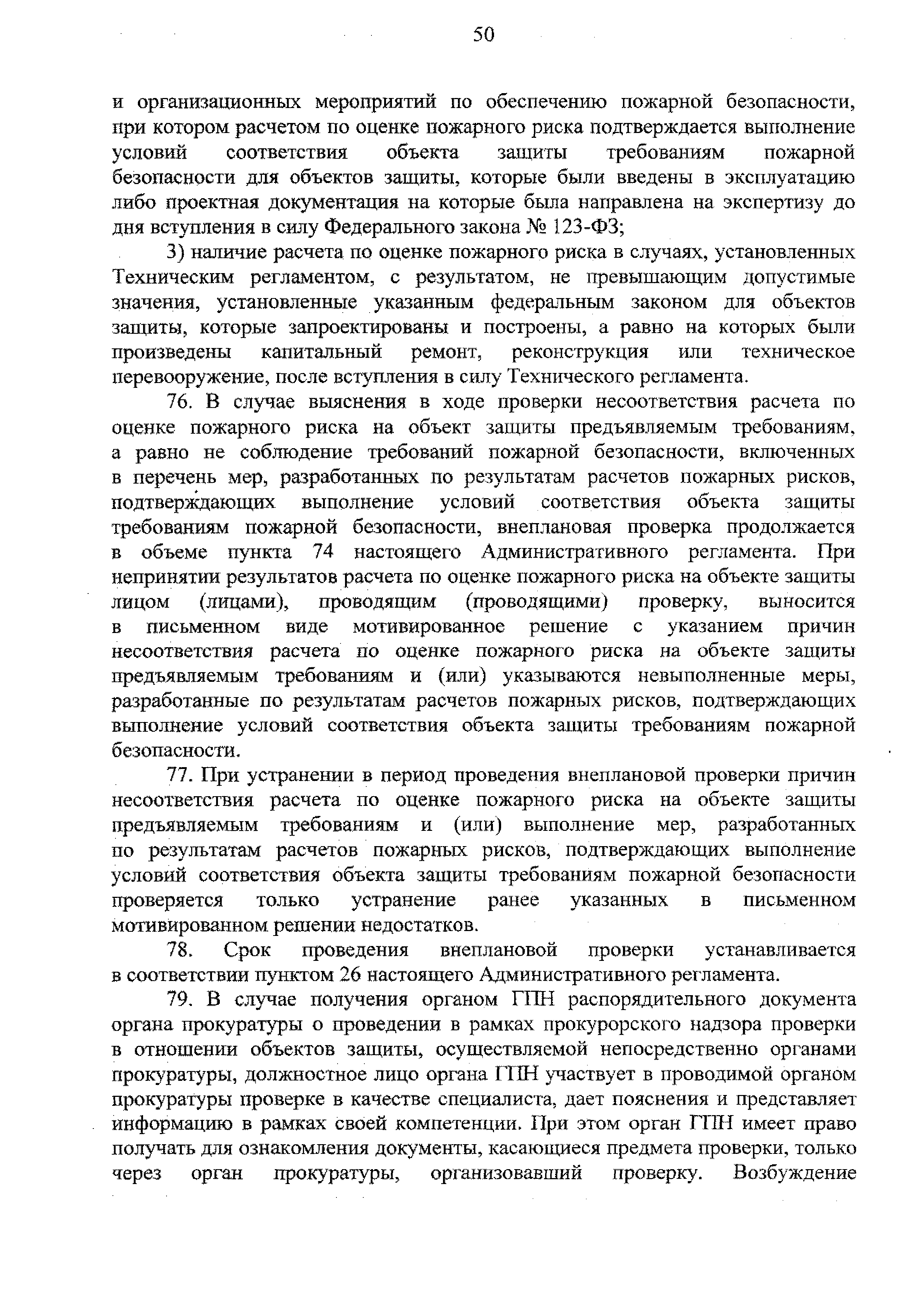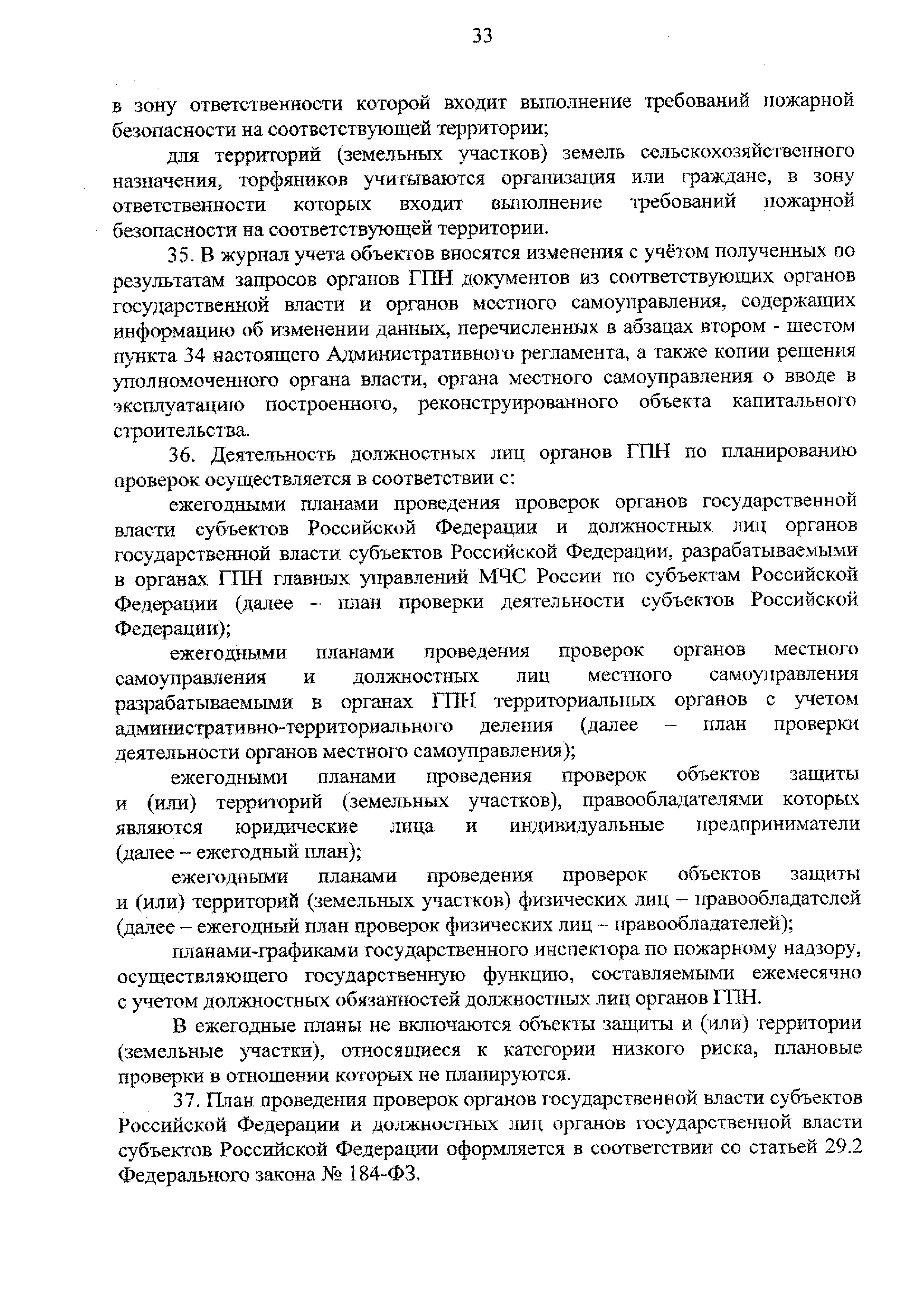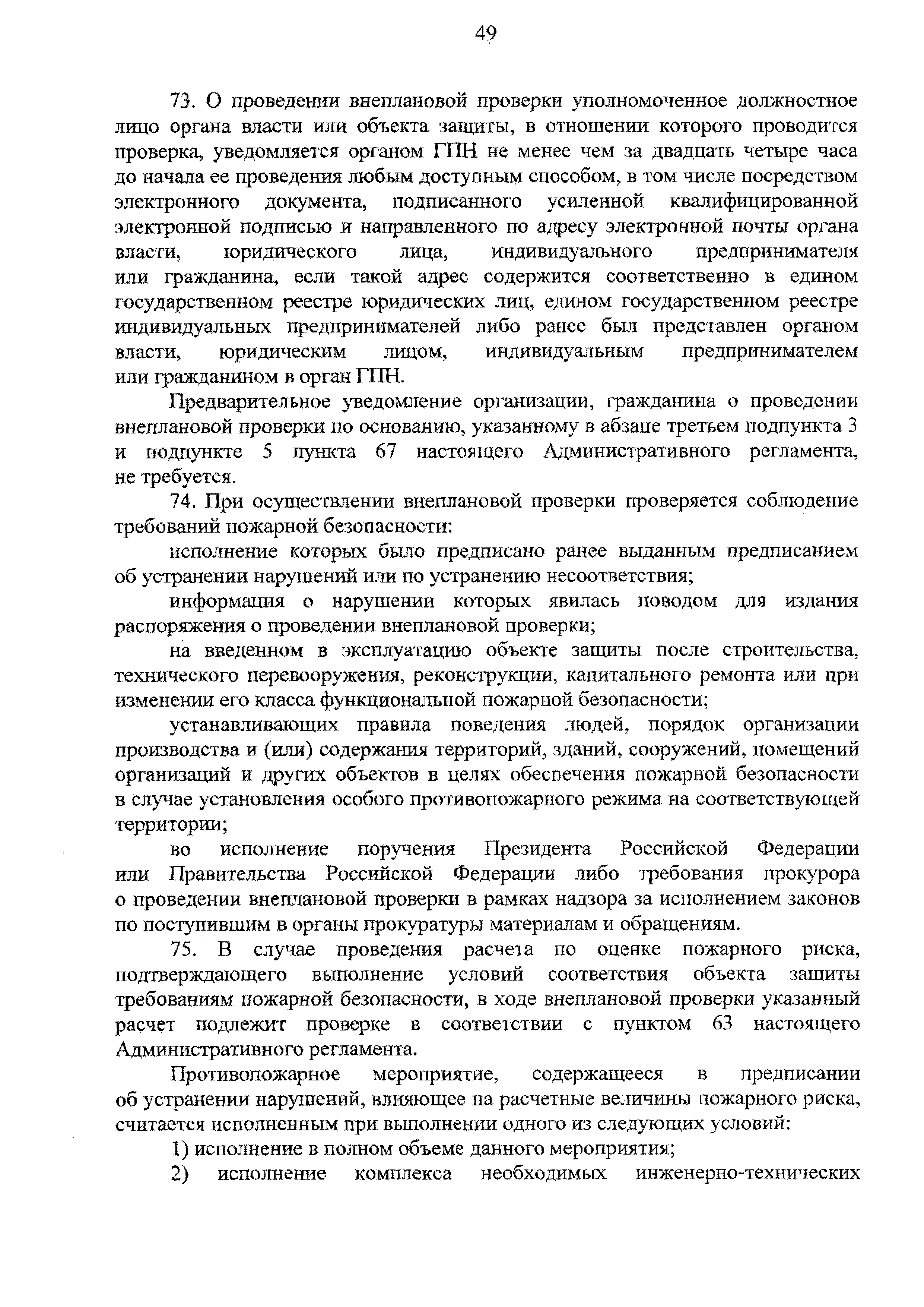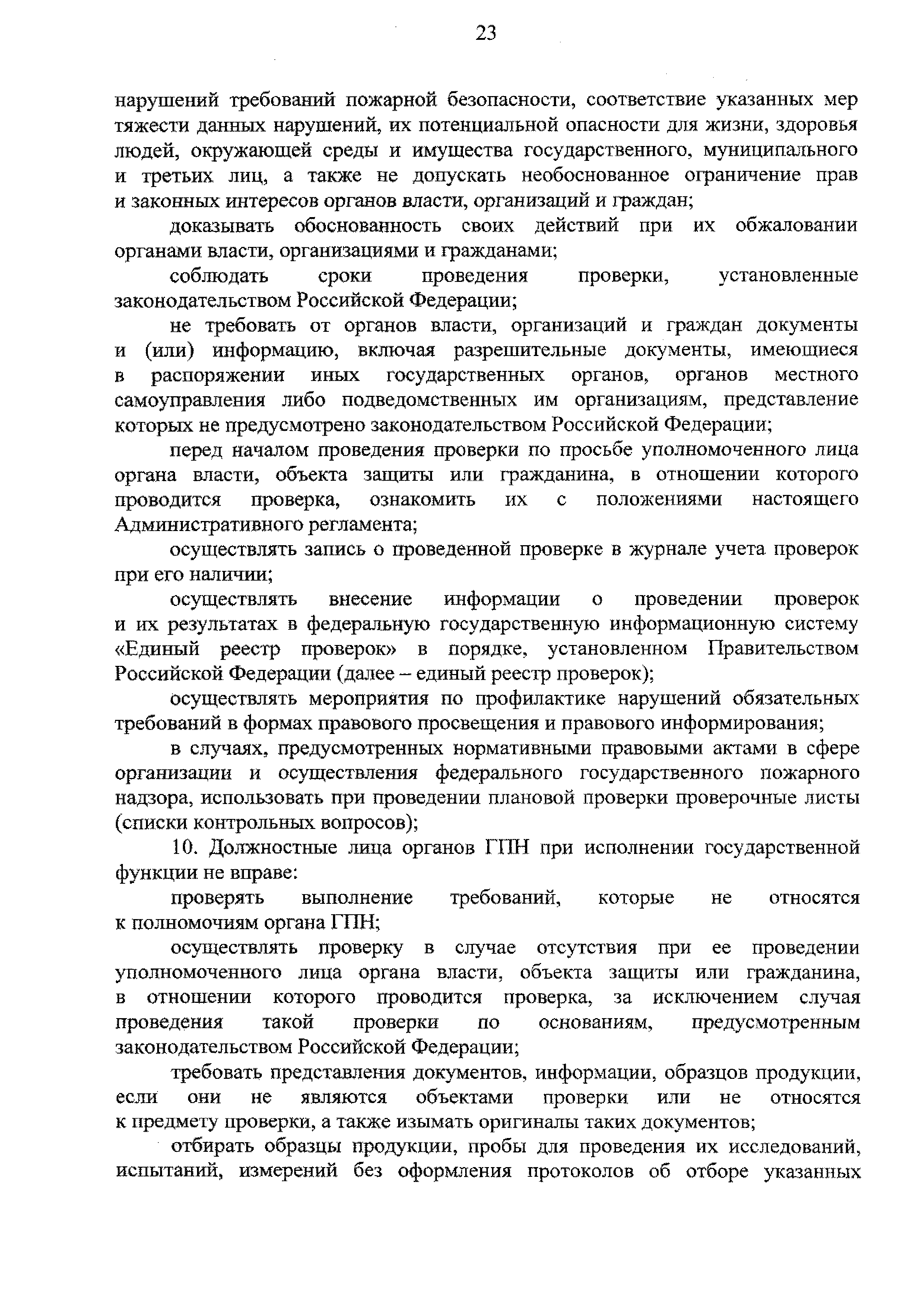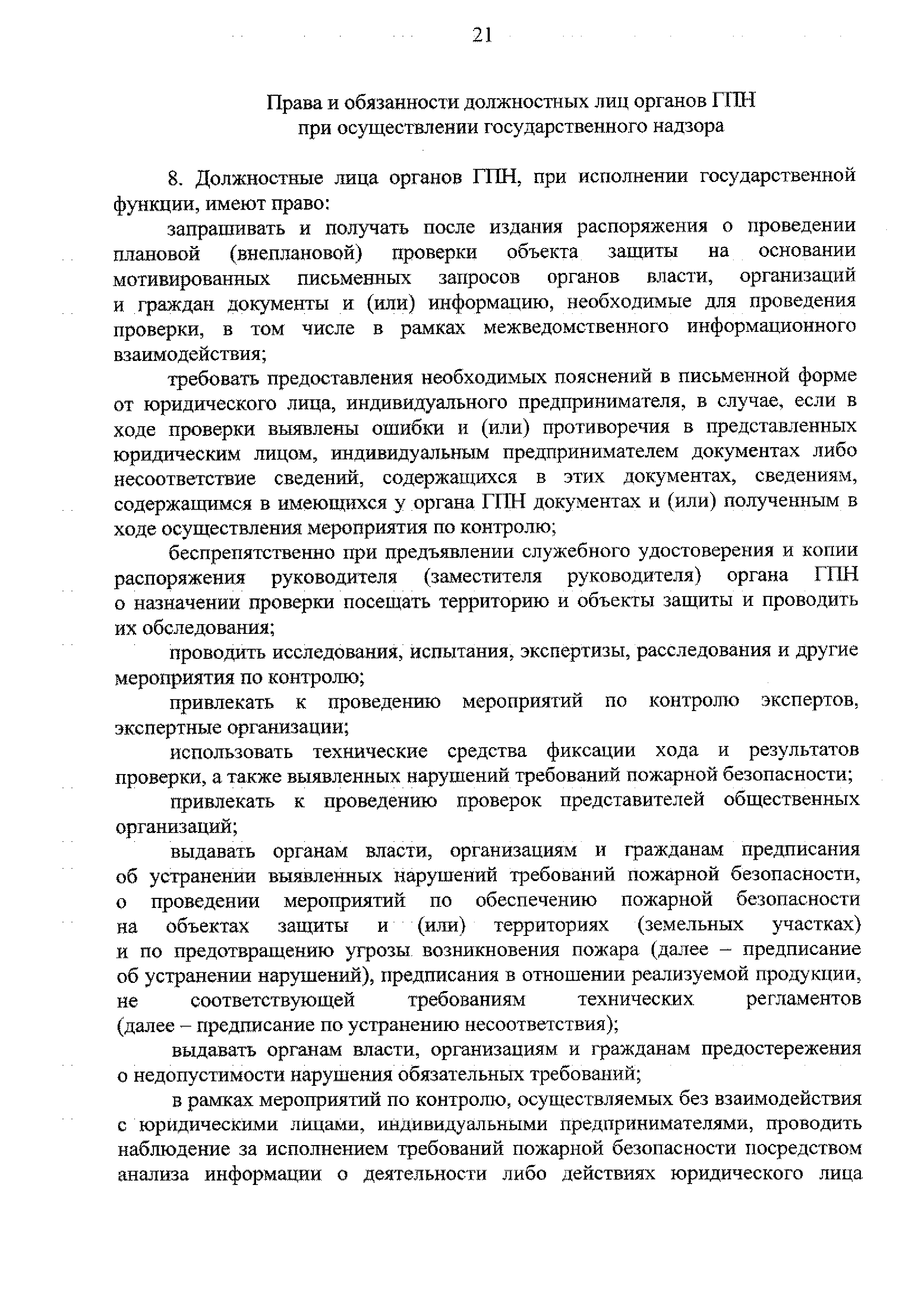 | Оглавление: | I. Общие положения II. Требования к порядку исполнения государственной функции III. Состав, последовательность и сроки выполнения административных процедур, требования к порядку их выполнения, в том числе особенности выполнения административных процедур в электронной форме IV. Порядок и формы контроля за исполнением государственной функции V. Досудебный (внесудебный) порядок обжалования решений и действий (бездействия) органа, исполняющего государственную функцию, а также его должностных лиц Приложение № 1. Сведения о местонахождении и контактных телефонах департамента надзорной деятельности и профилактической работы МЧС России, главных управлений МЧС России по субъектам Российской Федерации Приложение № 2. Учетная карточка консультации гражданина Приложение № 3. Заключение о соответствии (несоответствии) объекта защиты требованиям пожарной безопасности Приложение № 4. Журнал учета выданных заключений о соответствии (несоответствии) объекта защиты требованиям пожарной безопасности Приложение № 5. Блок-схема исполнения государственной функции Приложение № 6. Перечень объектов защиты и (или) территорий (земельных участков), которым присвоена категория риска Приложение № 7. Журнал учета объектов защиты и (или) территорий (земельных участков), органов власти Приложение № 8. Ежегодный план проведения плановых проверок объектов защиты и (или) территорий (земельных участков), правообладателями которых являются граждане, не являющиеся индивидуальными предпринимателями (за исключением объектов защиты - жилых помещений) Приложение № 9. Периодичность осуществления плановых проверок обязательных требований пожарной безопасности в зависимости от категории риска в соответствии с постановлением Правительства Российской Федерации № 806 Приложение № 10. План-график государственного инспектора по пожарному надзору осуществления государственной функции Приложение № 11. Журнал органа ГПН по учету проверок Приложение № 12. Блок-схема проведения административной процедуры плановой (внеплановой) проверки Приложение № 13. Контрольно-наблюдательное дело о противопожарном состоянии объекта защиты и (или) территории (земельного участка), (органа власти) Приложение № 14. Журнал учета дел об административных правонарушениях и представлений об устранении причин и условий, способствовавших совершению административного правонарушения Приложение № 15. Предостережение о недопустимости нарушения обязательных требований |