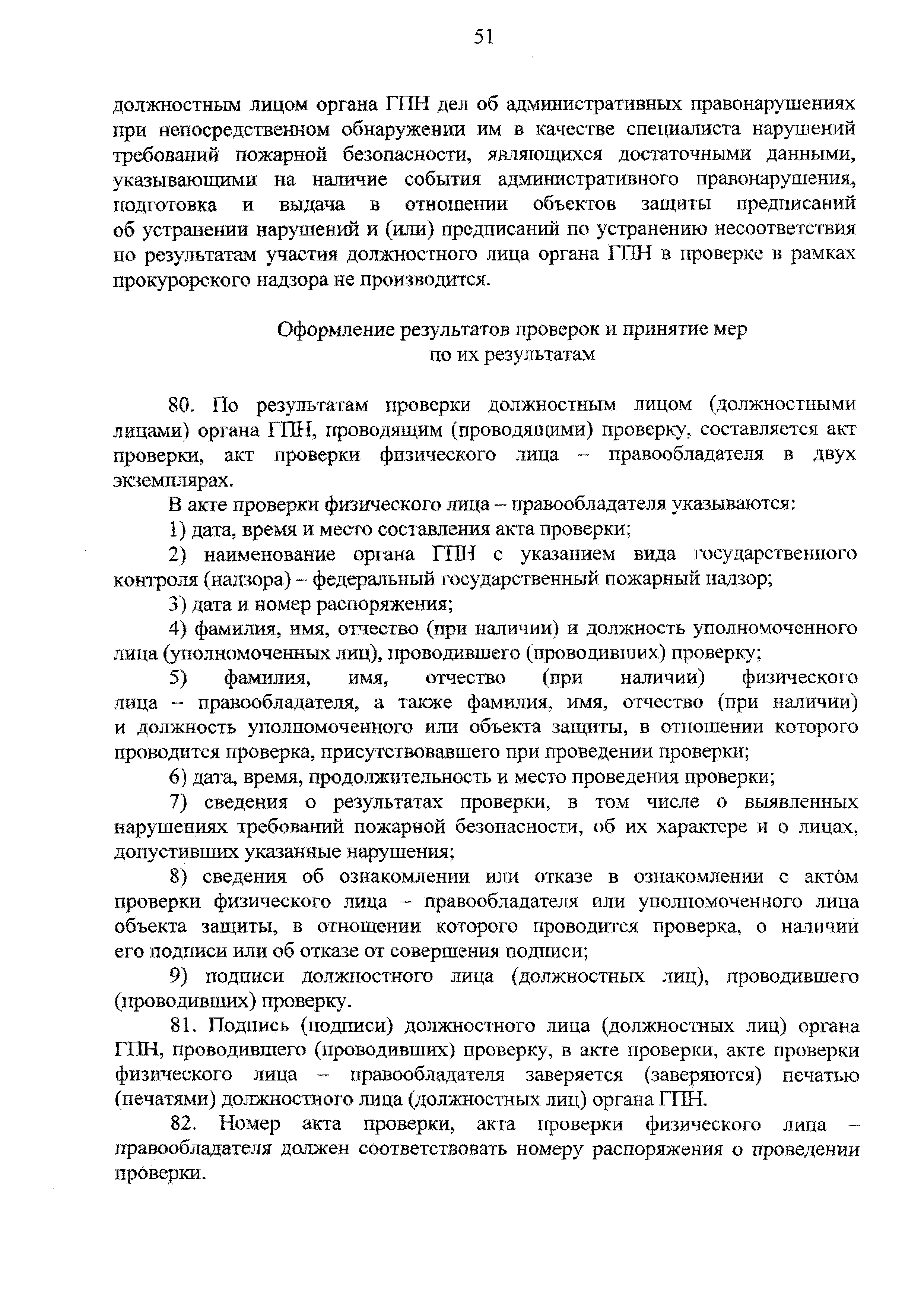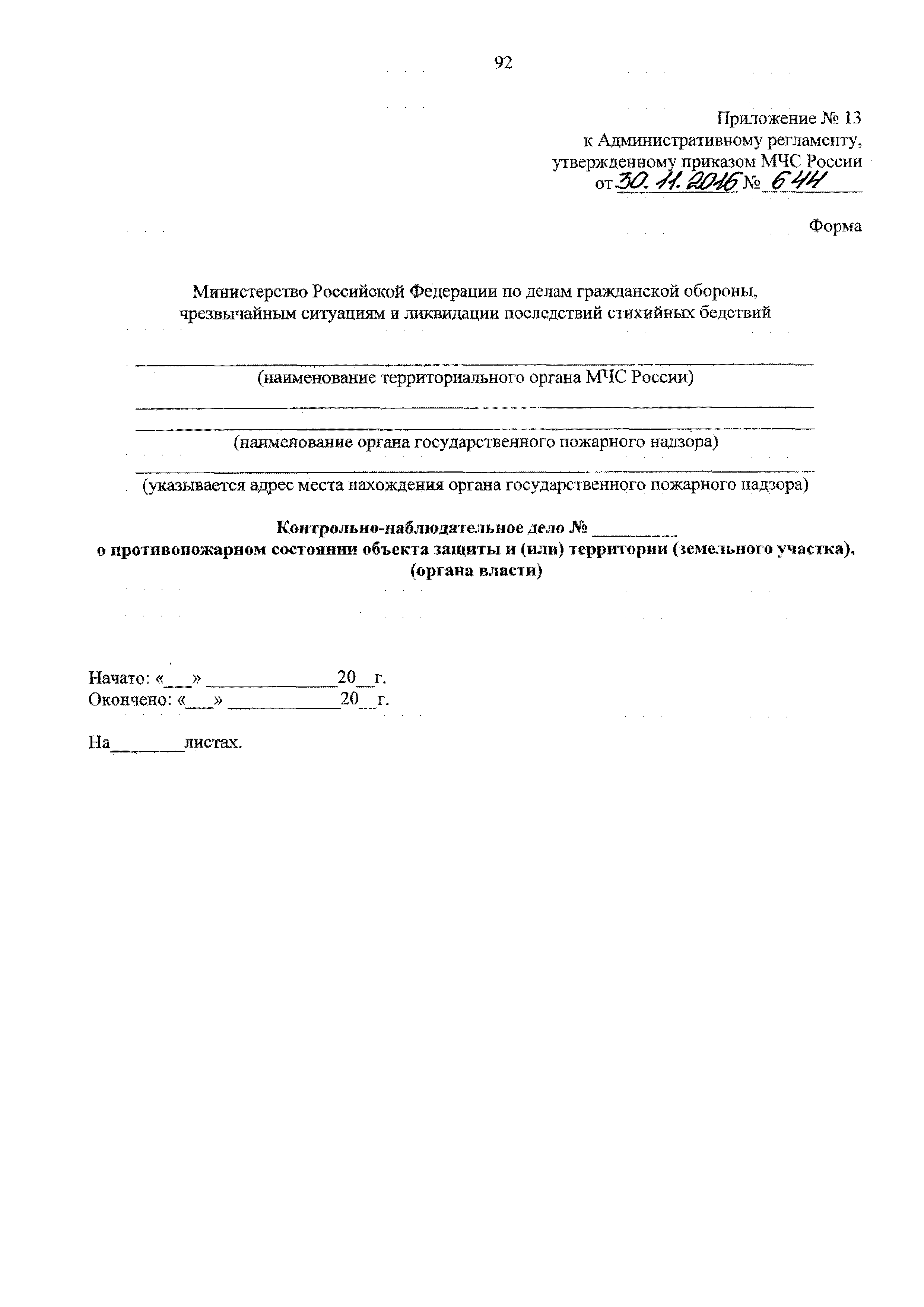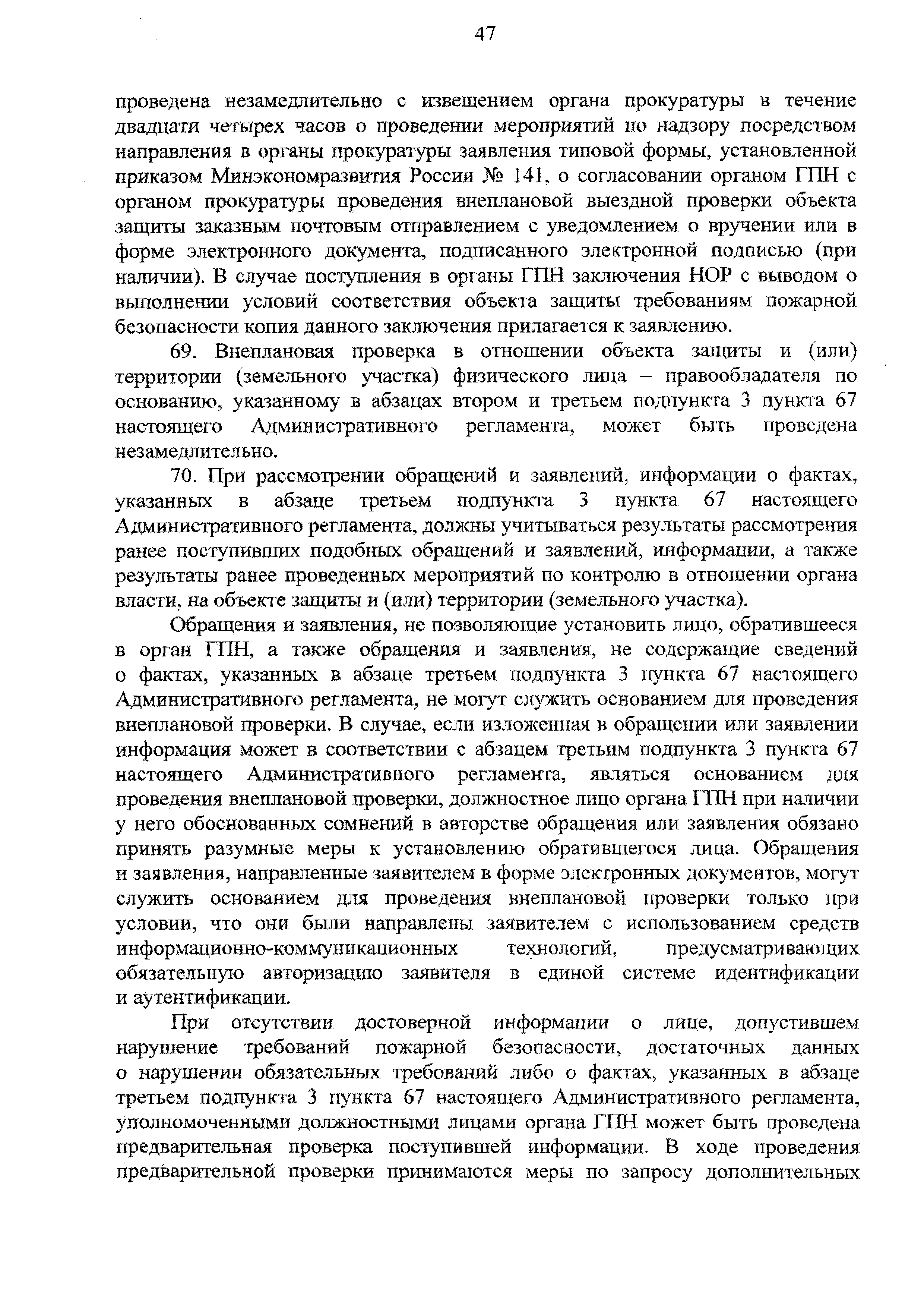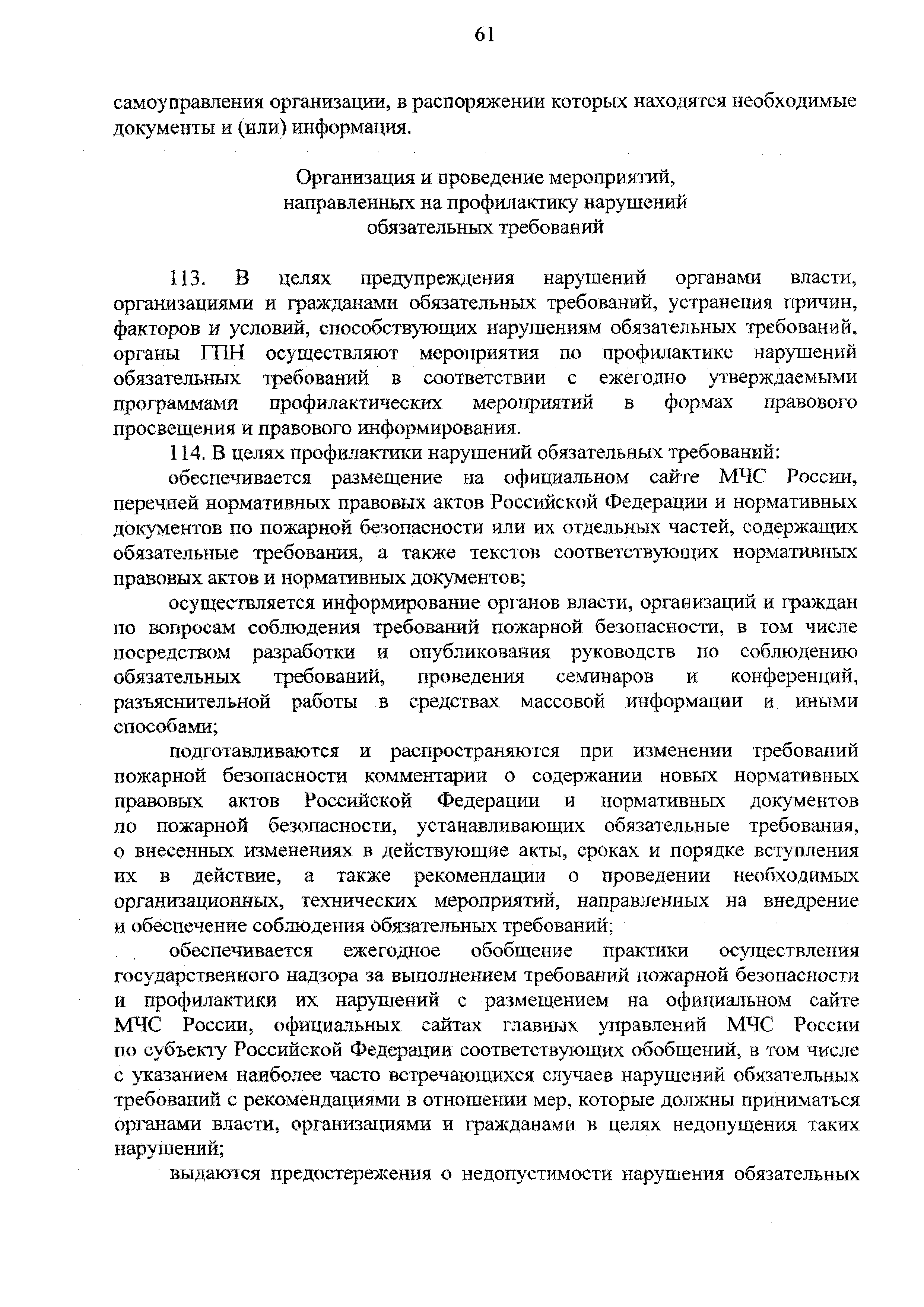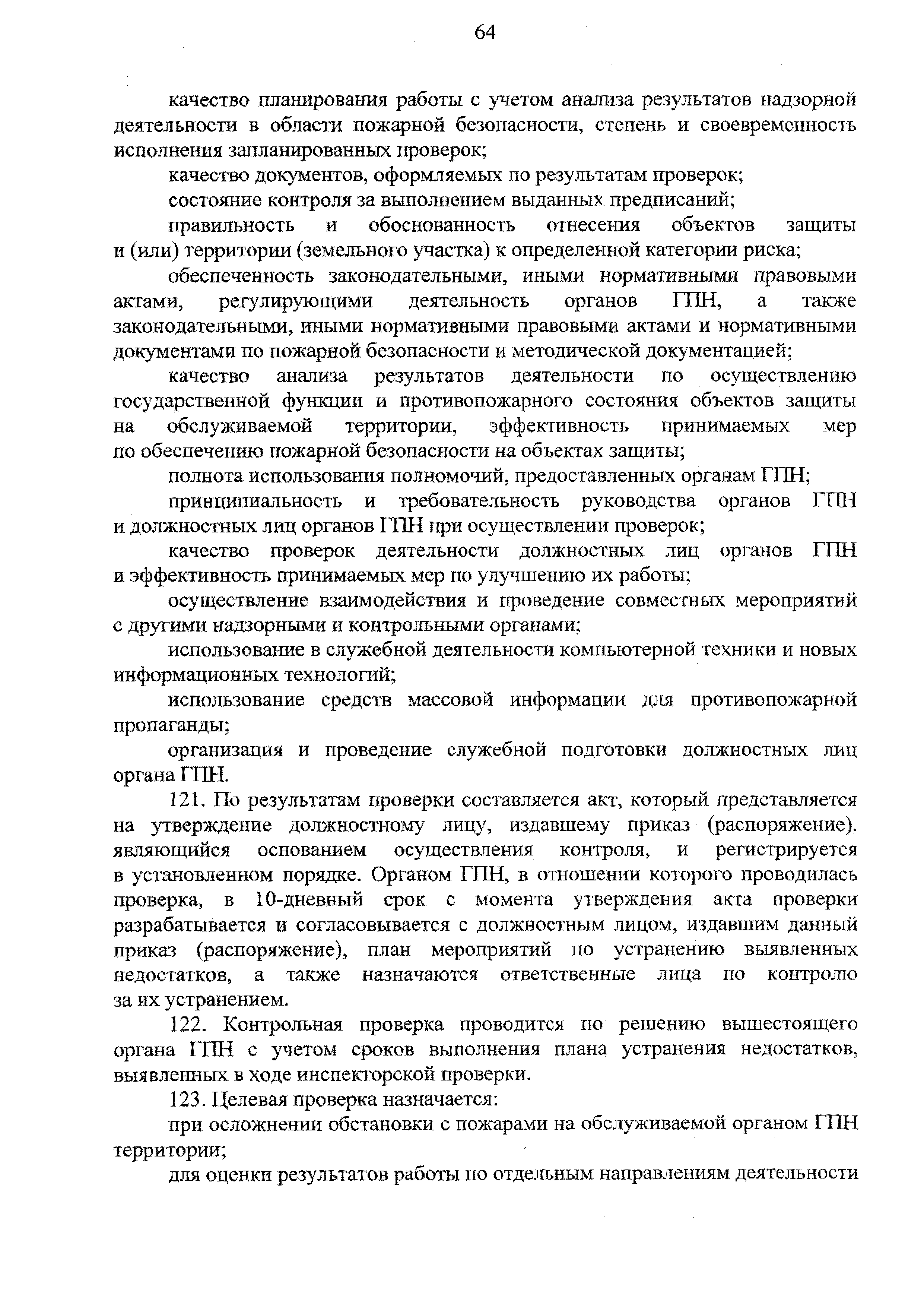 | Оглавление: | I. Общие положения II. Требования к порядку исполнения государственной функции III. Состав, последовательность и сроки выполнения административных процедур, требования к порядку их выполнения, в том числе особенности выполнения административных процедур в электронной форме IV. Порядок и формы контроля за исполнением государственной функции V. Досудебный (внесудебный) порядок обжалования решений и действий (бездействия) органа, исполняющего государственную функцию, а также его должностных лиц Приложение № 1. Сведения о местонахождении и контактных телефонах департамента надзорной деятельности и профилактической работы МЧС России, главных управлений МЧС России по субъектам Российской Федерации Приложение № 2. Учетная карточка консультации гражданина Приложение № 3. Заключение о соответствии (несоответствии) объекта защиты требованиям пожарной безопасности Приложение № 4. Журнал учета выданных заключений о соответствии (несоответствии) объекта защиты требованиям пожарной безопасности Приложение № 5. Блок-схема исполнения государственной функции Приложение № 6. Перечень объектов защиты и (или) территорий (земельных участков), которым присвоена категория риска Приложение № 7. Журнал учета объектов защиты и (или) территорий (земельных участков), органов власти Приложение № 8. Ежегодный план проведения плановых проверок объектов защиты и (или) территорий (земельных участков), правообладателями которых являются граждане, не являющиеся индивидуальными предпринимателями (за исключением объектов защиты - жилых помещений) Приложение № 9. Периодичность осуществления плановых проверок обязательных требований пожарной безопасности в зависимости от категории риска в соответствии с постановлением Правительства Российской Федерации № 806 Приложение № 10. План-график государственного инспектора по пожарному надзору осуществления государственной функции Приложение № 11. Журнал органа ГПН по учету проверок Приложение № 12. Блок-схема проведения административной процедуры плановой (внеплановой) проверки Приложение № 13. Контрольно-наблюдательное дело о противопожарном состоянии объекта защиты и (или) территории (земельного участка), (органа власти) Приложение № 14. Журнал учета дел об административных правонарушениях и представлений об устранении причин и условий, способствовавших совершению административного правонарушения Приложение № 15. Предостережение о недопустимости нарушения обязательных требований |