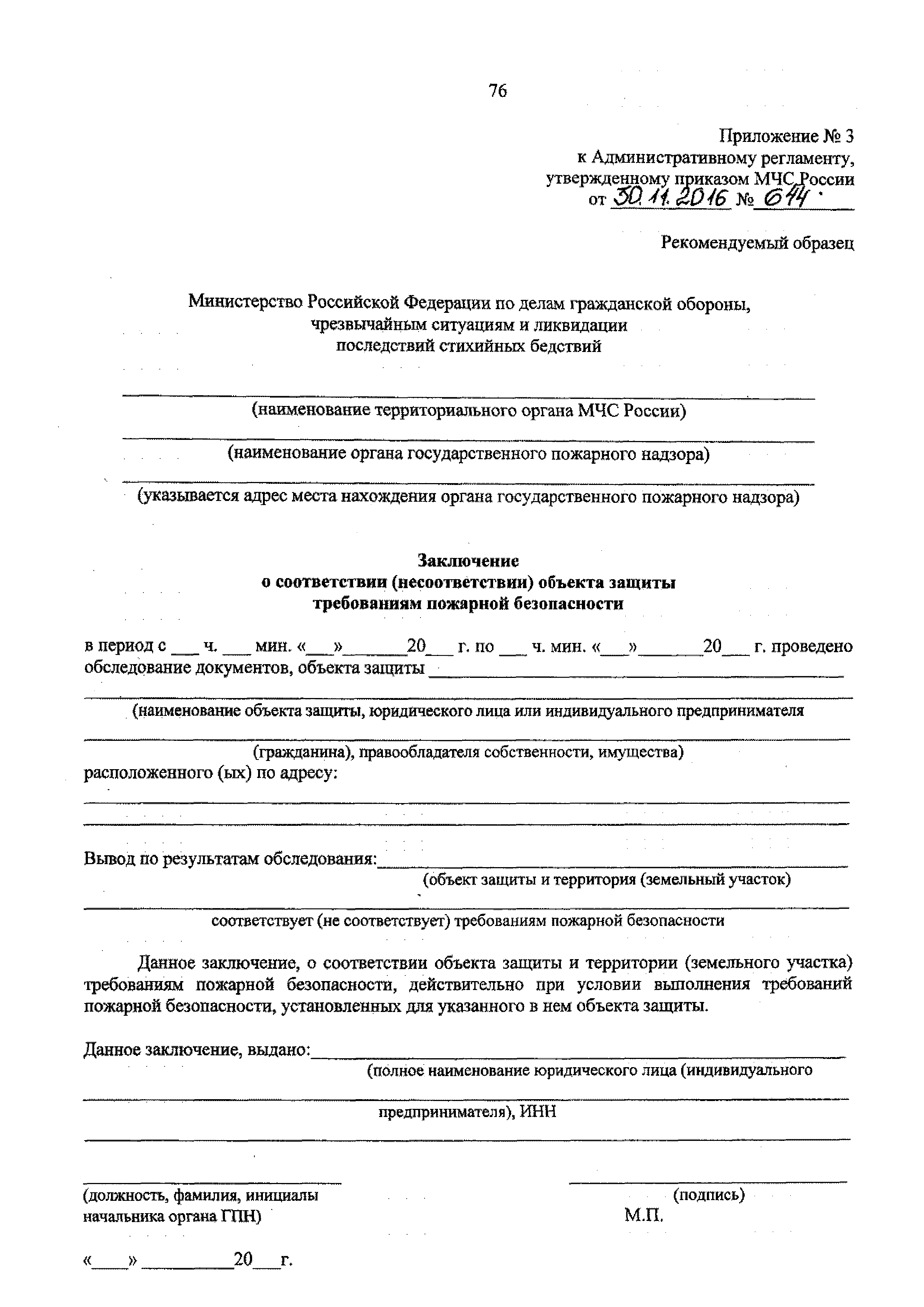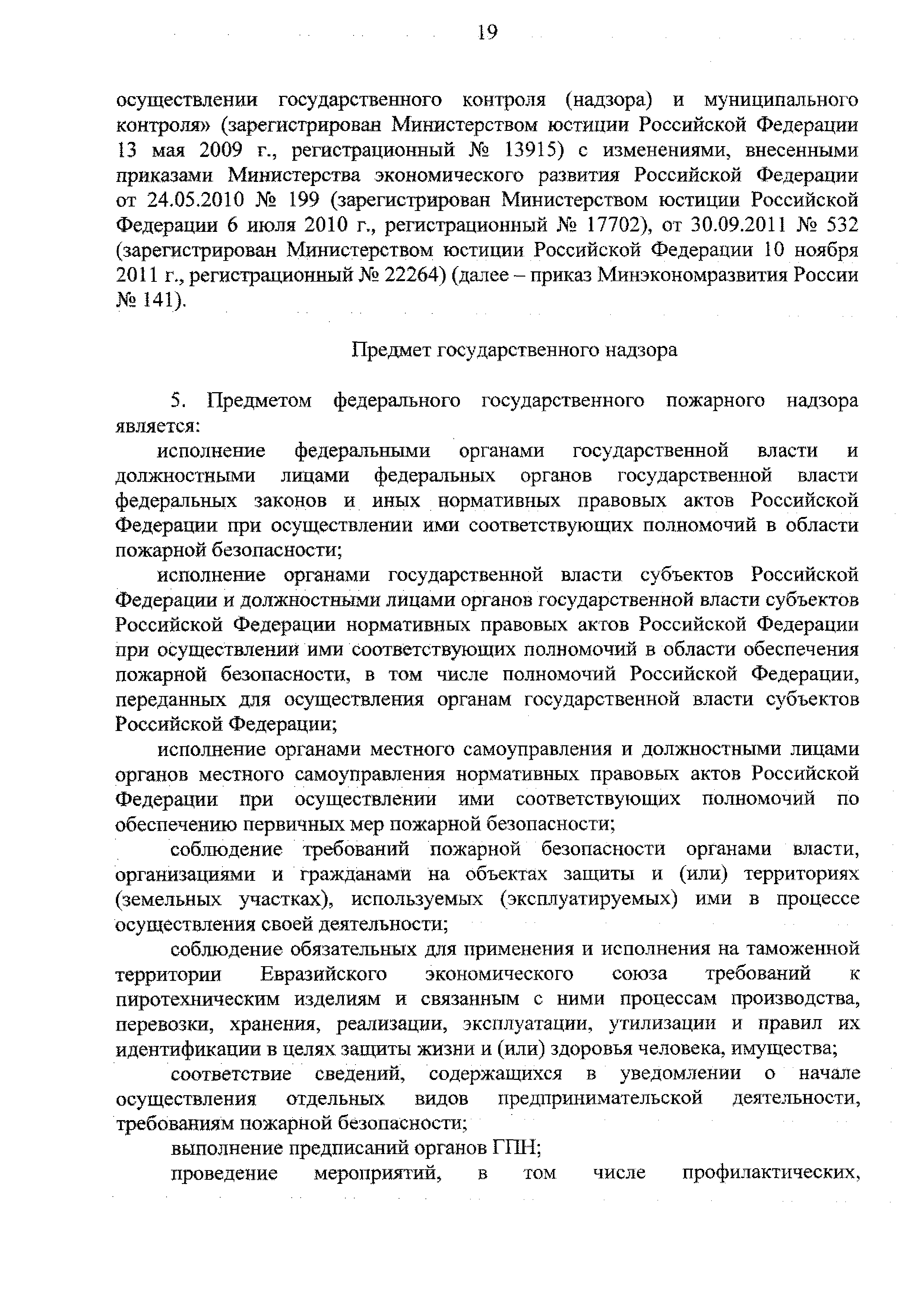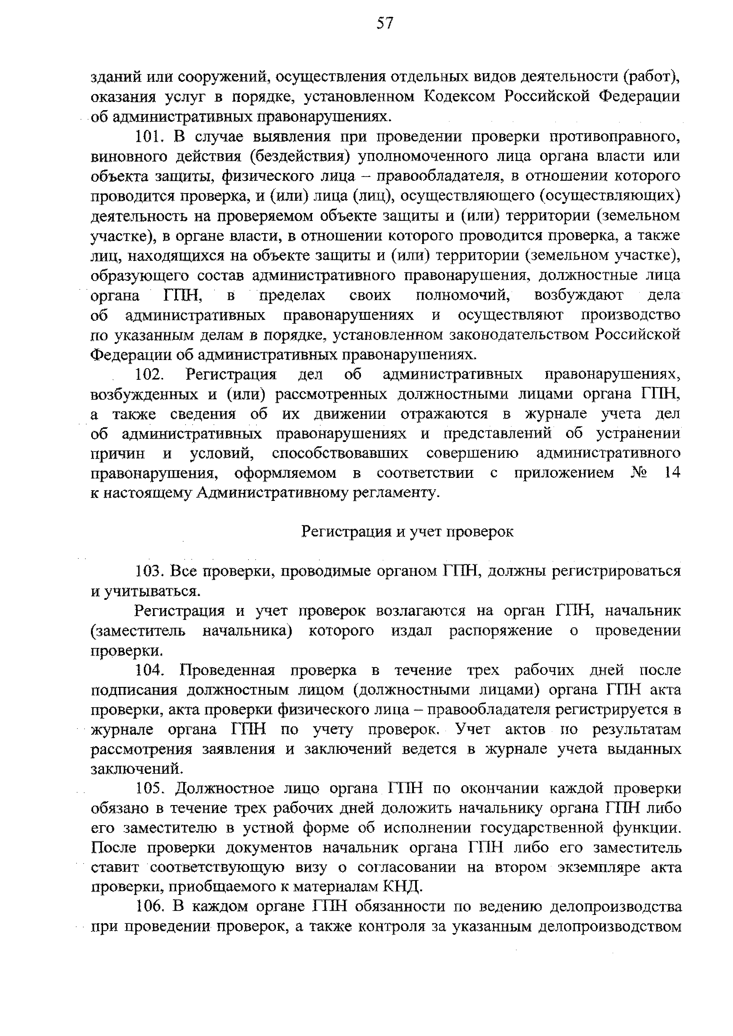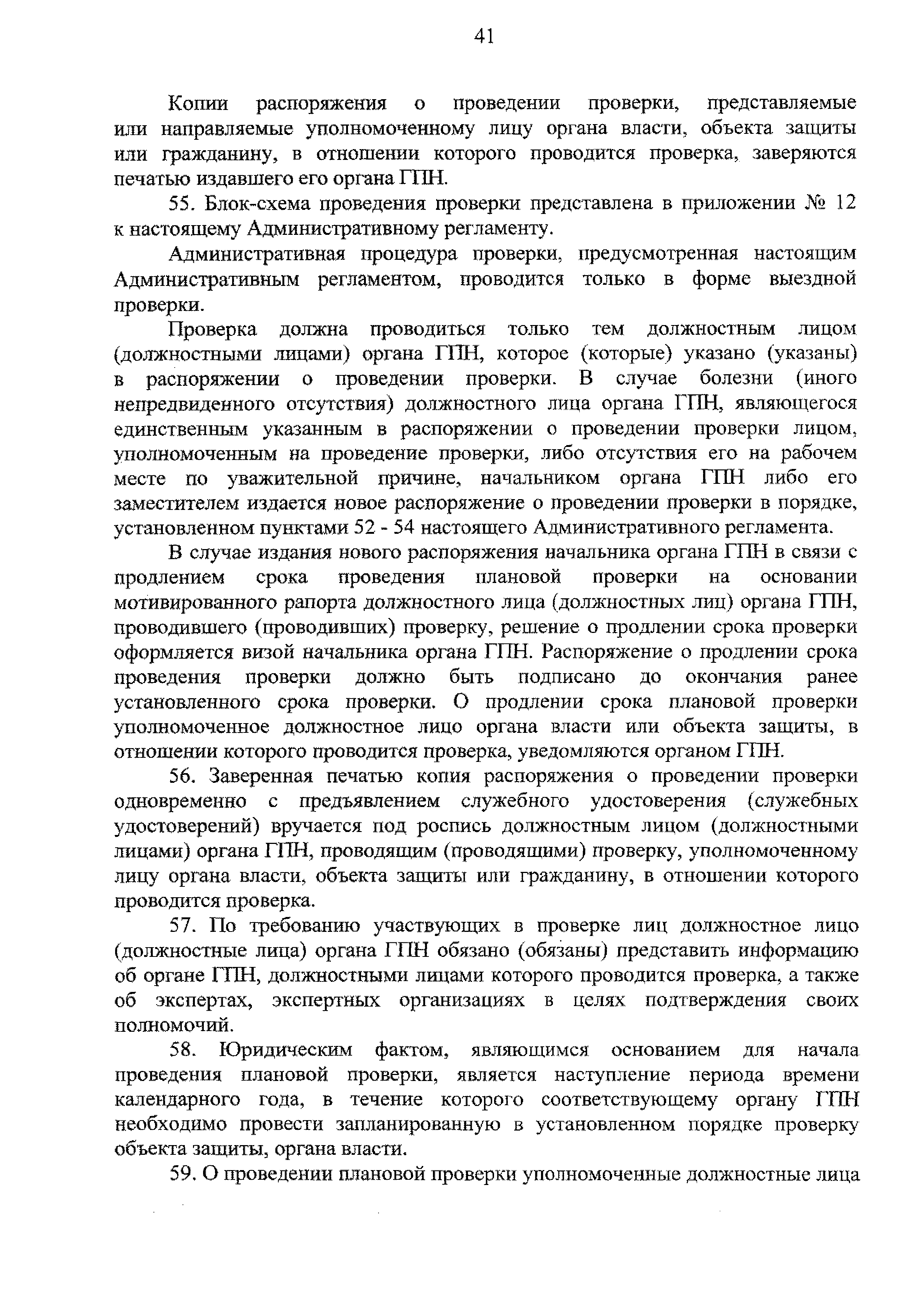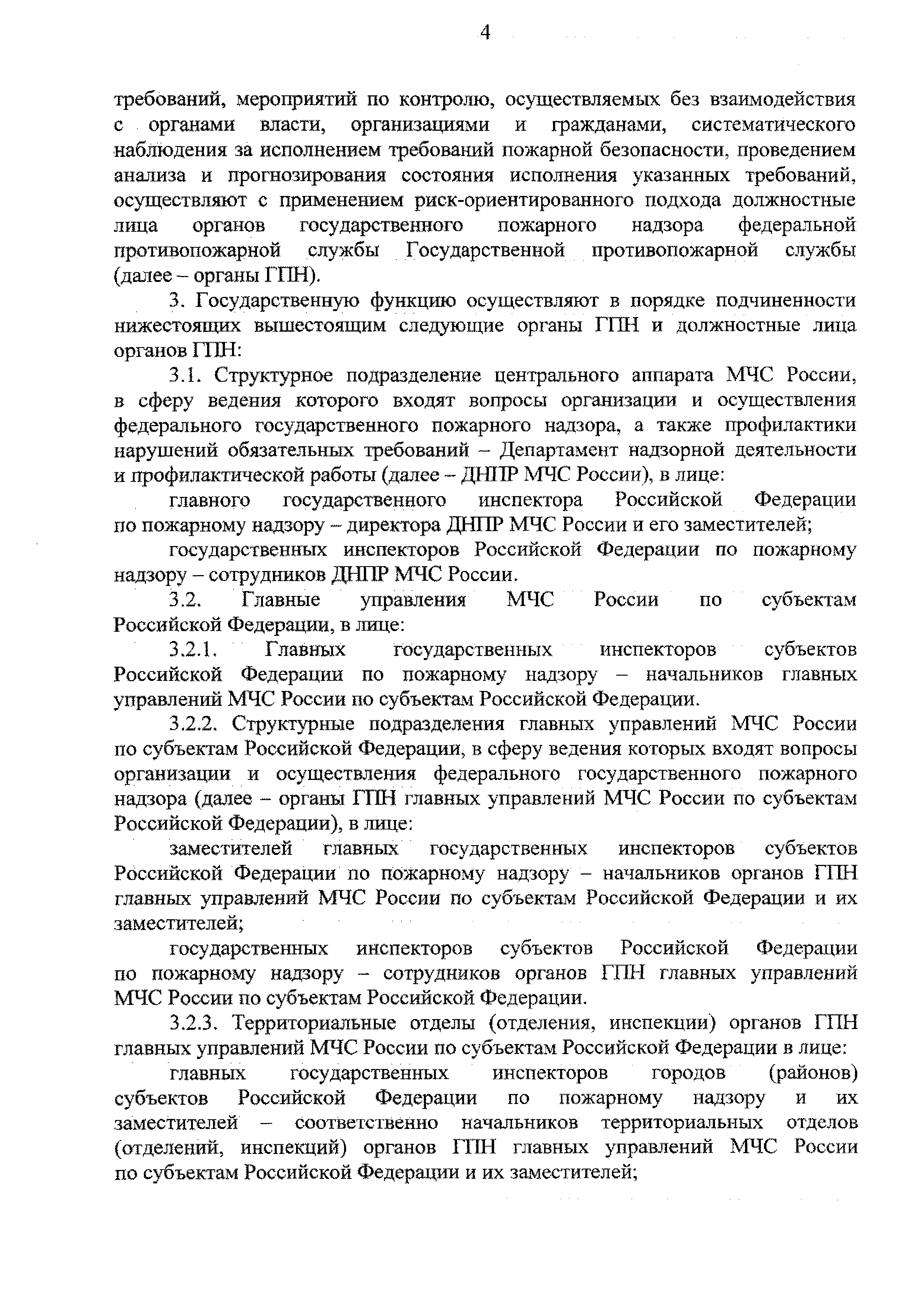 | Оглавление: | I. Общие положения II. Требования к порядку исполнения государственной функции III. Состав, последовательность и сроки выполнения административных процедур, требования к порядку их выполнения, в том числе особенности выполнения административных процедур в электронной форме IV. Порядок и формы контроля за исполнением государственной функции V. Досудебный (внесудебный) порядок обжалования решений и действий (бездействия) органа, исполняющего государственную функцию, а также его должностных лиц Приложение № 1. Сведения о местонахождении и контактных телефонах департамента надзорной деятельности и профилактической работы МЧС России, главных управлений МЧС России по субъектам Российской Федерации Приложение № 2. Учетная карточка консультации гражданина Приложение № 3. Заключение о соответствии (несоответствии) объекта защиты требованиям пожарной безопасности Приложение № 4. Журнал учета выданных заключений о соответствии (несоответствии) объекта защиты требованиям пожарной безопасности Приложение № 5. Блок-схема исполнения государственной функции Приложение № 6. Перечень объектов защиты и (или) территорий (земельных участков), которым присвоена категория риска Приложение № 7. Журнал учета объектов защиты и (или) территорий (земельных участков), органов власти Приложение № 8. Ежегодный план проведения плановых проверок объектов защиты и (или) территорий (земельных участков), правообладателями которых являются граждане, не являющиеся индивидуальными предпринимателями (за исключением объектов защиты - жилых помещений) Приложение № 9. Периодичность осуществления плановых проверок обязательных требований пожарной безопасности в зависимости от категории риска в соответствии с постановлением Правительства Российской Федерации № 806 Приложение № 10. План-график государственного инспектора по пожарному надзору осуществления государственной функции Приложение № 11. Журнал органа ГПН по учету проверок Приложение № 12. Блок-схема проведения административной процедуры плановой (внеплановой) проверки Приложение № 13. Контрольно-наблюдательное дело о противопожарном состоянии объекта защиты и (или) территории (земельного участка), (органа власти) Приложение № 14. Журнал учета дел об административных правонарушениях и представлений об устранении причин и условий, способствовавших совершению административного правонарушения Приложение № 15. Предостережение о недопустимости нарушения обязательных требований |