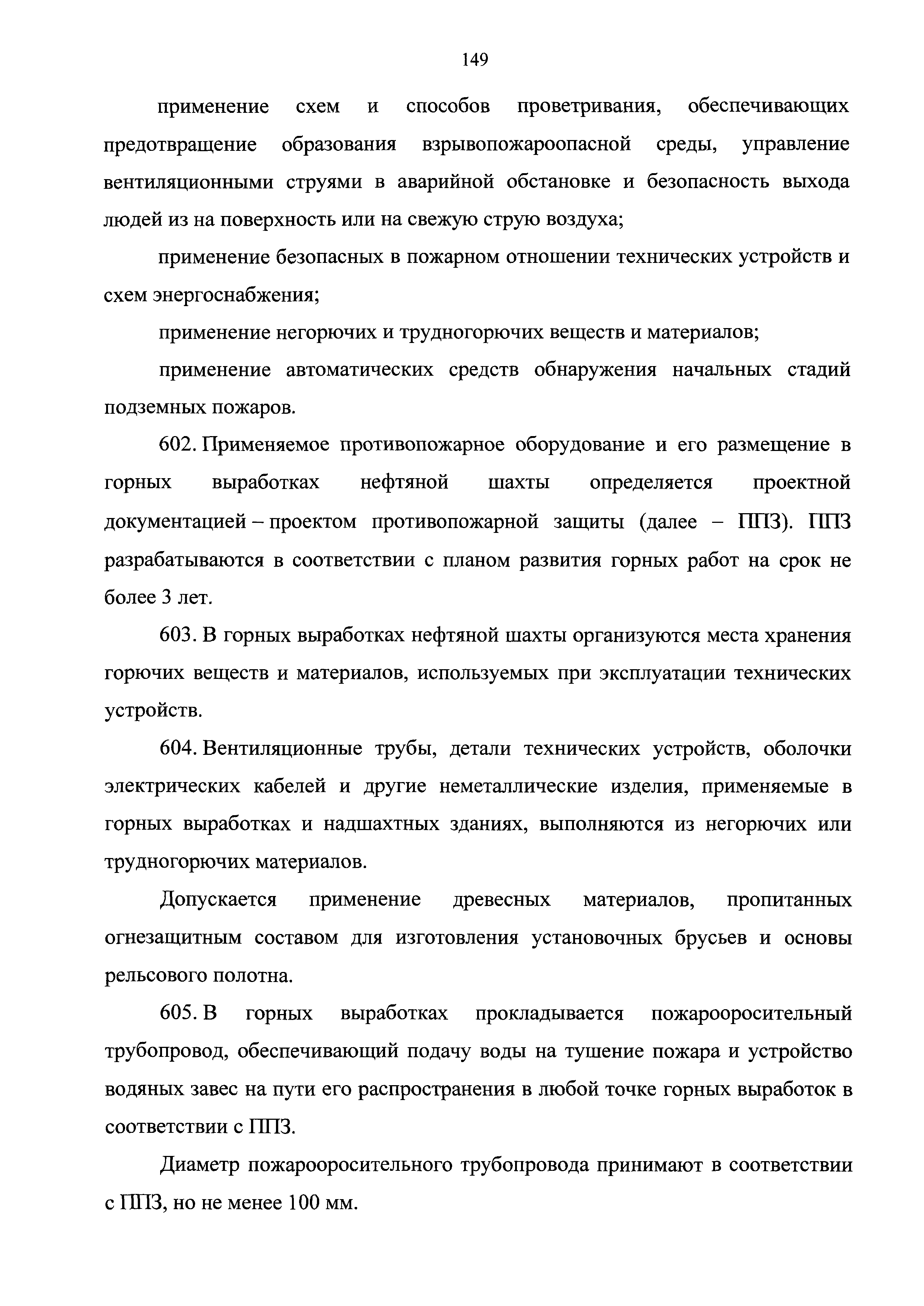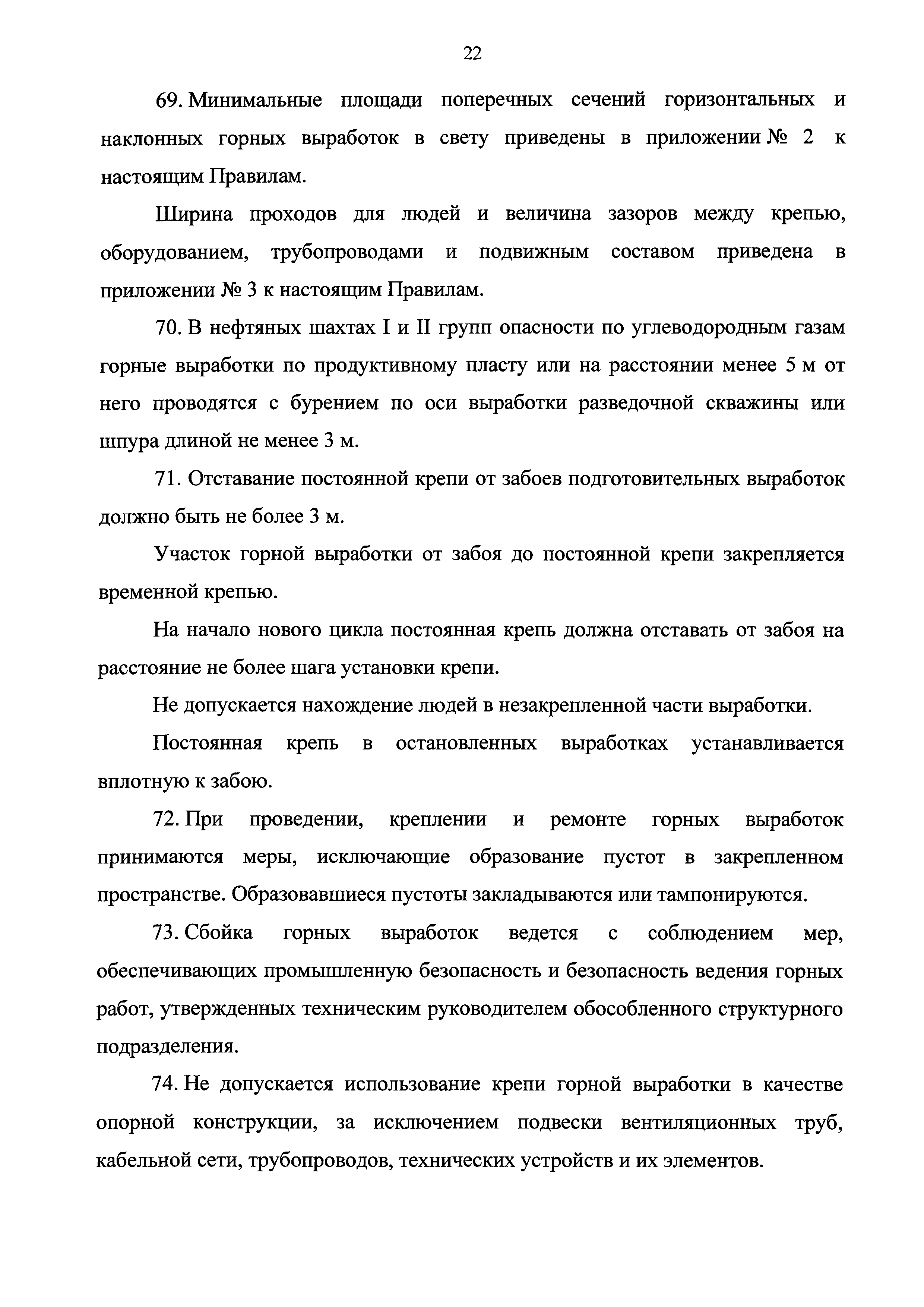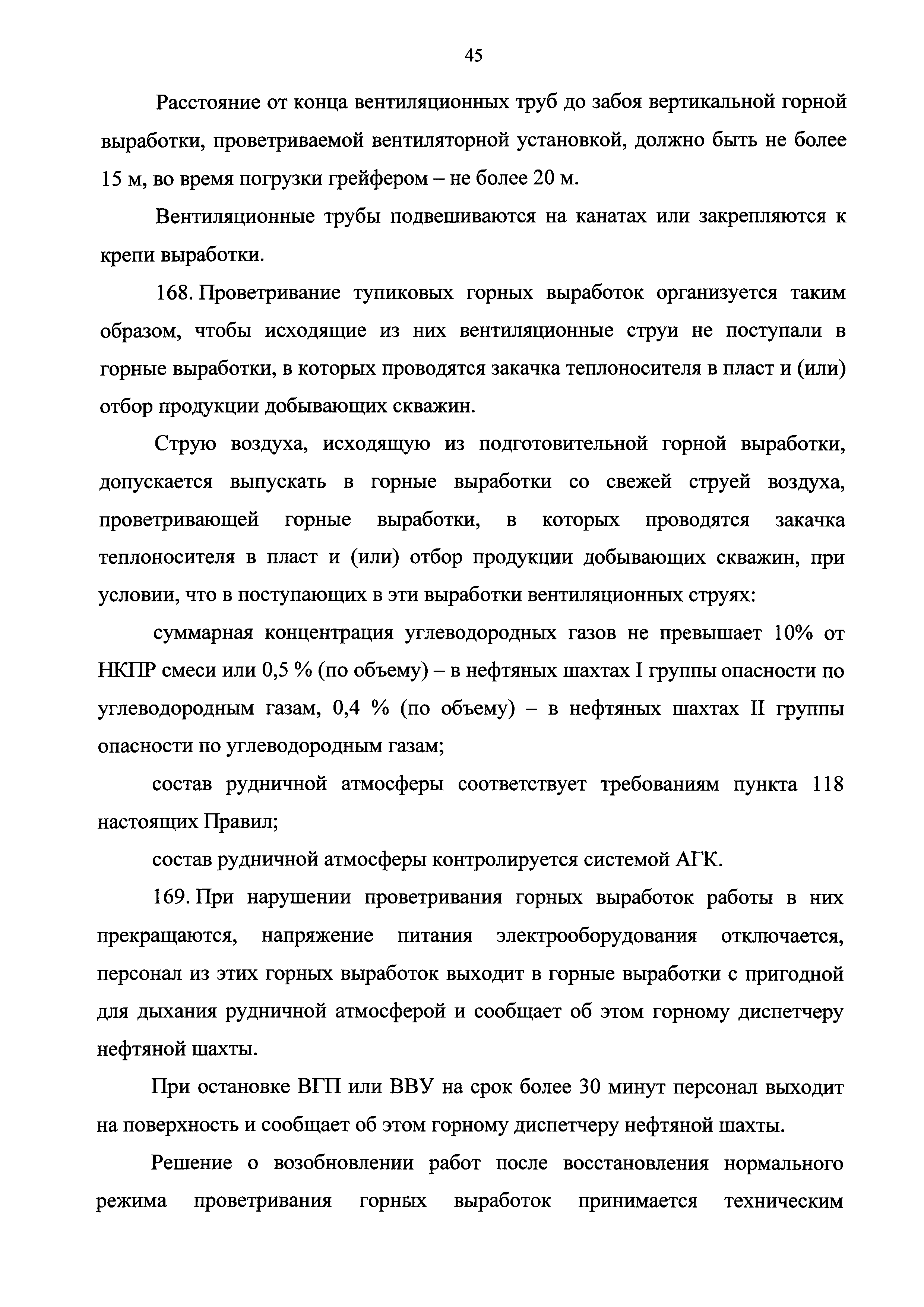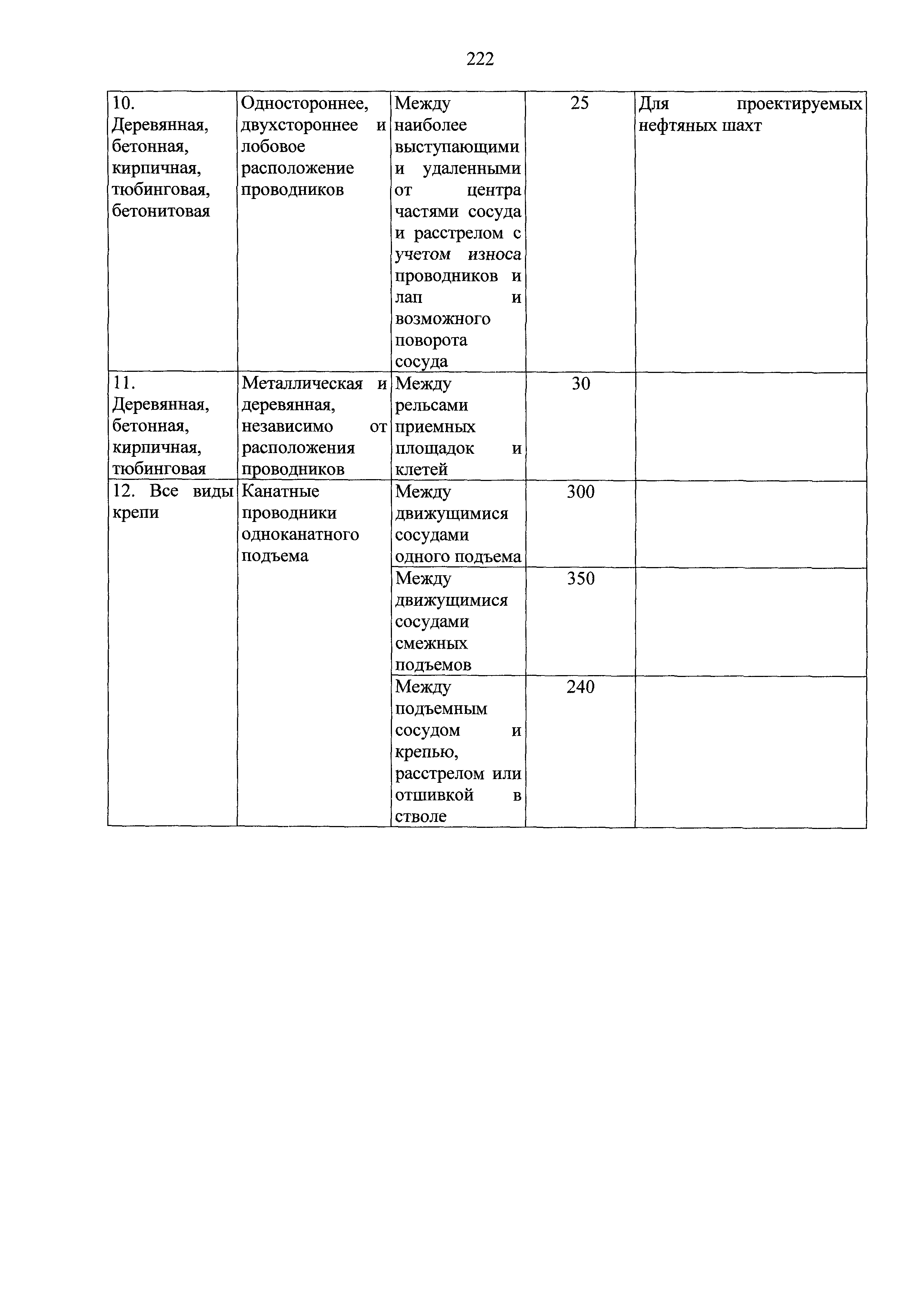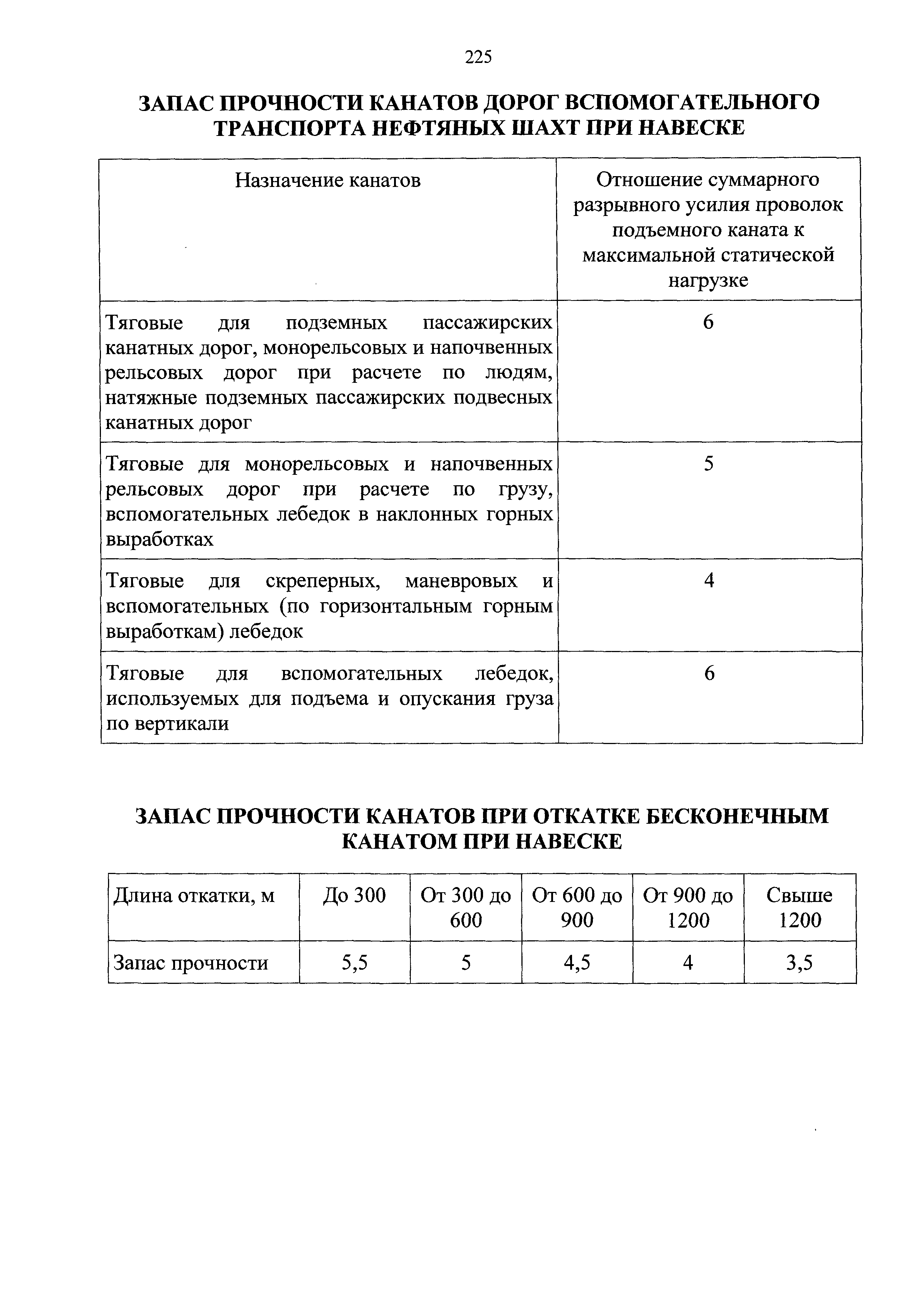 | Оглавление: | I. Основные положения II. Общие требования к организации работ III. Общие требования к документации IV. противоаварийная защита V. Требования к работникам VI. Ведение горных работ VII. Устройство выходов из горных выработок VIII. Общие требования к проведению и креплению горных выработок IX. Проведение, крепление и армирование вертикальных горных выработок X. Требования к горизонтальным и наклонным горным выработкам XI. Содержание и ремонт горных выработок XII. Предупреждение падения людей и предметов в горные выработки XIII. Ликвидация и консервация горных выработок XIV. Рудничная атмосфера и требования к нефтяным шахтам, опасным по газу XV. Вентиляционные устройства XVI. Вентиляторные установки XVII. Проветривание горных выработок XVIII. Контроль состояния рудничной атмосферы XIX. Общие требования к путевому хозяйству при перевозке людей и грузов XX. Перевозка людей и грузов по горизонтальным горным выработкам XXI. Передвижение и перевозка людей и грузов по наклонным и вертикальным горным выработкам XXII. Общие требования к канатам, прицепным и подвесным устройствам XXIII. Испытание канатов XXIV. Надзор за канатами XXV. Инструментальный контроль за канатами XXVI. Подвесные устройства подъемных сосудов XXVII. Подъемные машины и лебедки XXVIII. Общие требования к строительству, эксплуатации и ремонту скважин XXIX. Строительство подземных скважин XXX. Насосные установки XXXI. Эксплуатация и ремонт подземных скважин XXXII. Общие требования к транспорту теплоносителя, нефти, воды, попутного нефтяного газа и сжатого воздуха в горных выработках XXXIII. Материалы, используемые в горных выработках для сбора, транспорта, подготовки нефти, попутного нефтяного газа и воды XXXIV. Емкости системы сбора, транспорта и подготовка нефти и воды XXXV. Шахтные трубопроводы XXXVI. Служба по термошахтной разработке и шахтные "горячие трубопроводы" XXXVII. Система сбора и транспорта попутного нефтяного газа и газового конденсата XXXVIII. Водоотлив XXXIX. Общие требования к электротехническому хозяйству XL. Область и условия применения электрооборудования XLI. Питание электрооборудования XLII. Камеры и ниши для электрооборудования XLIII. Освещение светильниками, питаемыми от электрической сети XLIV. Освещение аккумуляторными светильниками индивидуального пользования XLV. Кабельные линии XLVI. Защита кабельных линий, электродвигателей и трансформаторов XLVII. Заземление XLVIII. Общие требования к связи и сигнализации XLIX. Сигнализация и связь на шахтном транспорте и подъеме L. Пожарная безопасность и противопожарная безопасность LI. Ведение работ в горных выработках, в которых возможны прорывы воды LII. Ведение работ в горных выработках, в которых возможны прорывы теплоносителя Приложение № 1. Термины и их определения Приложение № 2. Минимальные площади поперечных сечений горизонтальных и наклонных горных выработок в свету Приложение № 3. Ширина проходов для людей и величина зазоров между крепью, оборудованием, трубопроводами и подвижным составом Приложение № 4. Максимально допустимые концентрации оксида углерода, оксидов азота, сернистого ангидрида, сероводорода (вредных газов) и углеводородов (С1 - С10) в рудничной атмосфере горных выработок нефтяных шахт Приложение № 5. Максимально допустимые суммарные концентрации углеводородных газов и паров жидких углеводородов в рудничной атмосфере опасных по г