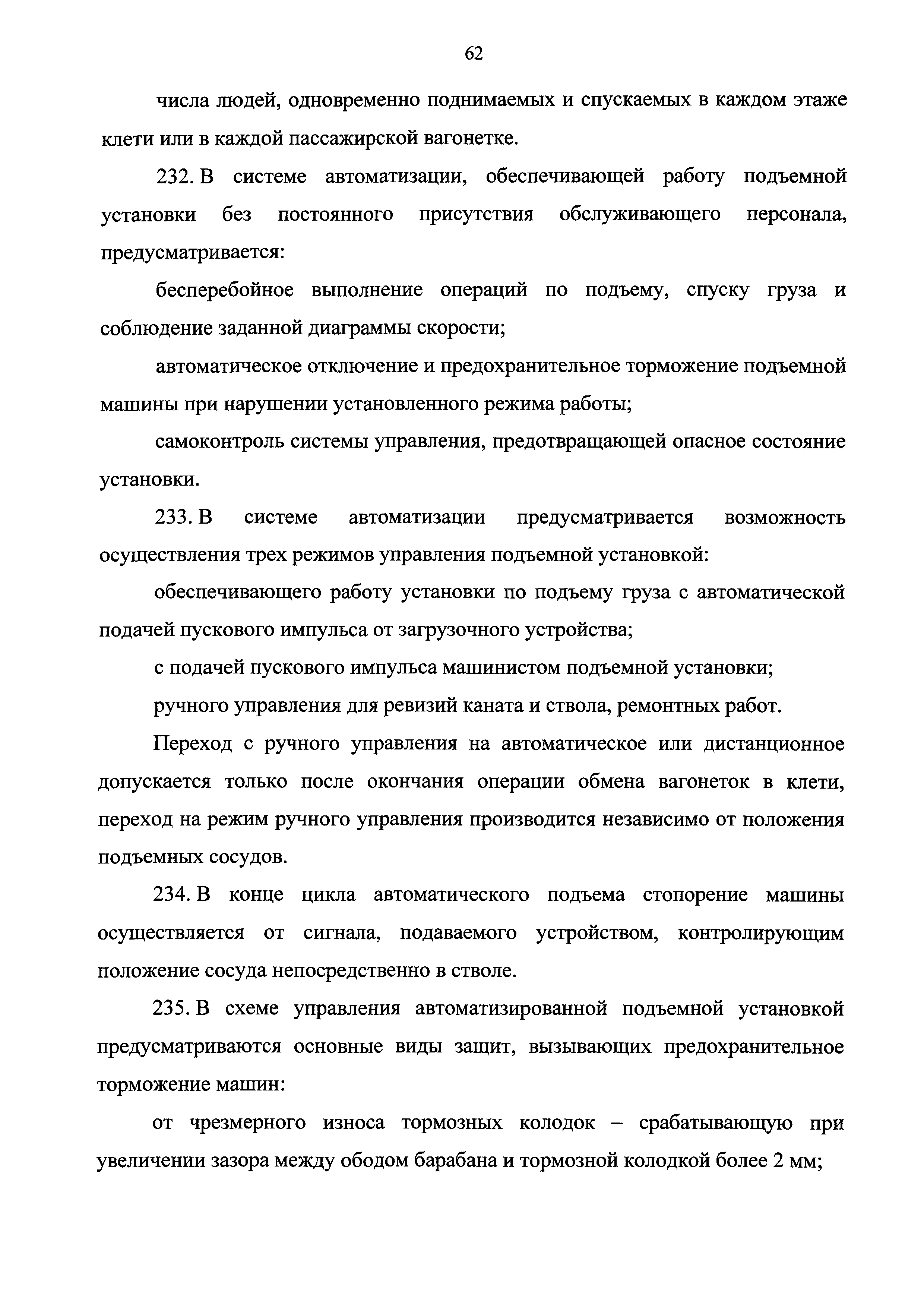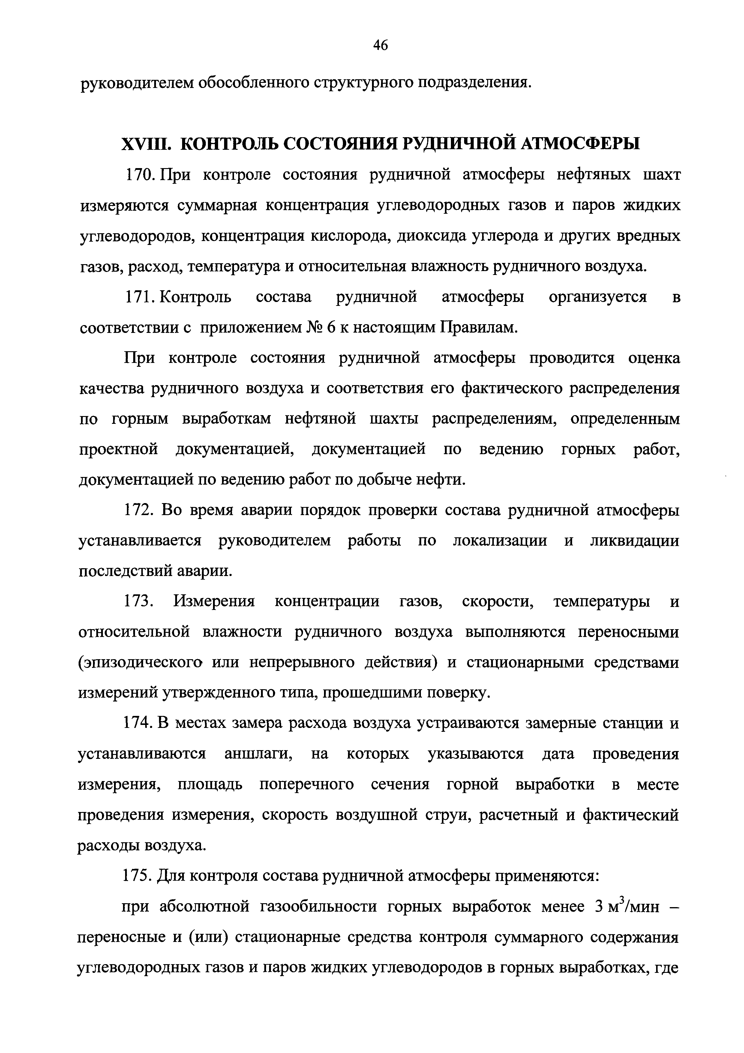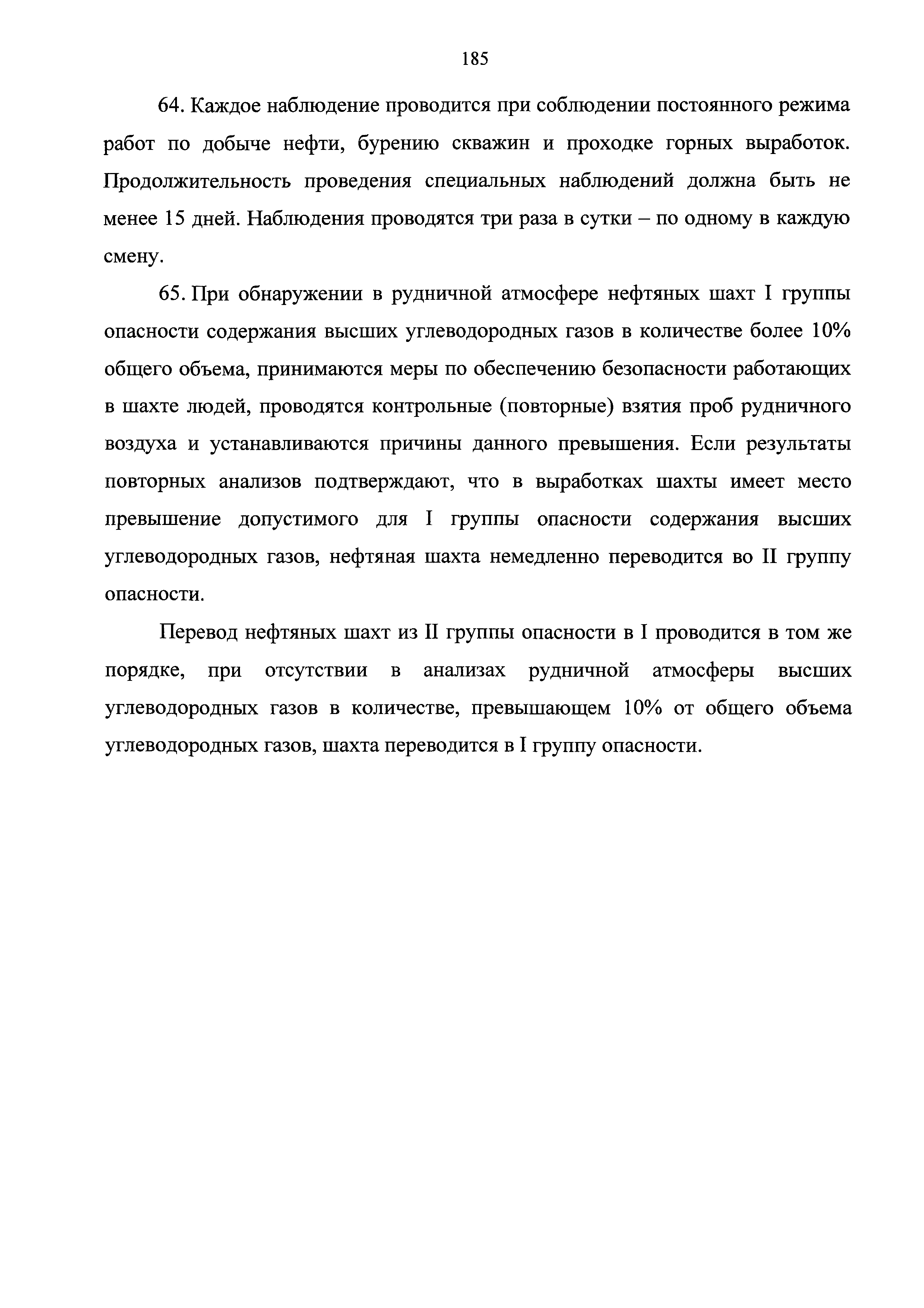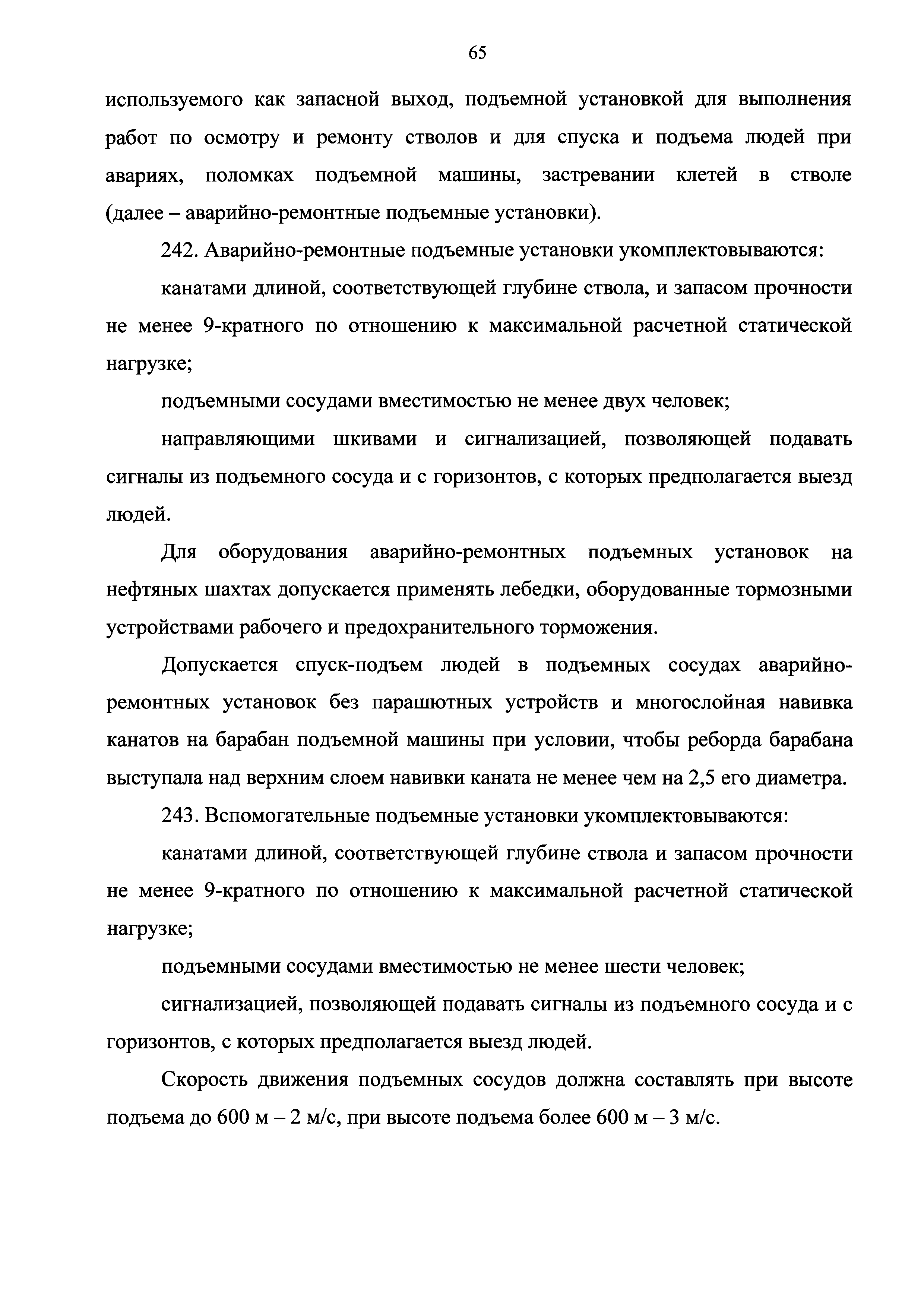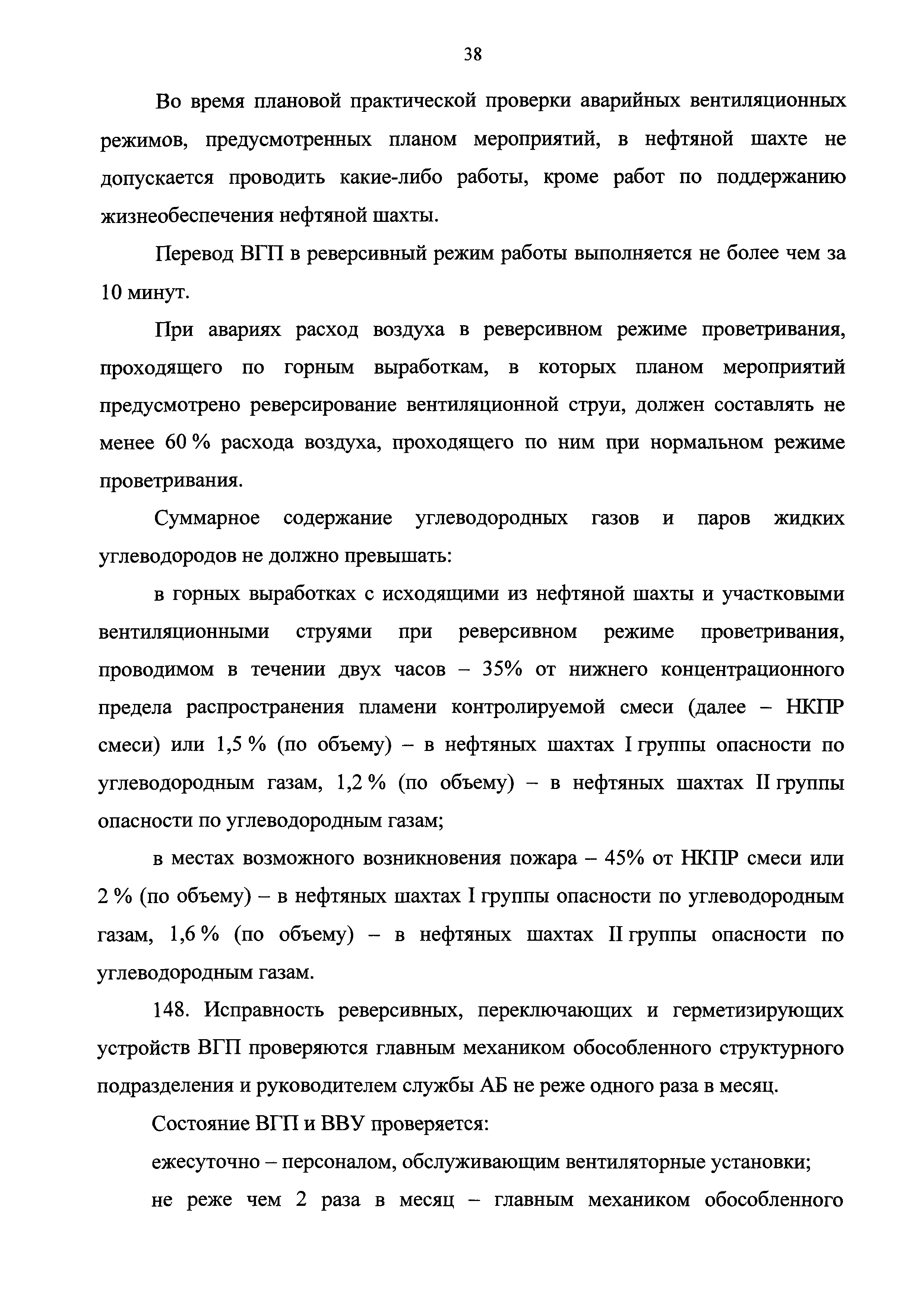 | Оглавление: | I. Основные положения II. Общие требования к организации работ III. Общие требования к документации IV. противоаварийная защита V. Требования к работникам VI. Ведение горных работ VII. Устройство выходов из горных выработок VIII. Общие требования к проведению и креплению горных выработок IX. Проведение, крепление и армирование вертикальных горных выработок X. Требования к горизонтальным и наклонным горным выработкам XI. Содержание и ремонт горных выработок XII. Предупреждение падения людей и предметов в горные выработки XIII. Ликвидация и консервация горных выработок XIV. Рудничная атмосфера и требования к нефтяным шахтам, опасным по газу XV. Вентиляционные устройства XVI. Вентиляторные установки XVII. Проветривание горных выработок XVIII. Контроль состояния рудничной атмосферы XIX. Общие требования к путевому хозяйству при перевозке людей и грузов XX. Перевозка людей и грузов по горизонтальным горным выработкам XXI. Передвижение и перевозка людей и грузов по наклонным и вертикальным горным выработкам XXII. Общие требования к канатам, прицепным и подвесным устройствам XXIII. Испытание канатов XXIV. Надзор за канатами XXV. Инструментальный контроль за канатами XXVI. Подвесные устройства подъемных сосудов XXVII. Подъемные машины и лебедки XXVIII. Общие требования к строительству, эксплуатации и ремонту скважин XXIX. Строительство подземных скважин XXX. Насосные установки XXXI. Эксплуатация и ремонт подземных скважин XXXII. Общие требования к транспорту теплоносителя, нефти, воды, попутного нефтяного газа и сжатого воздуха в горных выработках XXXIII. Материалы, используемые в горных выработках для сбора, транспорта, подготовки нефти, попутного нефтяного газа и воды XXXIV. Емкости системы сбора, транспорта и подготовка нефти и воды XXXV. Шахтные трубопроводы XXXVI. Служба по термошахтной разработке и шахтные "горячие трубопроводы" XXXVII. Система сбора и транспорта попутного нефтяного газа и газового конденсата XXXVIII. Водоотлив XXXIX. Общие требования к электротехническому хозяйству XL. Область и условия применения электрооборудования XLI. Питание электрооборудования XLII. Камеры и ниши для электрооборудования XLIII. Освещение светильниками, питаемыми от электрической сети XLIV. Освещение аккумуляторными светильниками индивидуального пользования XLV. Кабельные линии XLVI. Защита кабельных линий, электродвигателей и трансформаторов XLVII. Заземление XLVIII. Общие требования к связи и сигнализации XLIX. Сигнализация и связь на шахтном транспорте и подъеме L. Пожарная безопасность и противопожарная безопасность LI. Ведение работ в горных выработках, в которых возможны прорывы воды LII. Ведение работ в горных выработках, в которых возможны прорывы теплоносителя Приложение № 1. Термины и их определения Приложение № 2. Минимальные площади поперечных сечений горизонтальных и наклонных горных выработок в свету Приложение № 3. Ширина проходов для людей и величина зазоров между крепью, оборудованием, трубопроводами и подвижным составом Приложение № 4. Максимально допустимые концентрации оксида углерода, оксидов азота, сернистого ангидрида, сероводорода (вредных газов) и углеводородов (С1 - С10) в рудничной атмосфере горных выработок нефтяных шахт Приложение № 5. Максимально допустимые суммарные концентрации углеводородных газов и паров жидких углеводородов в рудничной атмосфере опасных по г