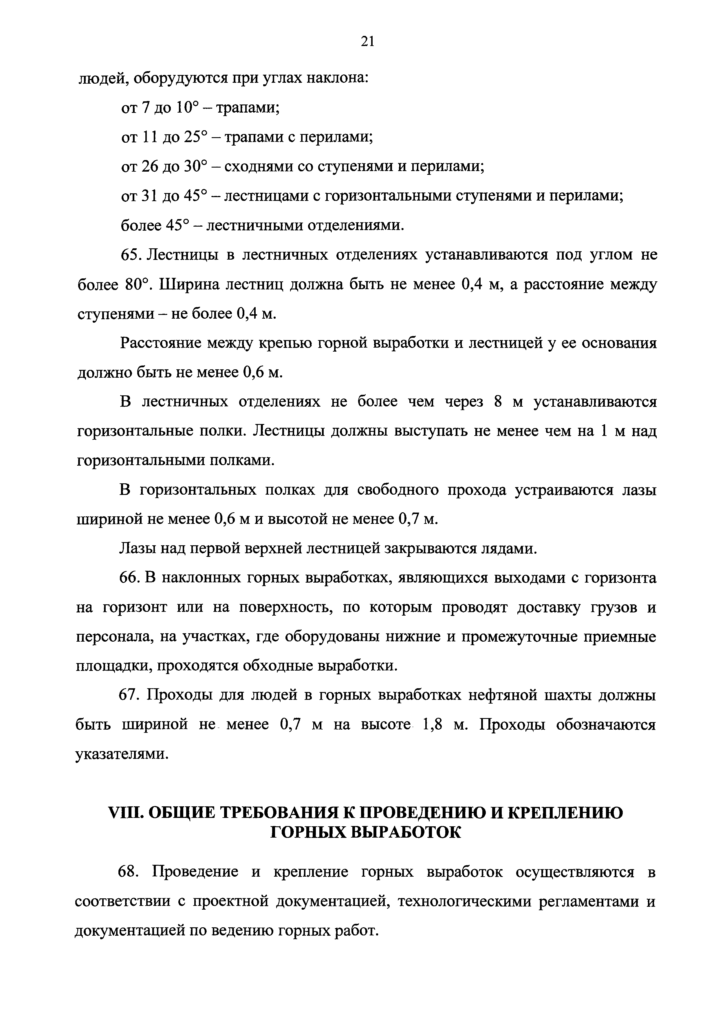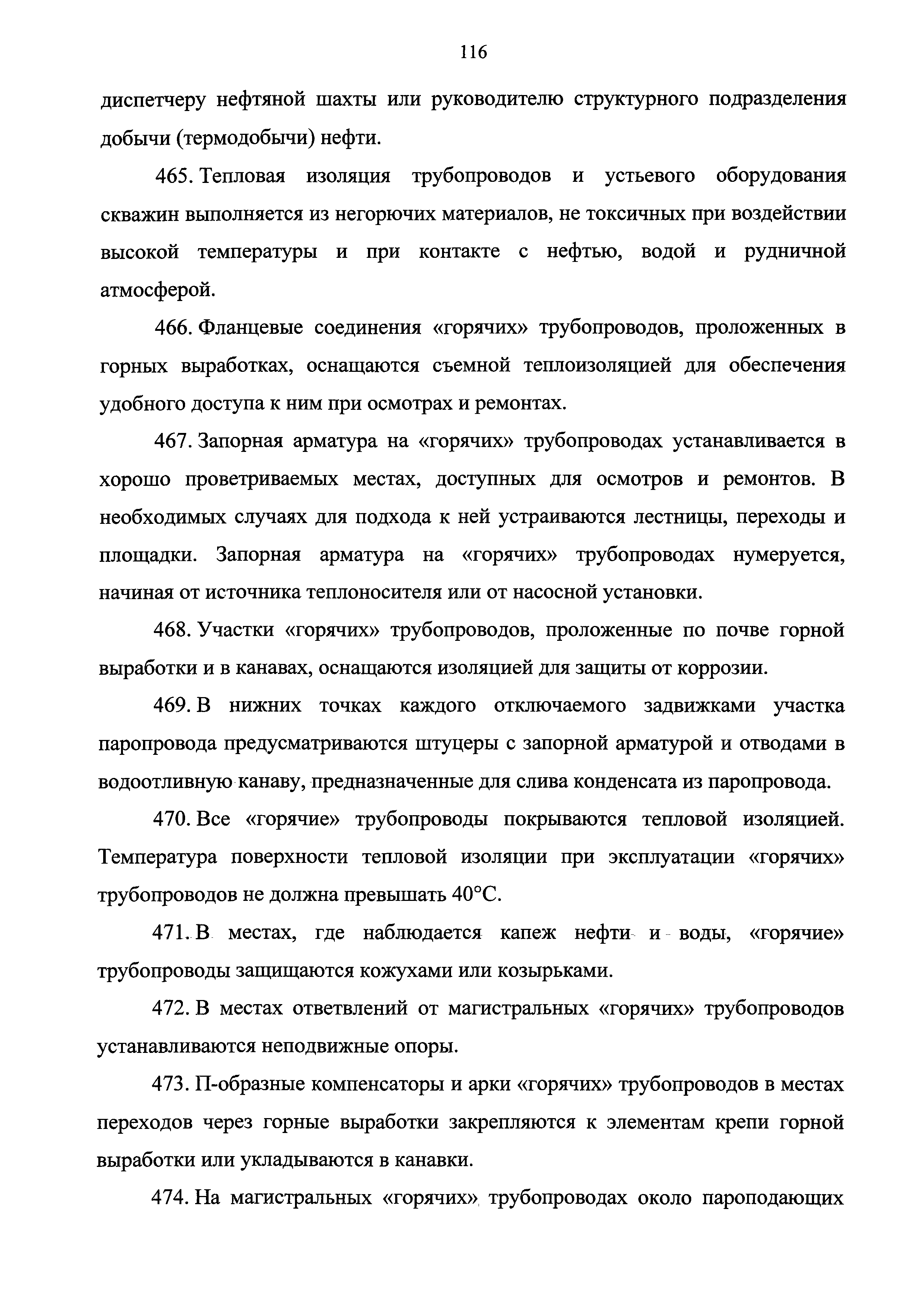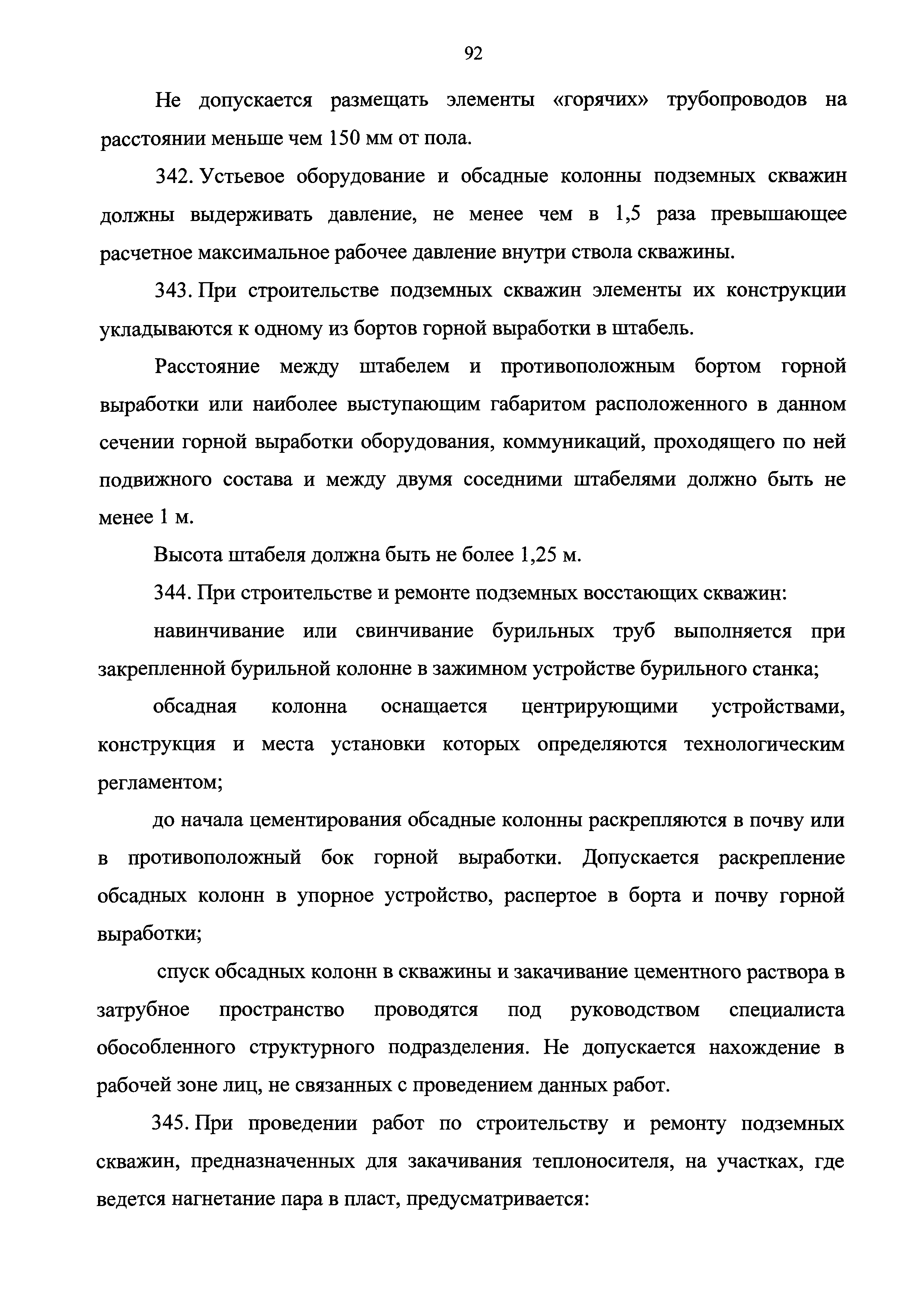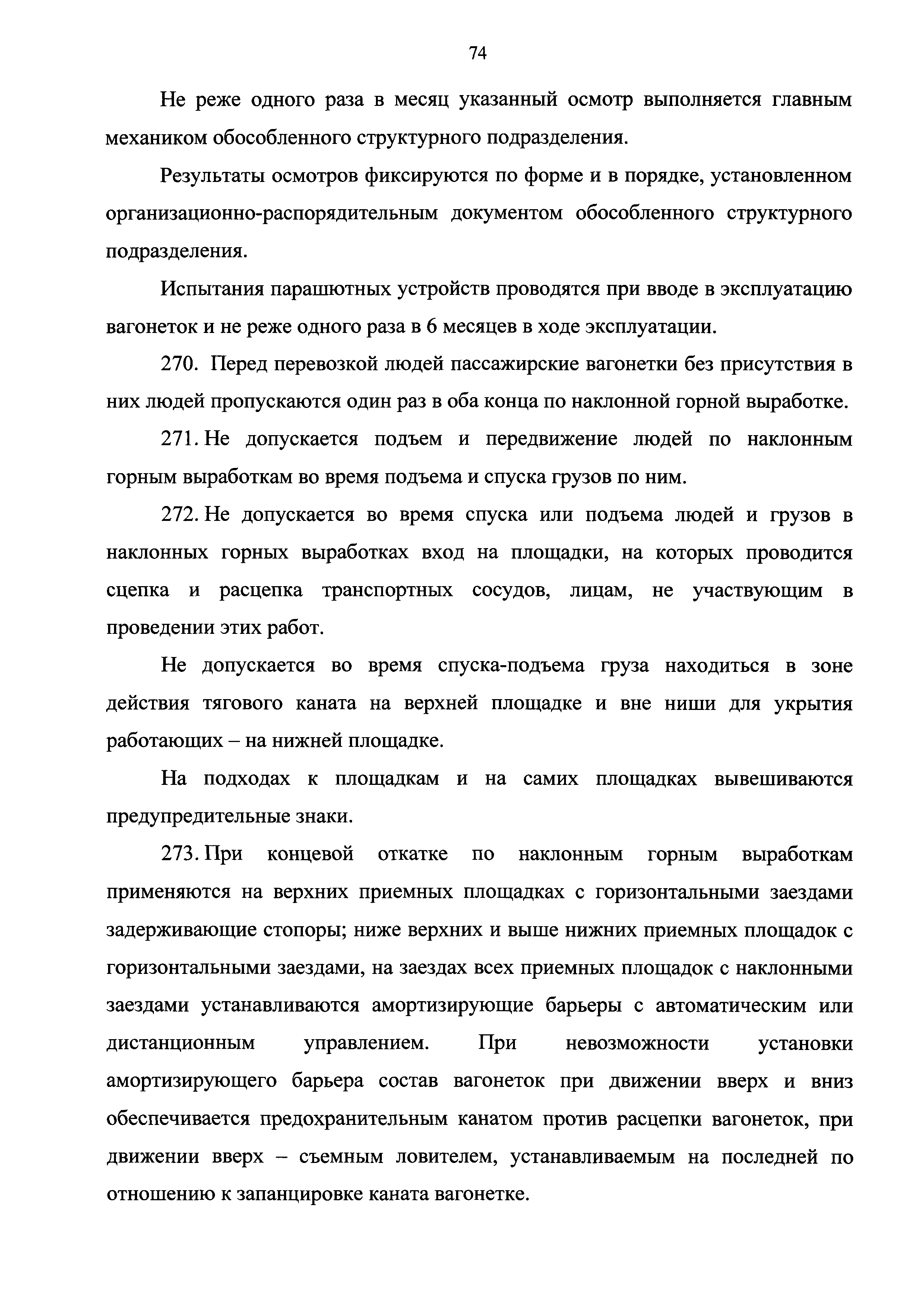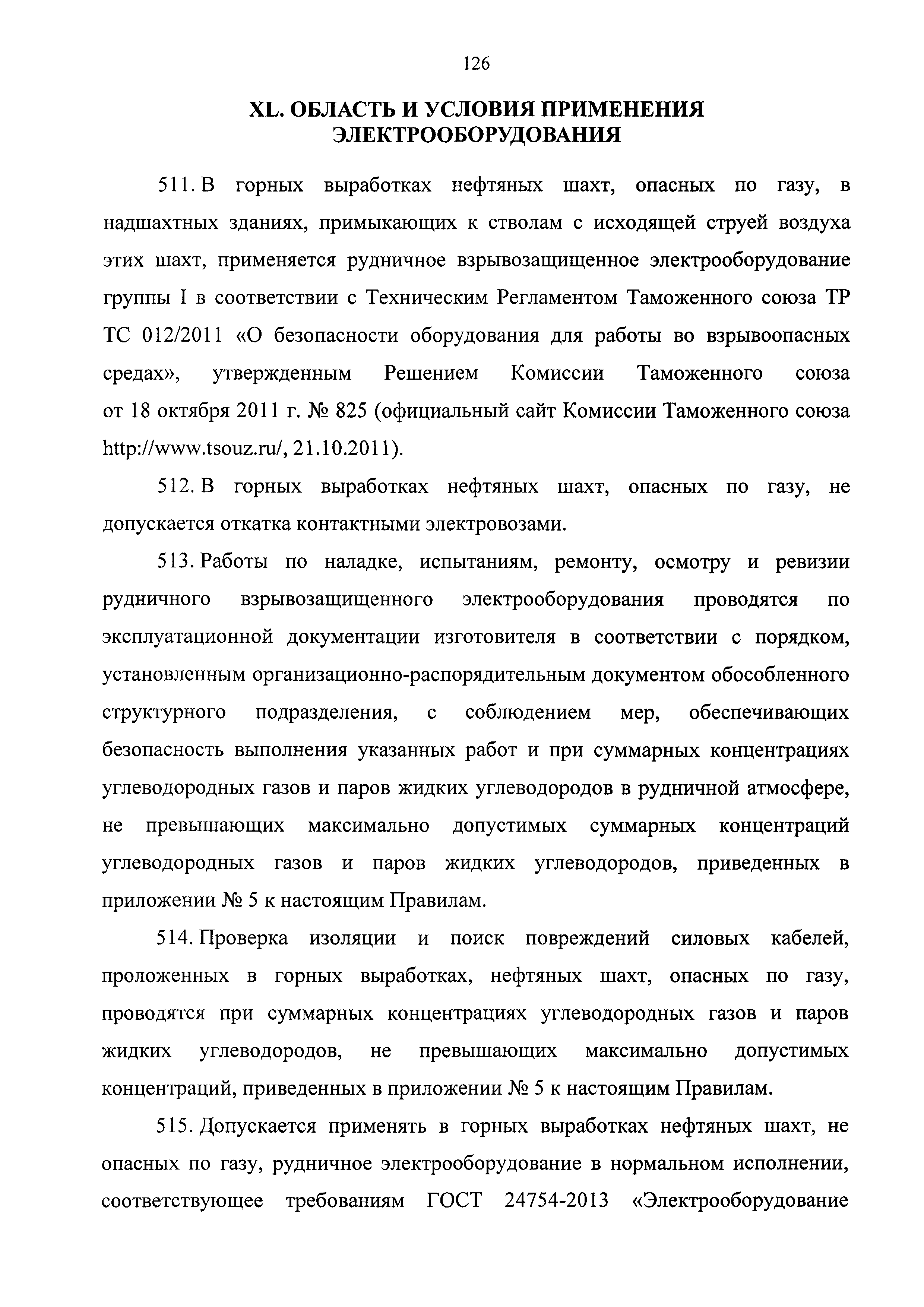 | Оглавление: | I. Основные положения II. Общие требования к организации работ III. Общие требования к документации IV. противоаварийная защита V. Требования к работникам VI. Ведение горных работ VII. Устройство выходов из горных выработок VIII. Общие требования к проведению и креплению горных выработок IX. Проведение, крепление и армирование вертикальных горных выработок X. Требования к горизонтальным и наклонным горным выработкам XI. Содержание и ремонт горных выработок XII. Предупреждение падения людей и предметов в горные выработки XIII. Ликвидация и консервация горных выработок XIV. Рудничная атмосфера и требования к нефтяным шахтам, опасным по газу XV. Вентиляционные устройства XVI. Вентиляторные установки XVII. Проветривание горных выработок XVIII. Контроль состояния рудничной атмосферы XIX. Общие требования к путевому хозяйству при перевозке людей и грузов XX. Перевозка людей и грузов по горизонтальным горным выработкам XXI. Передвижение и перевозка людей и грузов по наклонным и вертикальным горным выработкам XXII. Общие требования к канатам, прицепным и подвесным устройствам XXIII. Испытание канатов XXIV. Надзор за канатами XXV. Инструментальный контроль за канатами XXVI. Подвесные устройства подъемных сосудов XXVII. Подъемные машины и лебедки XXVIII. Общие требования к строительству, эксплуатации и ремонту скважин XXIX. Строительство подземных скважин XXX. Насосные установки XXXI. Эксплуатация и ремонт подземных скважин XXXII. Общие требования к транспорту теплоносителя, нефти, воды, попутного нефтяного газа и сжатого воздуха в горных выработках XXXIII. Материалы, используемые в горных выработках для сбора, транспорта, подготовки нефти, попутного нефтяного газа и воды XXXIV. Емкости системы сбора, транспорта и подготовка нефти и воды XXXV. Шахтные трубопроводы XXXVI. Служба по термошахтной разработке и шахтные "горячие трубопроводы" XXXVII. Система сбора и транспорта попутного нефтяного газа и газового конденсата XXXVIII. Водоотлив XXXIX. Общие требования к электротехническому хозяйству XL. Область и условия применения электрооборудования XLI. Питание электрооборудования XLII. Камеры и ниши для электрооборудования XLIII. Освещение светильниками, питаемыми от электрической сети XLIV. Освещение аккумуляторными светильниками индивидуального пользования XLV. Кабельные линии XLVI. Защита кабельных линий, электродвигателей и трансформаторов XLVII. Заземление XLVIII. Общие требования к связи и сигнализации XLIX. Сигнализация и связь на шахтном транспорте и подъеме L. Пожарная безопасность и противопожарная безопасность LI. Ведение работ в горных выработках, в которых возможны прорывы воды LII. Ведение работ в горных выработках, в которых возможны прорывы теплоносителя Приложение № 1. Термины и их определения Приложение № 2. Минимальные площади поперечных сечений горизонтальных и наклонных горных выработок в свету Приложение № 3. Ширина проходов для людей и величина зазоров между крепью, оборудованием, трубопроводами и подвижным составом Приложение № 4. Максимально допустимые концентрации оксида углерода, оксидов азота, сернистого ангидрида, сероводорода (вредных газов) и углеводородов (С1 - С10) в рудничной атмосфере горных выработок нефтяных шахт Приложение № 5. Максимально допустимые суммарные концентрации углеводородных газов и паров жидких углеводородов в рудничной атмосфере опасных по г