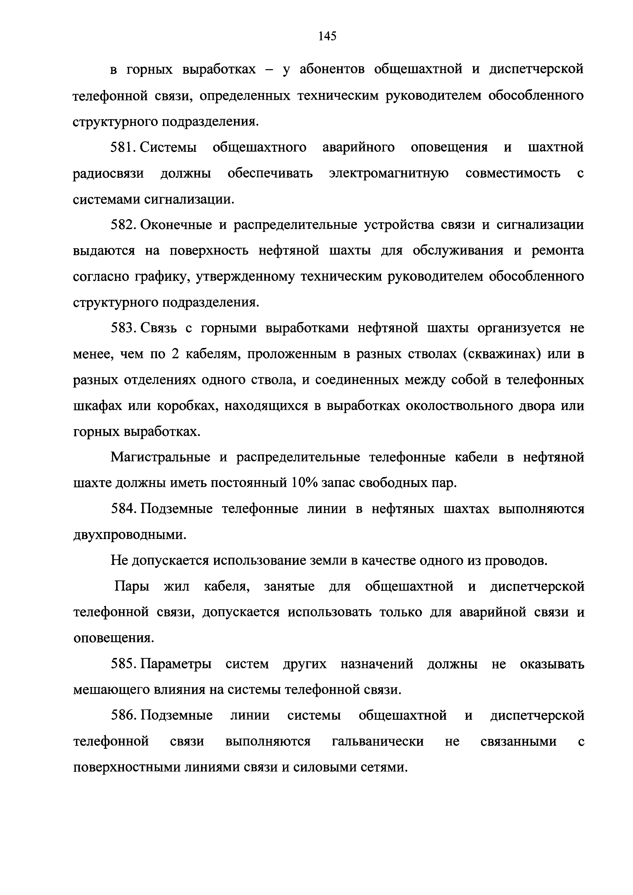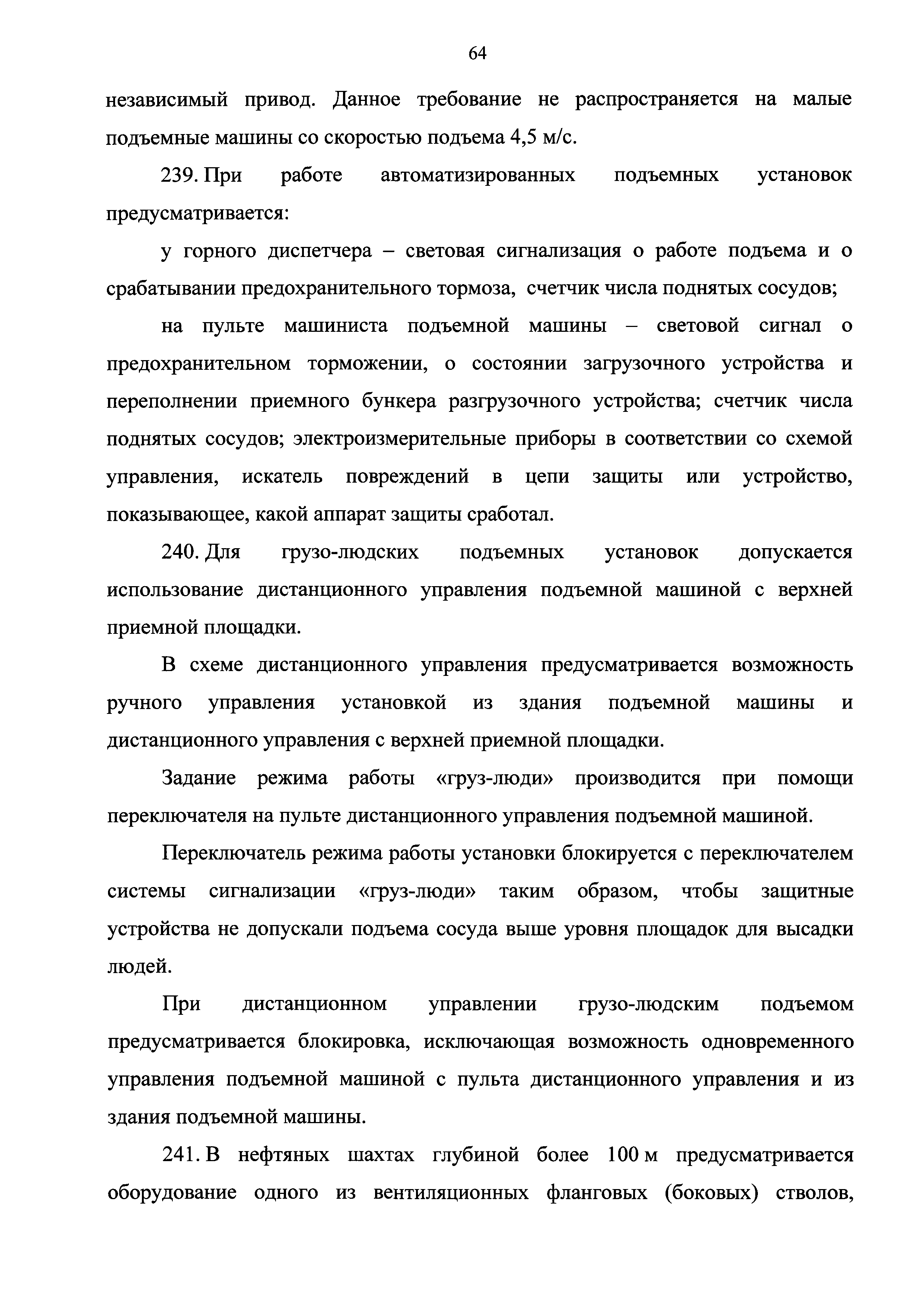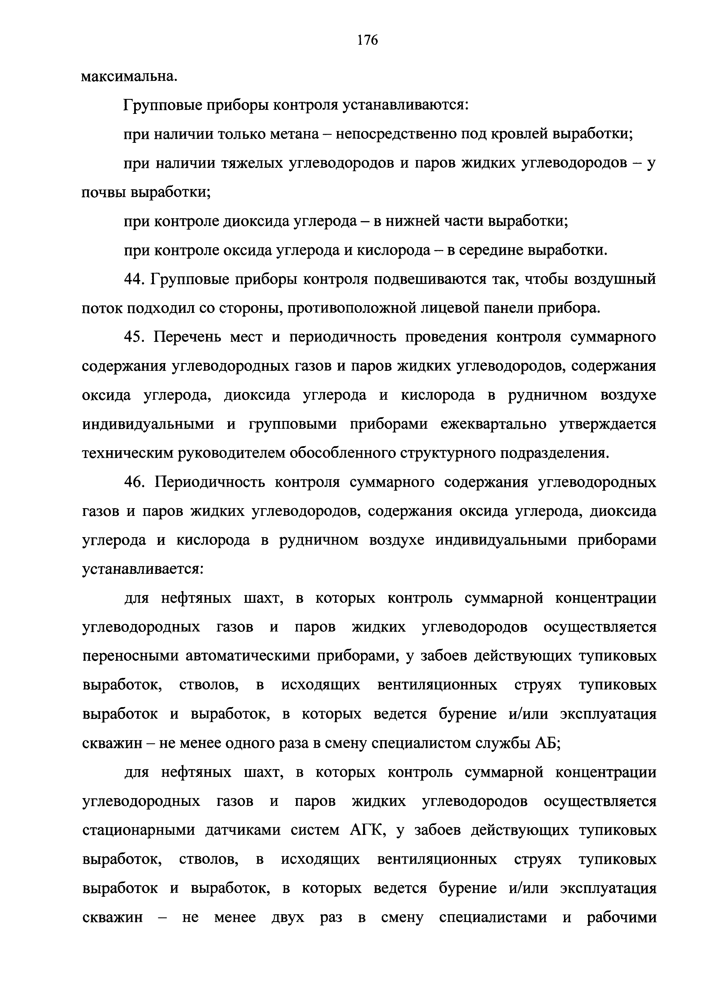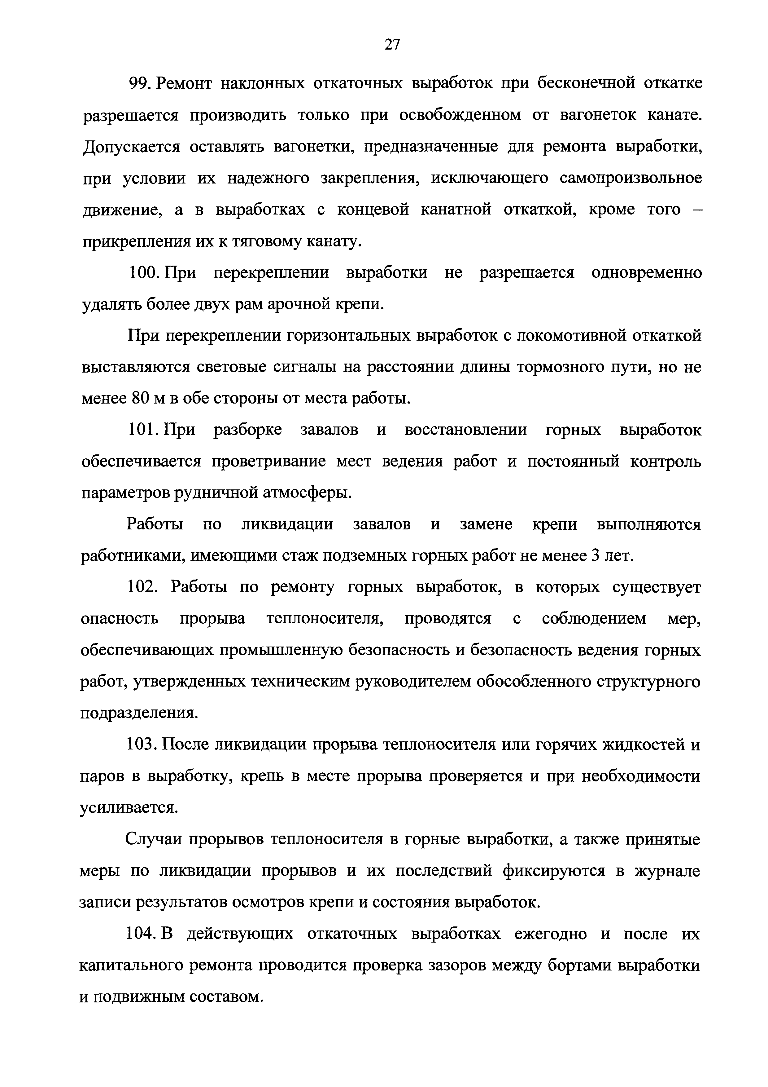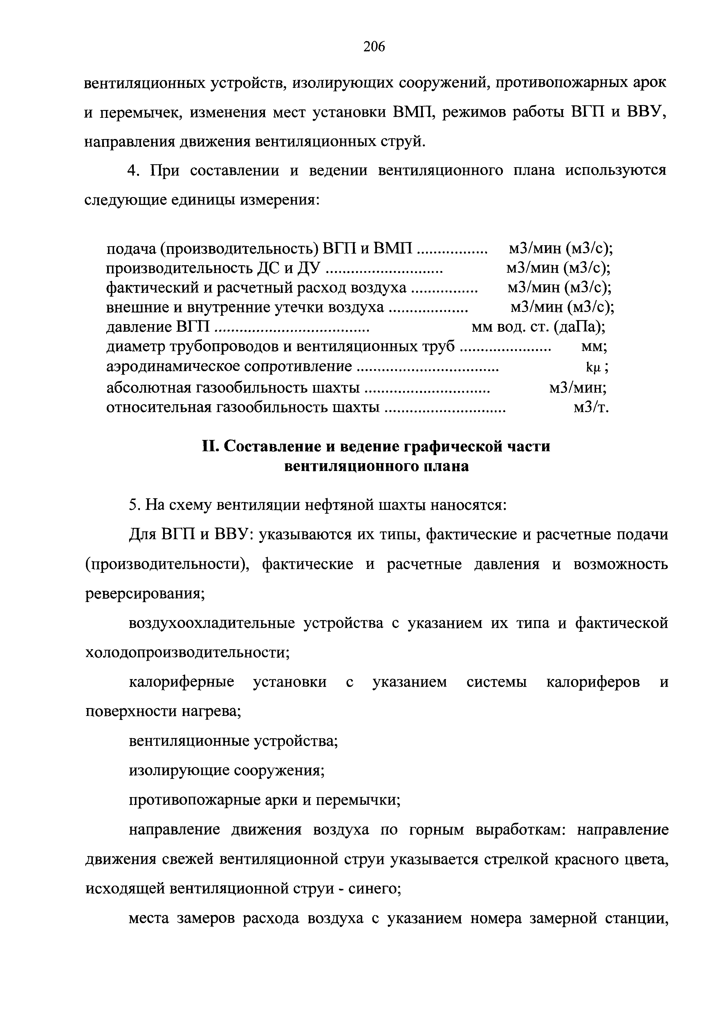 | Оглавление: | I. Основные положения II. Общие требования к организации работ III. Общие требования к документации IV. противоаварийная защита V. Требования к работникам VI. Ведение горных работ VII. Устройство выходов из горных выработок VIII. Общие требования к проведению и креплению горных выработок IX. Проведение, крепление и армирование вертикальных горных выработок X. Требования к горизонтальным и наклонным горным выработкам XI. Содержание и ремонт горных выработок XII. Предупреждение падения людей и предметов в горные выработки XIII. Ликвидация и консервация горных выработок XIV. Рудничная атмосфера и требования к нефтяным шахтам, опасным по газу XV. Вентиляционные устройства XVI. Вентиляторные установки XVII. Проветривание горных выработок XVIII. Контроль состояния рудничной атмосферы XIX. Общие требования к путевому хозяйству при перевозке людей и грузов XX. Перевозка людей и грузов по горизонтальным горным выработкам XXI. Передвижение и перевозка людей и грузов по наклонным и вертикальным горным выработкам XXII. Общие требования к канатам, прицепным и подвесным устройствам XXIII. Испытание канатов XXIV. Надзор за канатами XXV. Инструментальный контроль за канатами XXVI. Подвесные устройства подъемных сосудов XXVII. Подъемные машины и лебедки XXVIII. Общие требования к строительству, эксплуатации и ремонту скважин XXIX. Строительство подземных скважин XXX. Насосные установки XXXI. Эксплуатация и ремонт подземных скважин XXXII. Общие требования к транспорту теплоносителя, нефти, воды, попутного нефтяного газа и сжатого воздуха в горных выработках XXXIII. Материалы, используемые в горных выработках для сбора, транспорта, подготовки нефти, попутного нефтяного газа и воды XXXIV. Емкости системы сбора, транспорта и подготовка нефти и воды XXXV. Шахтные трубопроводы XXXVI. Служба по термошахтной разработке и шахтные "горячие трубопроводы" XXXVII. Система сбора и транспорта попутного нефтяного газа и газового конденсата XXXVIII. Водоотлив XXXIX. Общие требования к электротехническому хозяйству XL. Область и условия применения электрооборудования XLI. Питание электрооборудования XLII. Камеры и ниши для электрооборудования XLIII. Освещение светильниками, питаемыми от электрической сети XLIV. Освещение аккумуляторными светильниками индивидуального пользования XLV. Кабельные линии XLVI. Защита кабельных линий, электродвигателей и трансформаторов XLVII. Заземление XLVIII. Общие требования к связи и сигнализации XLIX. Сигнализация и связь на шахтном транспорте и подъеме L. Пожарная безопасность и противопожарная безопасность LI. Ведение работ в горных выработках, в которых возможны прорывы воды LII. Ведение работ в горных выработках, в которых возможны прорывы теплоносителя Приложение № 1. Термины и их определения Приложение № 2. Минимальные площади поперечных сечений горизонтальных и наклонных горных выработок в свету Приложение № 3. Ширина проходов для людей и величина зазоров между крепью, оборудованием, трубопроводами и подвижным составом Приложение № 4. Максимально допустимые концентрации оксида углерода, оксидов азота, сернистого ангидрида, сероводорода (вредных газов) и углеводородов (С1 - С10) в рудничной атмосфере горных выработок нефтяных шахт Приложение № 5. Максимально допустимые суммарные концентрации углеводородных газов и паров жидких углеводородов в рудничной атмосфере опасных по г