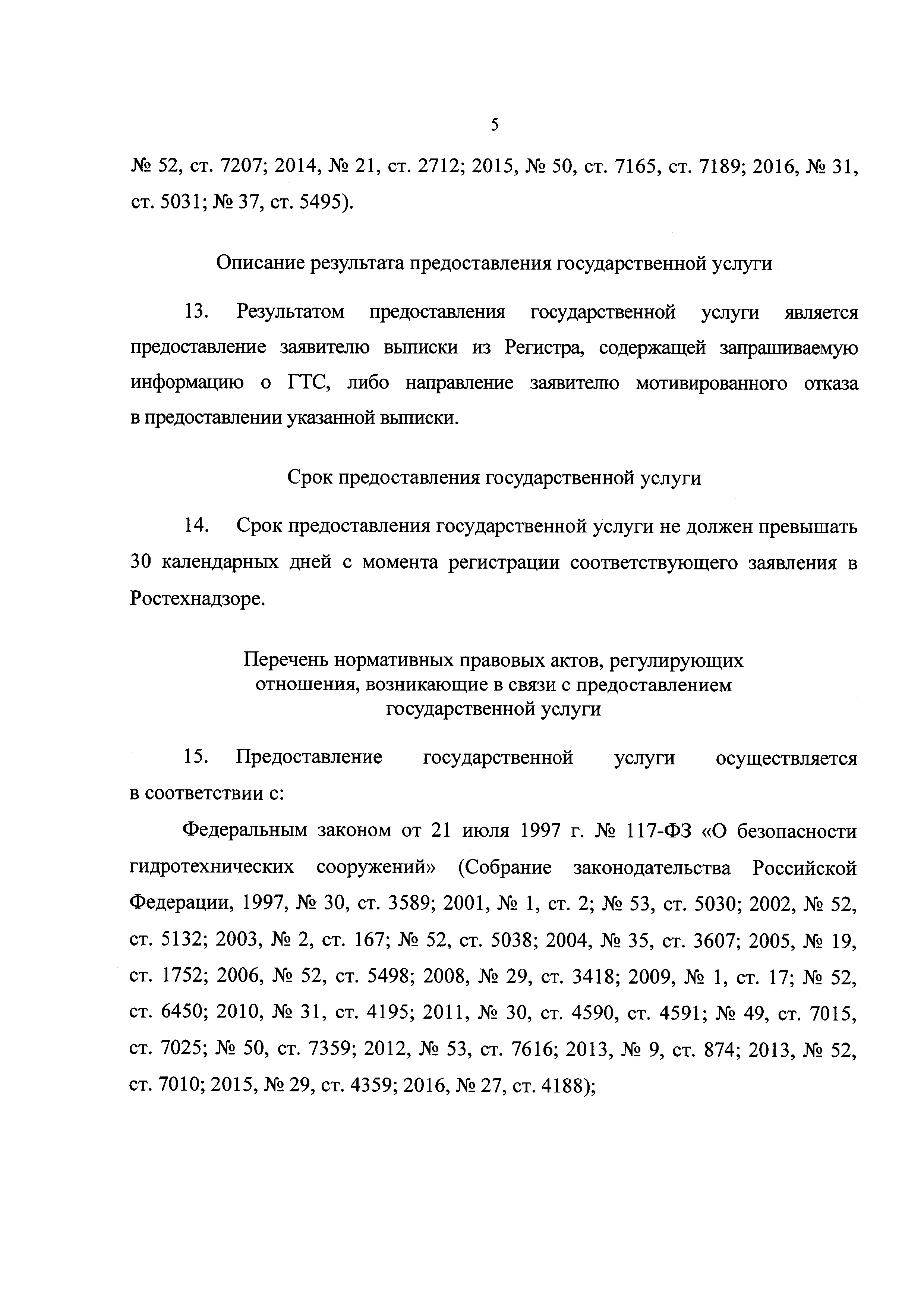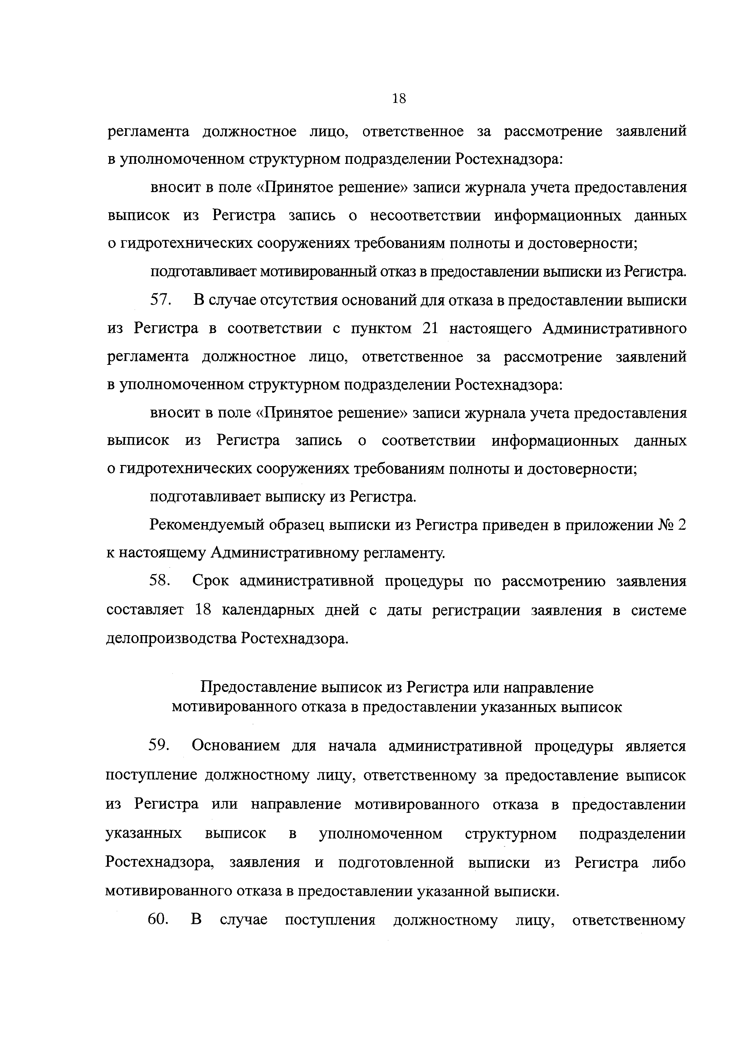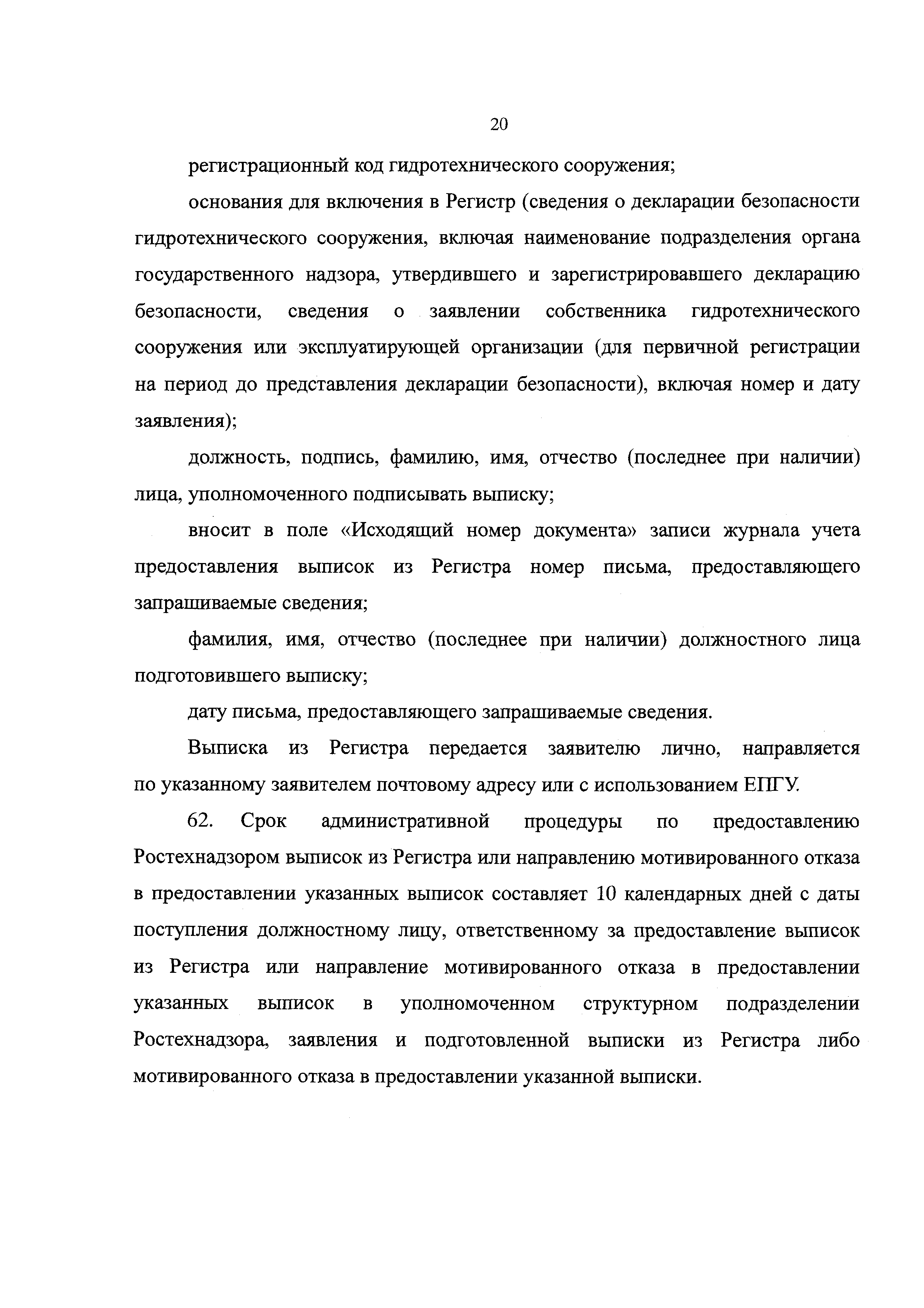 | Оглавление: | I. Общие положения II. Стандарт предоставления государственной услуги III. Состав, последовательность и сроки выполнения процедур, требования к порядку их выполнения, в том числе особенности выполнения административных процедур IV. Формы контроля за предоставлением государственной услуги V. Досудебный (внесудебный) порядок обжалования решений и действий (бездействия) органа, предоставляющего государственную услугу, а также его должностных лиц, государственных служащих Приложение № 1. Заявление о предоставлении выписки из Регистра Приложение № 2. Выписка из Российского регистра гидротехнических сооружений Приложение № 3. Блок-схема предоставления государственной услуги по предоставлению сведений из Российского регистра гидротехнических сооружений Приложение № 4. Журнал учета предоставления выписок из Российского регистра гидротехнических сооружений |