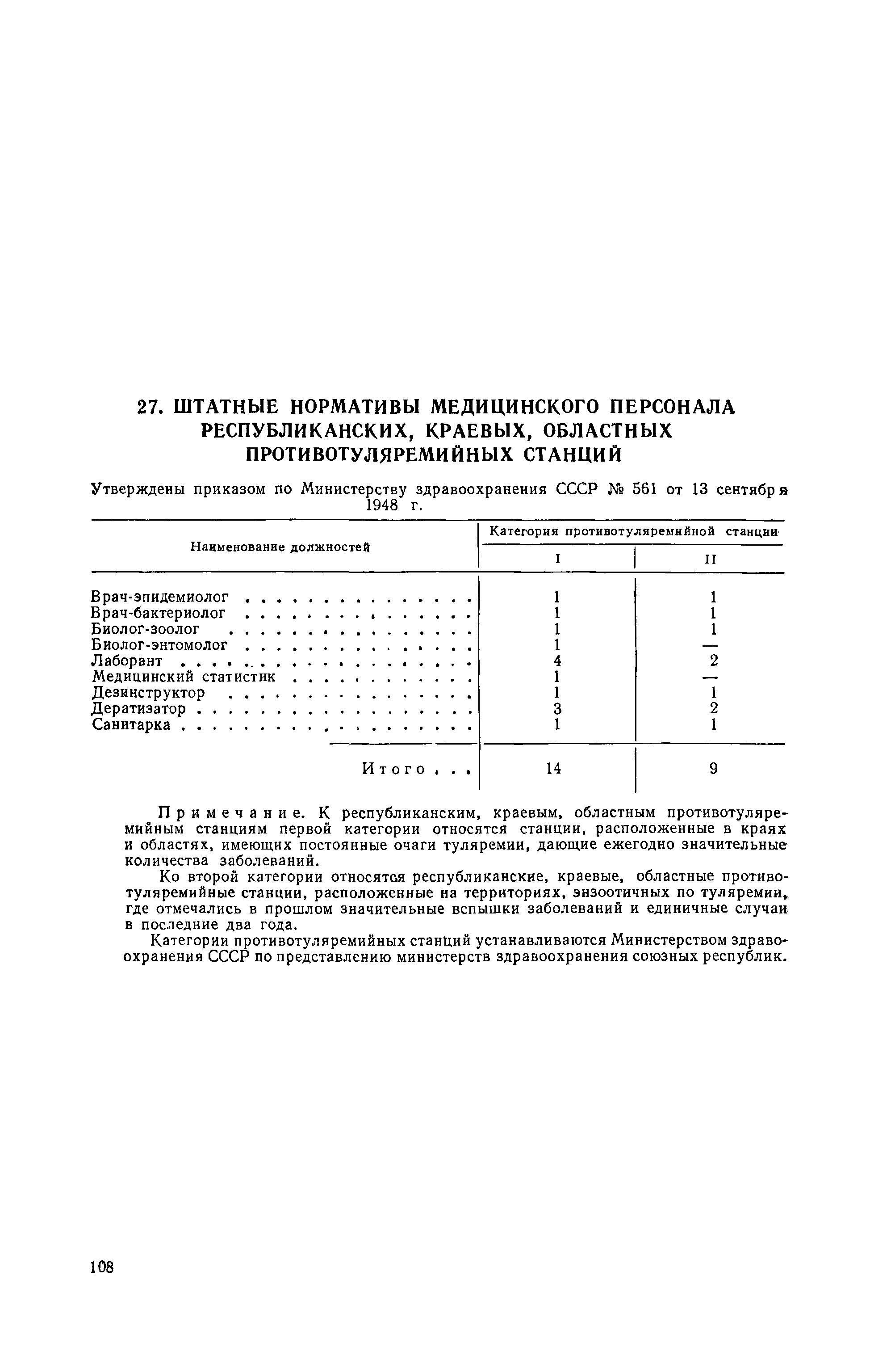 Штатные нормативы медицинского персонала республиканских, краевых, областных противотуляремийных станций| Статус: | не действует | | Название рус.: | Штатные нормативы медицинского персонала республиканских, краевых, областных противотуляремийных станций | | Дата добавления в базу: | 01.02.2017 | | Дата актуализации: | 01.01.2021 | | Утверждён: | 13.09.1948 Министерство здравоохранения СССР (USSR Ministry of Health Care 561)