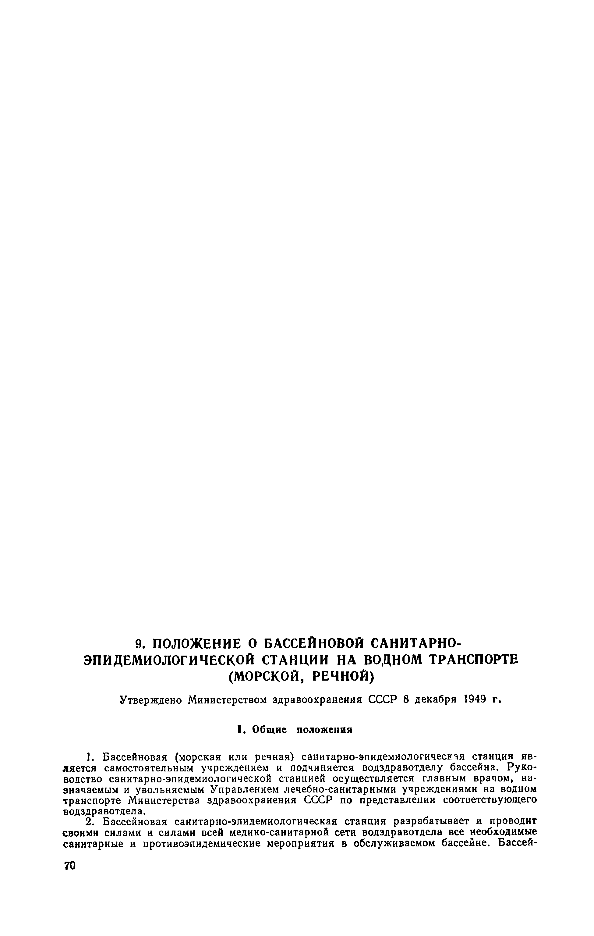 Положение о бассейновой санитарно-эпидемиологической станции на водном транспорте (морской, речной)| Статус: | не действует | | Название рус.: | Положение о бассейновой санитарно-эпидемиологической станции на водном транспорте (морской, речной) | | Дата добавления в базу: | 01.02.2017 | | Дата актуализации: | 01.01.2021 | | Оглавление: | I. Общие положения II. Задачи бассейновой (морской, речной) санитарно-эпидемиологической станции III. Структура и штаты IV. Бюджет и управление | | Утверждён: | 08.12.1949 Министерство здравоохранения СССР (USSR Ministry of Health Care )