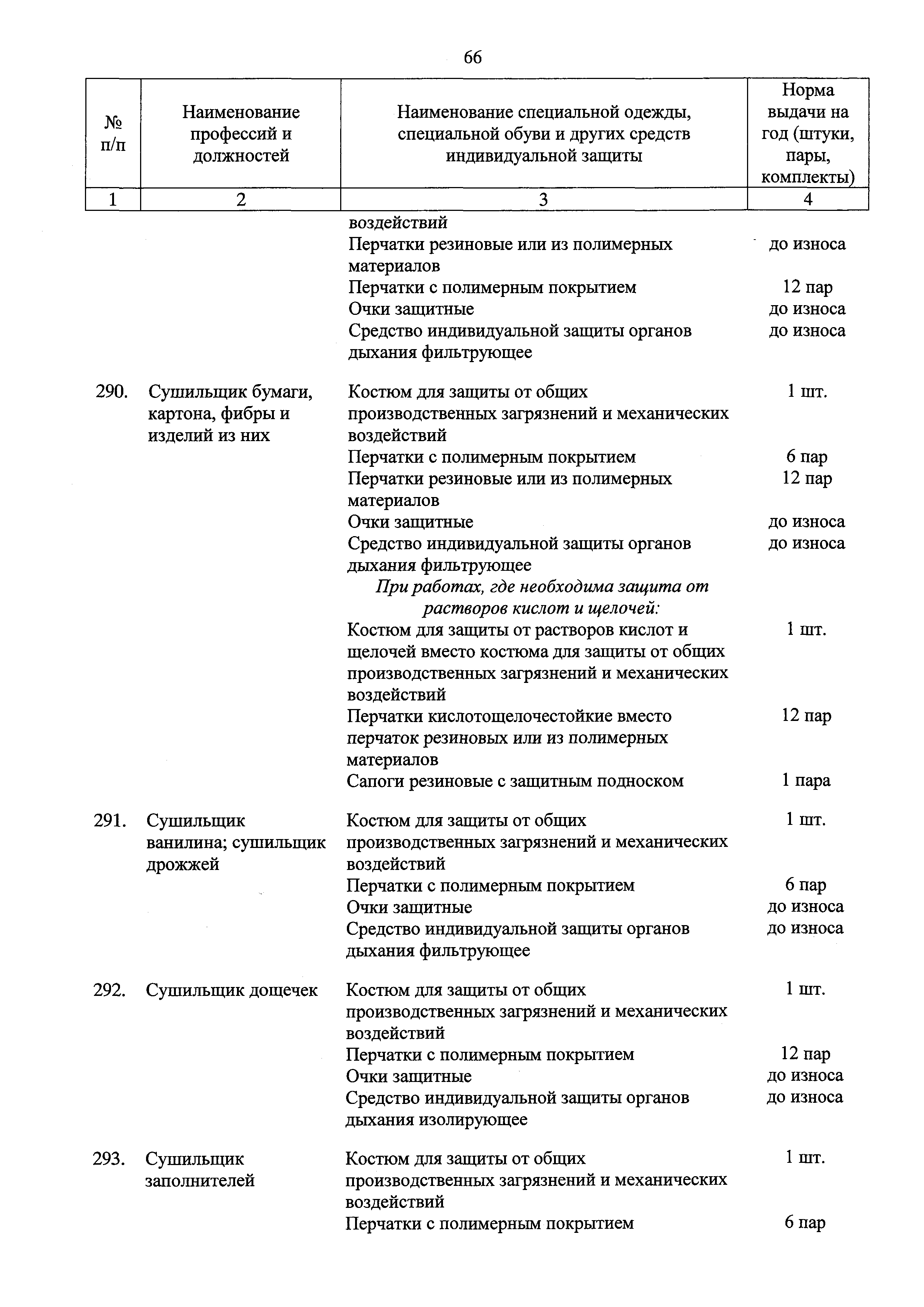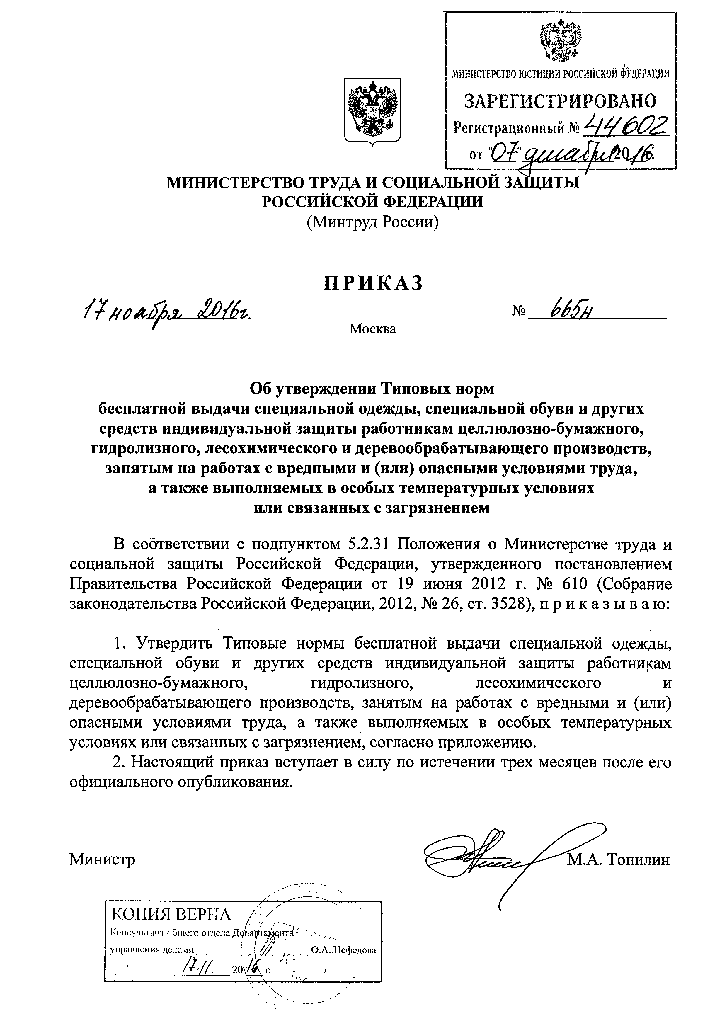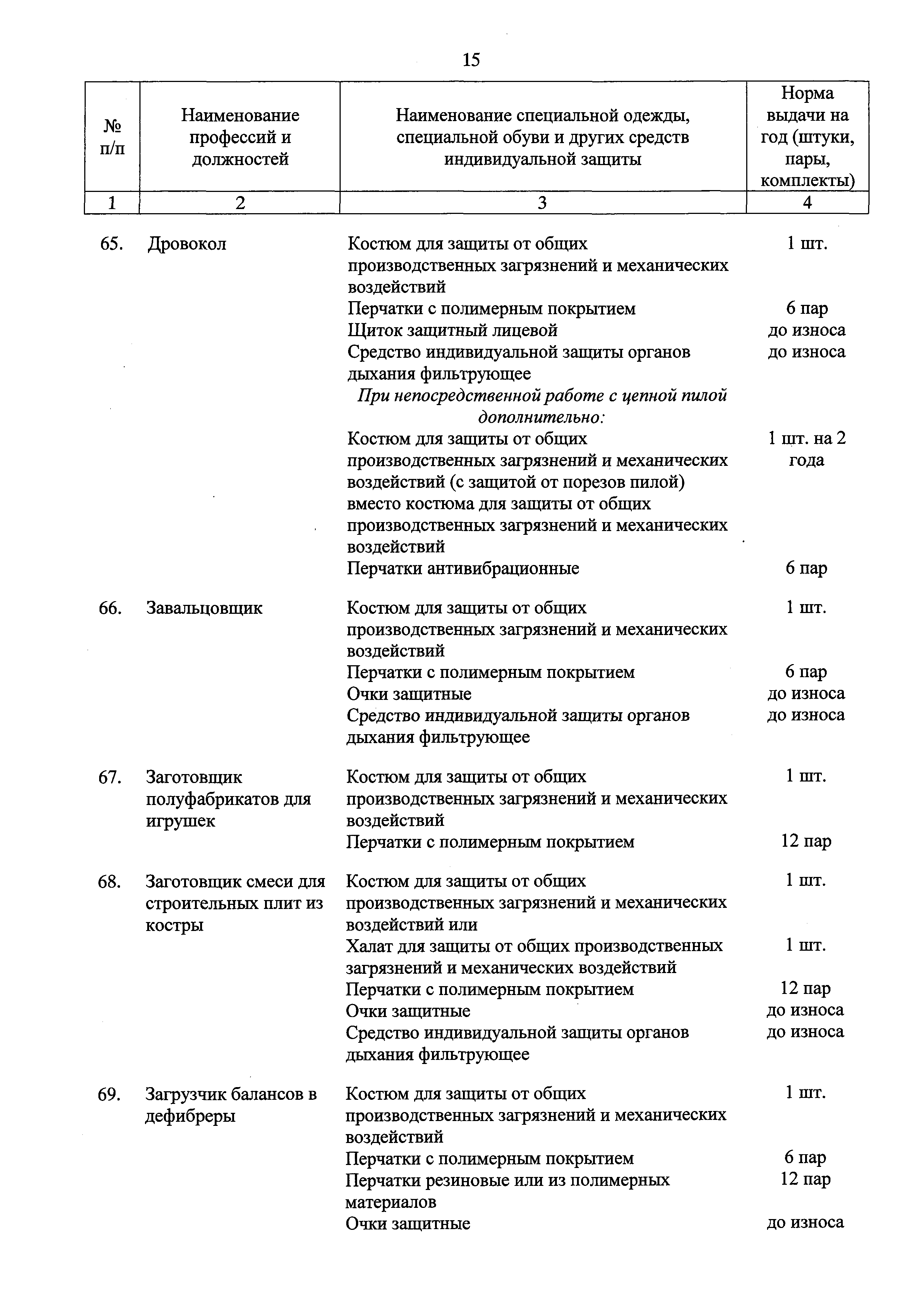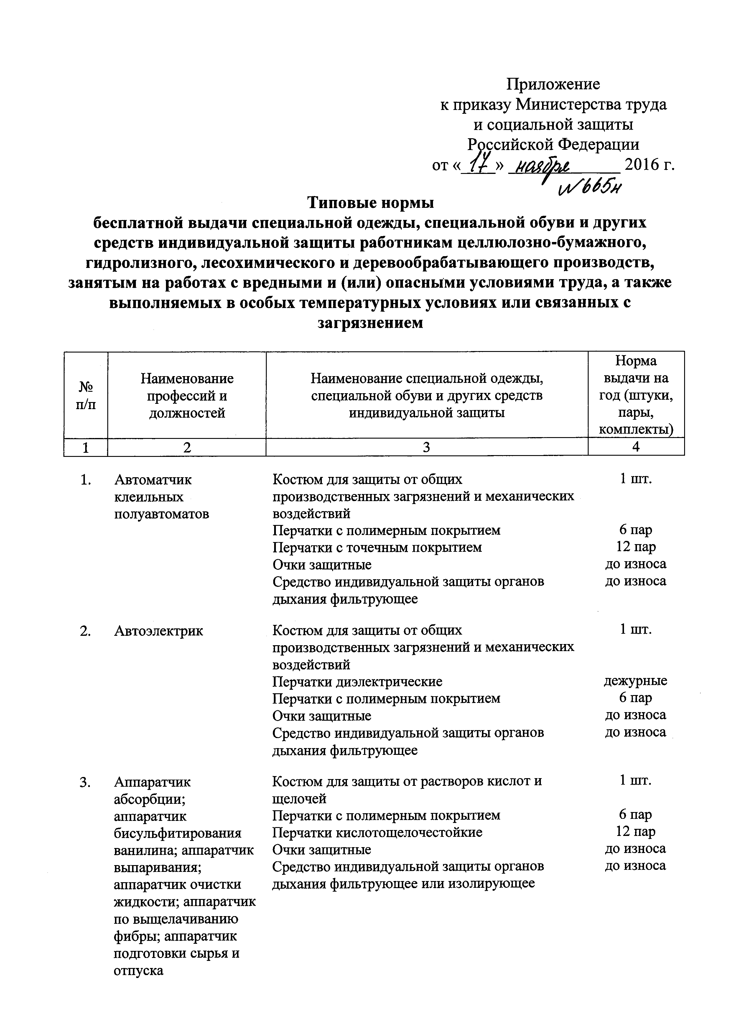 Типовые нормы бесплатной выдачи специальной одежды, специальной обуви и других средств индивидуальной защиты работникам целлюлозно-бумажного, гидролизного , лесохимического и деревообрабатывающего производств, занятым на работах с вредными и (или) опасными условиями труда, а также выполняемых в особых температурных условиях или связанных с загрязнением| Статус: | действует | | Название рус.: | Типовые нормы бесплатной выдачи специальной одежды, специальной обуви и других средств индивидуальной защиты работникам целлюлозно-бумажного, гидролизного , лесохимического и деревообрабатывающего производств, занятым на работах с вредными и (или) опасными условиями труда, а также выполняемых в особых температурных условиях или связанных с загрязнением | | Дата добавления в базу: | 01.02.2017 | | Дата актуализации: | 01.01.2021 | | Дата введения: | 09.03.2017 | | Утверждён: | 17.11.2016 Министерство труда и социальной защиты РФ (665н)
