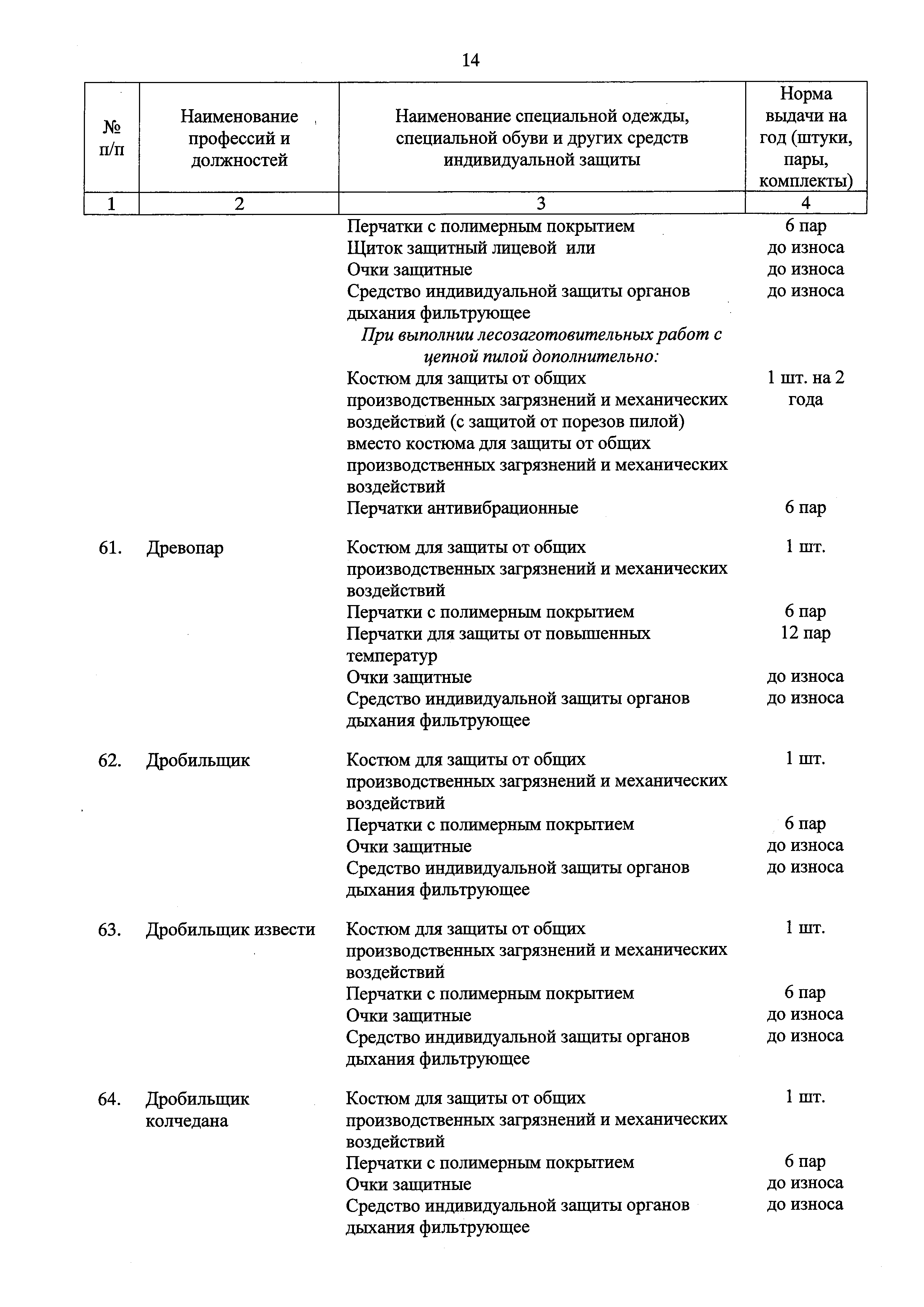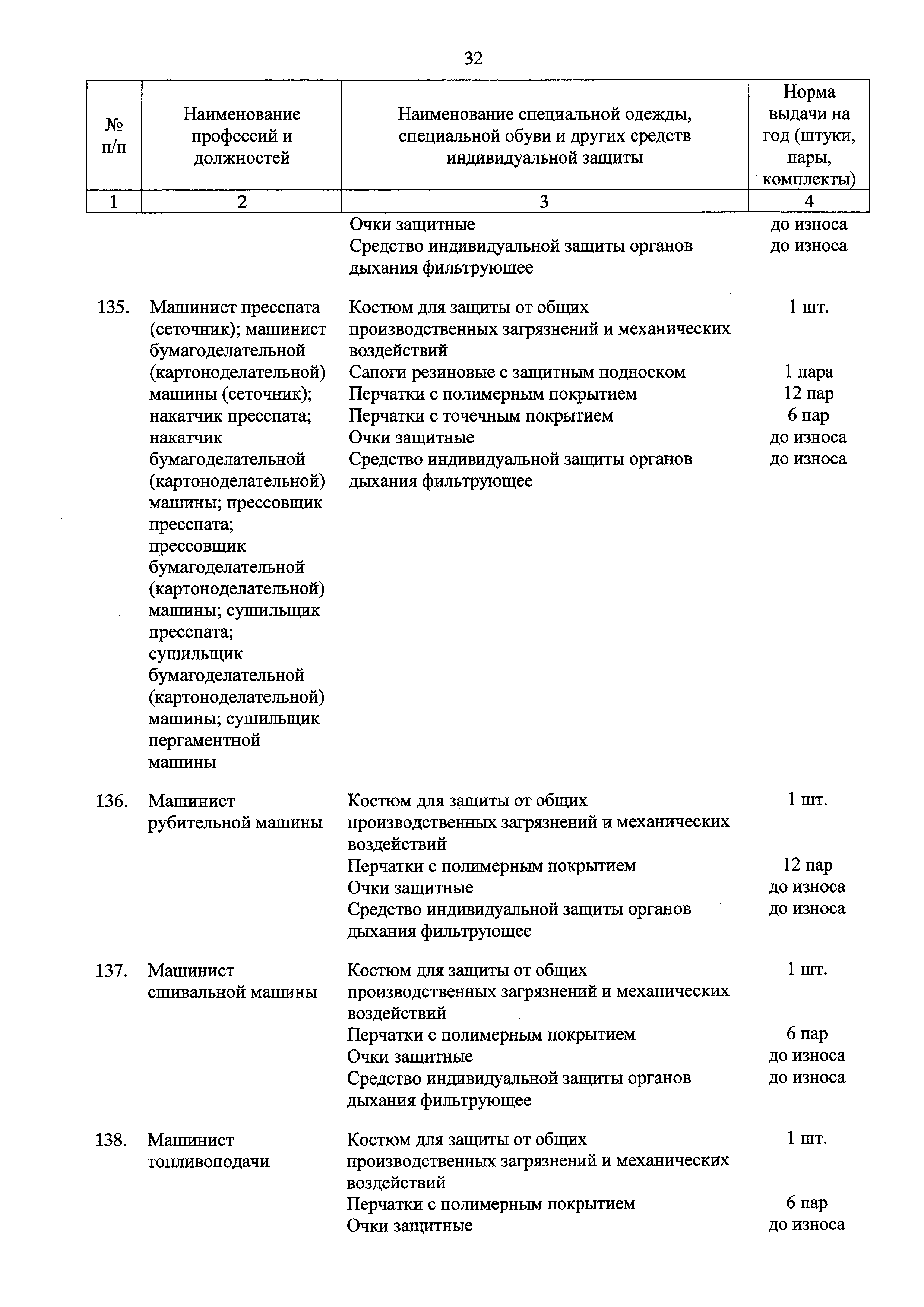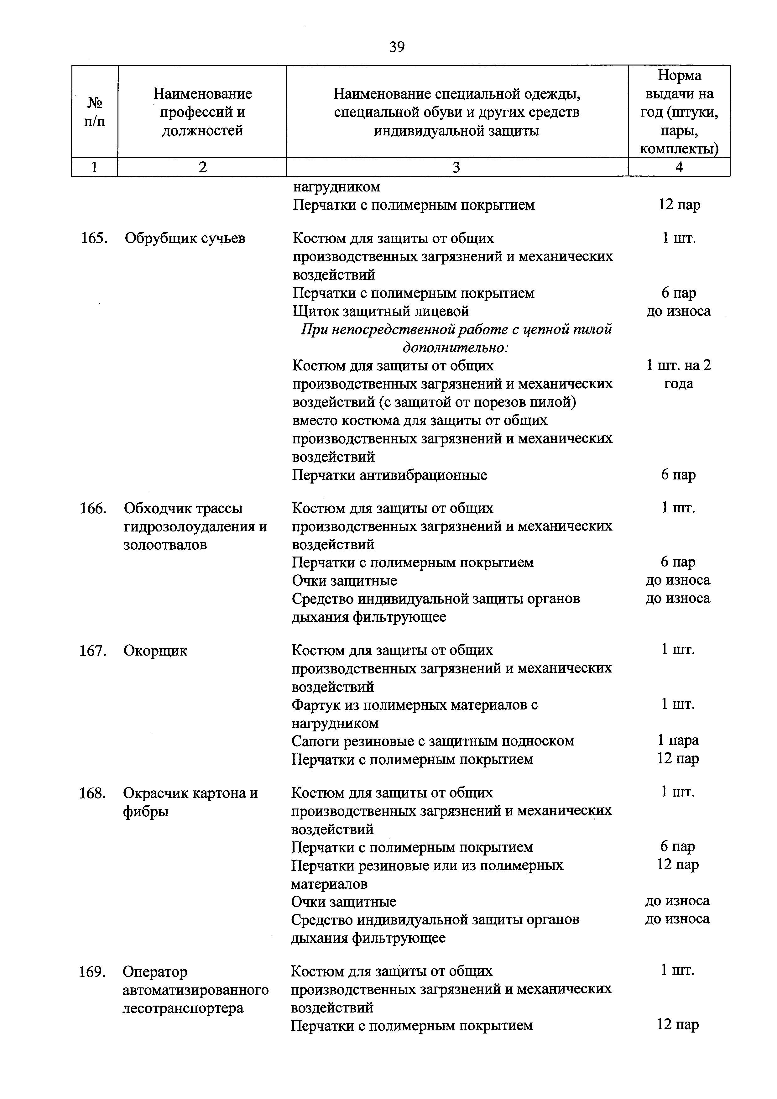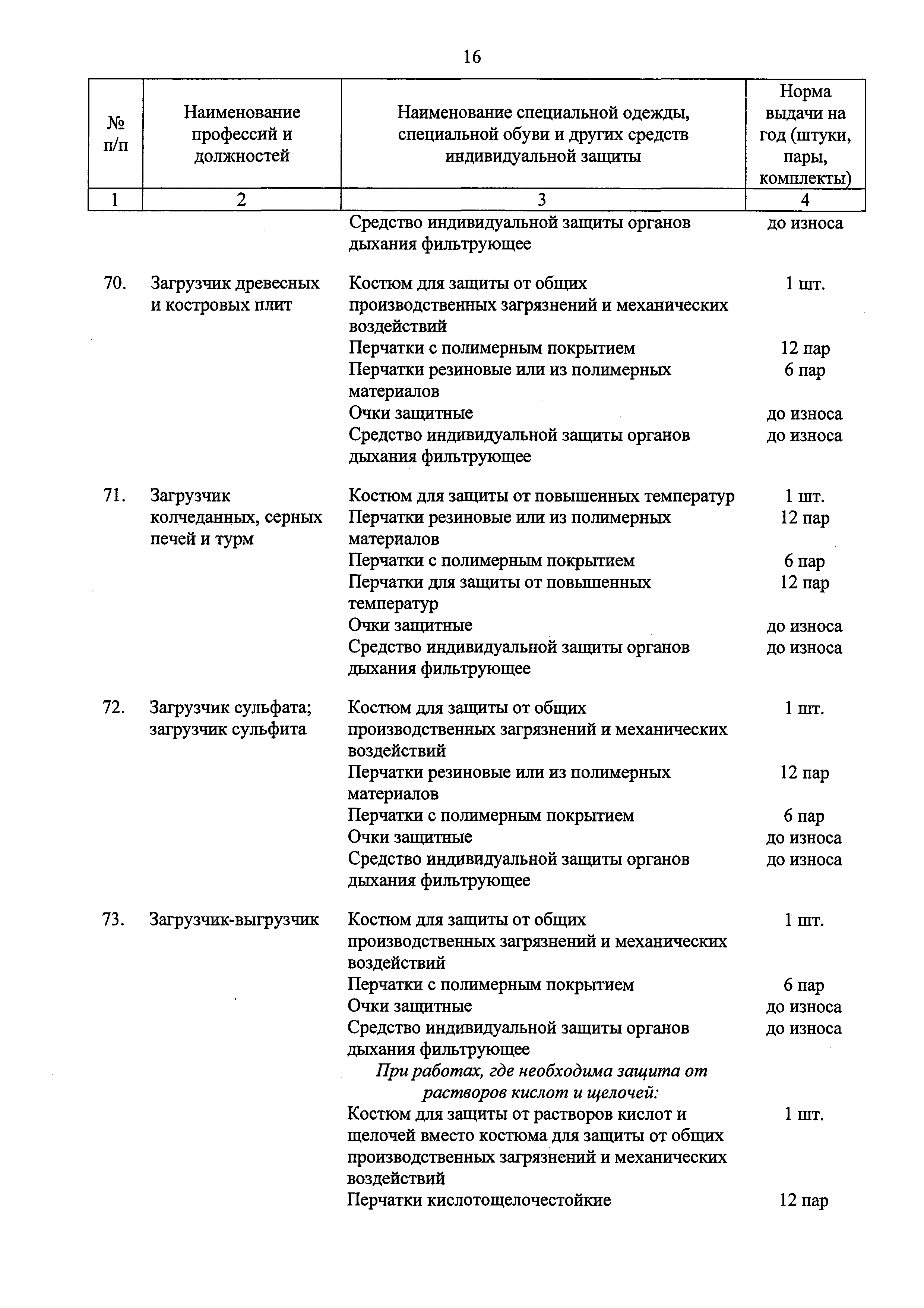 Типовые нормы бесплатной выдачи специальной одежды, специальной обуви и других средств индивидуальной защиты работникам целлюлозно-бумажного, гидролизного , лесохимического и деревообрабатывающего производств, занятым на работах с вредными и (или) опасными условиями труда, а также выполняемых в особых температурных условиях или связанных с загрязнением| Статус: | действует | | Название рус.: | Типовые нормы бесплатной выдачи специальной одежды, специальной обуви и других средств индивидуальной защиты работникам целлюлозно-бумажного, гидролизного , лесохимического и деревообрабатывающего производств, занятым на работах с вредными и (или) опасными условиями труда, а также выполняемых в особых температурных условиях или связанных с загрязнением | | Дата добавления в базу: | 01.02.2017 | | Дата актуализации: | 01.01.2021 | | Дата введения: | 09.03.2017 | | Утверждён: | 17.11.2016 Министерство труда и социальной защиты РФ (665н)