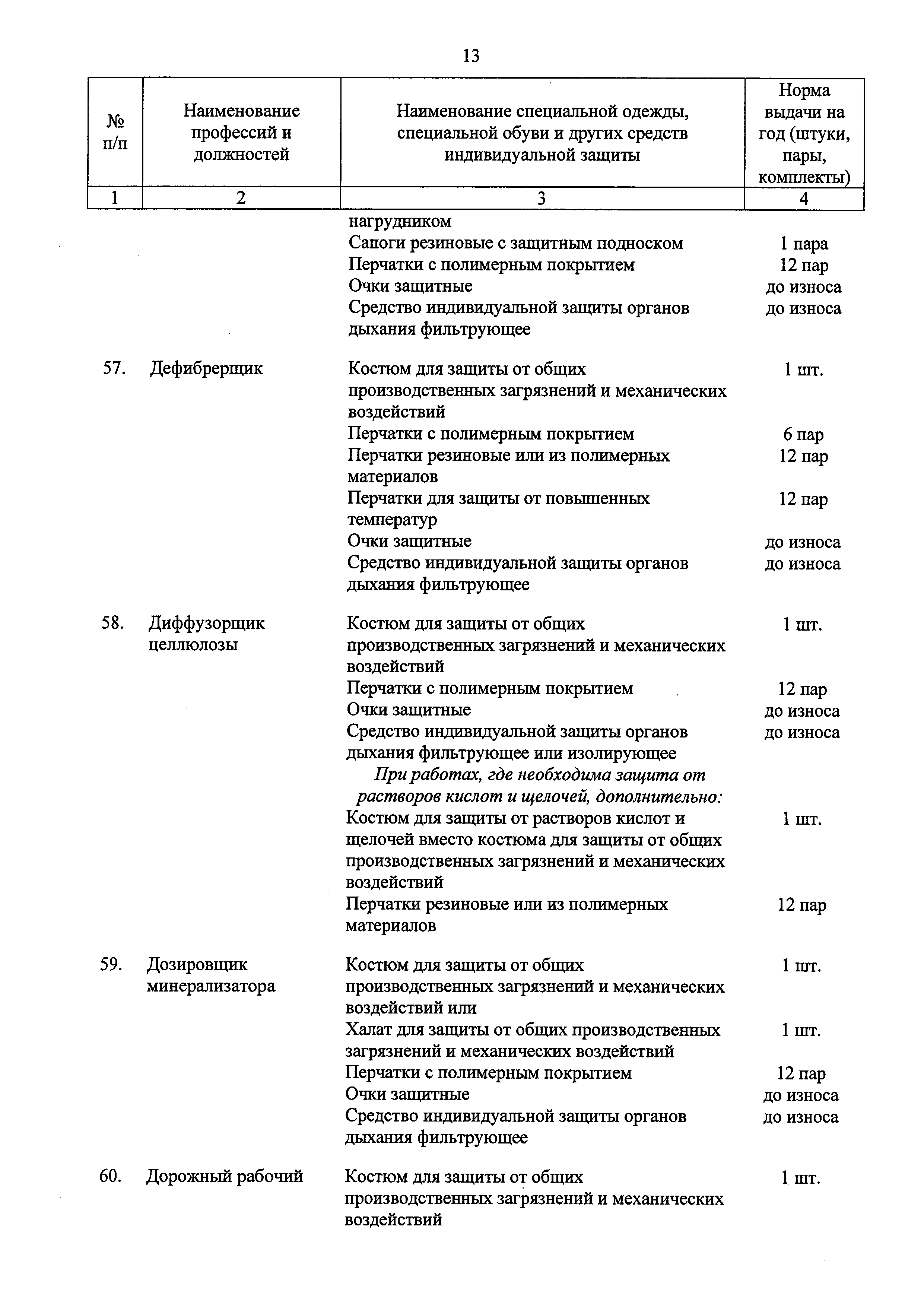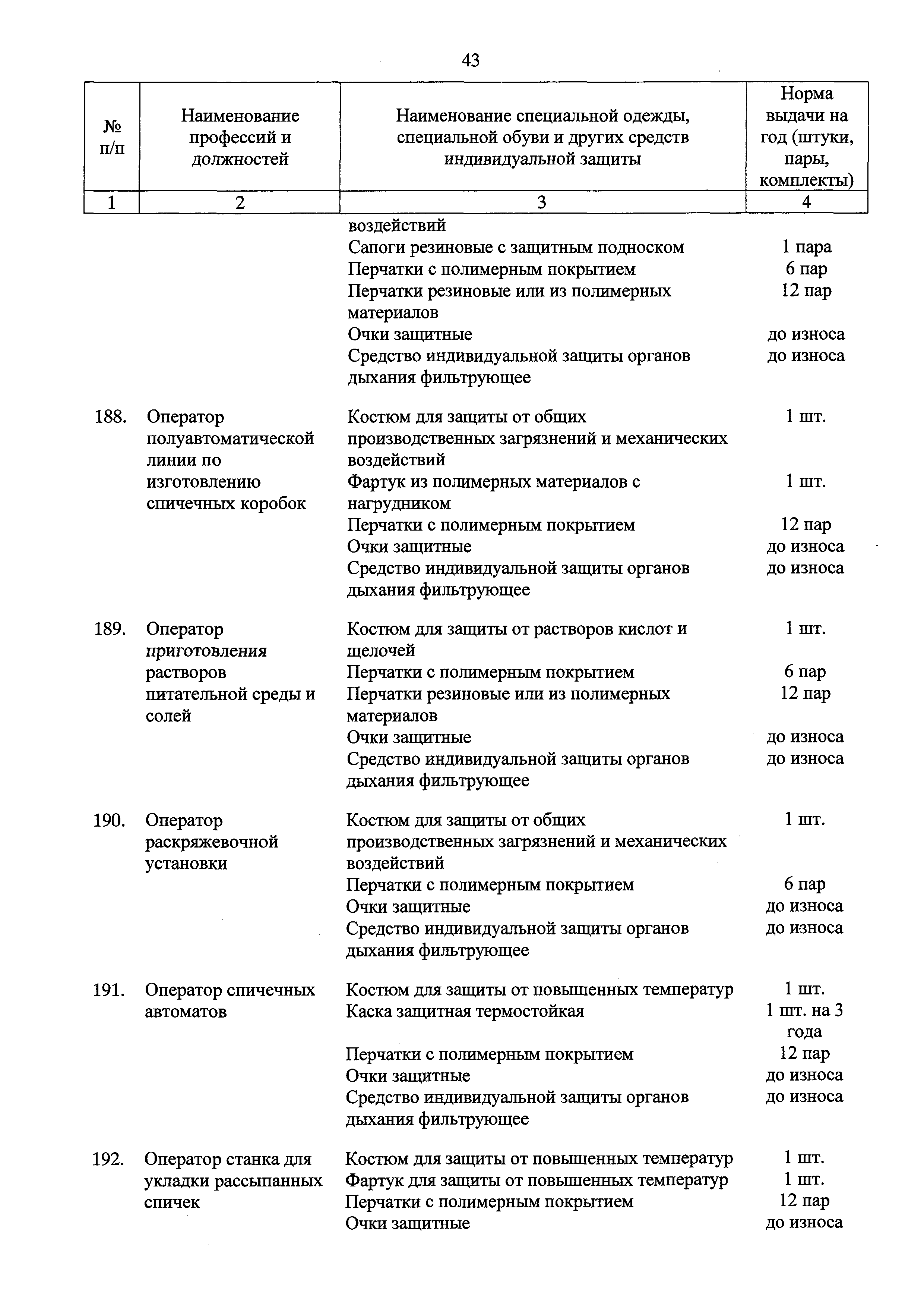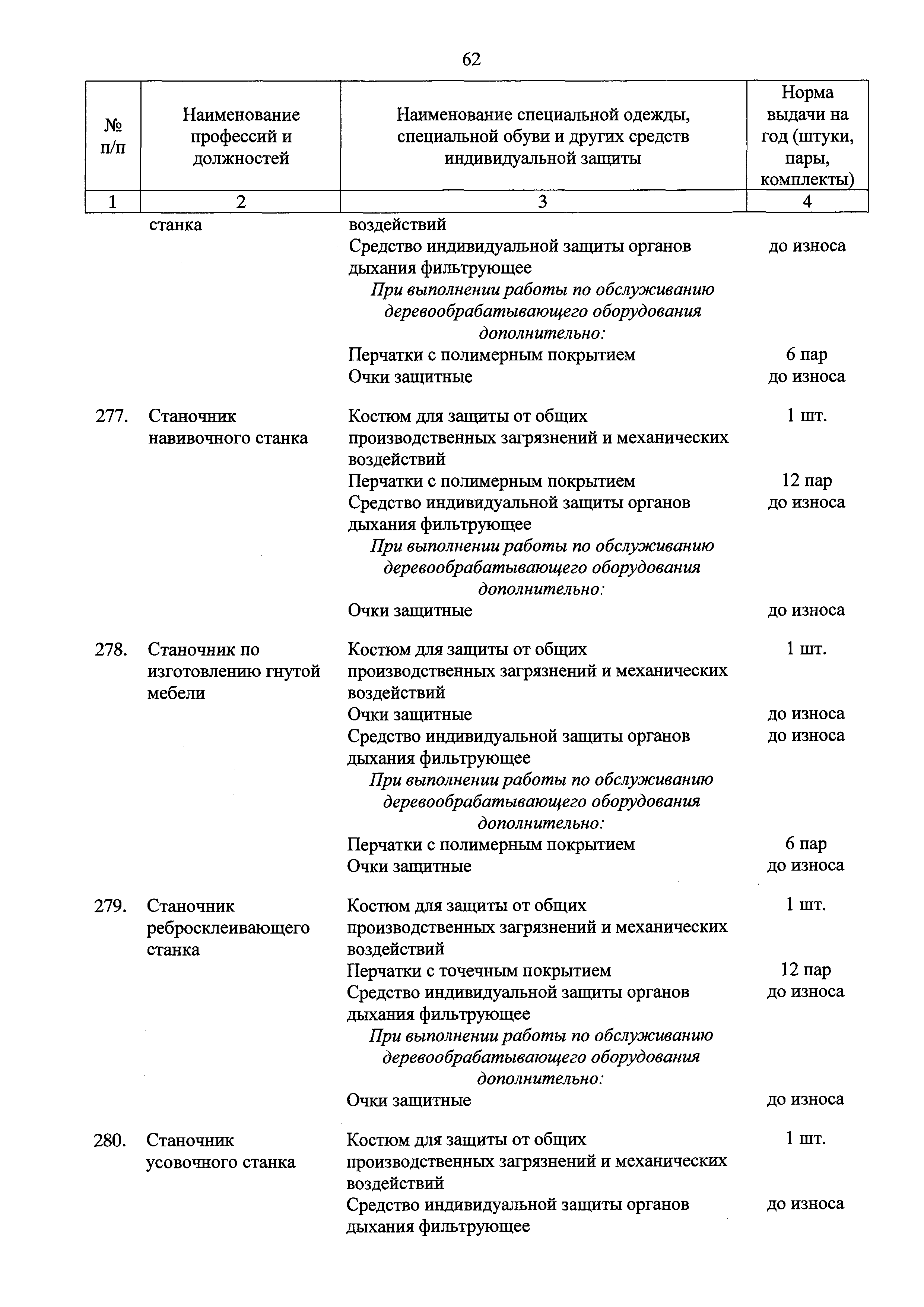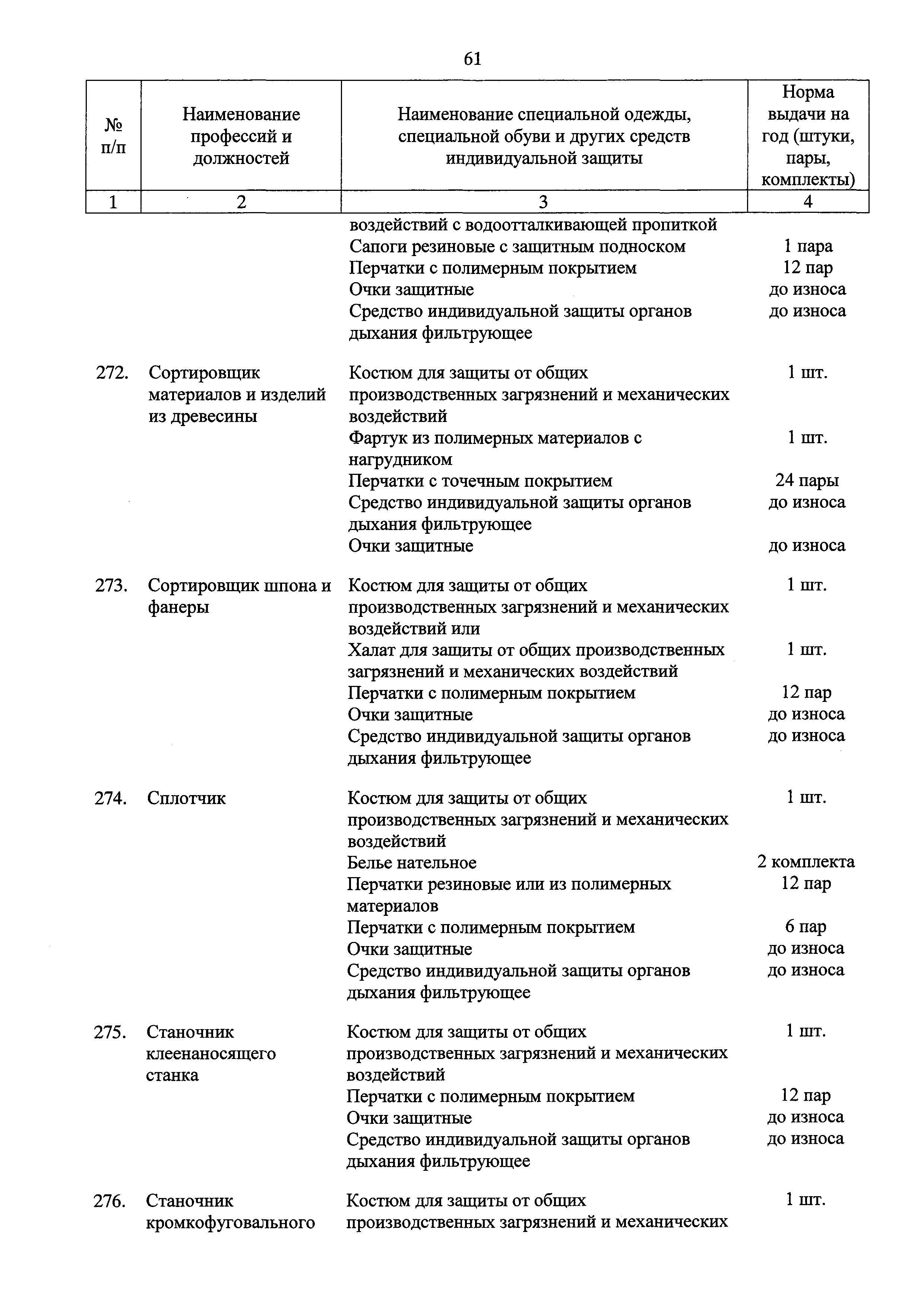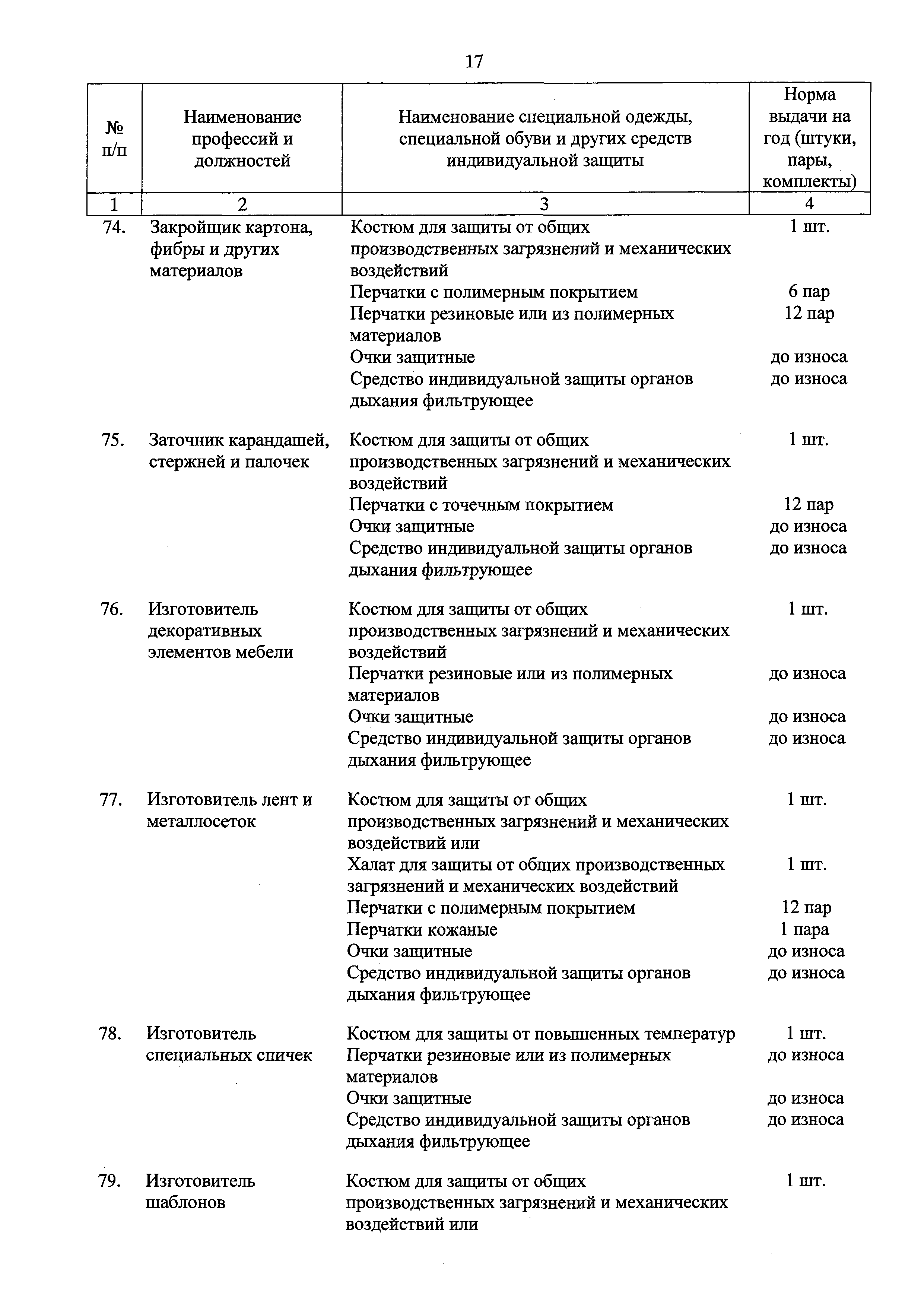 Типовые нормы бесплатной выдачи специальной одежды, специальной обуви и других средств индивидуальной защиты работникам целлюлозно-бумажного, гидролизного , лесохимического и деревообрабатывающего производств, занятым на работах с вредными и (или) опасными условиями труда, а также выполняемых в особых температурных условиях или связанных с загрязнением| Статус: | действует | | Название рус.: | Типовые нормы бесплатной выдачи специальной одежды, специальной обуви и других средств индивидуальной защиты работникам целлюлозно-бумажного, гидролизного , лесохимического и деревообрабатывающего производств, занятым на работах с вредными и (или) опасными условиями труда, а также выполняемых в особых температурных условиях или связанных с загрязнением | | Дата добавления в базу: | 01.02.2017 | | Дата актуализации: | 01.01.2021 | | Дата введения: | 09.03.2017 | | Утверждён: | 17.11.2016 Министерство труда и социальной защиты РФ (665н)