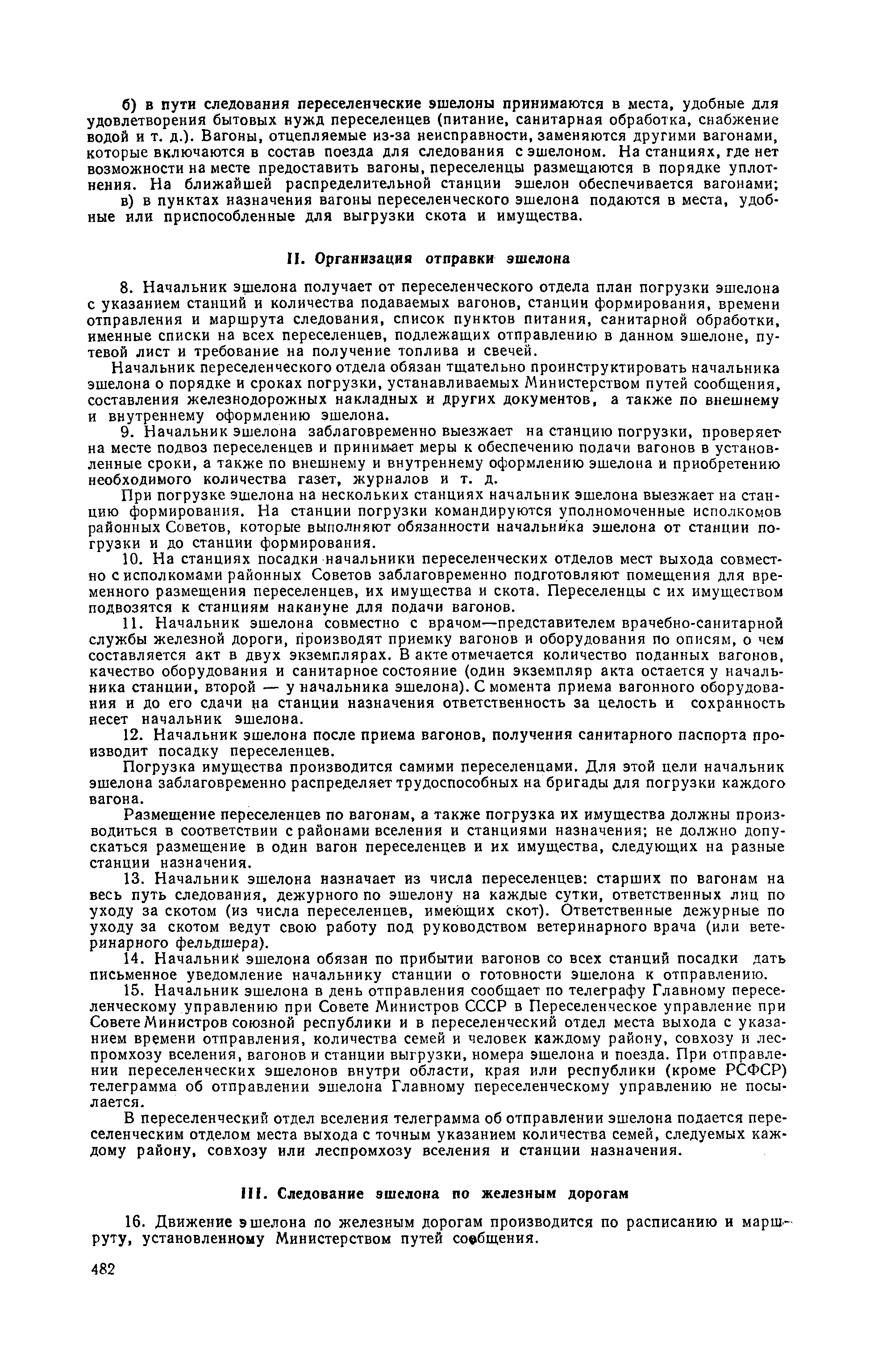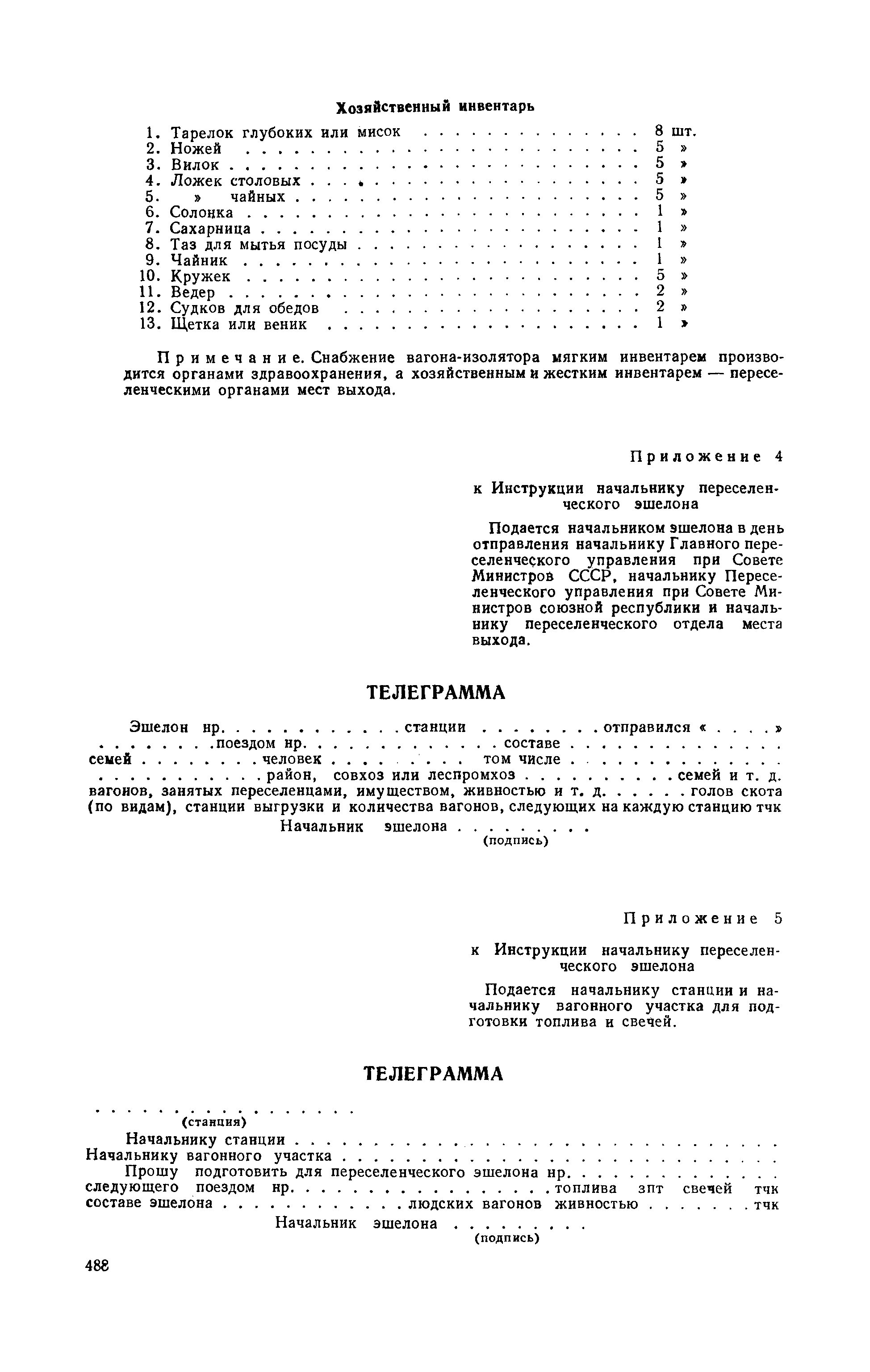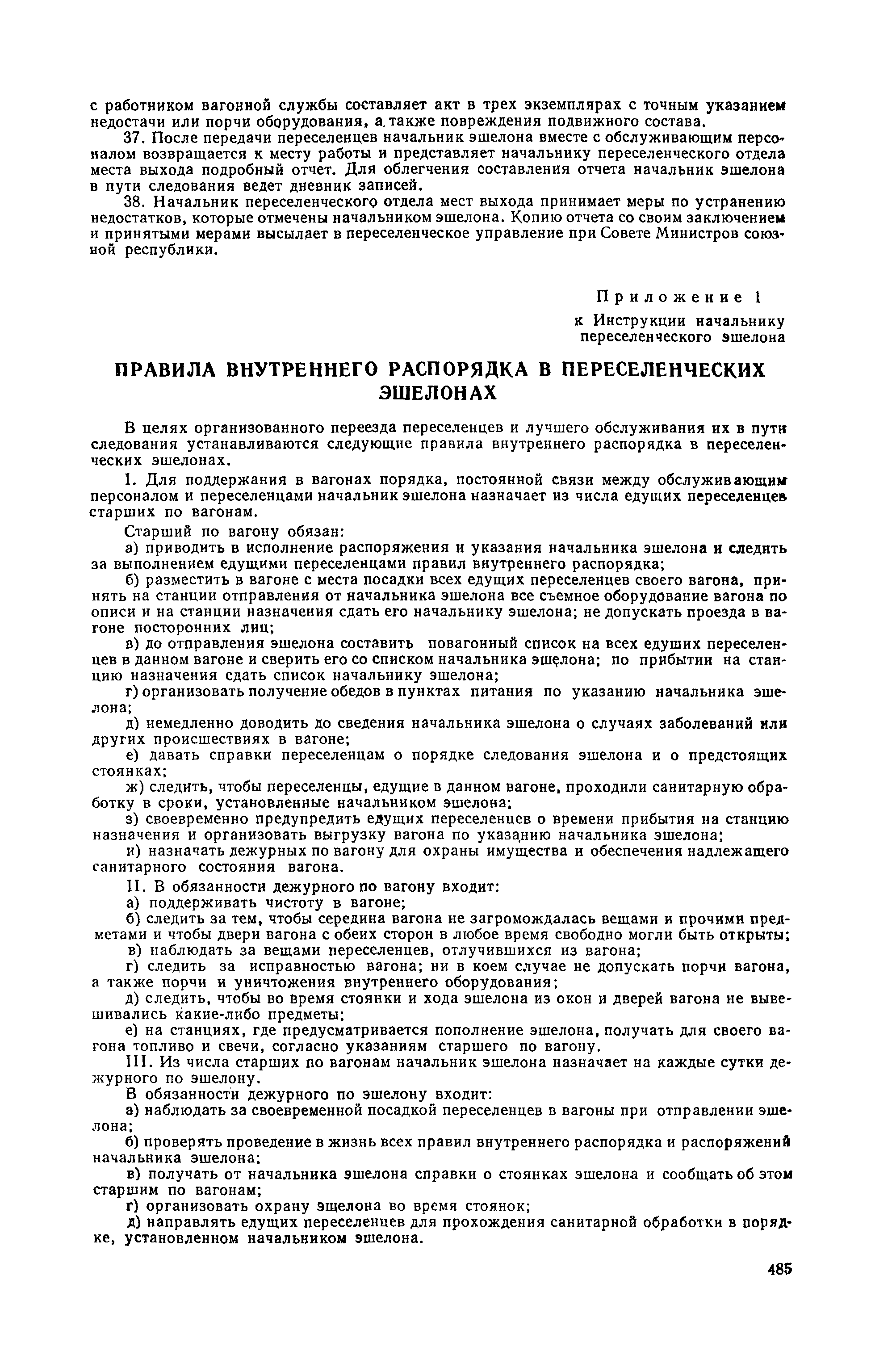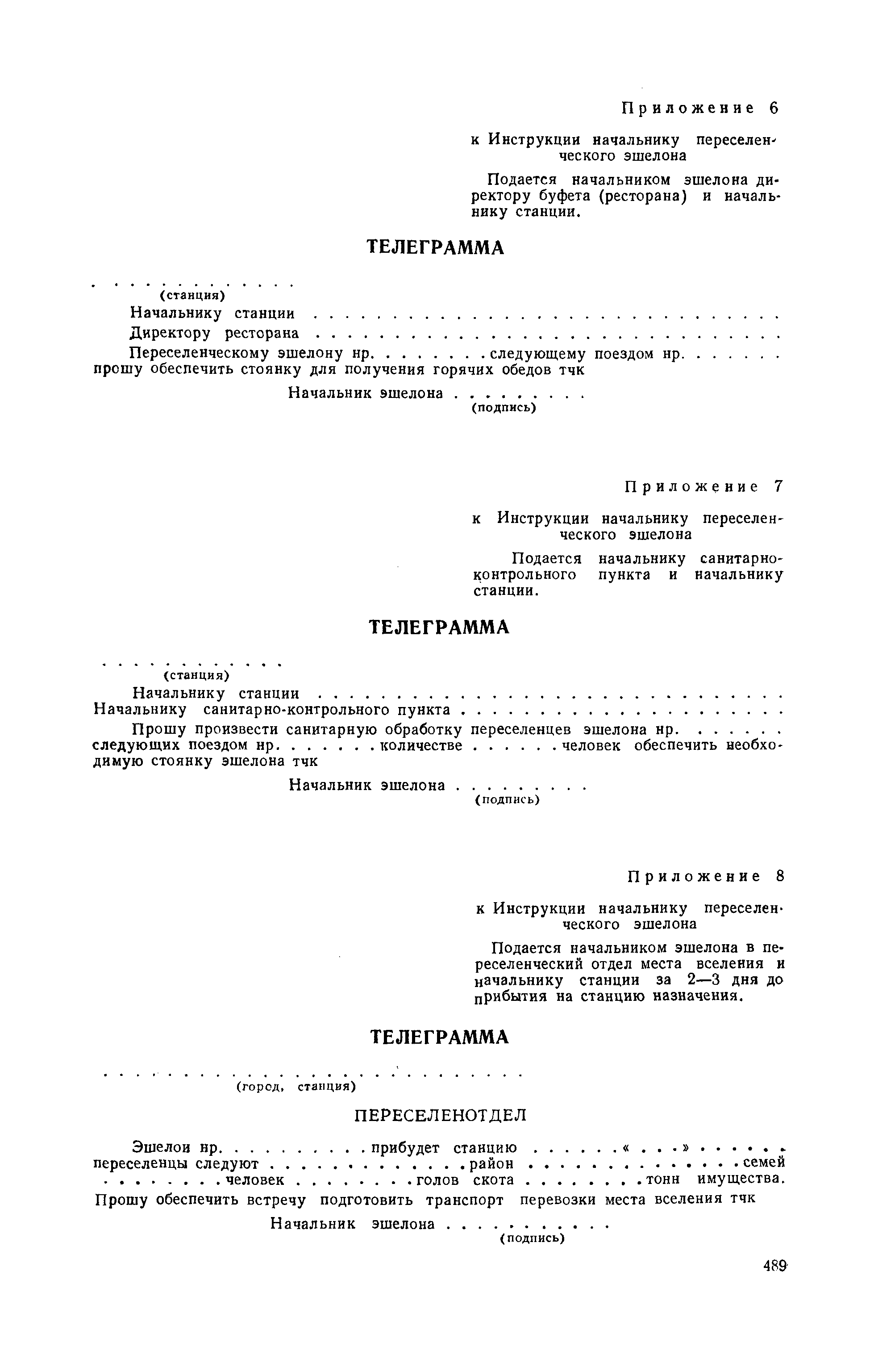 | Оглавление: | I Общие положения II Организация отправки эшелона III Следование эшелона по железным дорогам IV Обслуживание переселенцев в пути V Прибытие эшелона на станцию назначения Приложение 1. Правила внутреннего распорядка в переселенческих эшелонах Приложение 2. Санитарный паспорт на право посадки людей в железнодорожный эшелон (на судно) Приложение 3. Табель оборудования вагона-изолятора Приложение 4. Форма телеграммы Приложение 5. Форма телеграммы Приложение 6. Форма телеграммы Приложение 7. Форма телеграммы Приложение 8. Форма телеграммы Приложение 9. Форма телеграммы |