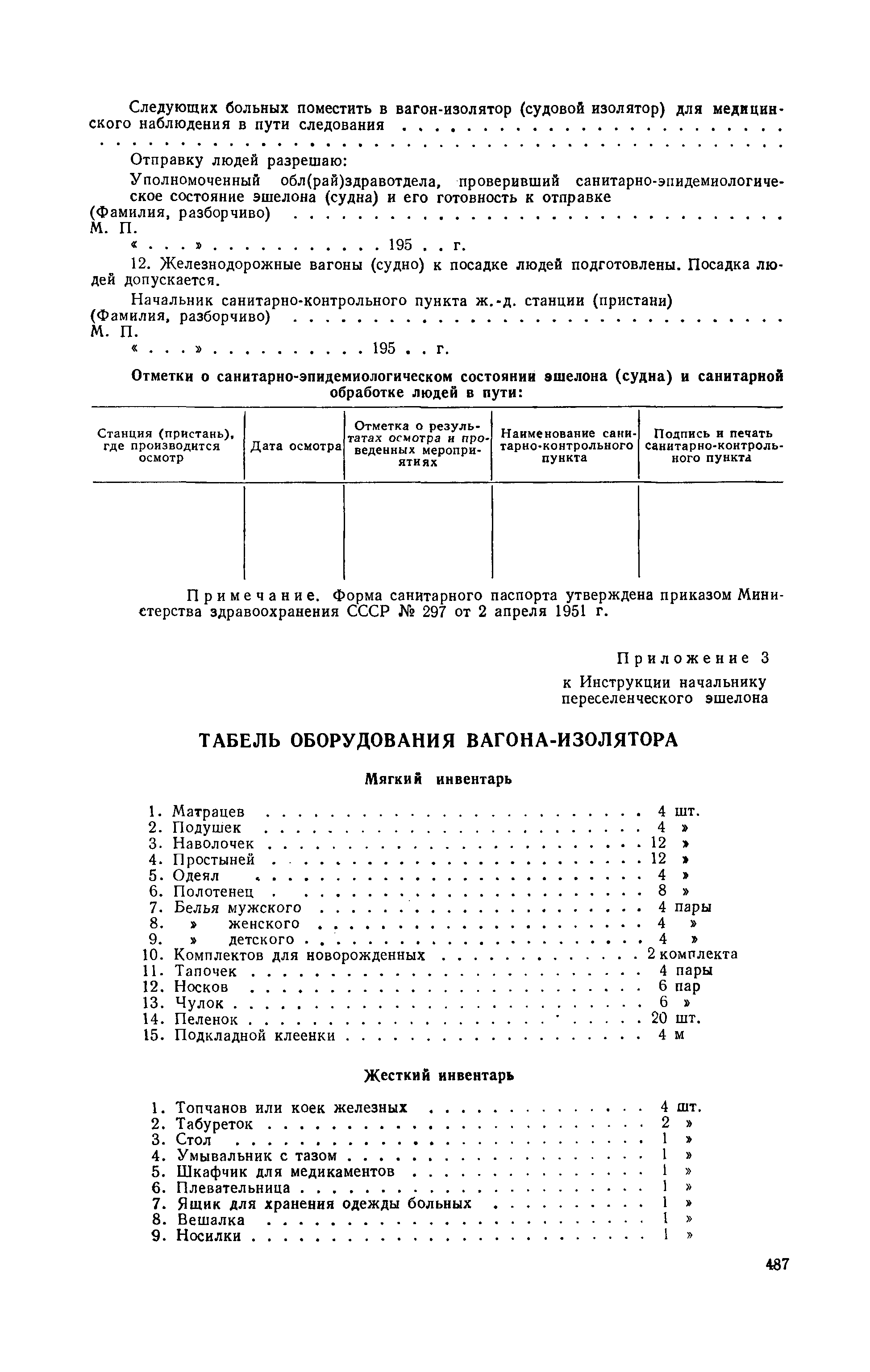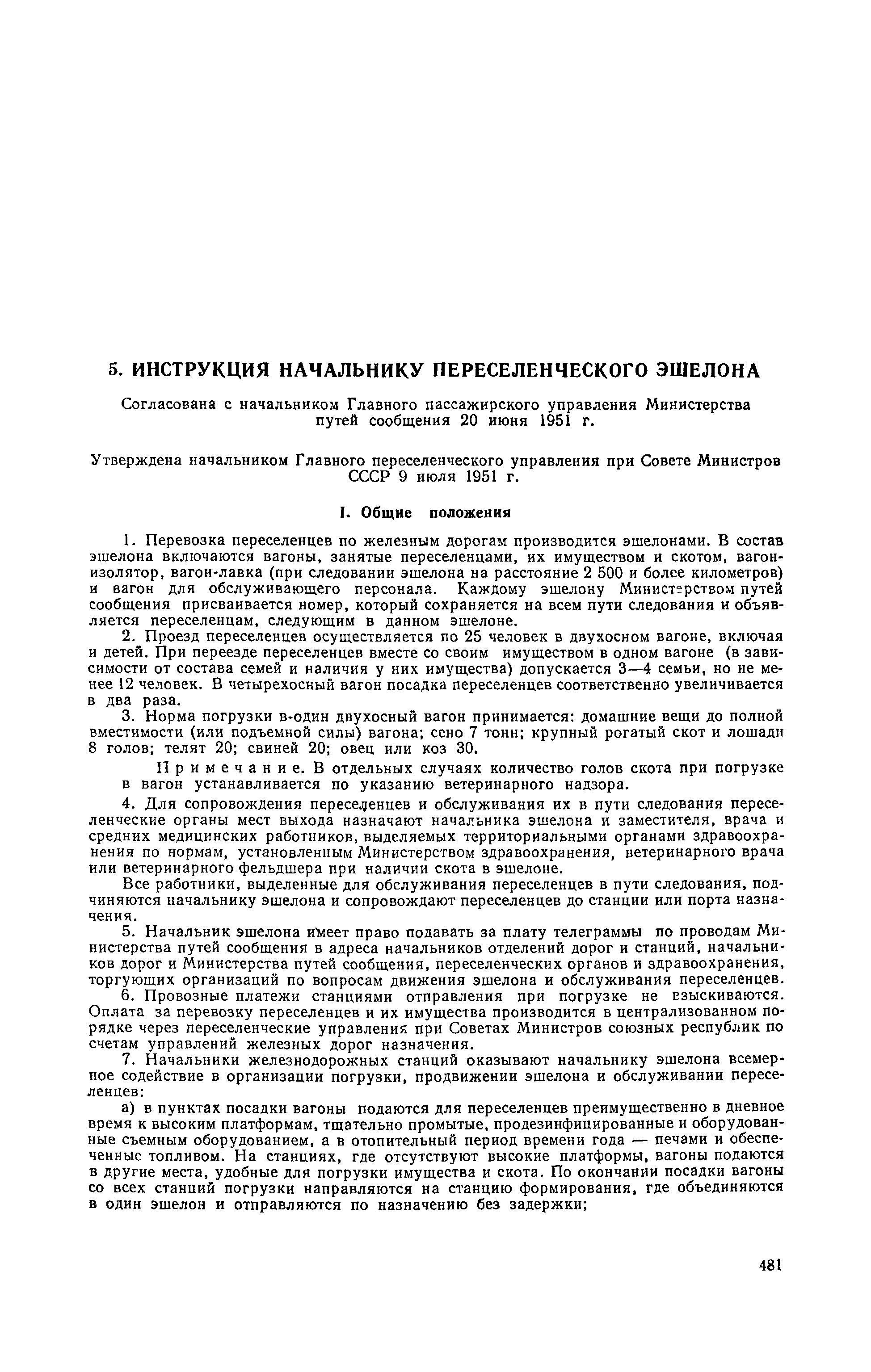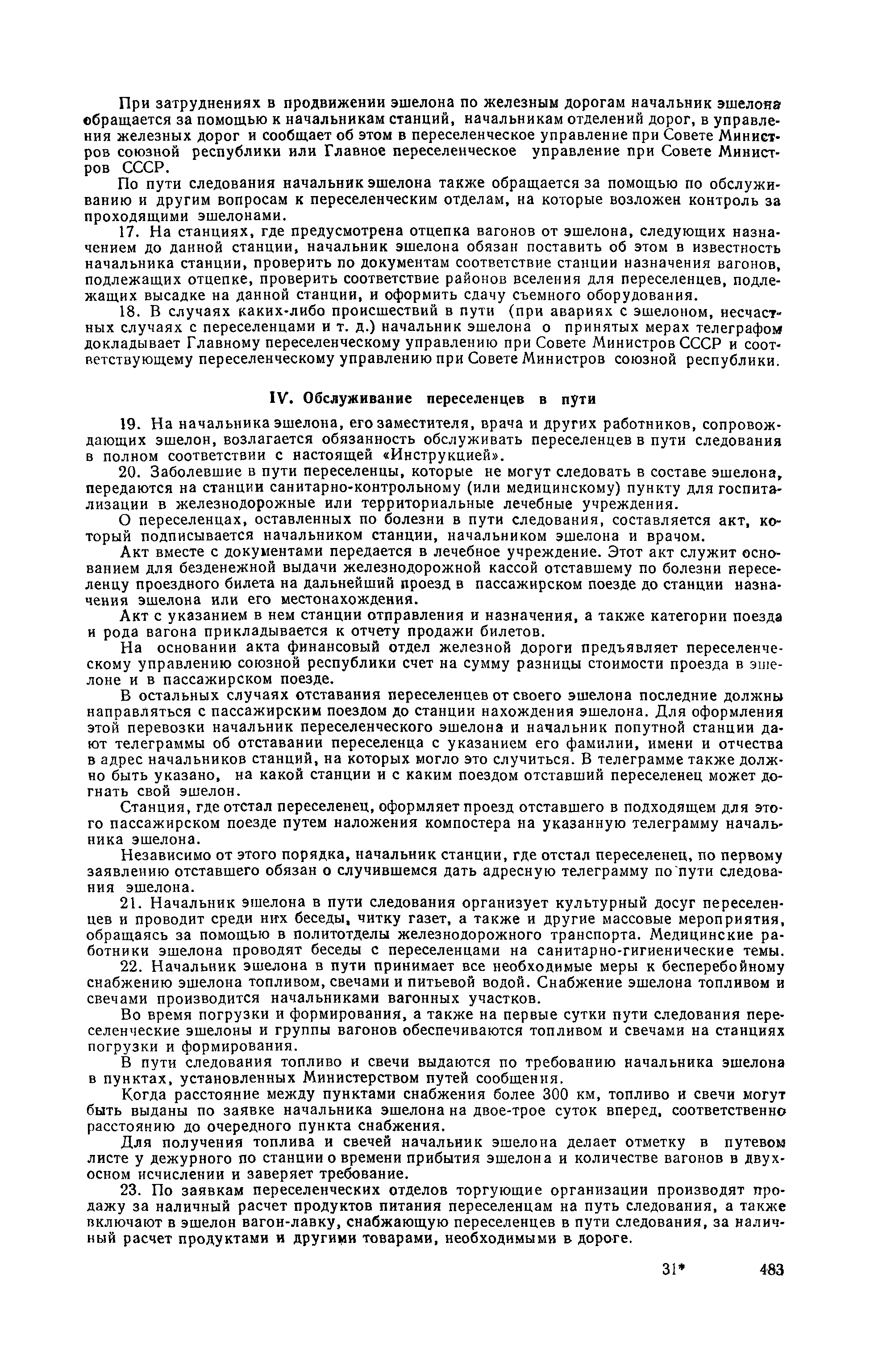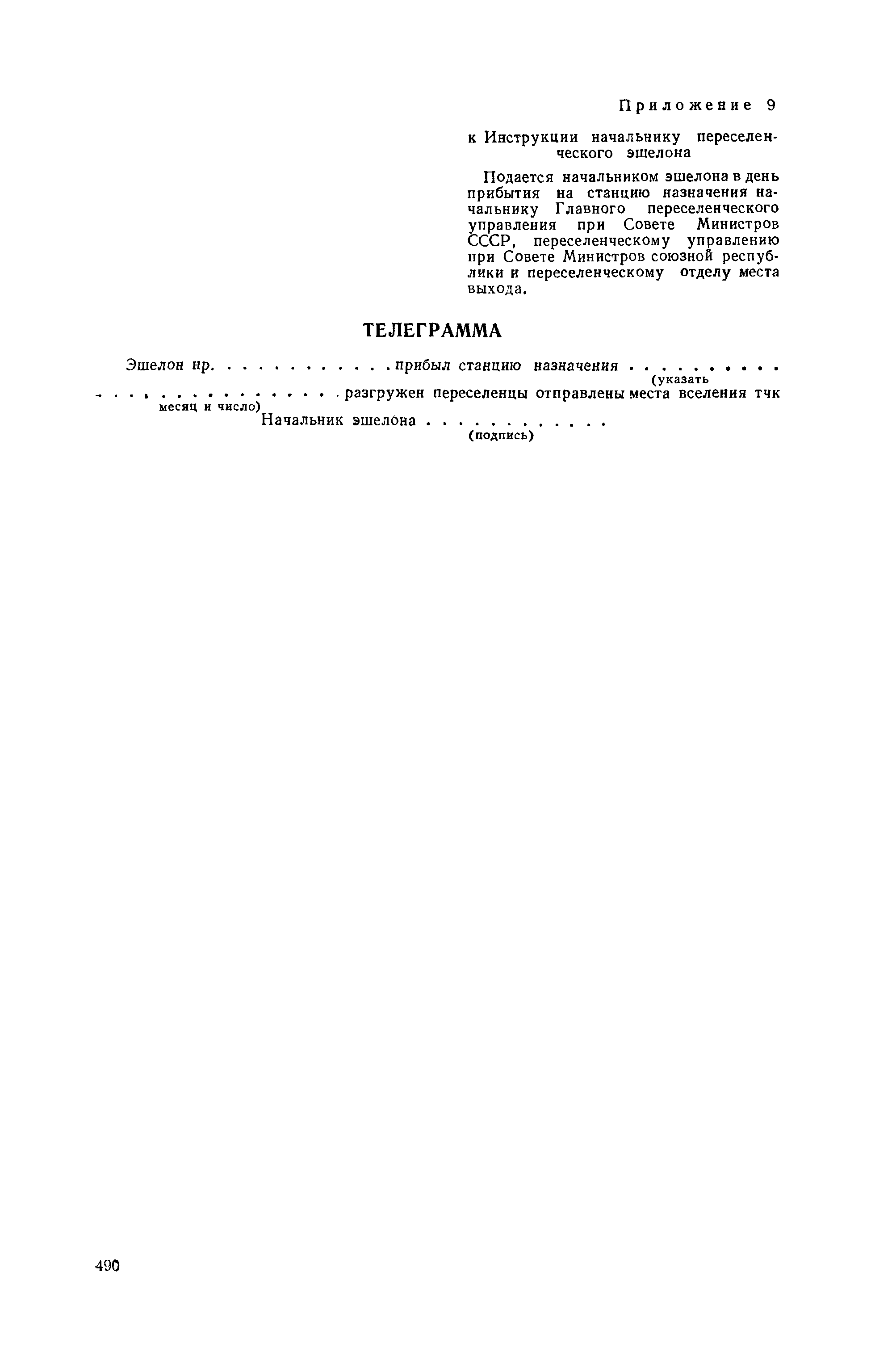 | Оглавление: | I Общие положения II Организация отправки эшелона III Следование эшелона по железным дорогам IV Обслуживание переселенцев в пути V Прибытие эшелона на станцию назначения Приложение 1. Правила внутреннего распорядка в переселенческих эшелонах Приложение 2. Санитарный паспорт на право посадки людей в железнодорожный эшелон (на судно) Приложение 3. Табель оборудования вагона-изолятора Приложение 4. Форма телеграммы Приложение 5. Форма телеграммы Приложение 6. Форма телеграммы Приложение 7. Форма телеграммы Приложение 8. Форма телеграммы Приложение 9. Форма телеграммы |