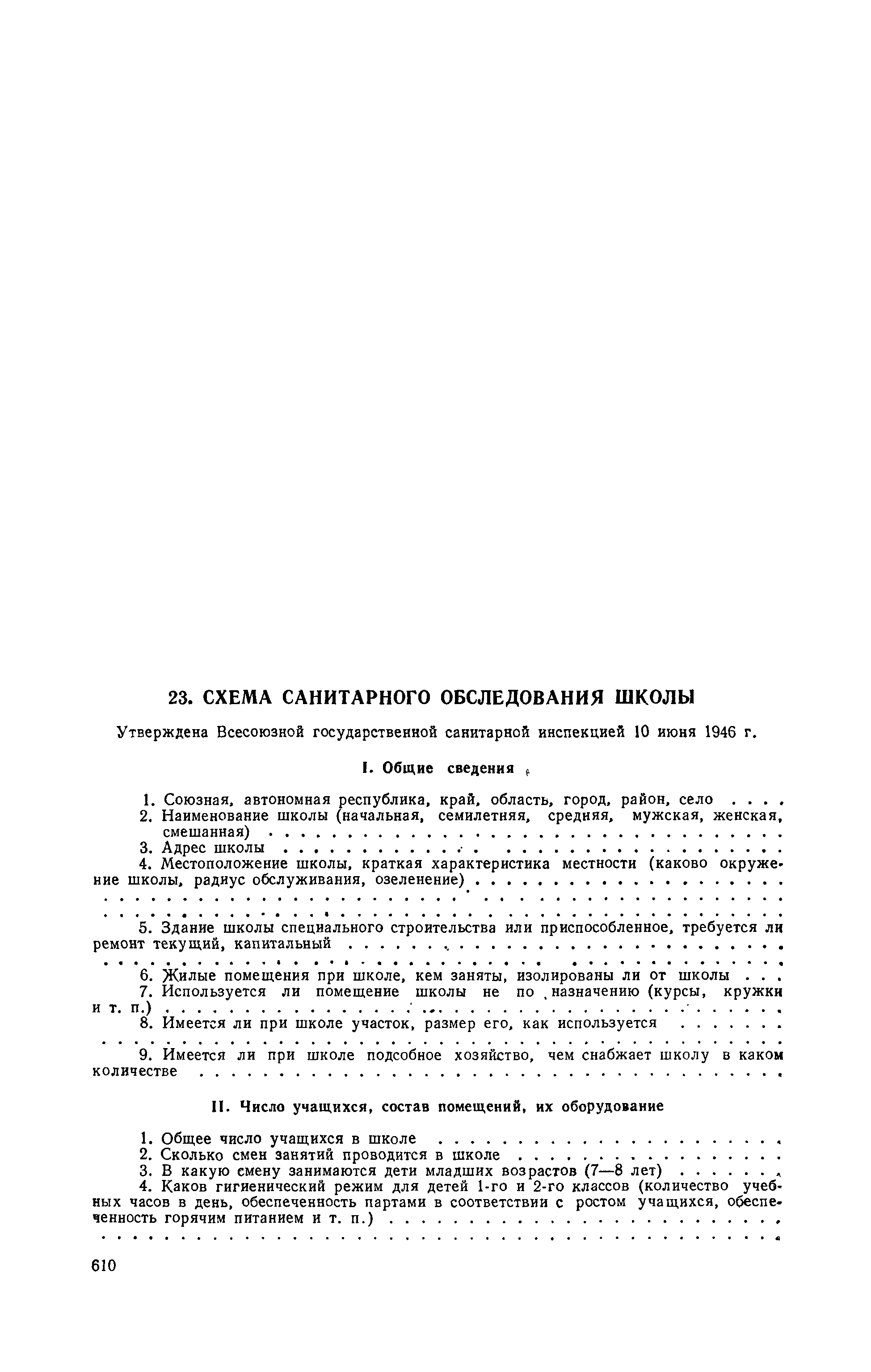 Схема санитарного обследования школы| Статус: | не действует | | Название рус.: | Схема санитарного обследования школы | | Дата добавления в базу: | 01.02.2017 | | Дата актуализации: | 01.01.2021 | | Оглавление: | I. Общие сведения II. Число учащихся, состав помещений, их оборудования III. Медико-санитарное обслуживание учащихся IV. Заключение госсанинспектора | | Утверждён: | 10.06.1946 Всесоюзная Государственная санитарная инспекция