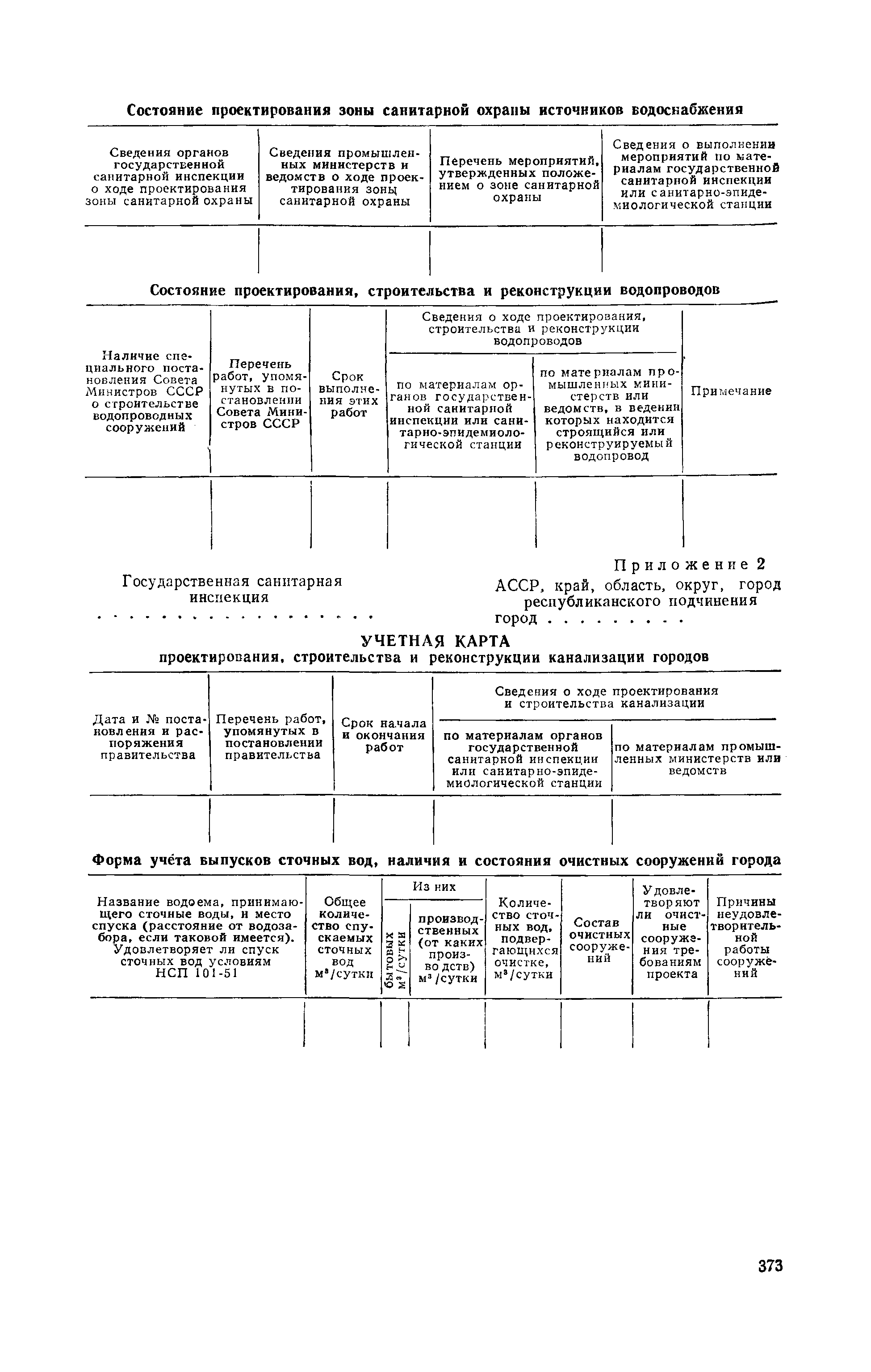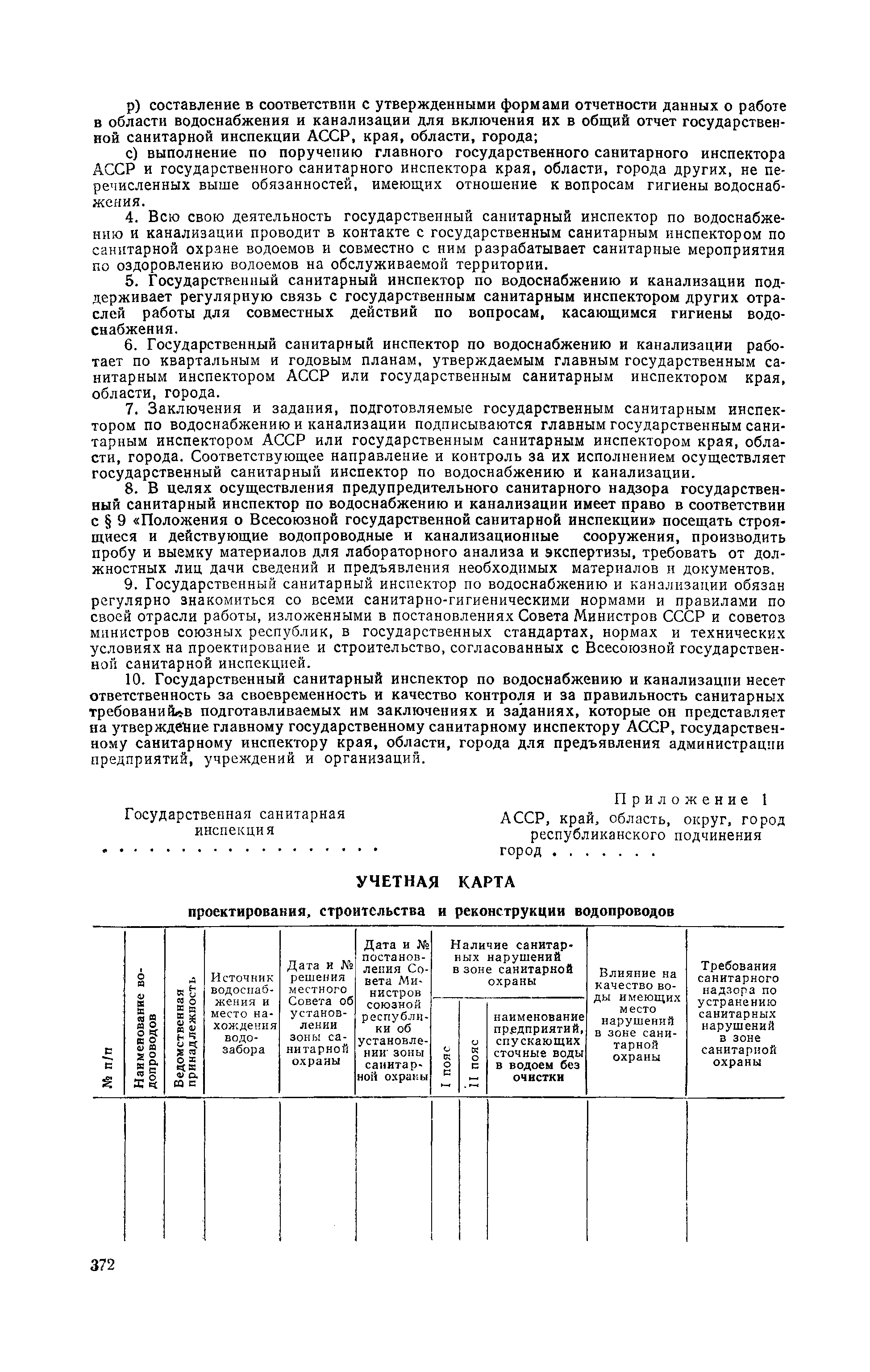 Инструкция о работе государственного санитарного инспектора по водоснабжению и канализации государственной санитарной инспекции АССР, края, области, города| Статус: | не действует | | Название рус.: | Инструкция о работе государственного санитарного инспектора по водоснабжению и канализации государственной санитарной инспекции АССР, края, области, города | | Дата добавления в базу: | 01.02.2017 | | Дата актуализации: | 01.01.2021 | | Оглавление: | Приложение 1. Учетная карта проектирования, строительства и реконструкции водопроводов Приложение 2. Учетная карта проектирования, строительства и реконструкции канализации городов | | Утверждён: | 10.09.1951 Главный государственный санитарный инспектор СССР